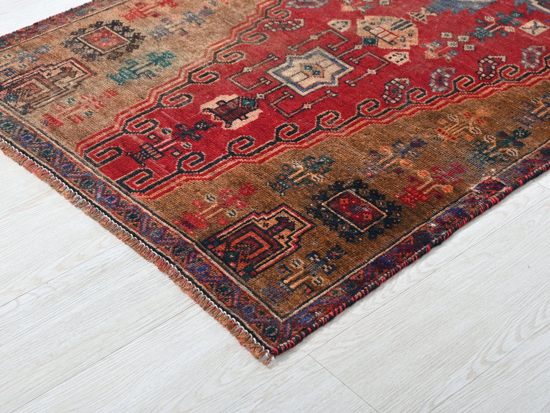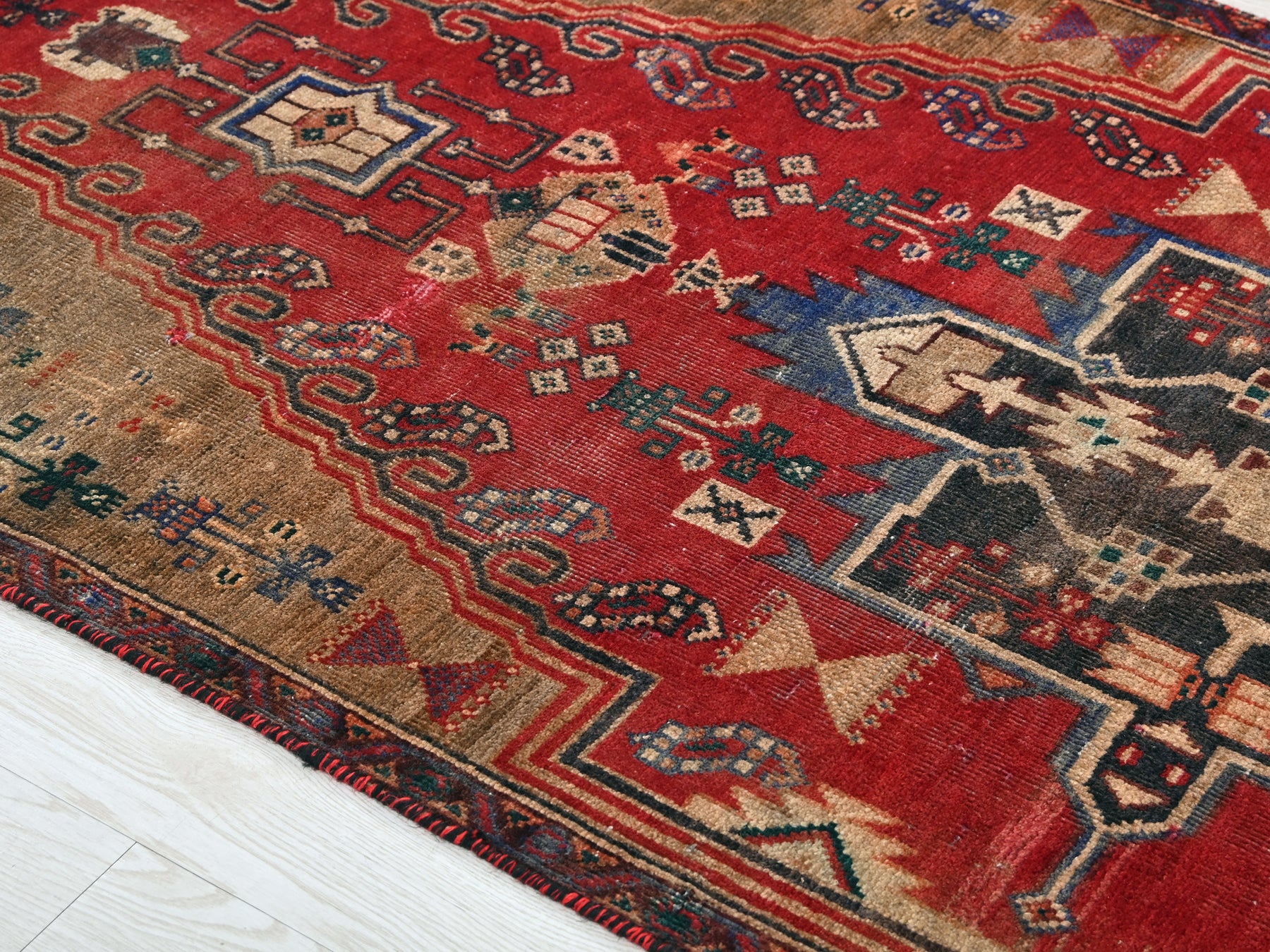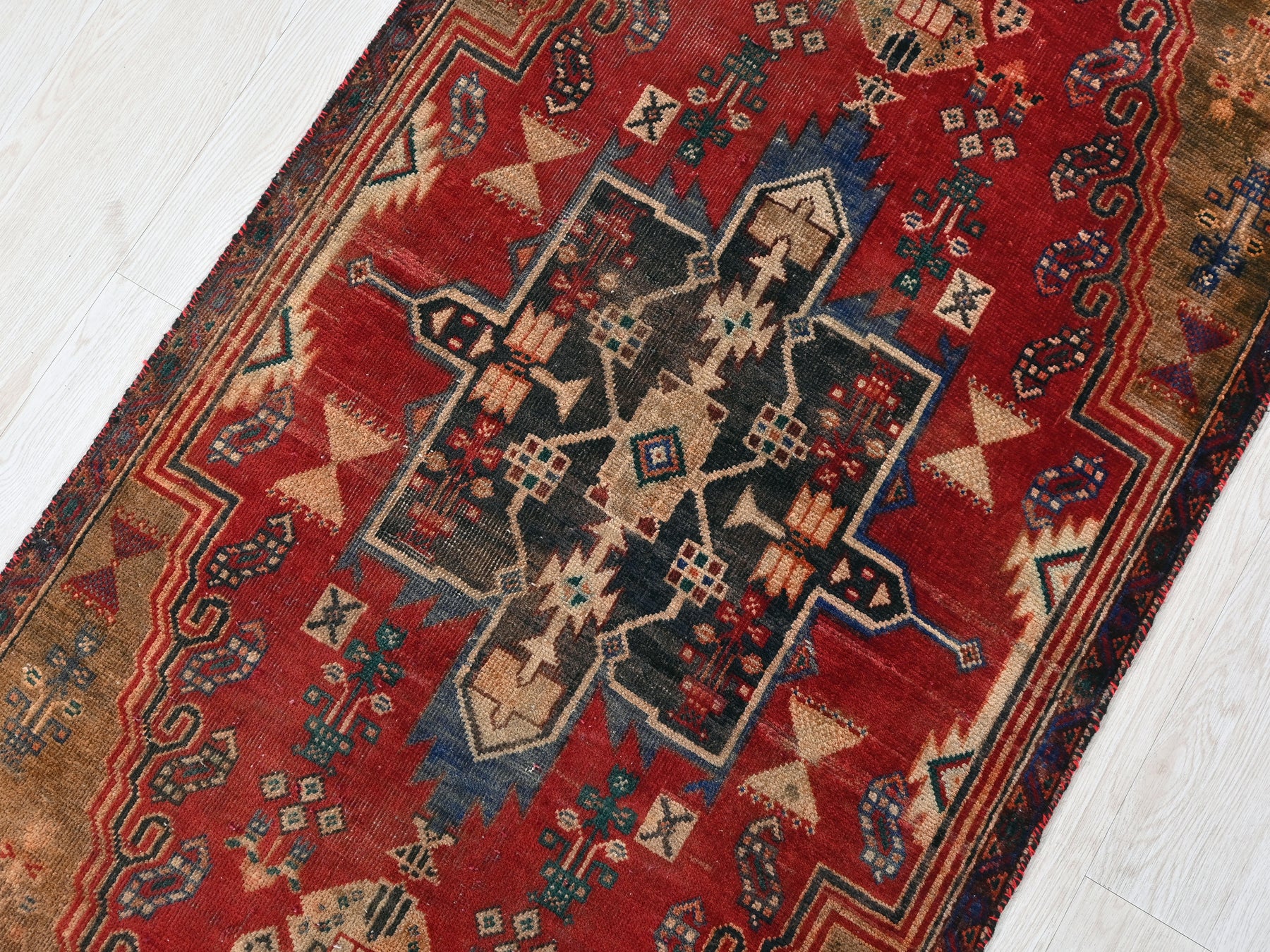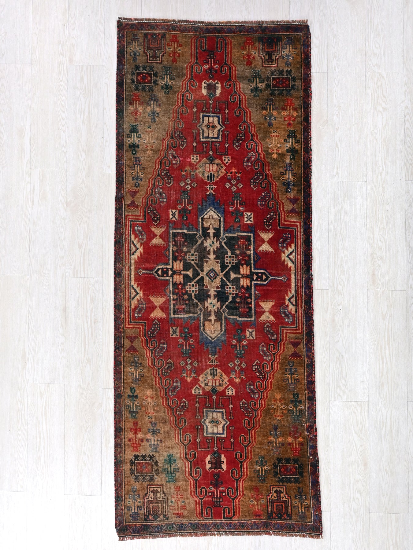 This is a hand-knotted, one-of-a-kind vintage rug. Due to the nature of this piece, there may be slight imperfections in its wear, shape, dimensions, and color. All of our rugs are professionally cleaned and repaired.