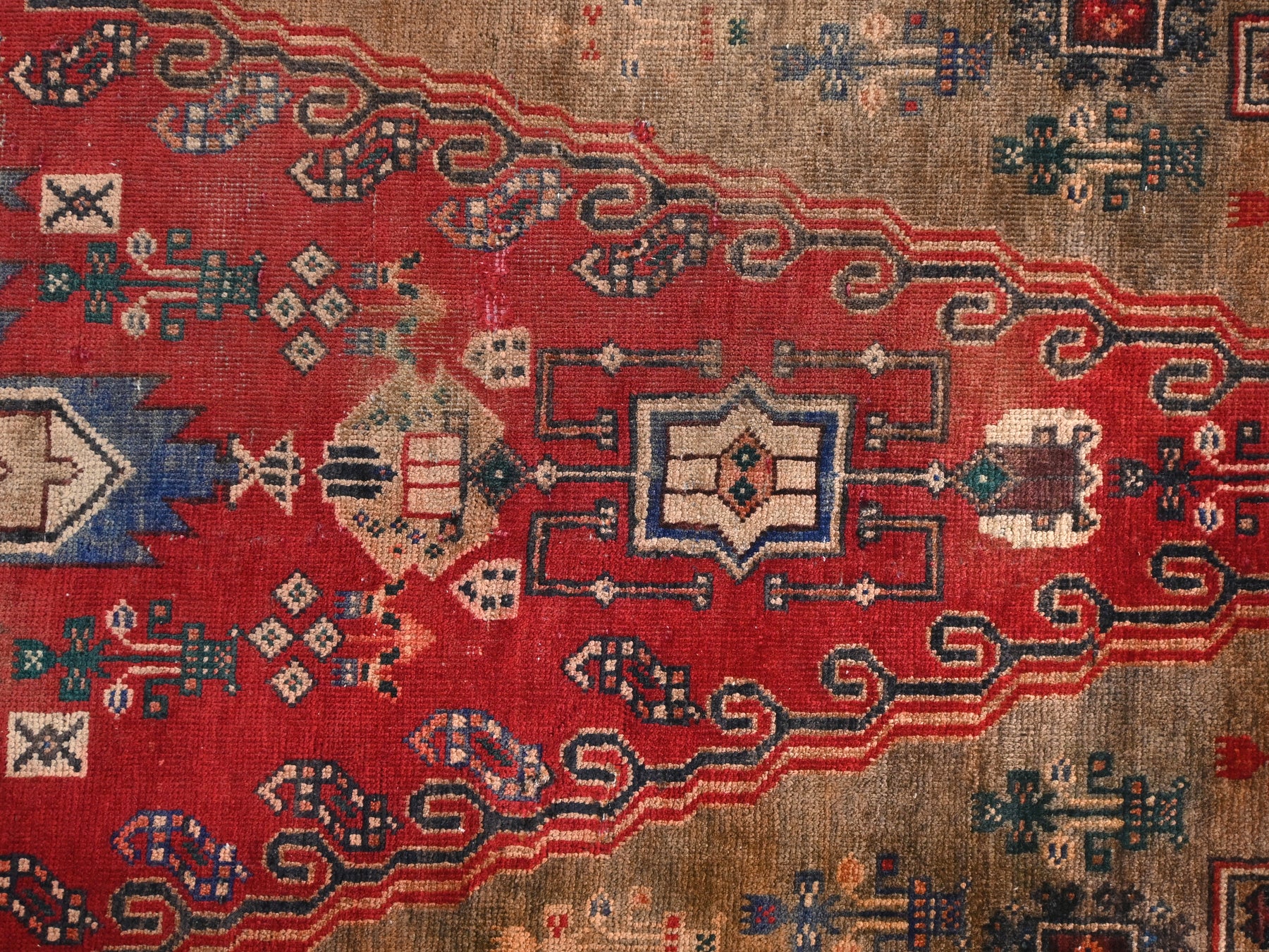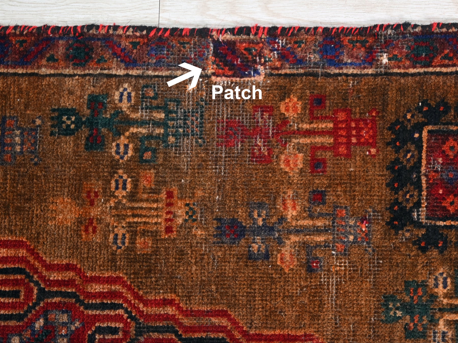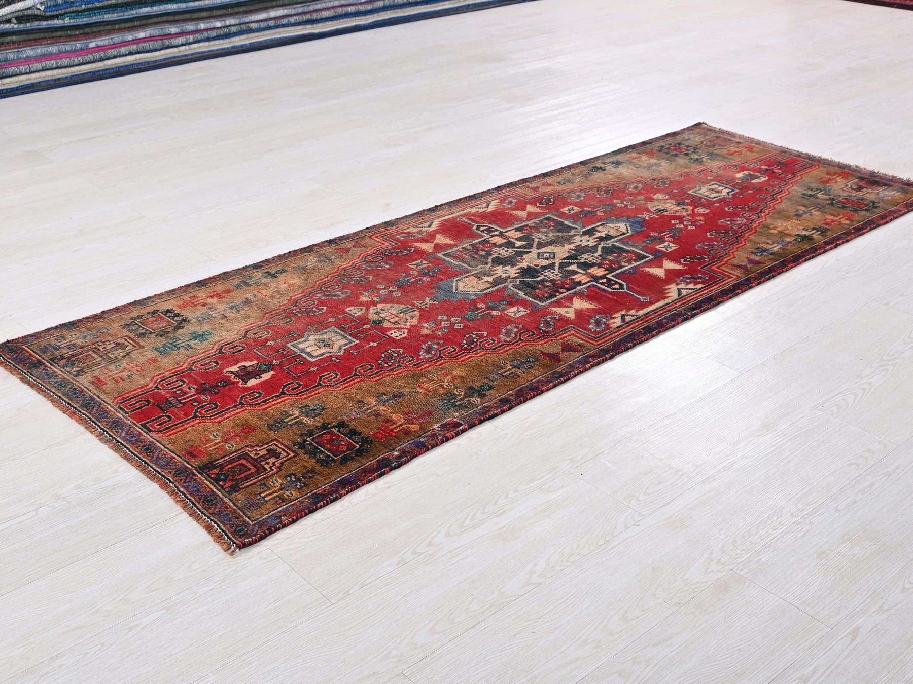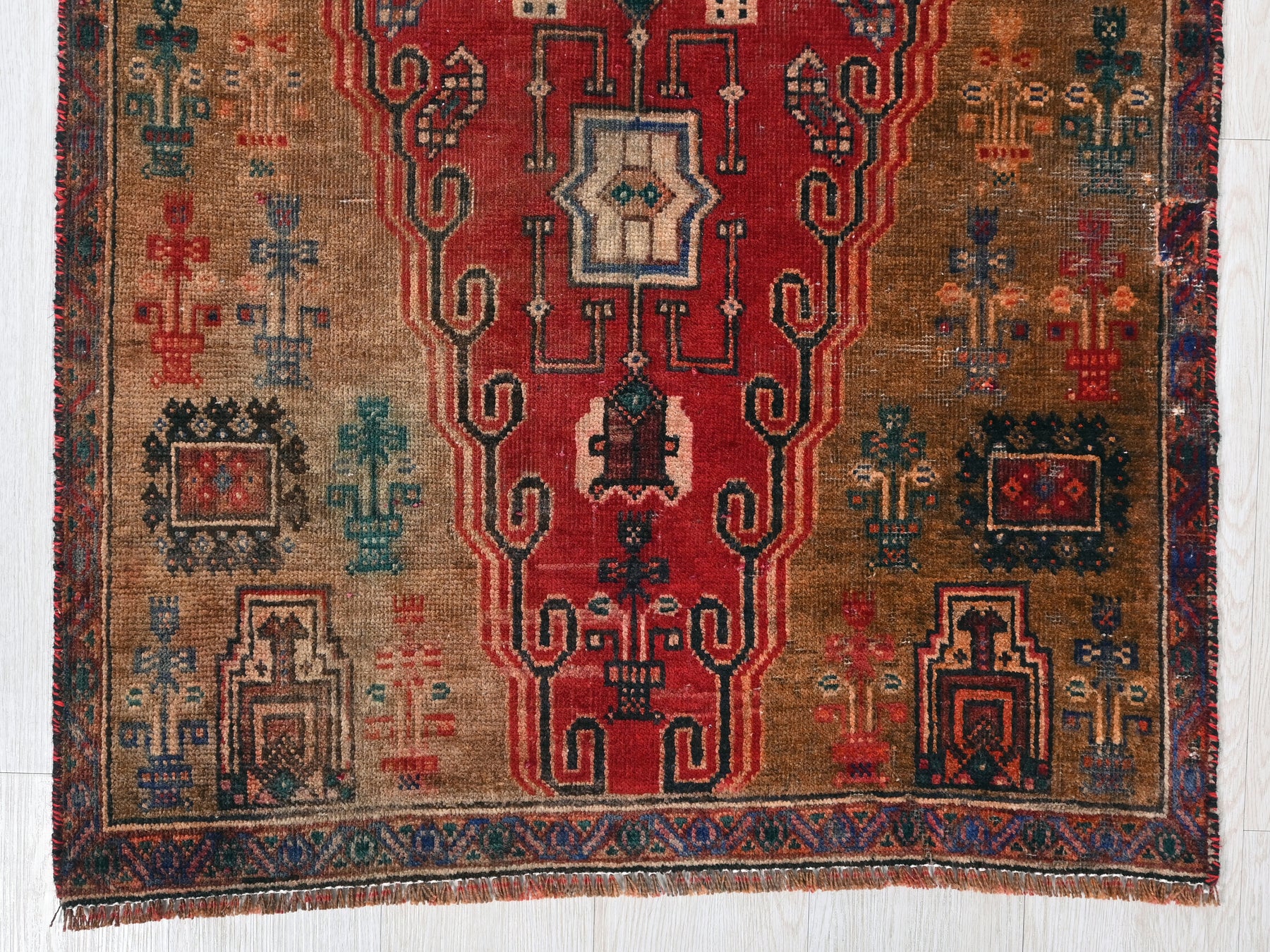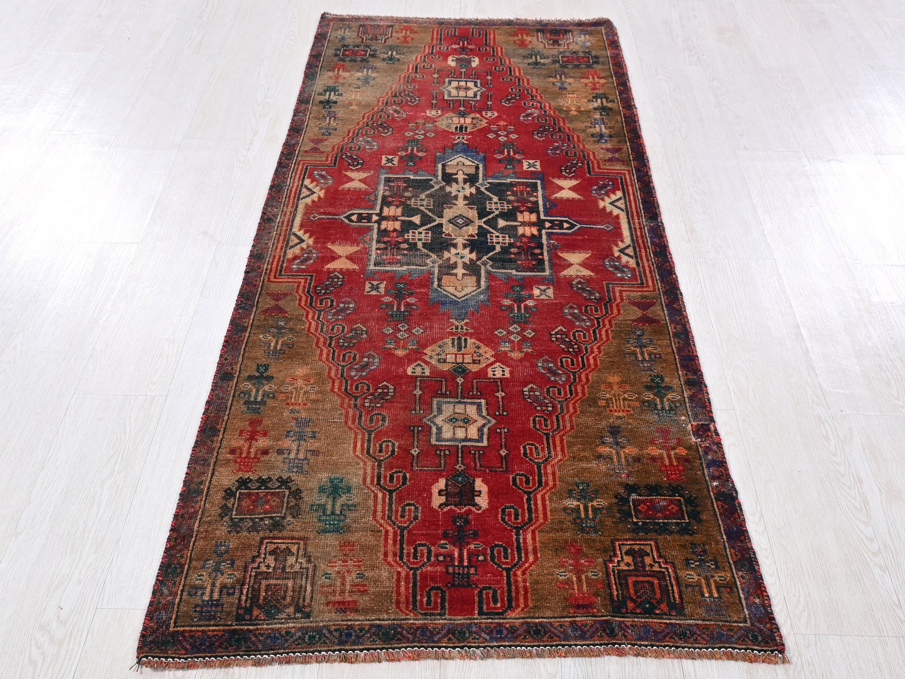 This is a hand-knotted, one-of-a-kind vintage rug. Due to the nature of this piece, there may be slight imperfections in its wear, shape, dimensions, and color. All of our rugs are professionally cleaned and repaired.