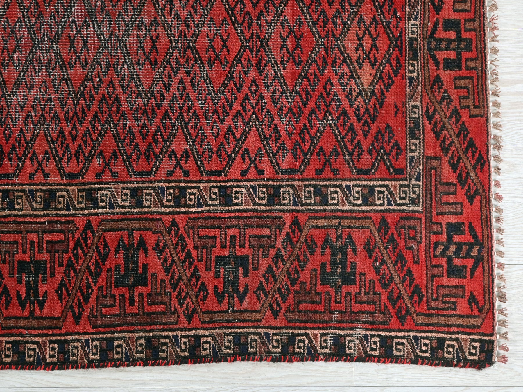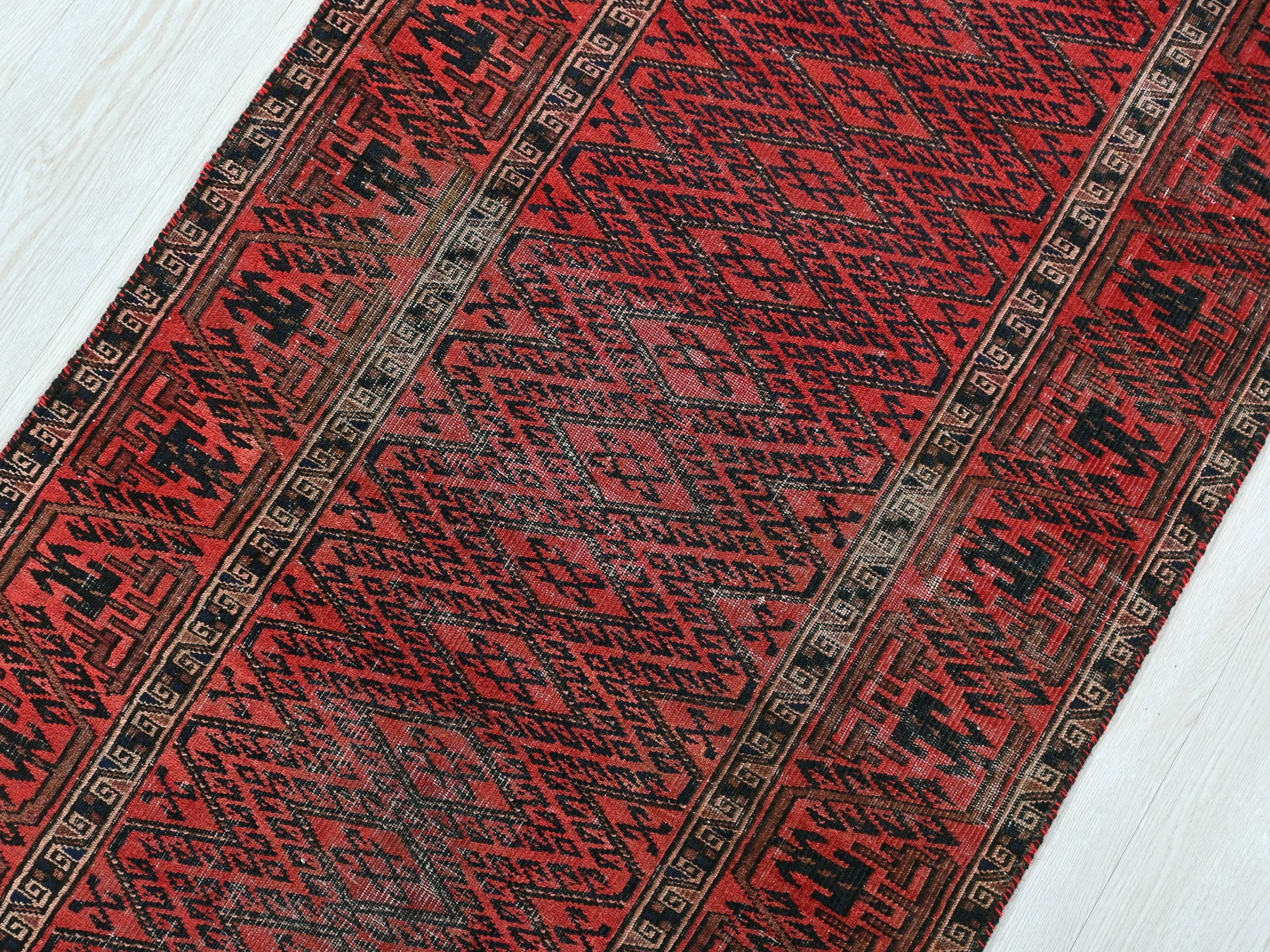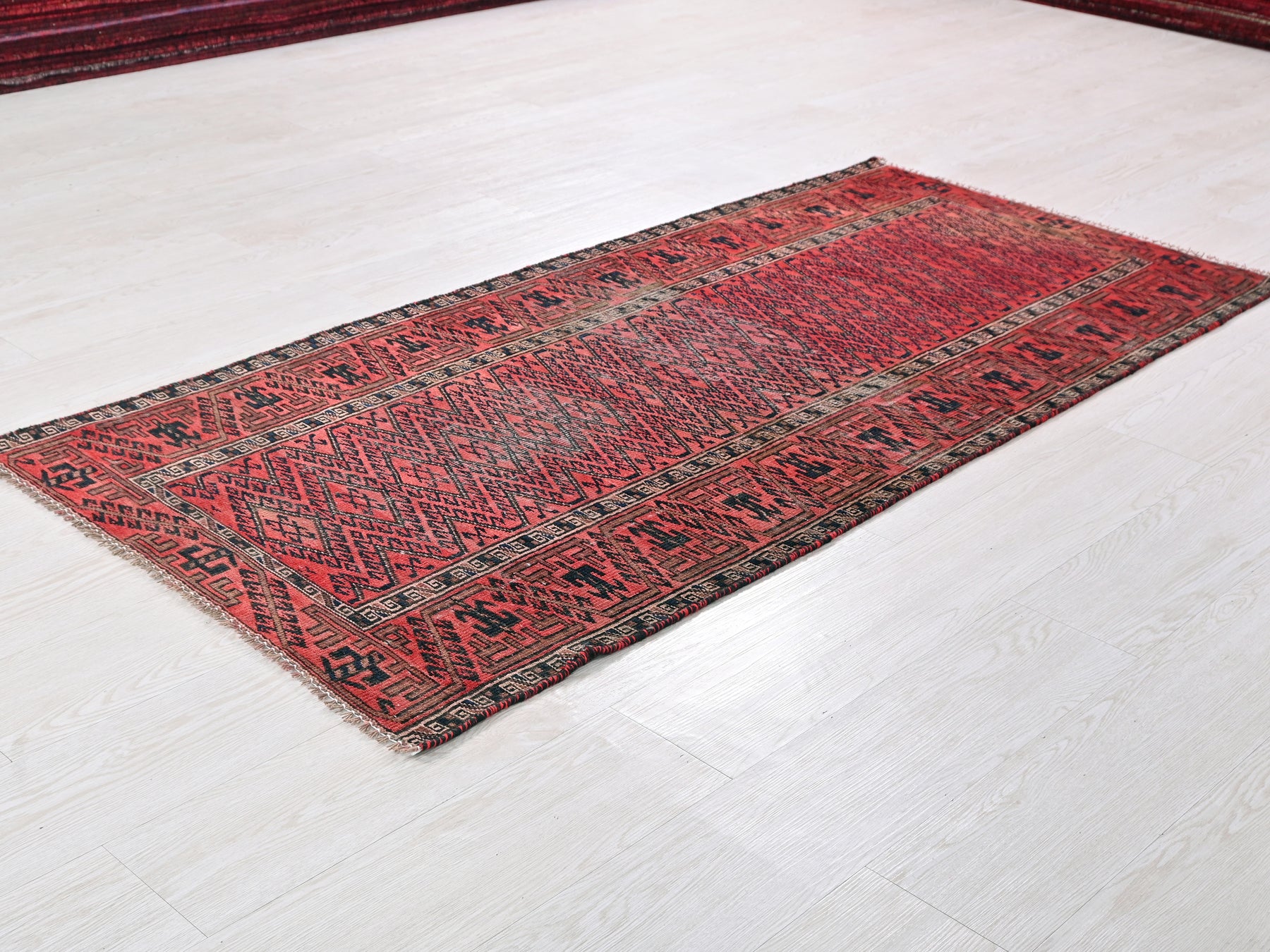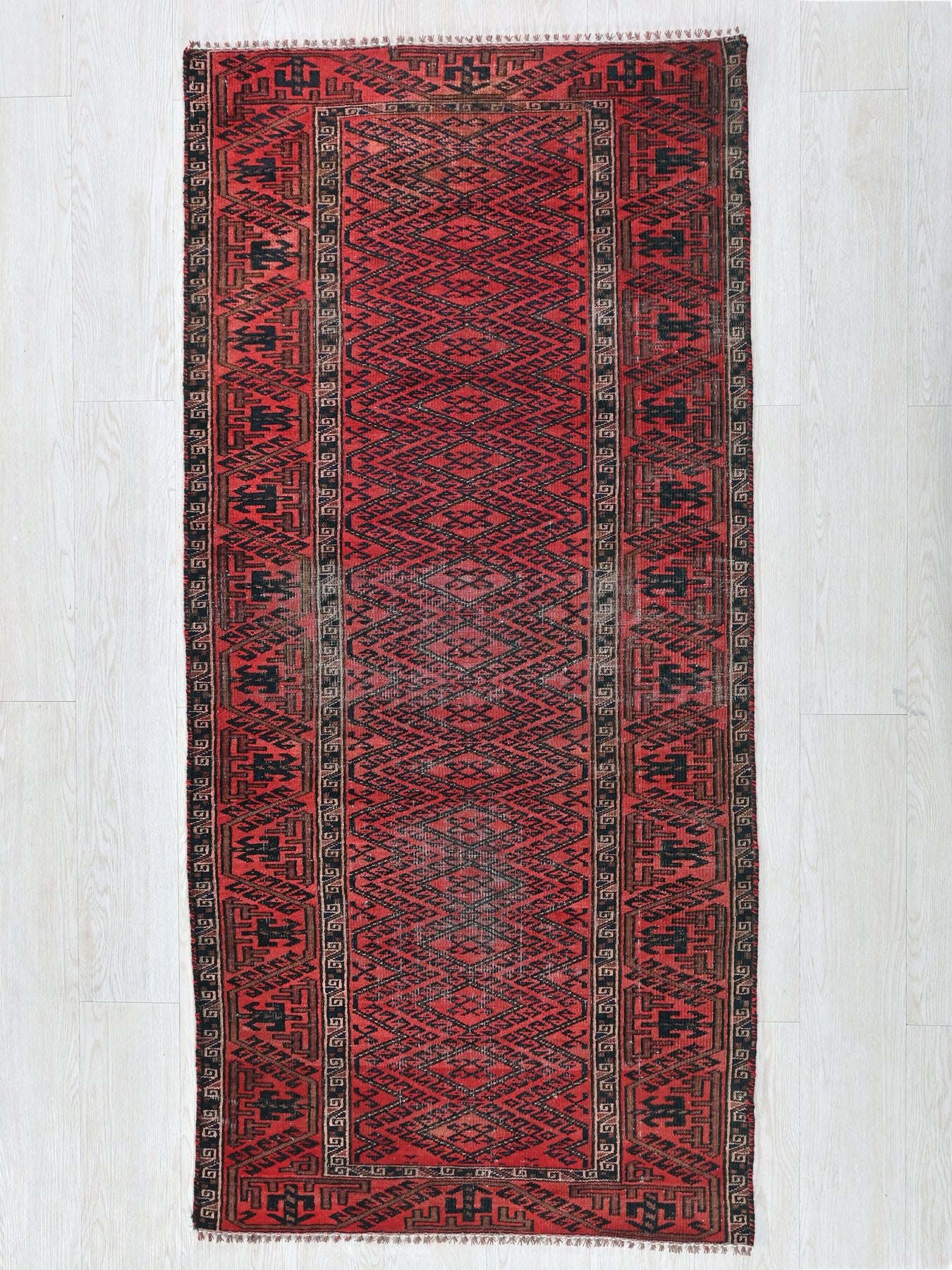This is a hand-knotted, one-of-a-kind vintage rug. Due to the nature of this piece, there may be slight imperfections in its wear, shape, dimensions, and color. All of our rugs are professionally cleaned and repaired.