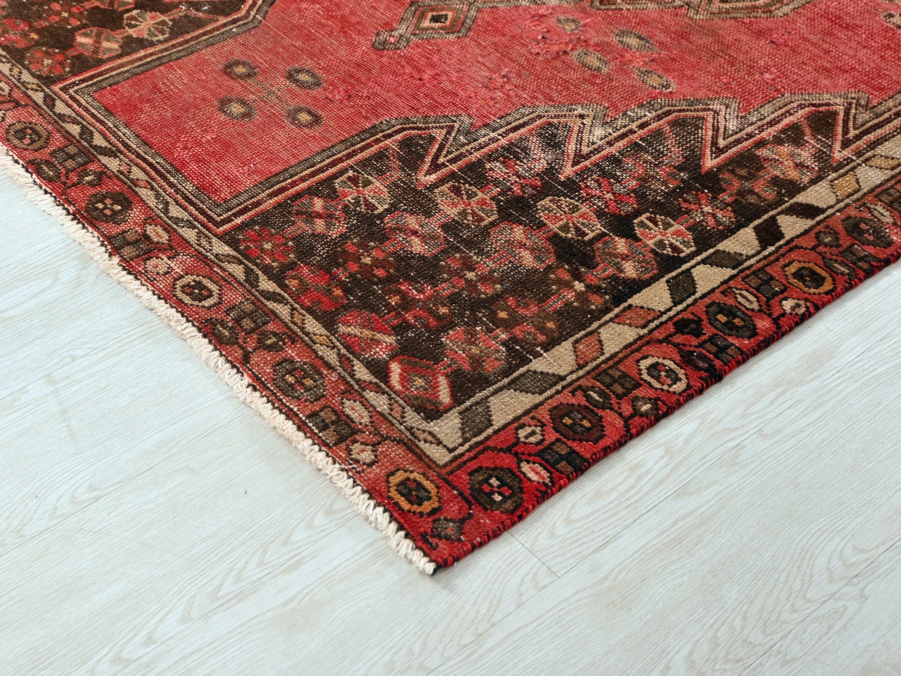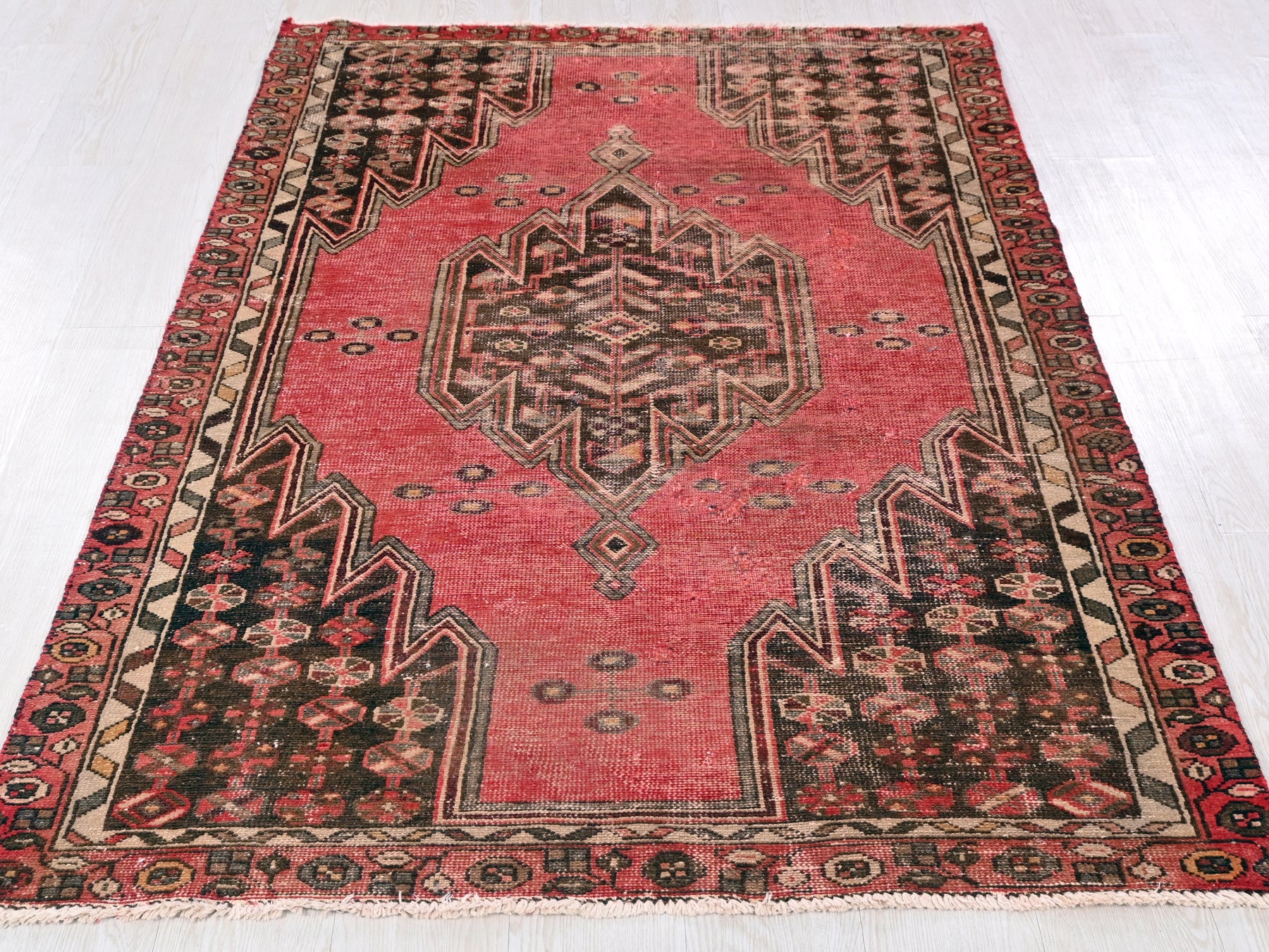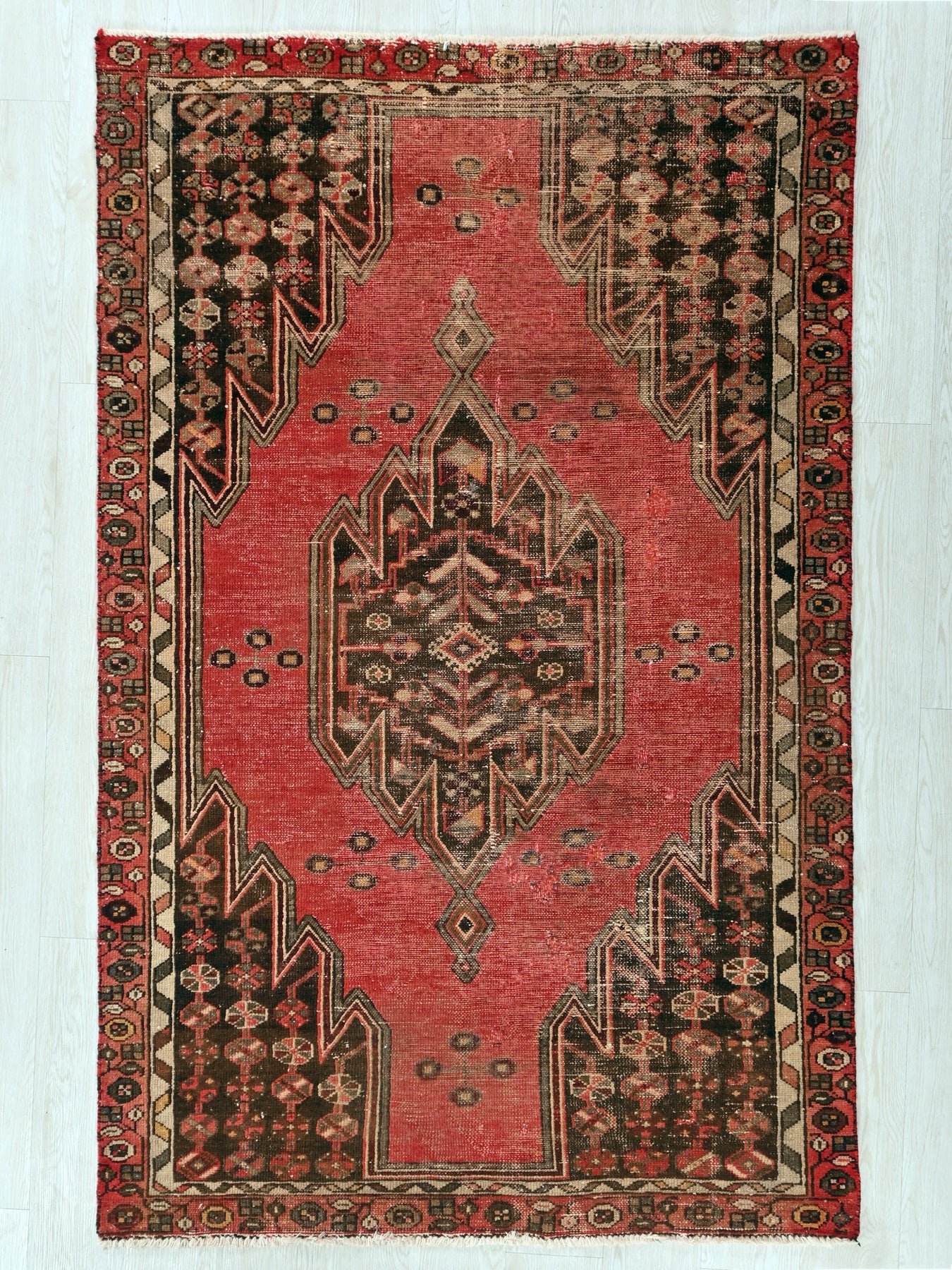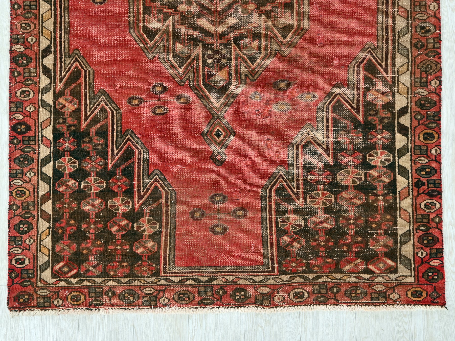 This is a hand-knotted, one-of-a-kind vintage rug. Due to the nature of this piece, there may be slight imperfections in its wear, shape, dimensions, and color. All of our rugs are professionally cleaned and repaired.