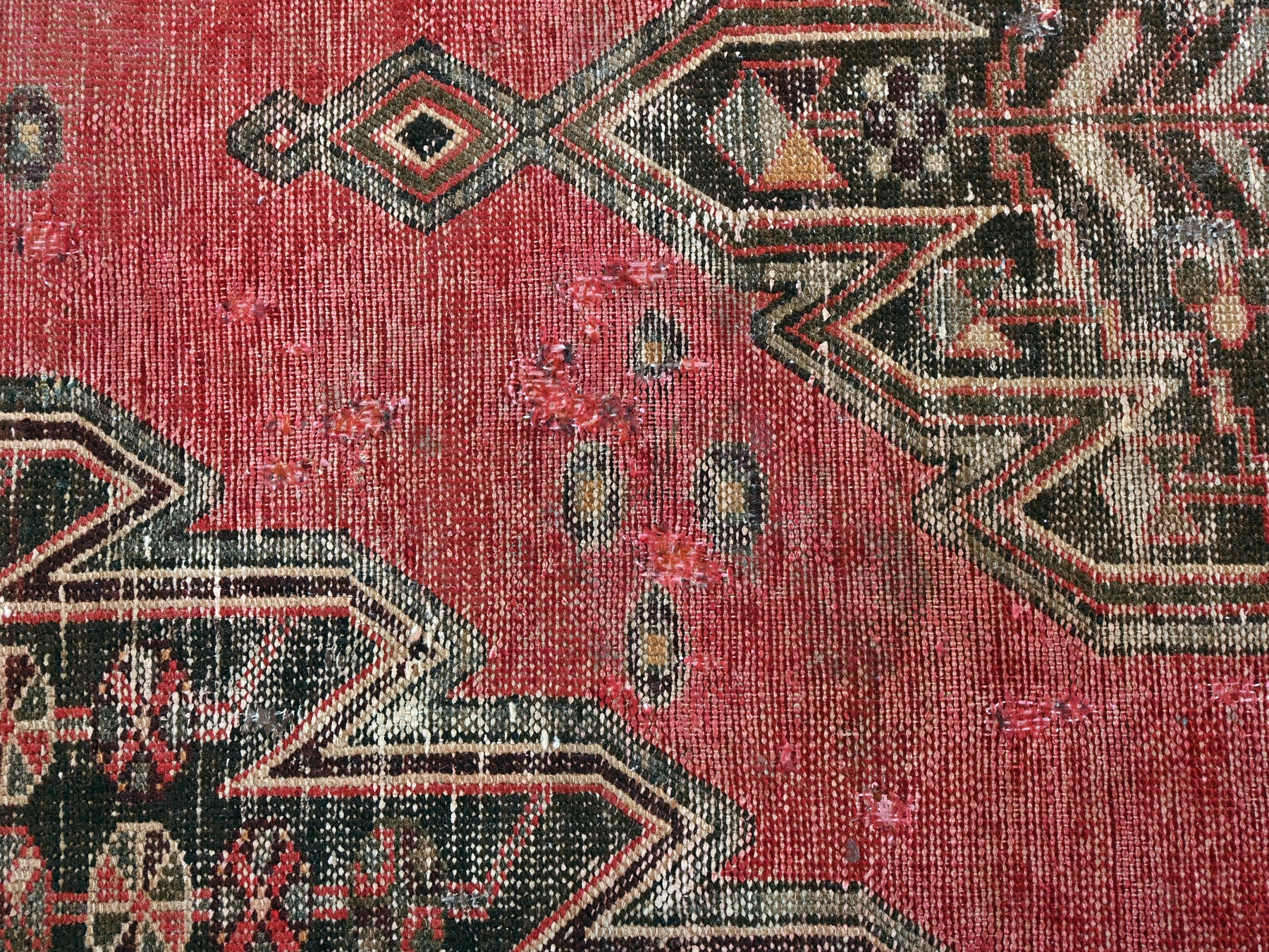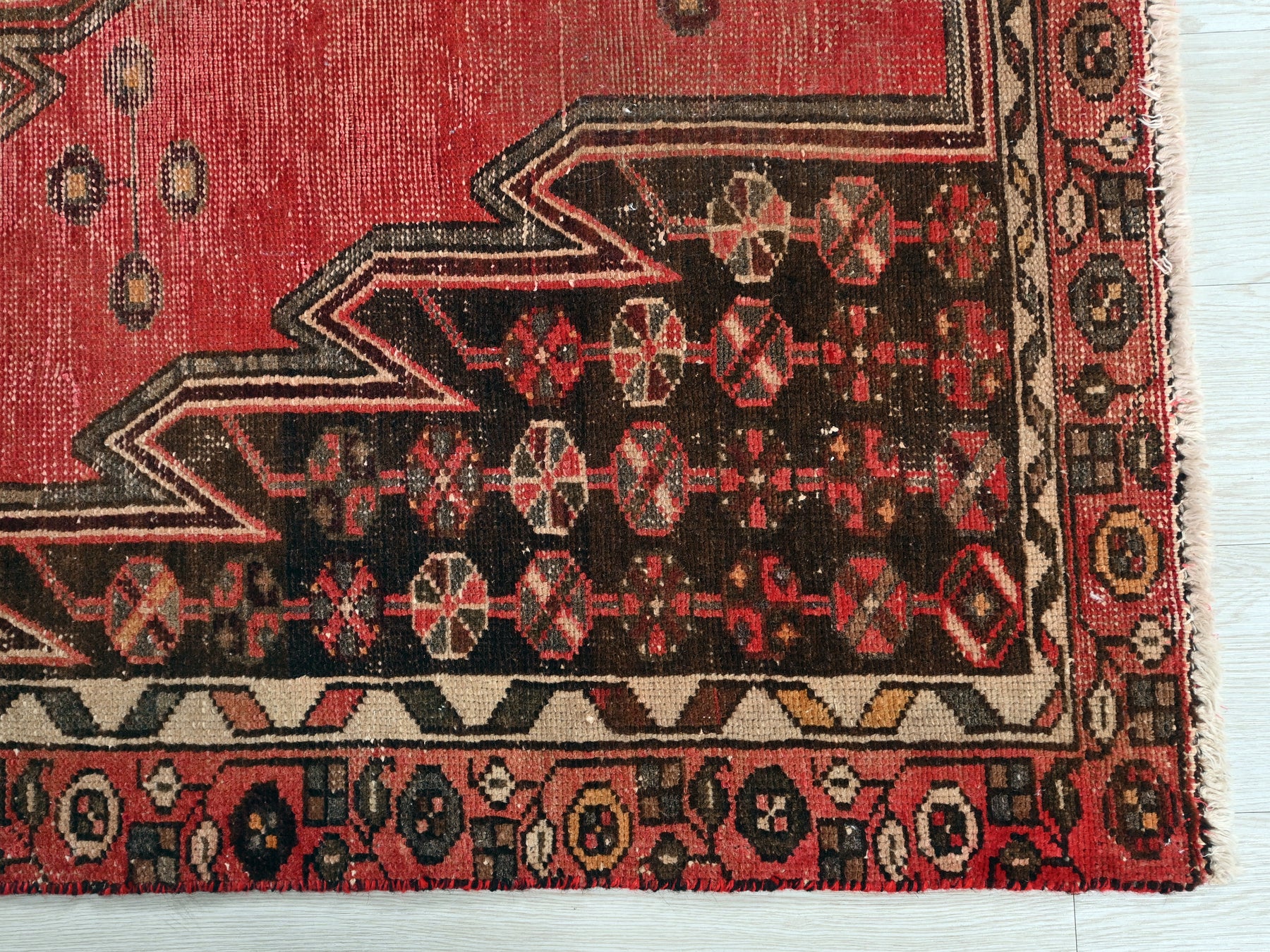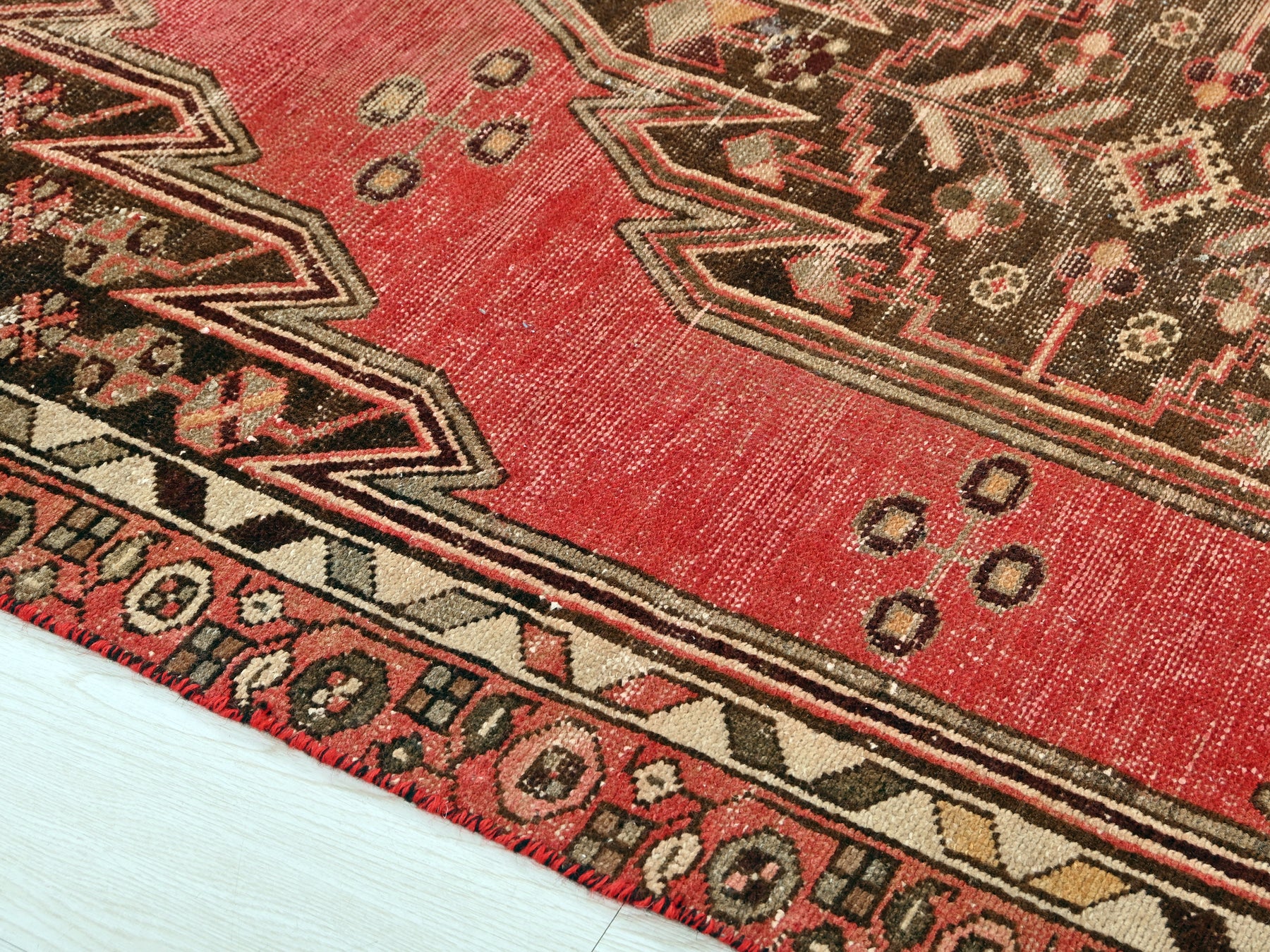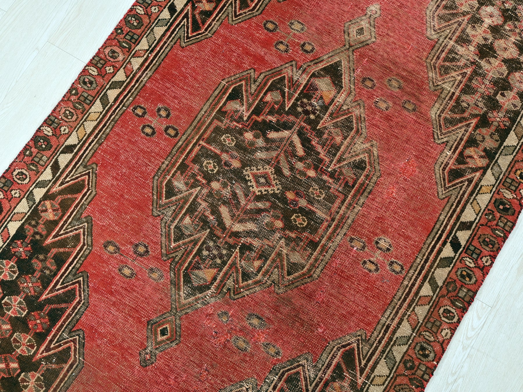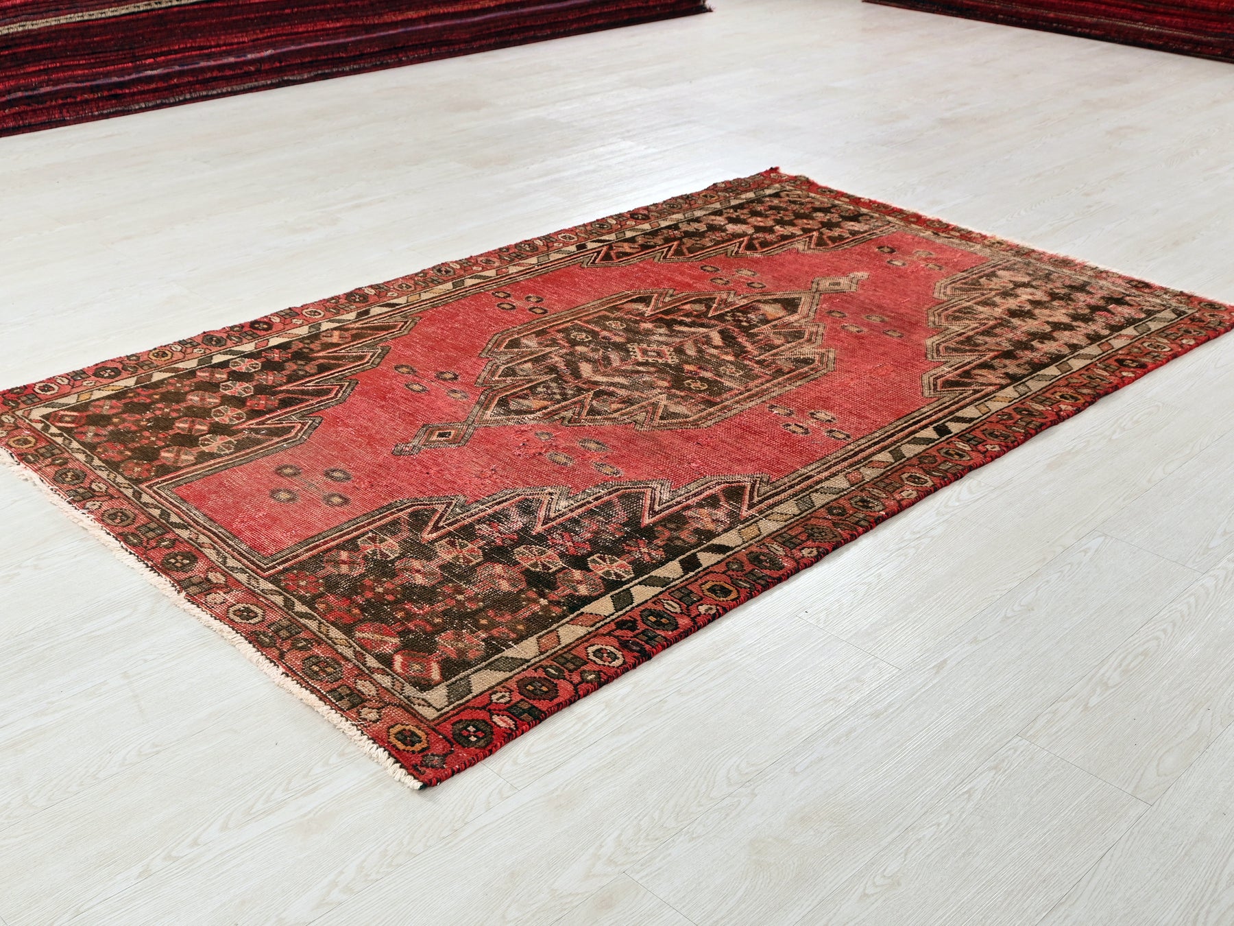 This is a hand-knotted, one-of-a-kind vintage rug. Due to the nature of this piece, there may be slight imperfections in its wear, shape, dimensions, and color. All of our rugs are professionally cleaned and repaired.