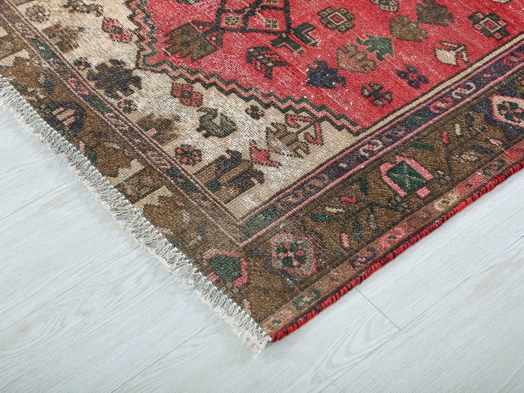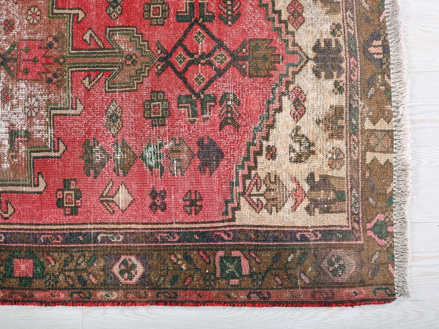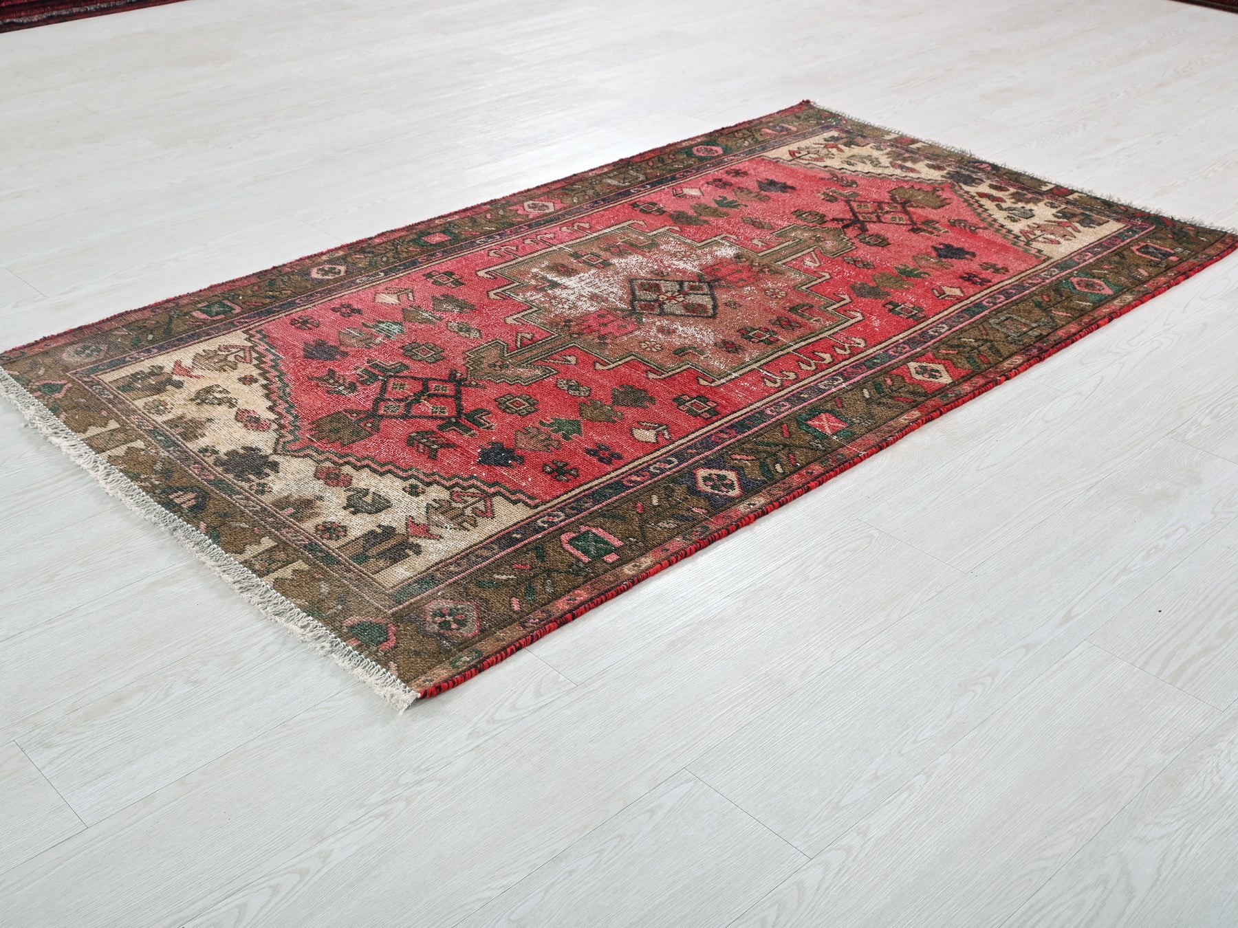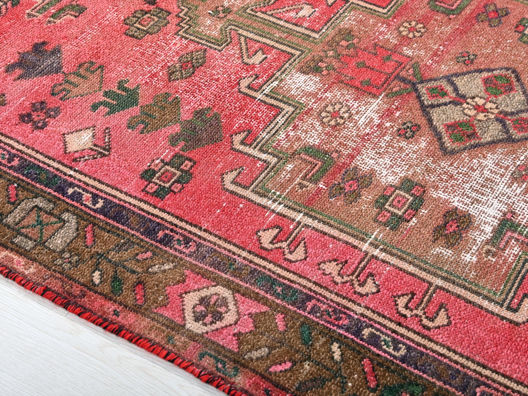 This is a hand-knotted, one-of-a-kind vintage rug. Due to the nature of this piece, there may be slight imperfections in its wear, shape, dimensions, and color. All of our rugs are professionally cleaned and repaired.