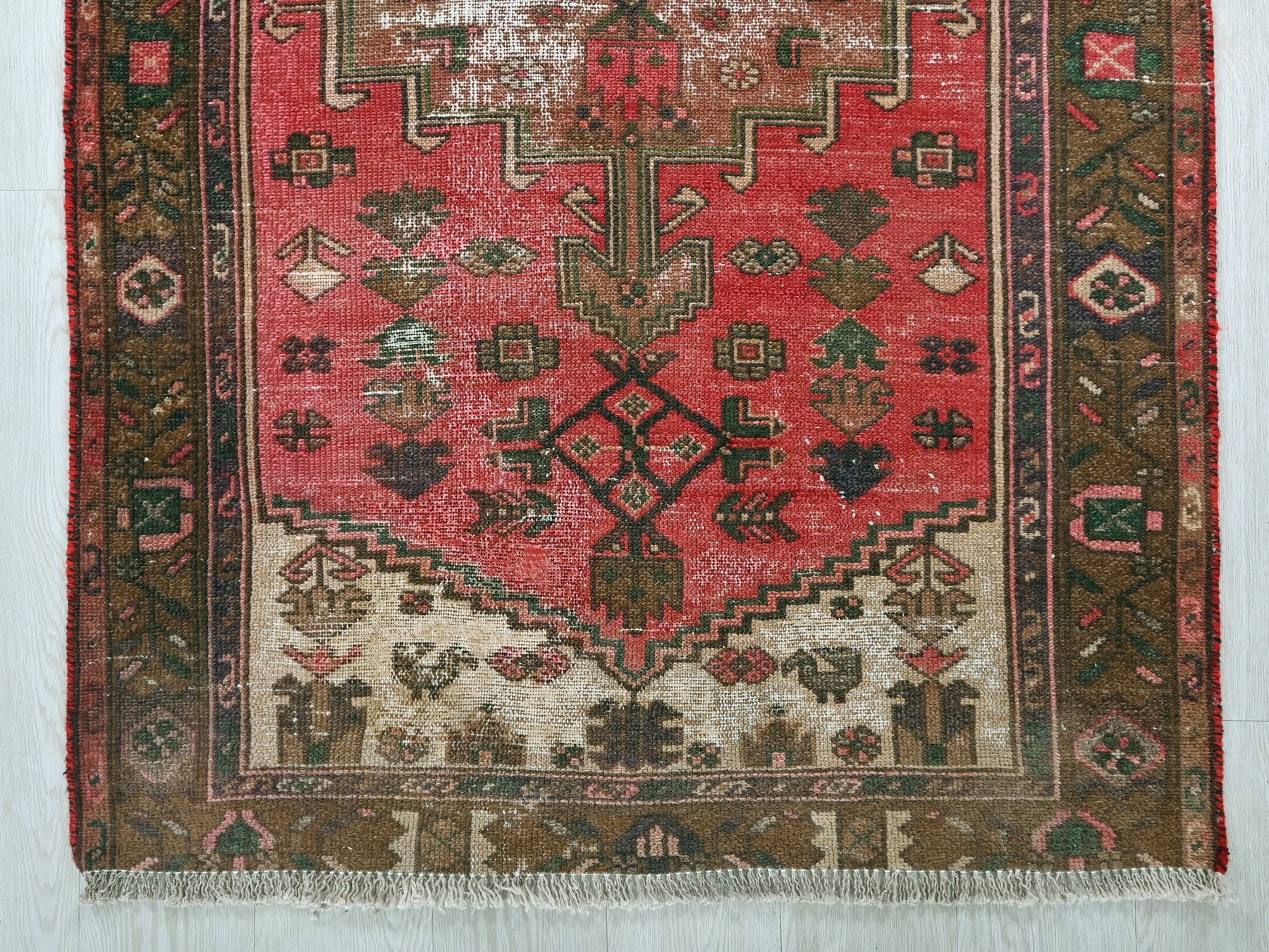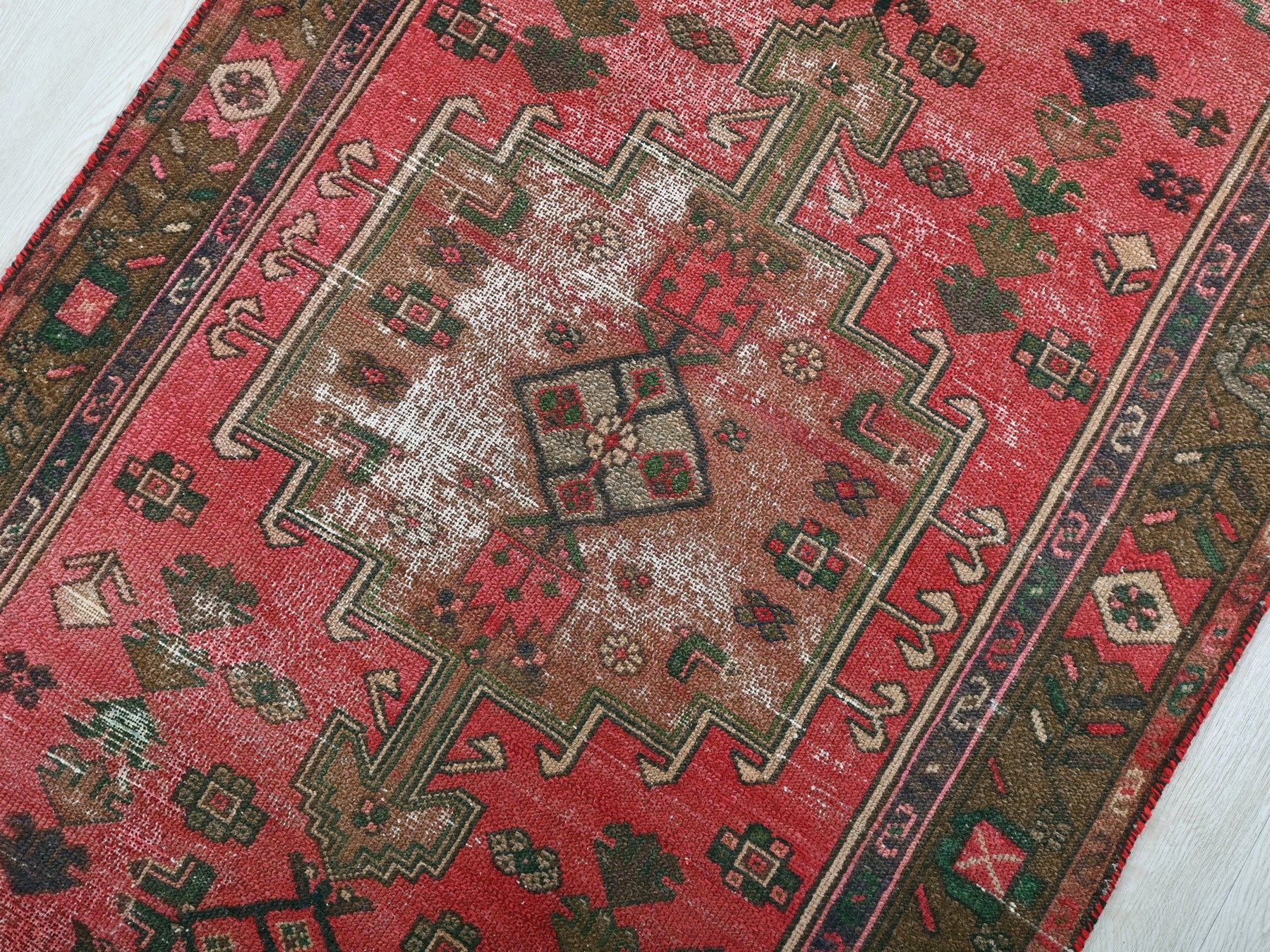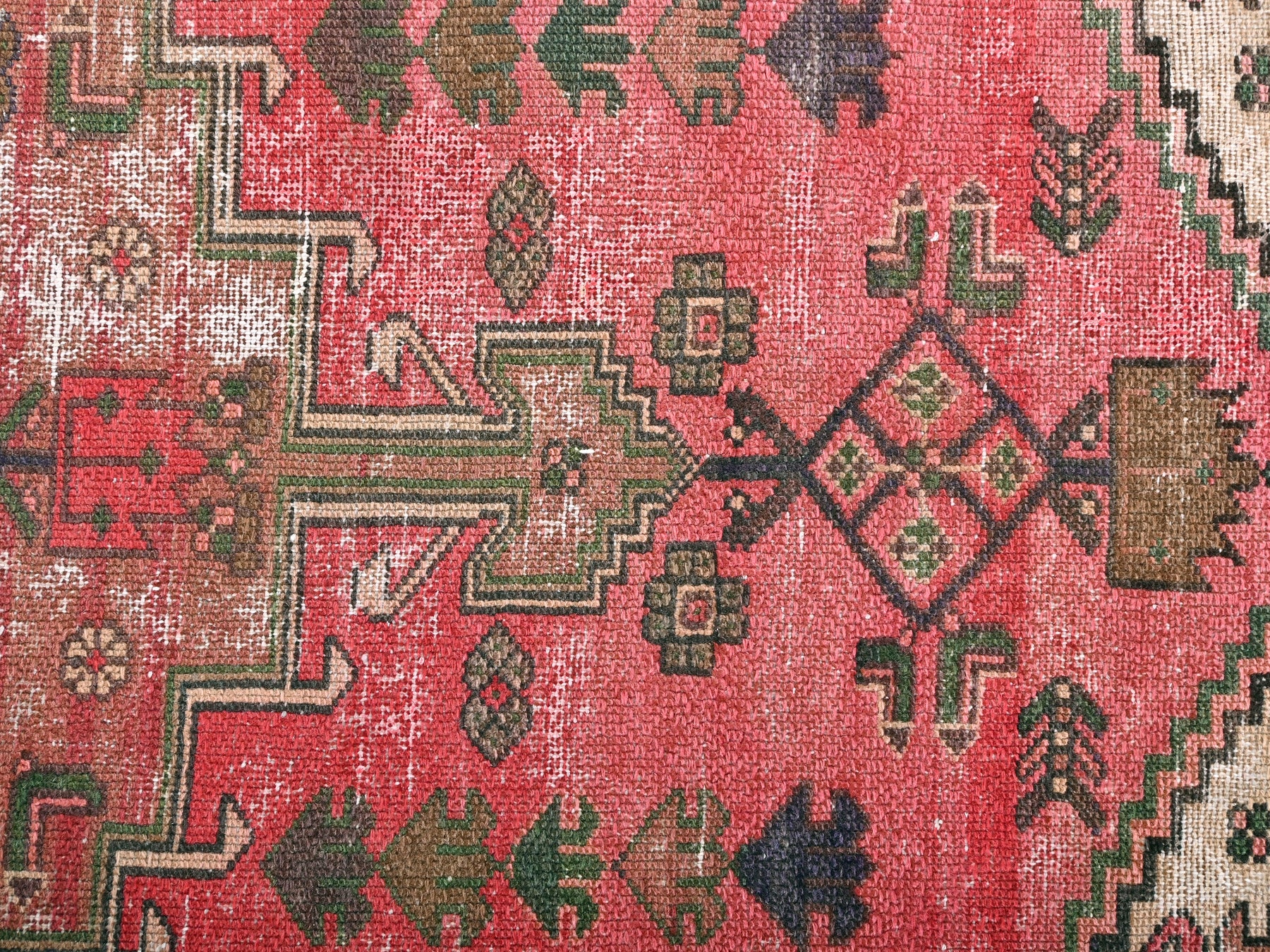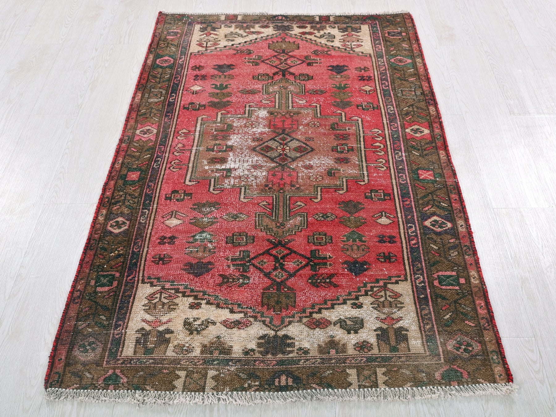 This is a hand-knotted, one-of-a-kind vintage rug. Due to the nature of this piece, there may be slight imperfections in its wear, shape, dimensions, and color. All of our rugs are professionally cleaned and repaired.