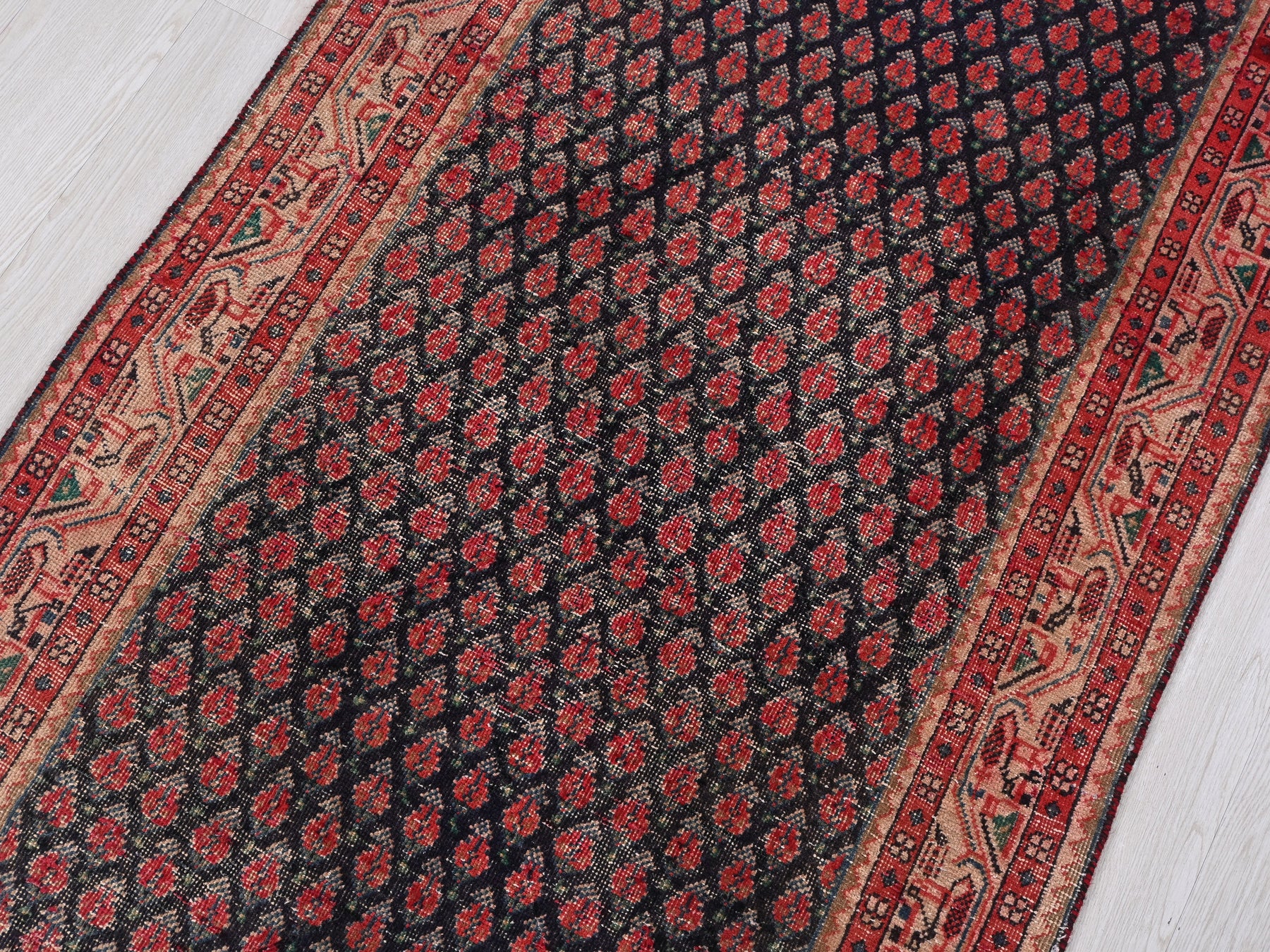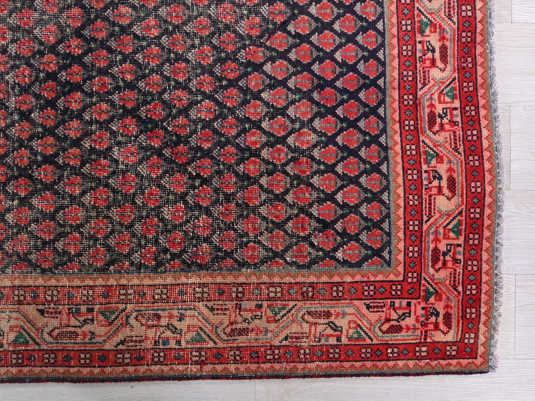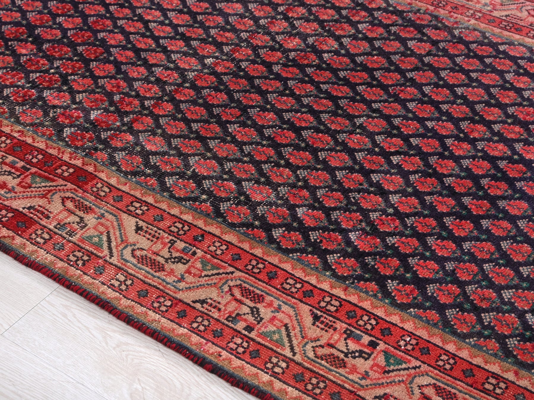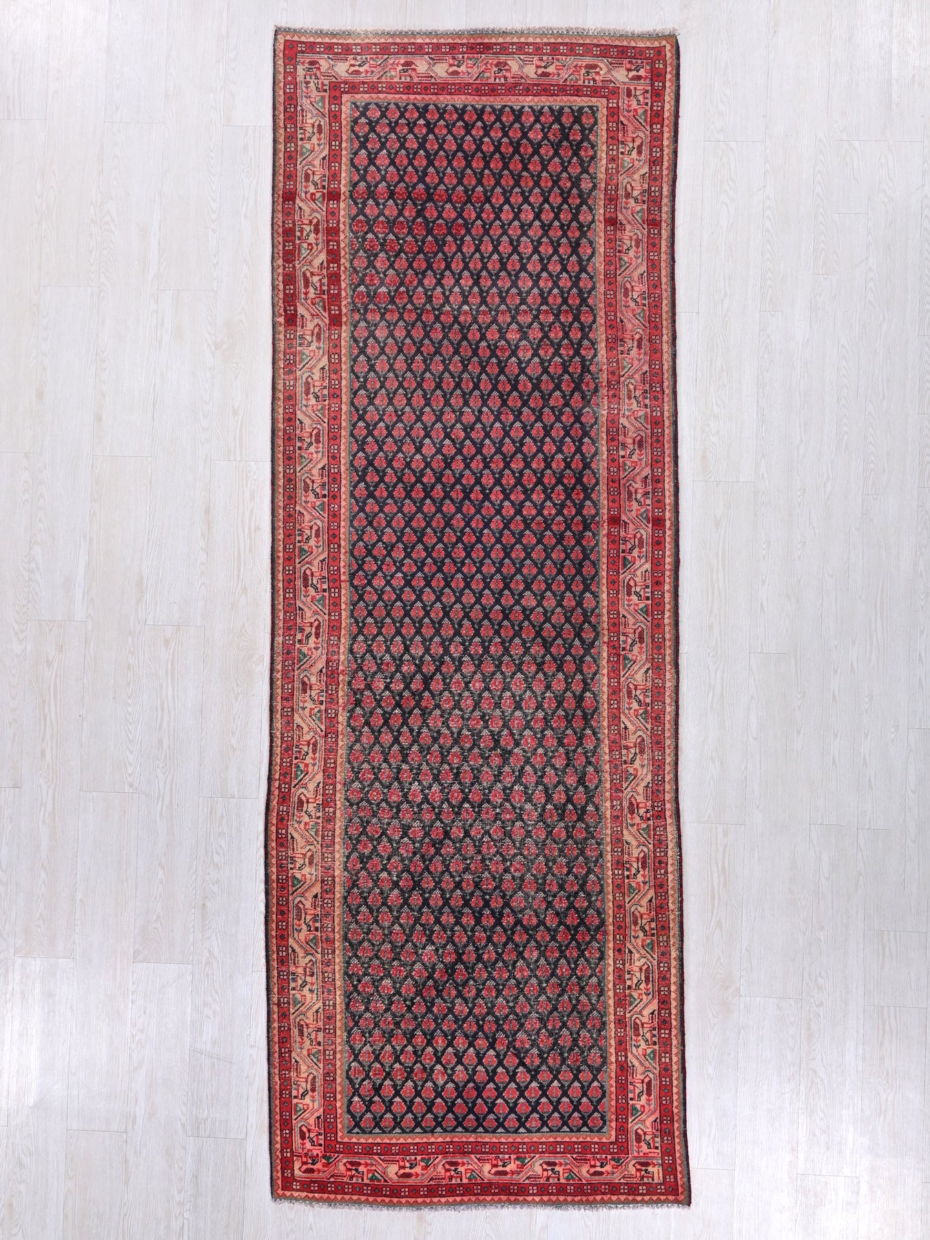This is a hand-knotted, one-of-a-kind vintage rug. Due to the nature of this piece, there may be slight imperfections in its wear, shape, dimensions, and color. All of our rugs are professionally cleaned and repaired.