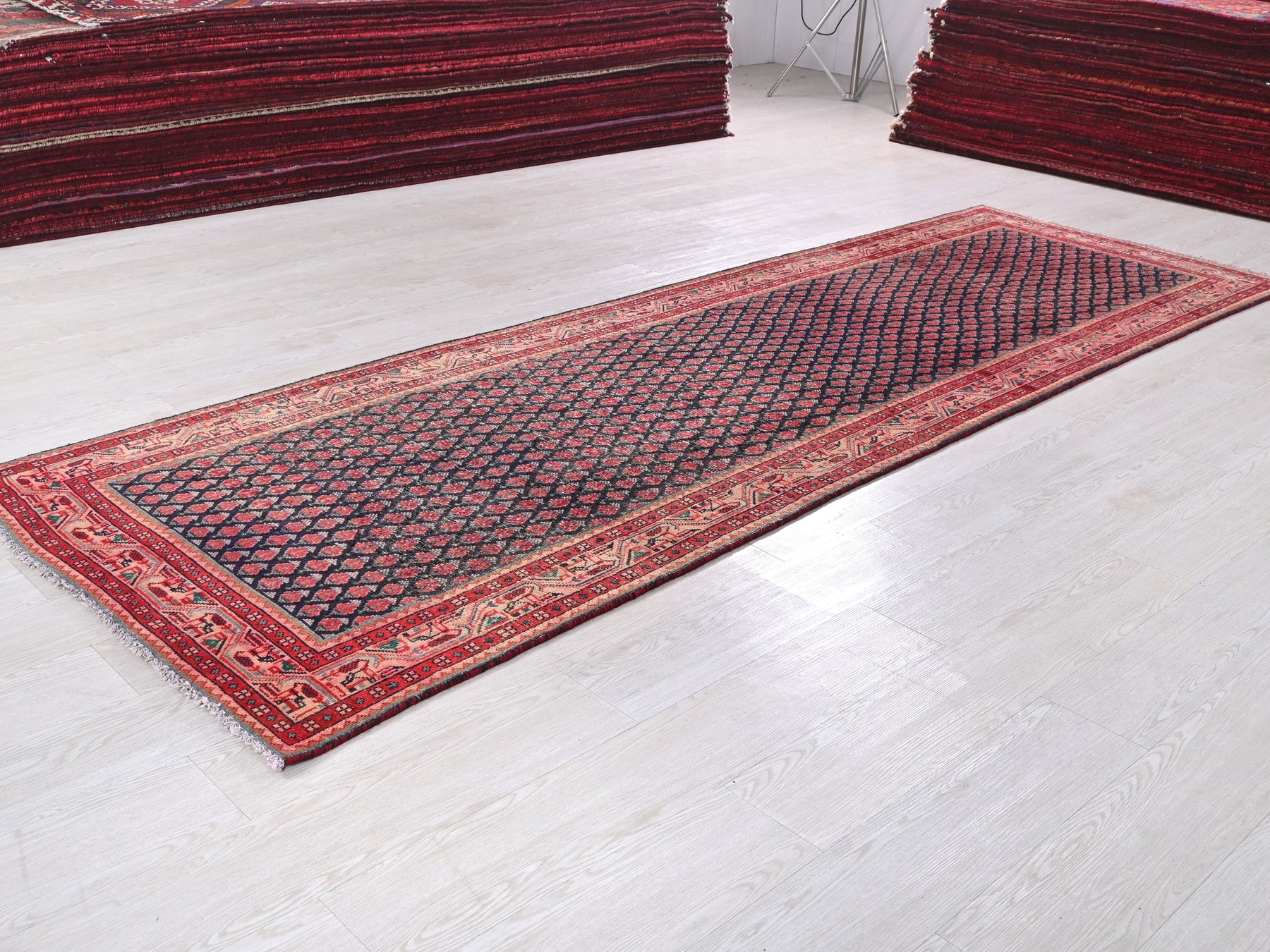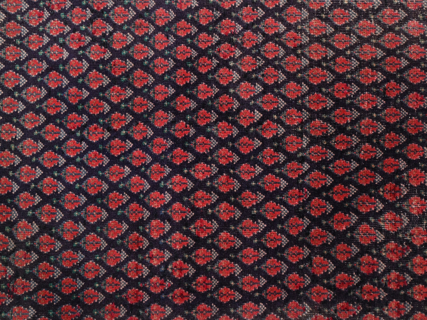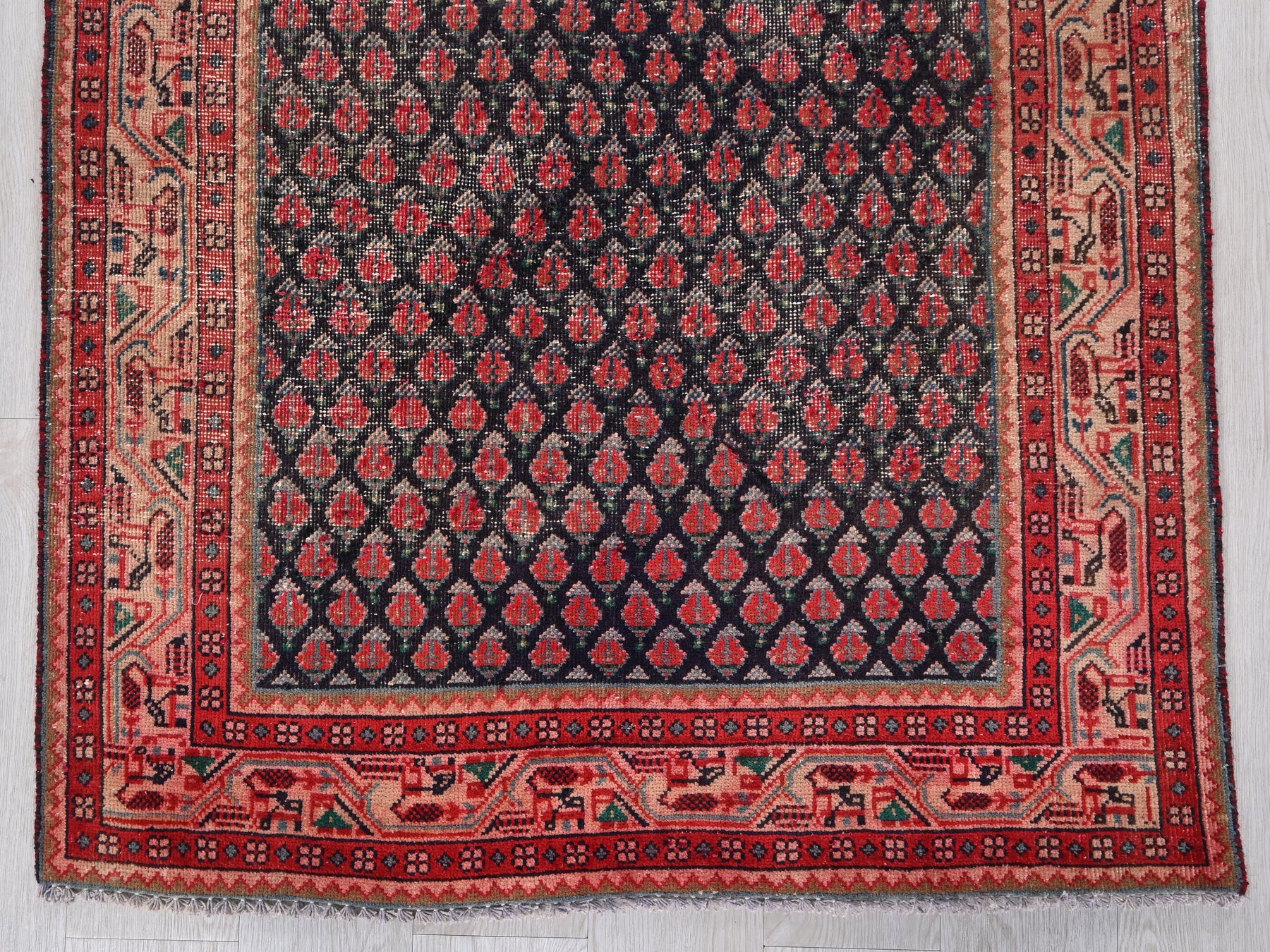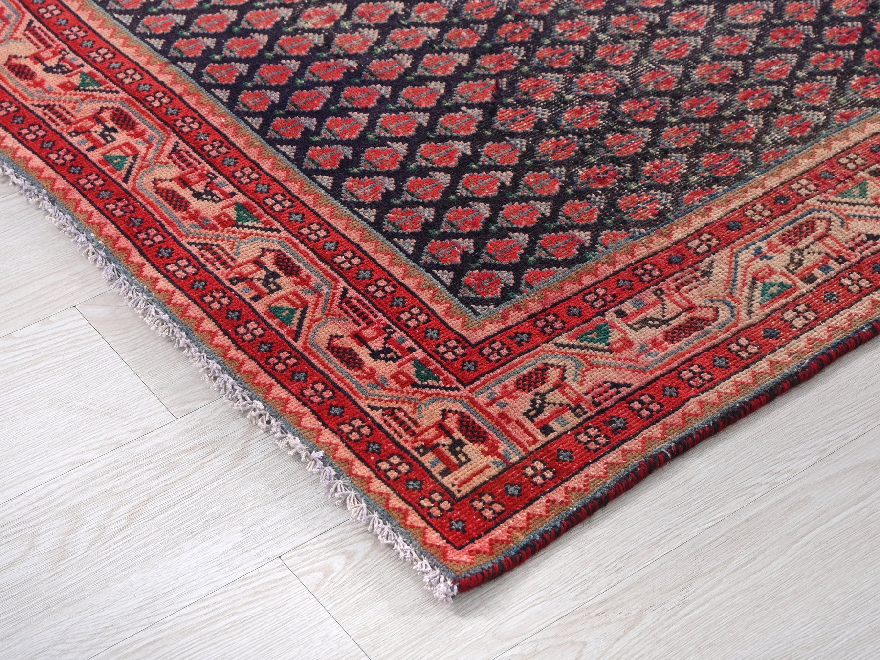 This is a hand-knotted, one-of-a-kind vintage rug. Due to the nature of this piece, there may be slight imperfections in its wear, shape, dimensions, and color. All of our rugs are professionally cleaned and repaired.