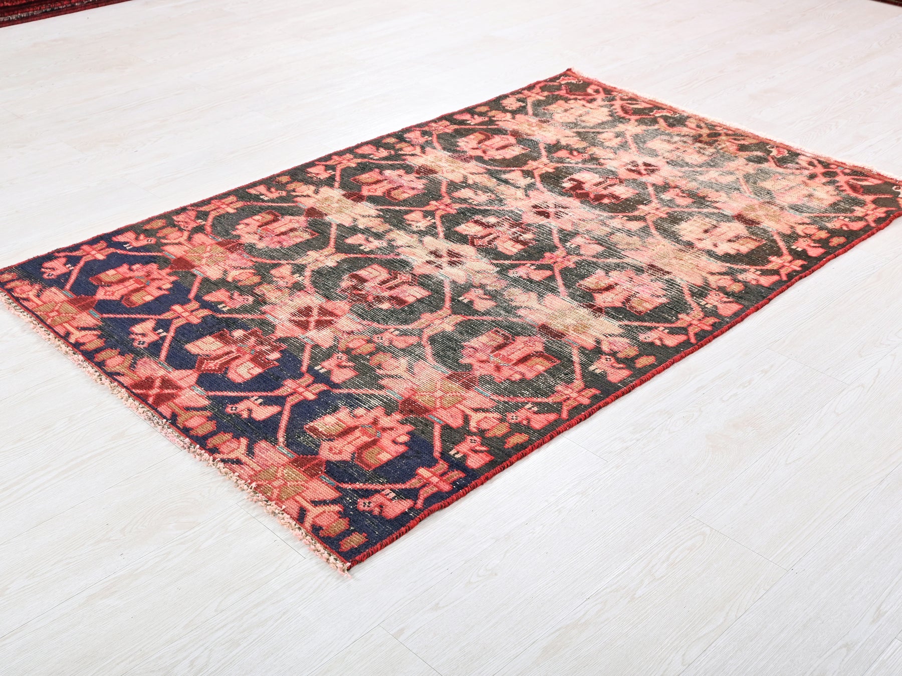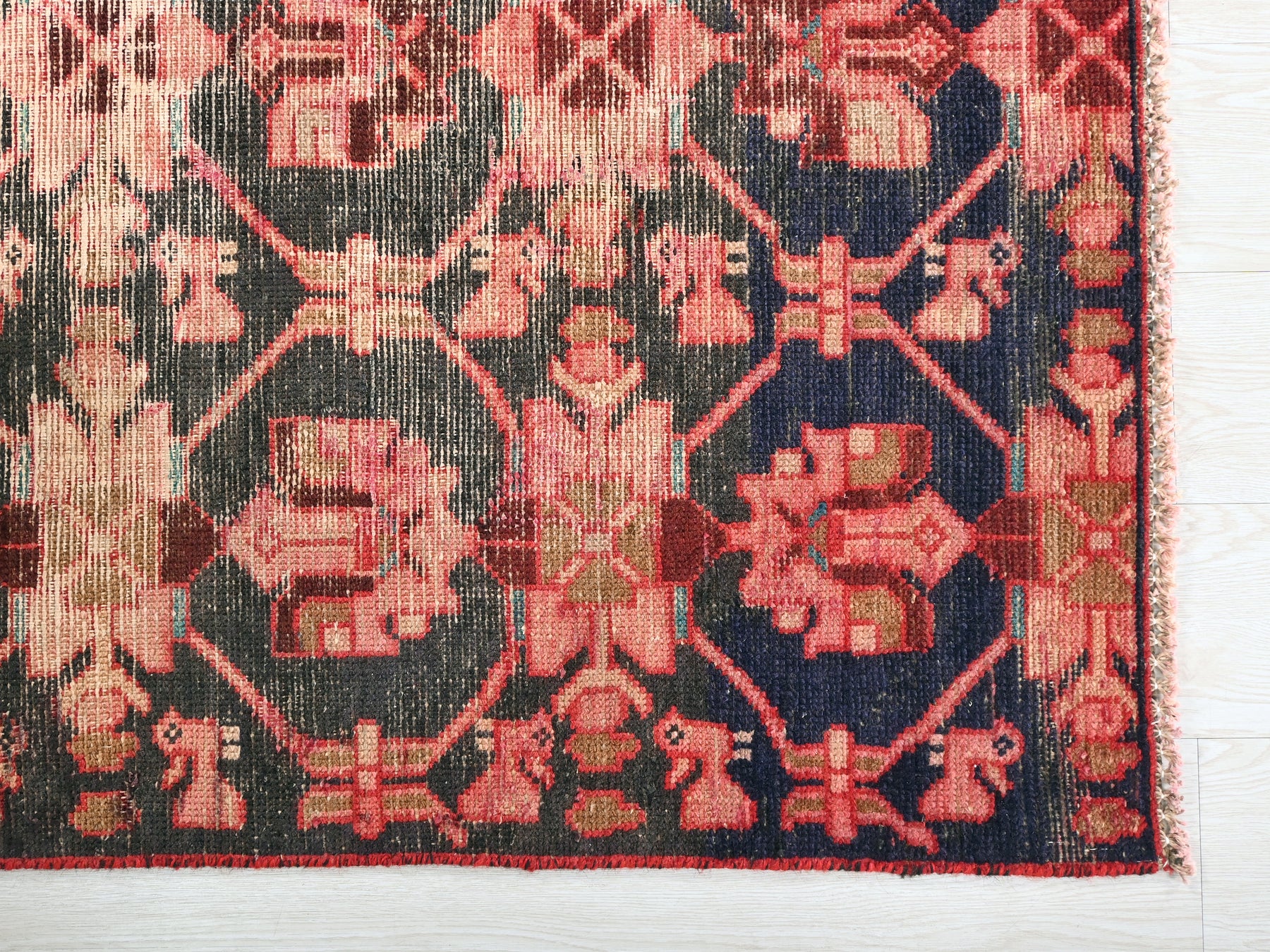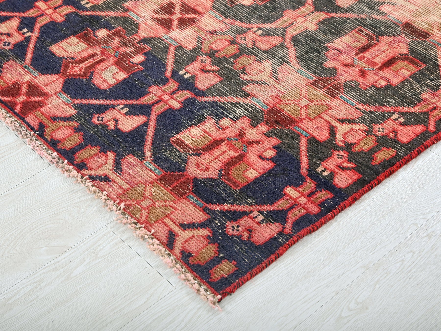 This is a hand-knotted, one-of-a-kind vintage rug. Due to the nature of this piece, there may be slight imperfections in its wear, shape, dimensions, and color. All of our rugs are professionally cleaned and repaired.