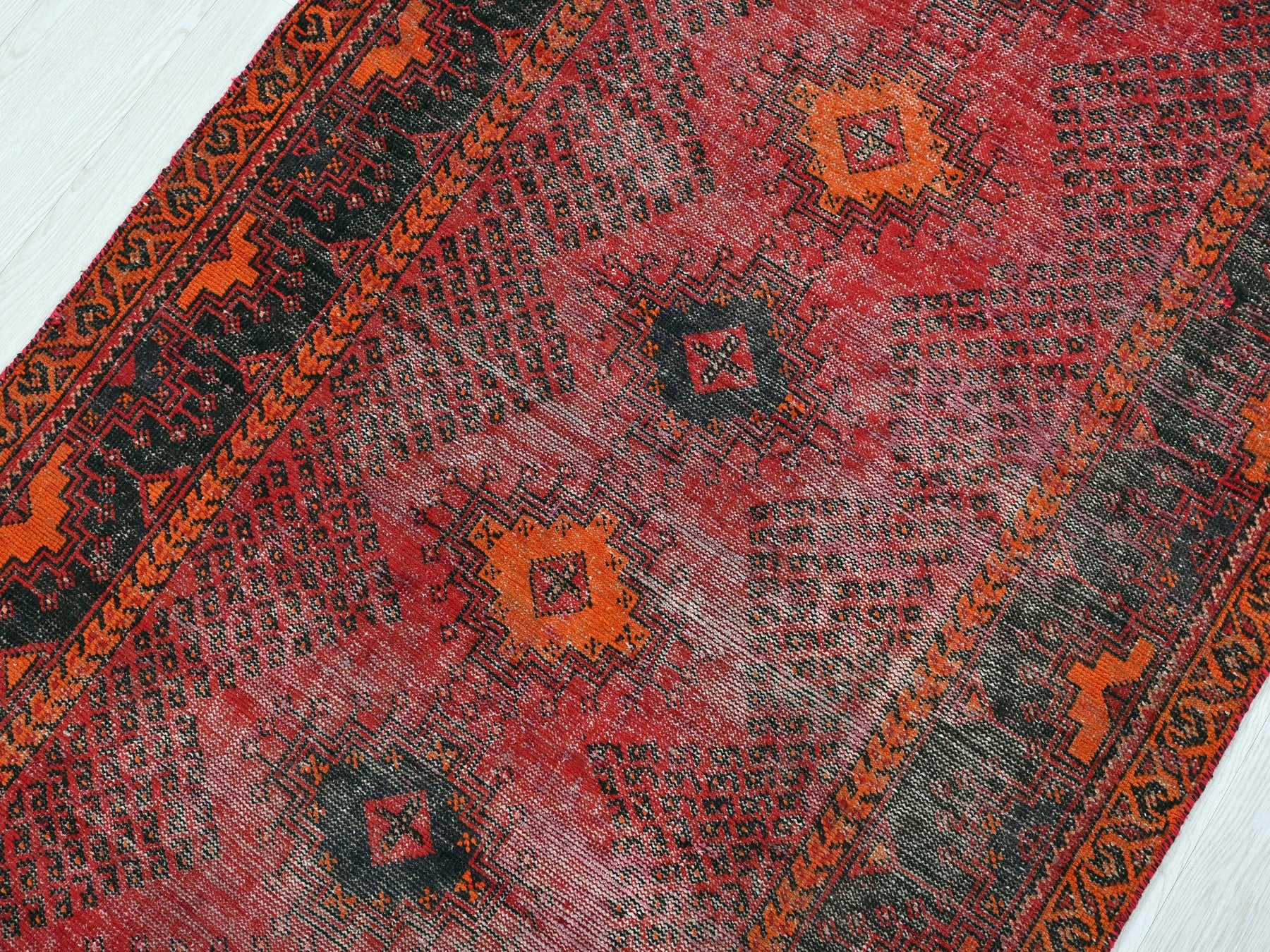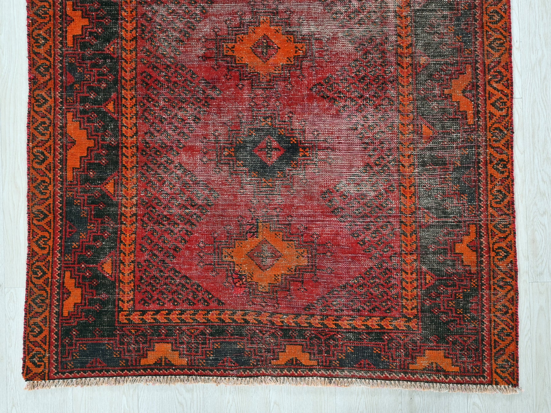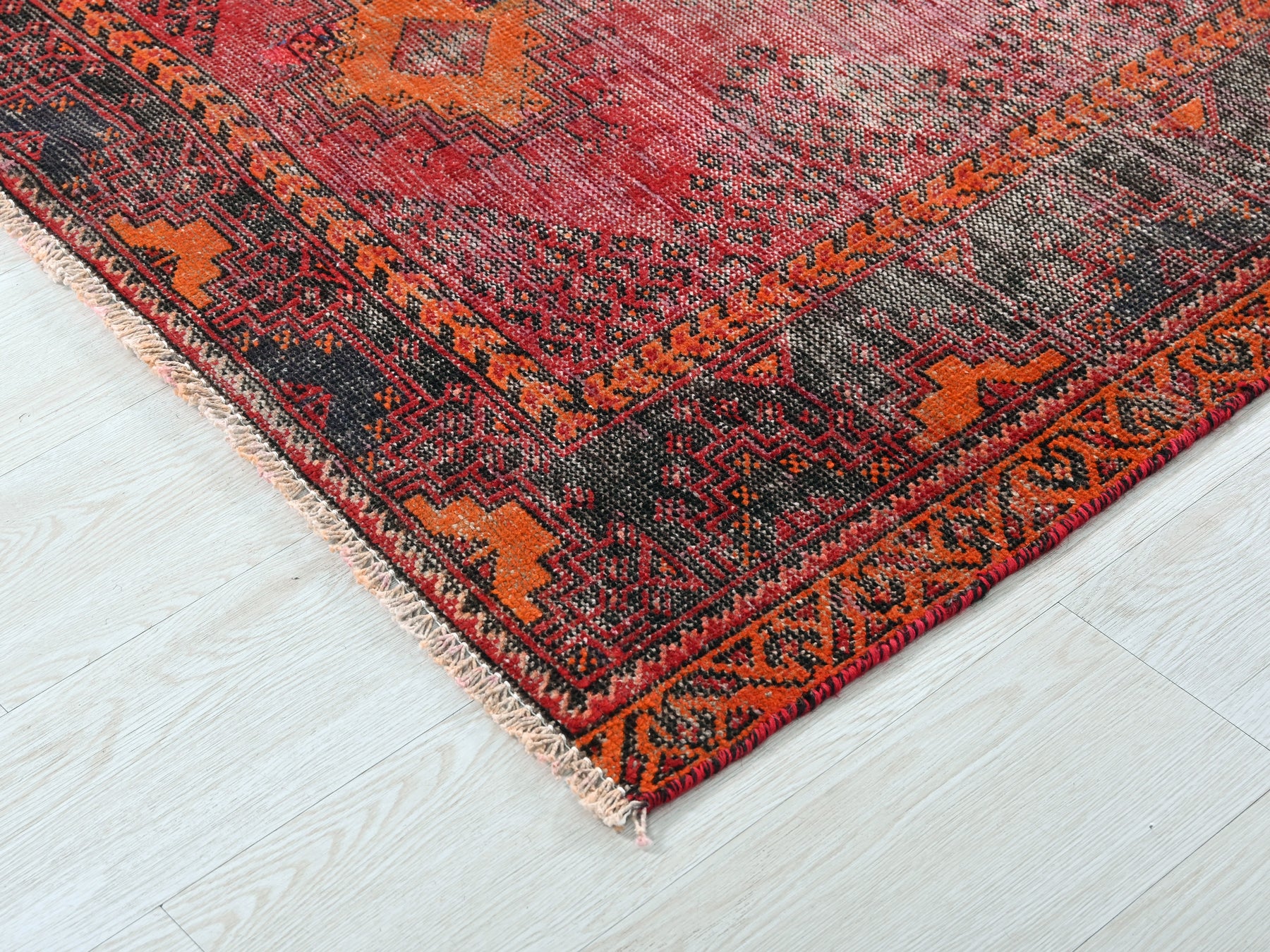 This is a hand-knotted, one-of-a-kind vintage rug. Due to the nature of this piece, there may be slight imperfections in its wear, shape, dimensions, and color. All of our rugs are professionally cleaned and repaired.