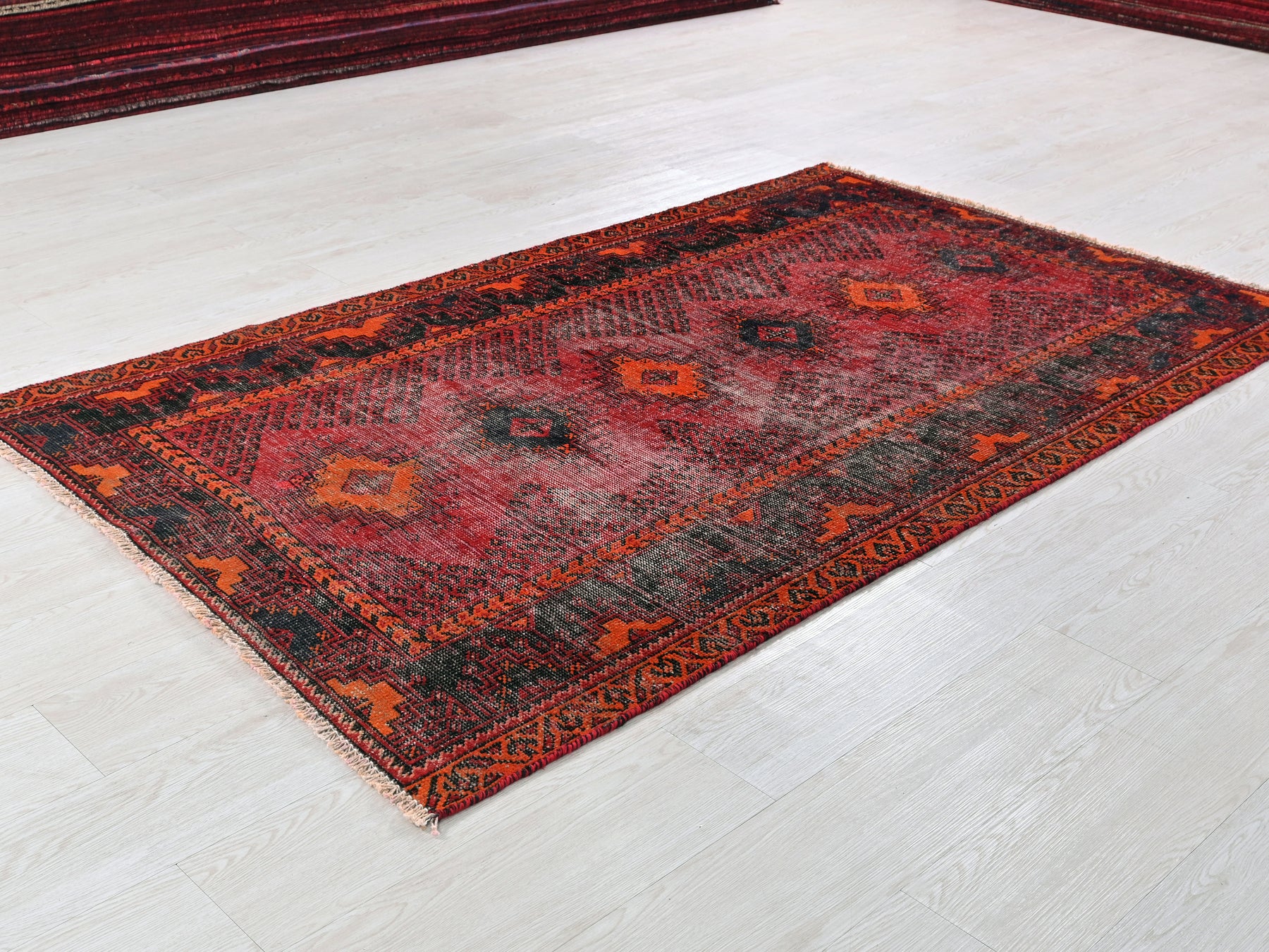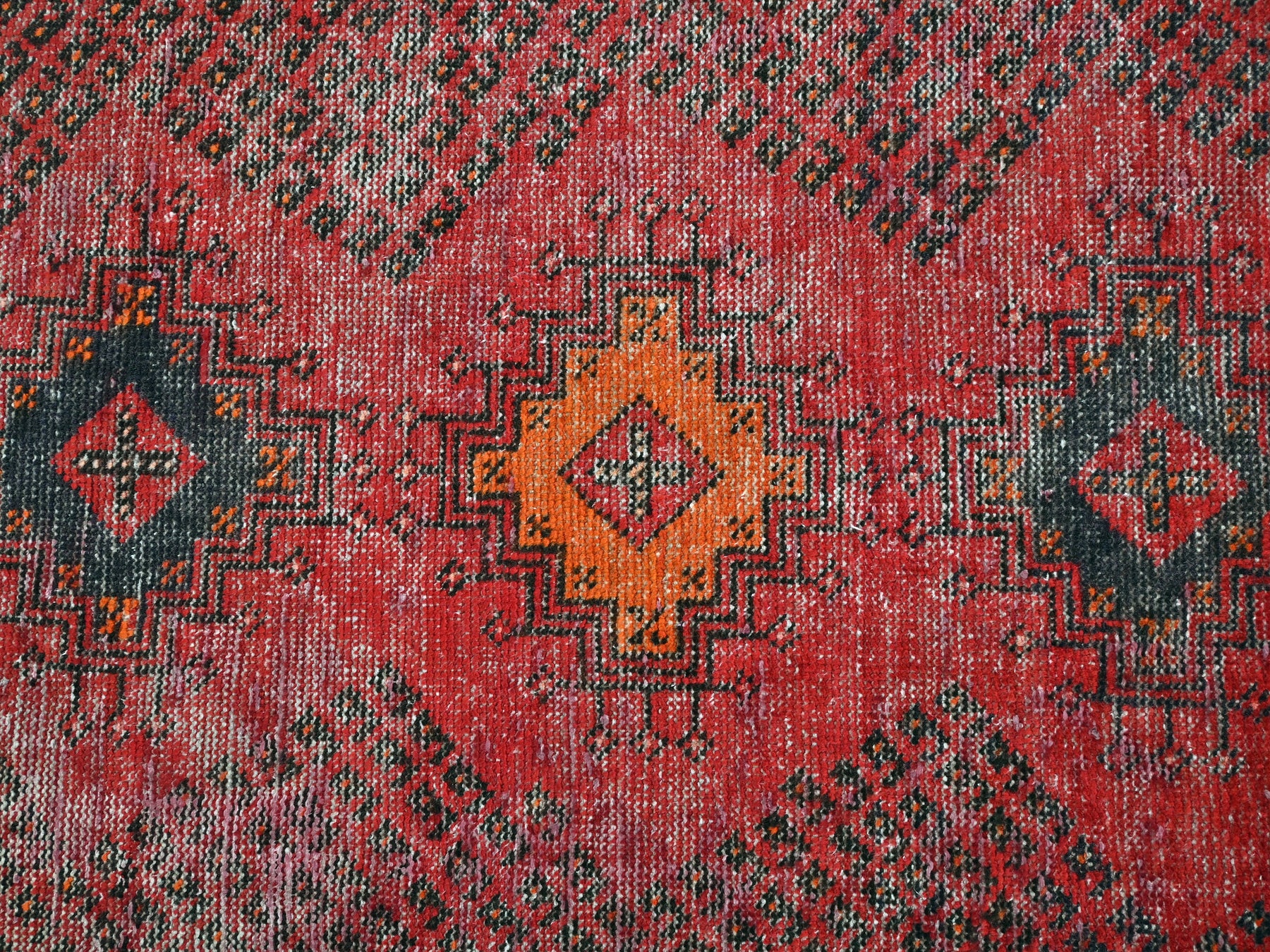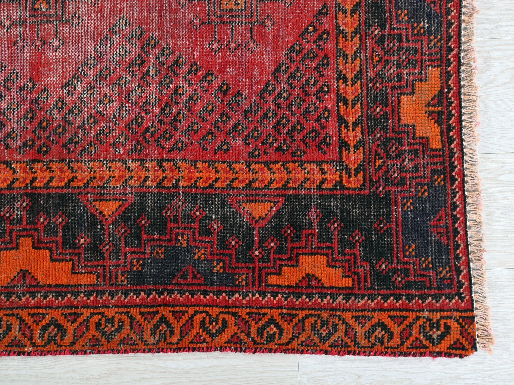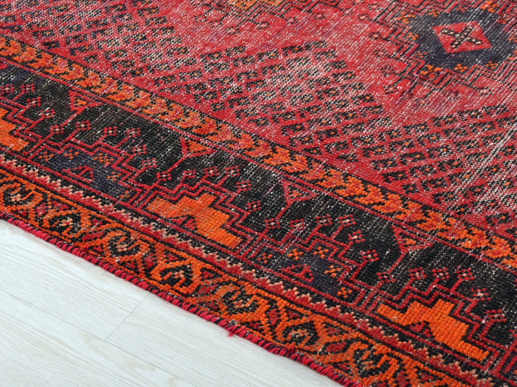 This is a hand-knotted, one-of-a-kind vintage rug. Due to the nature of this piece, there may be slight imperfections in its wear, shape, dimensions, and color. All of our rugs are professionally cleaned and repaired.