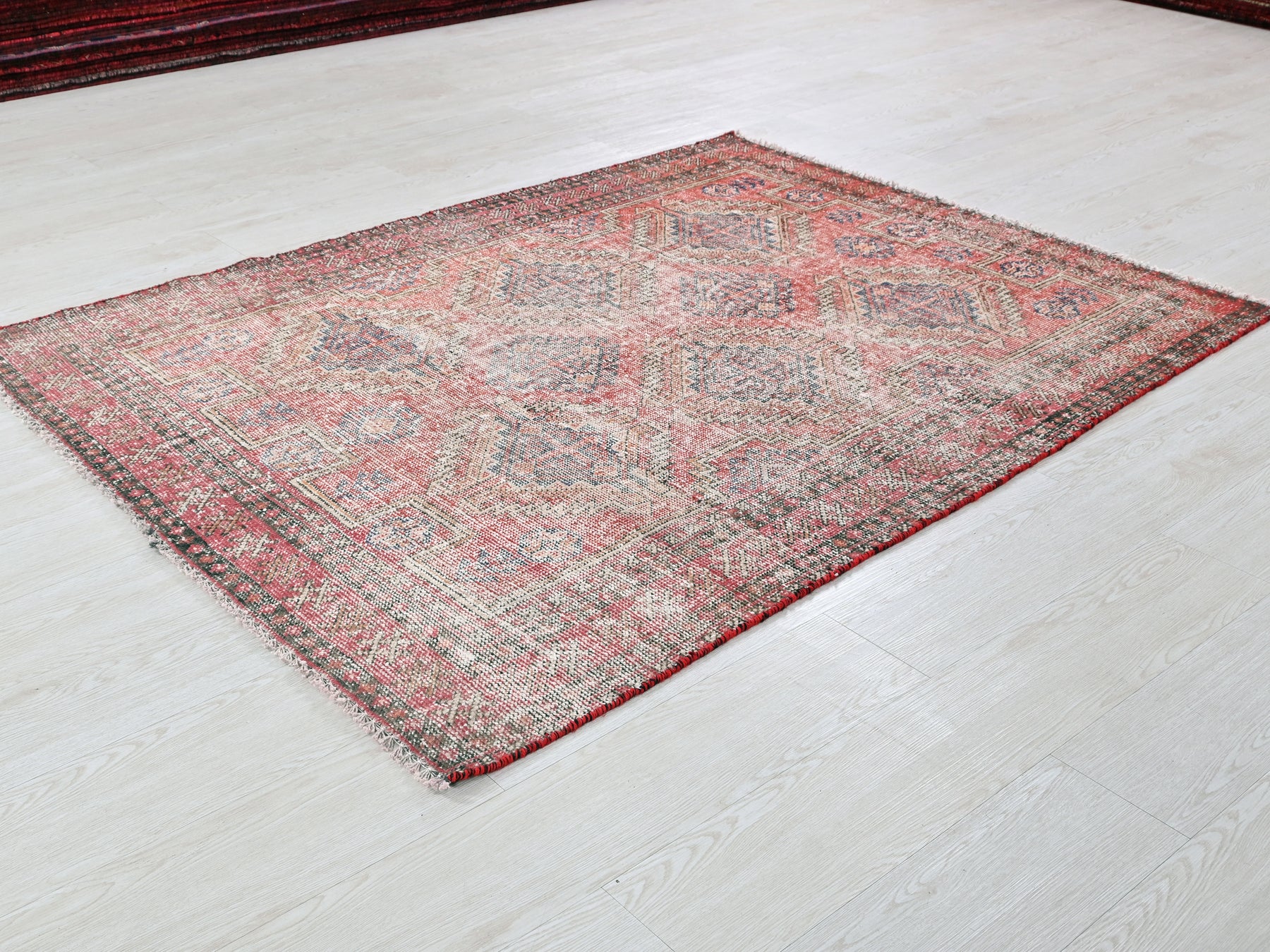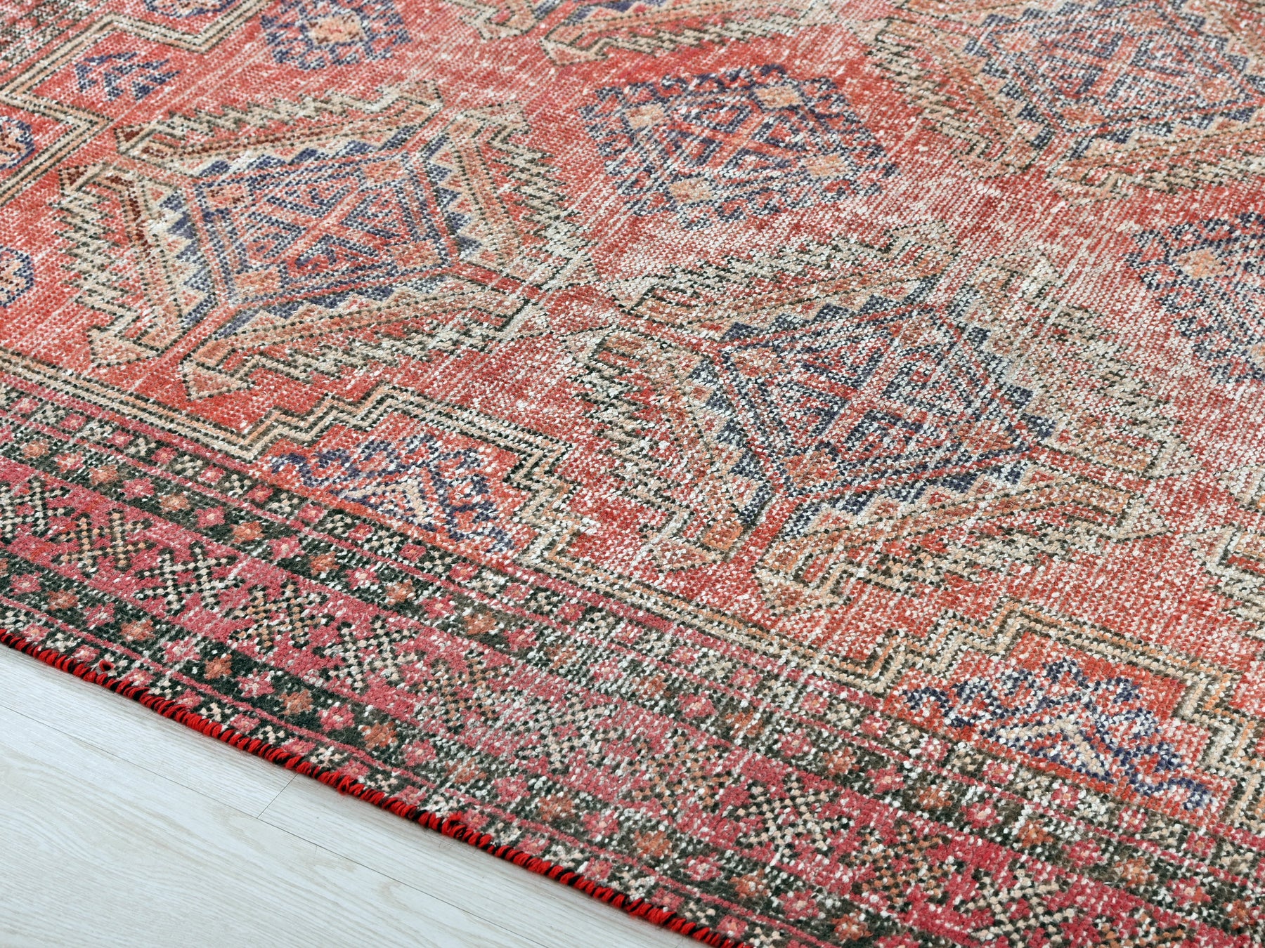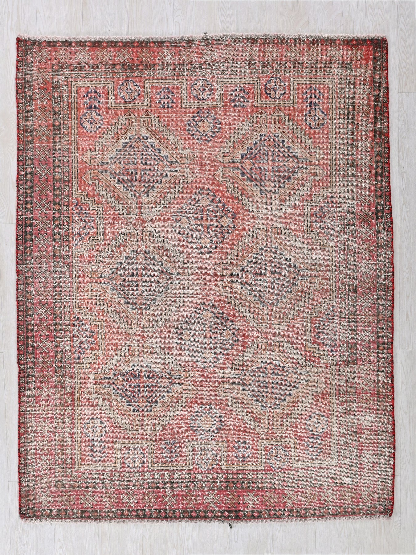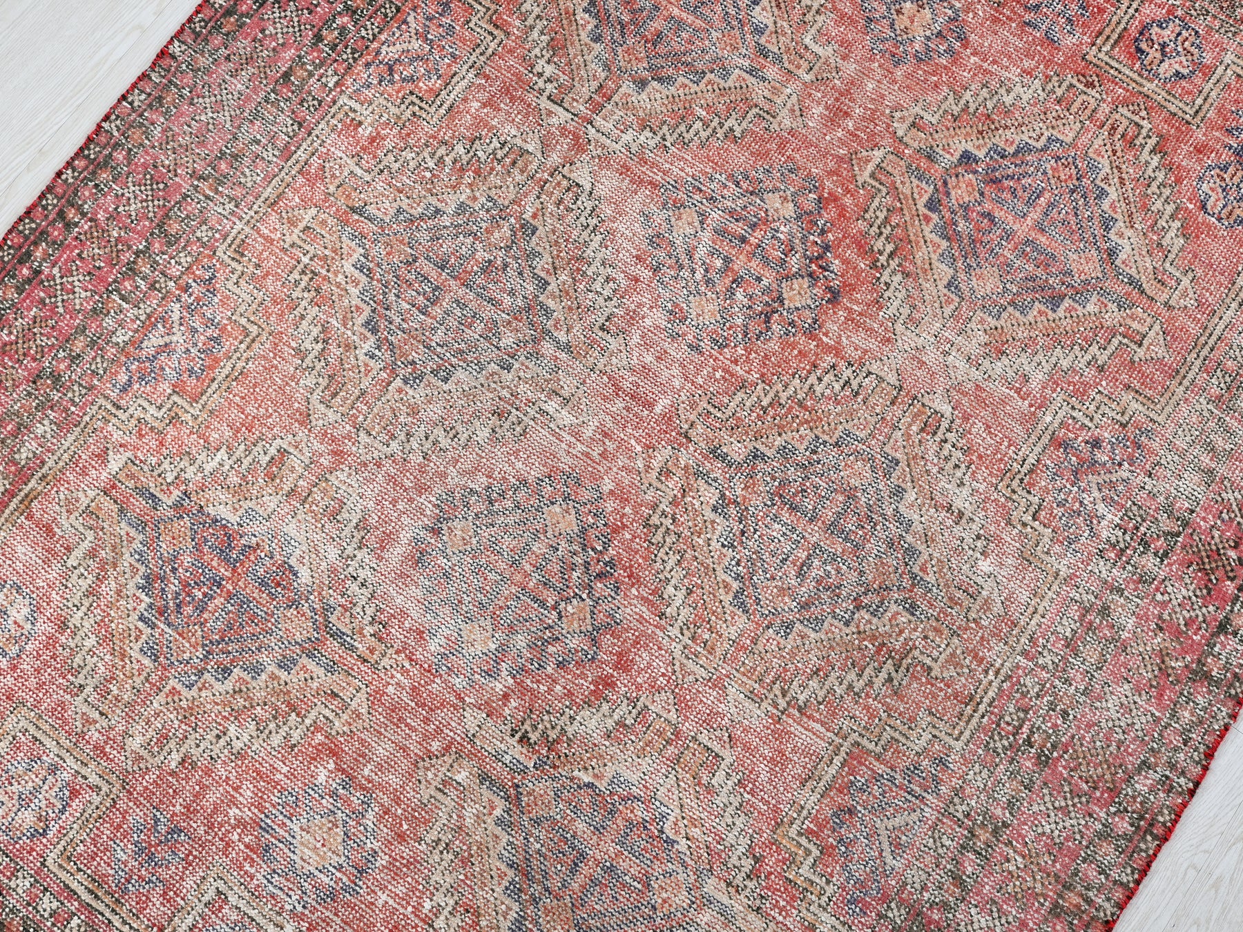 This is a hand-knotted, one-of-a-kind vintage rug. Due to the nature of this piece, there may be slight imperfections in its wear, shape, dimensions, and color. All of our rugs are professionally cleaned and repaired.