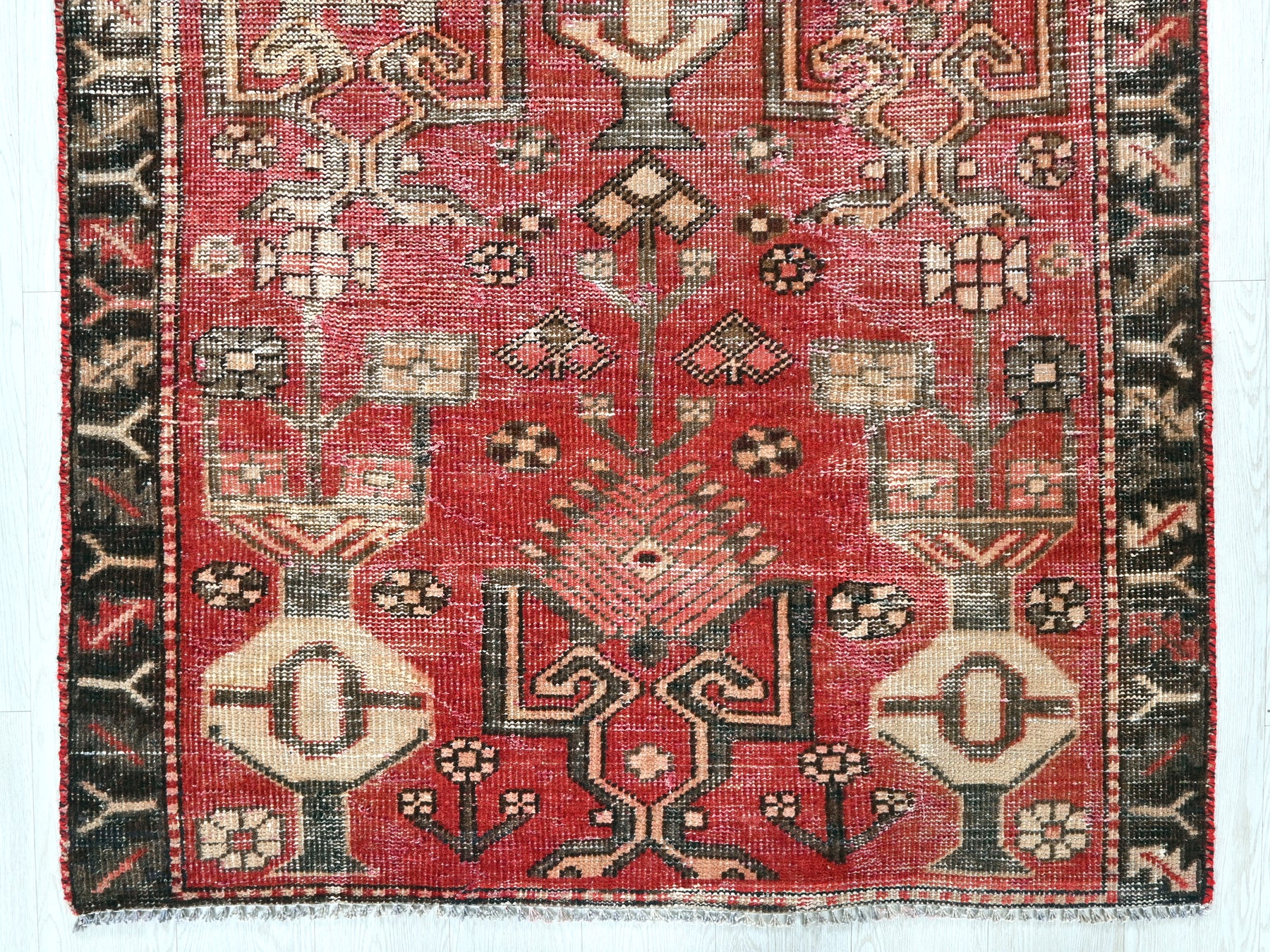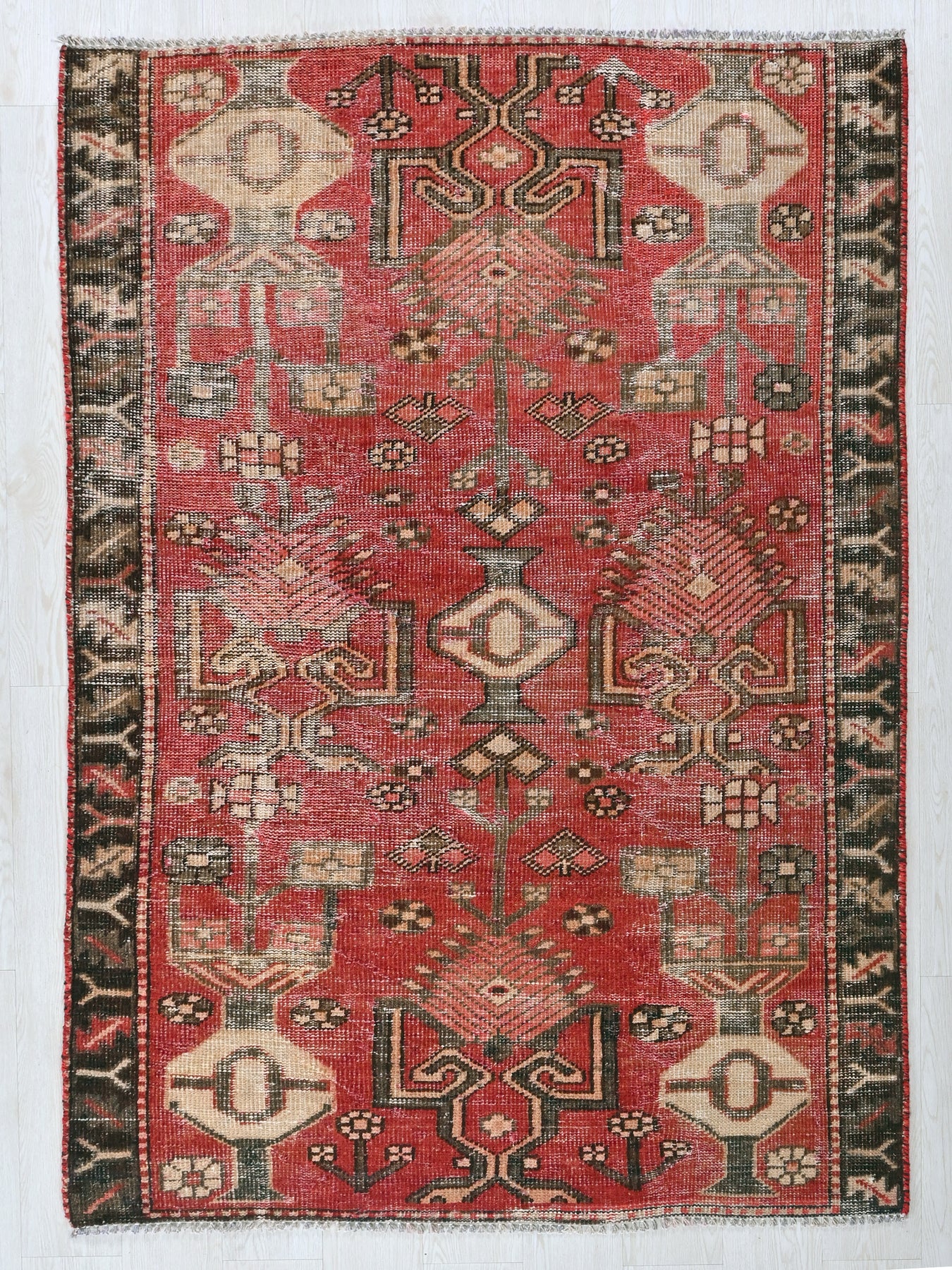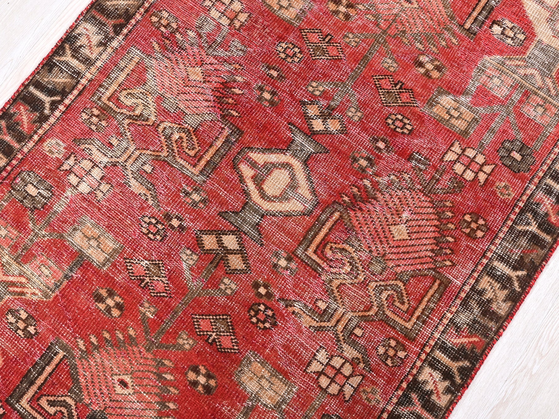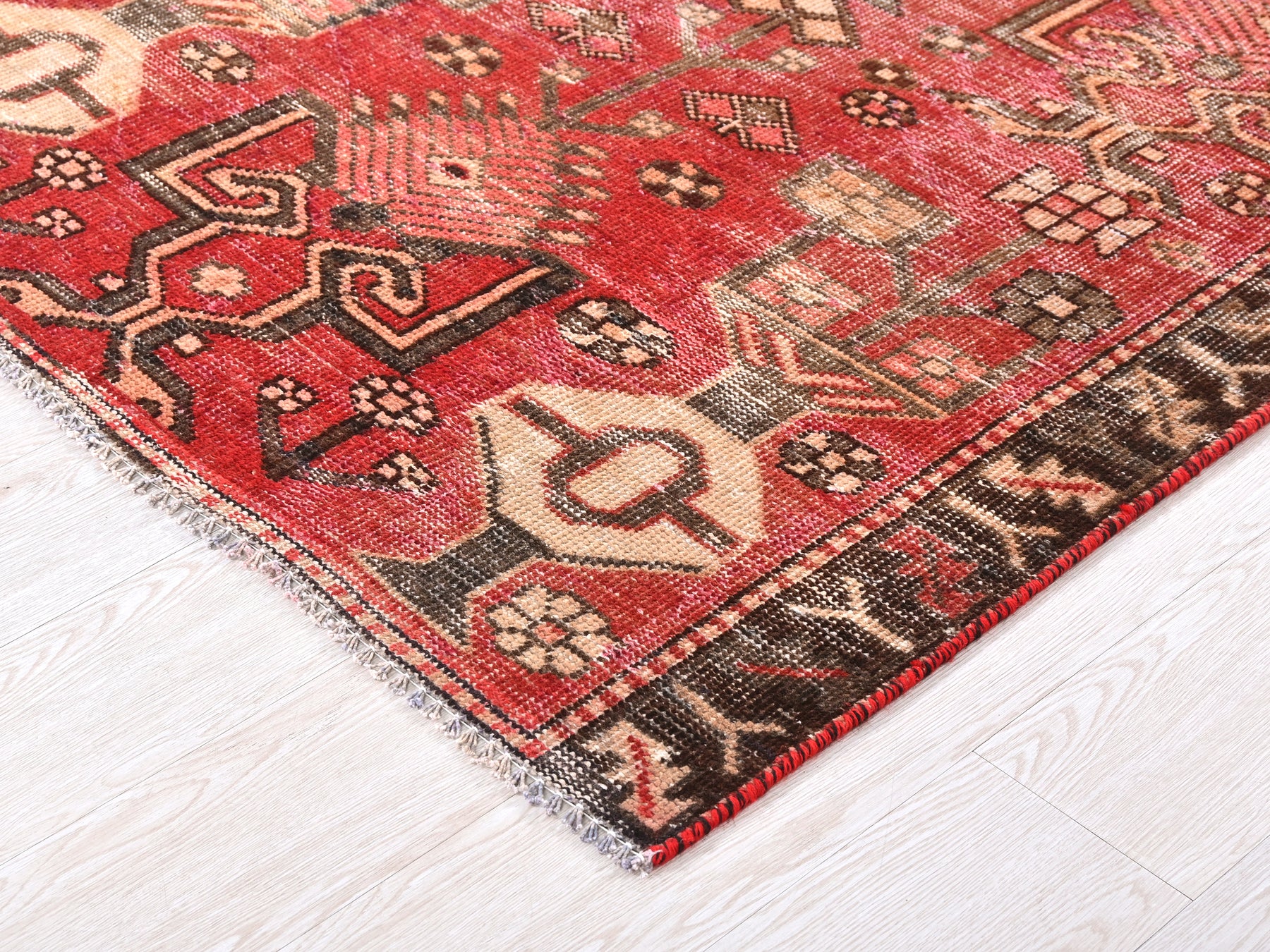 This is a hand-knotted, one-of-a-kind vintage rug. Due to the nature of this piece, there may be slight imperfections in its wear, shape, dimensions, and color. All of our rugs are professionally cleaned and repaired.