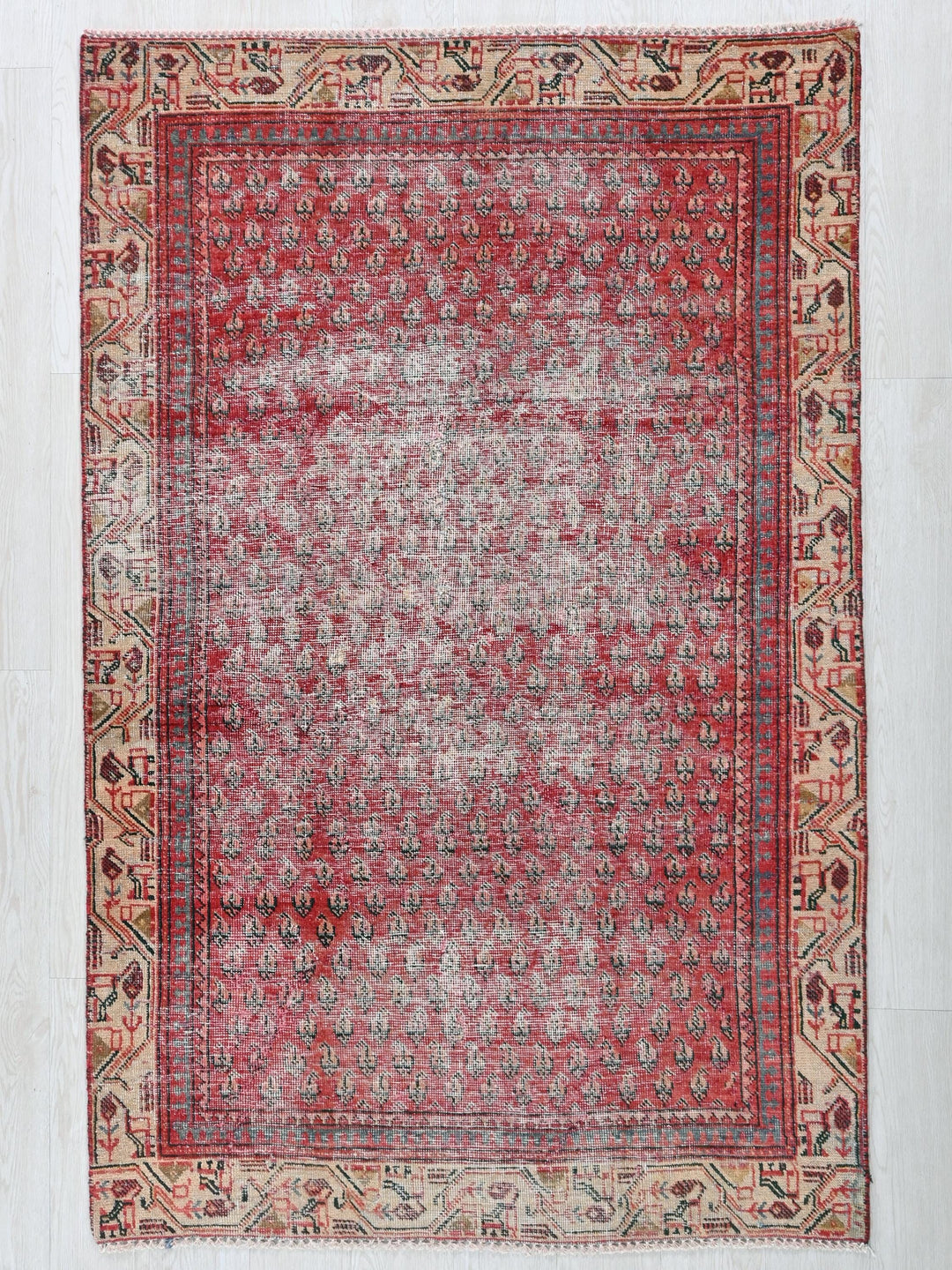 This is a hand-knotted, one-of-a-kind vintage rug. Due to the nature of this piece, there may be slight imperfections in its wear, shape, dimensions, and color. All of our rugs are professionally cleaned and repaired.