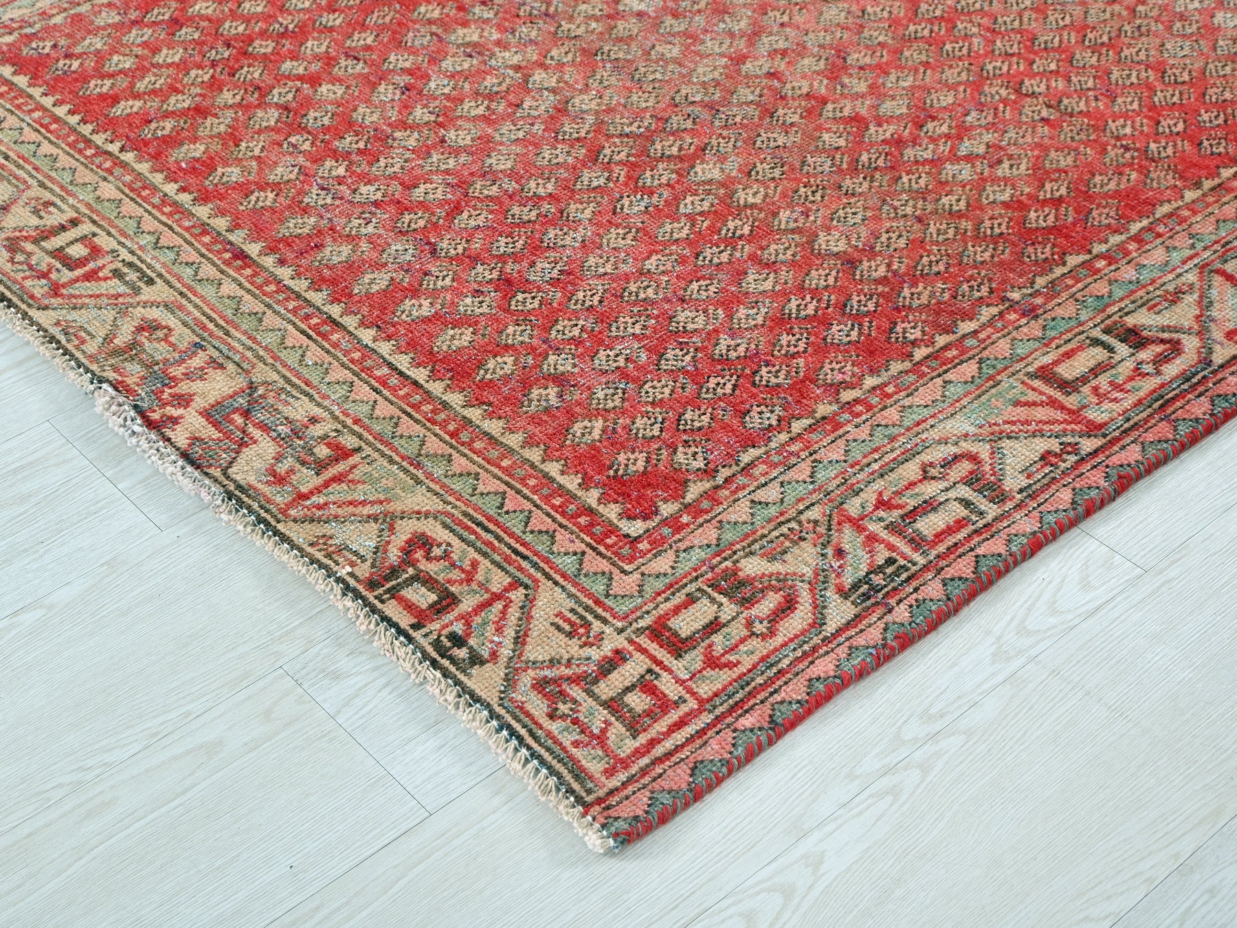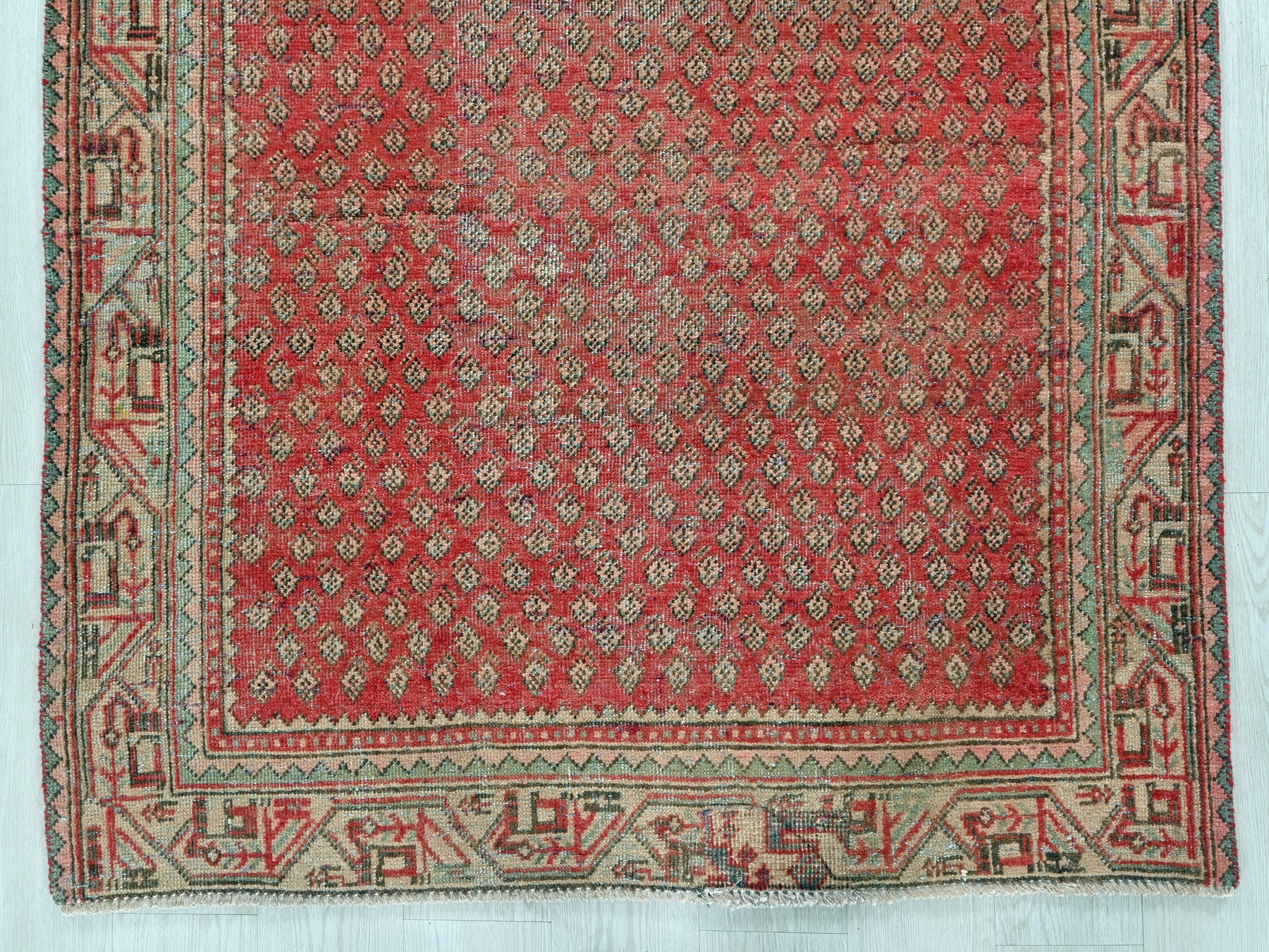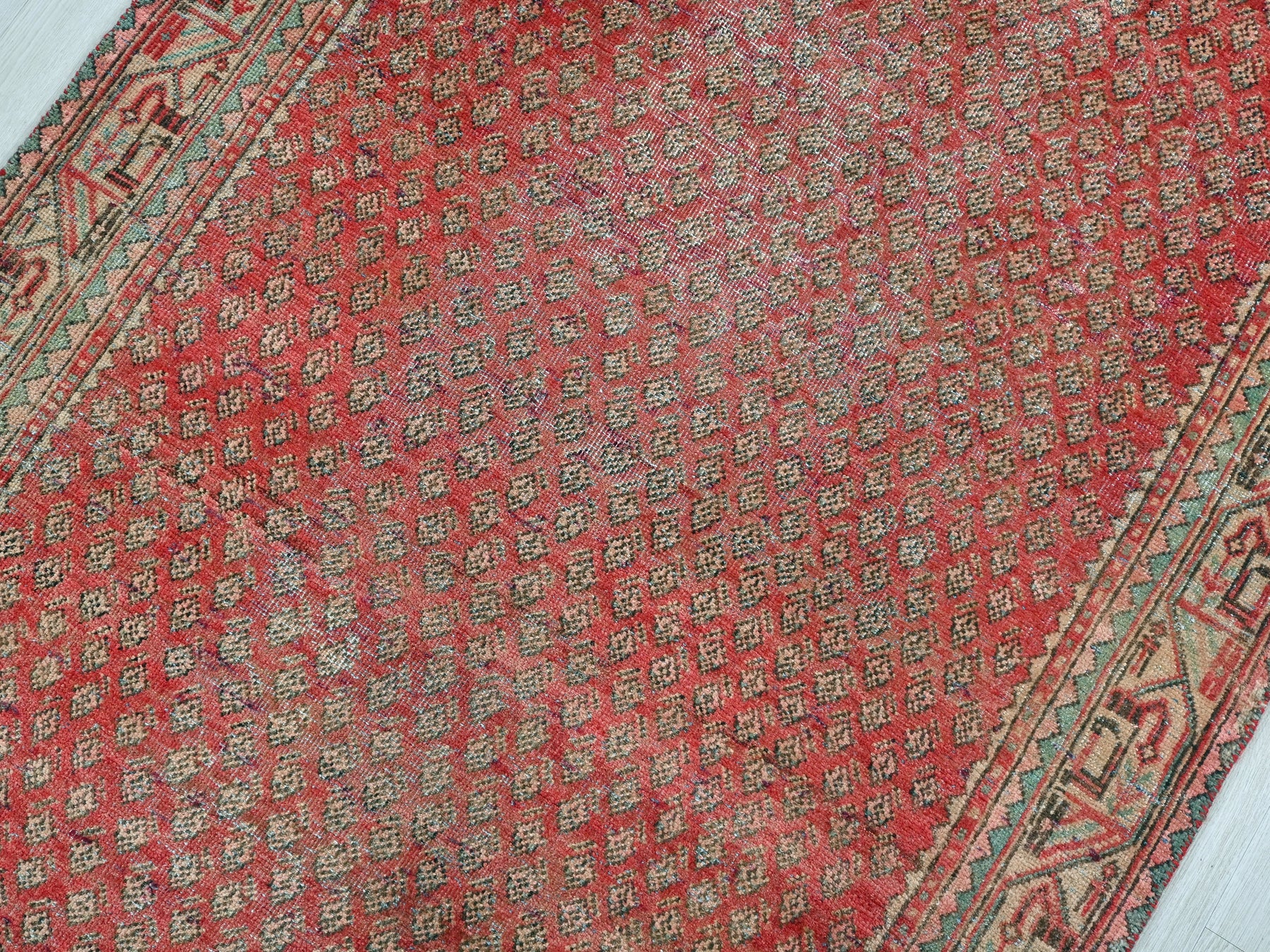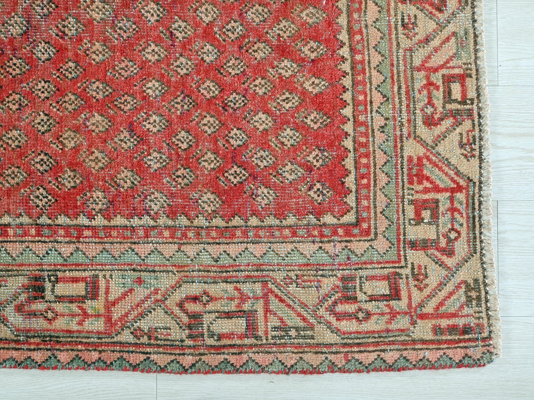 This is a hand-knotted, one-of-a-kind vintage rug. Due to the nature of this piece, there may be slight imperfections in its wear, shape, dimensions, and color. All of our rugs are professionally cleaned and repaired.