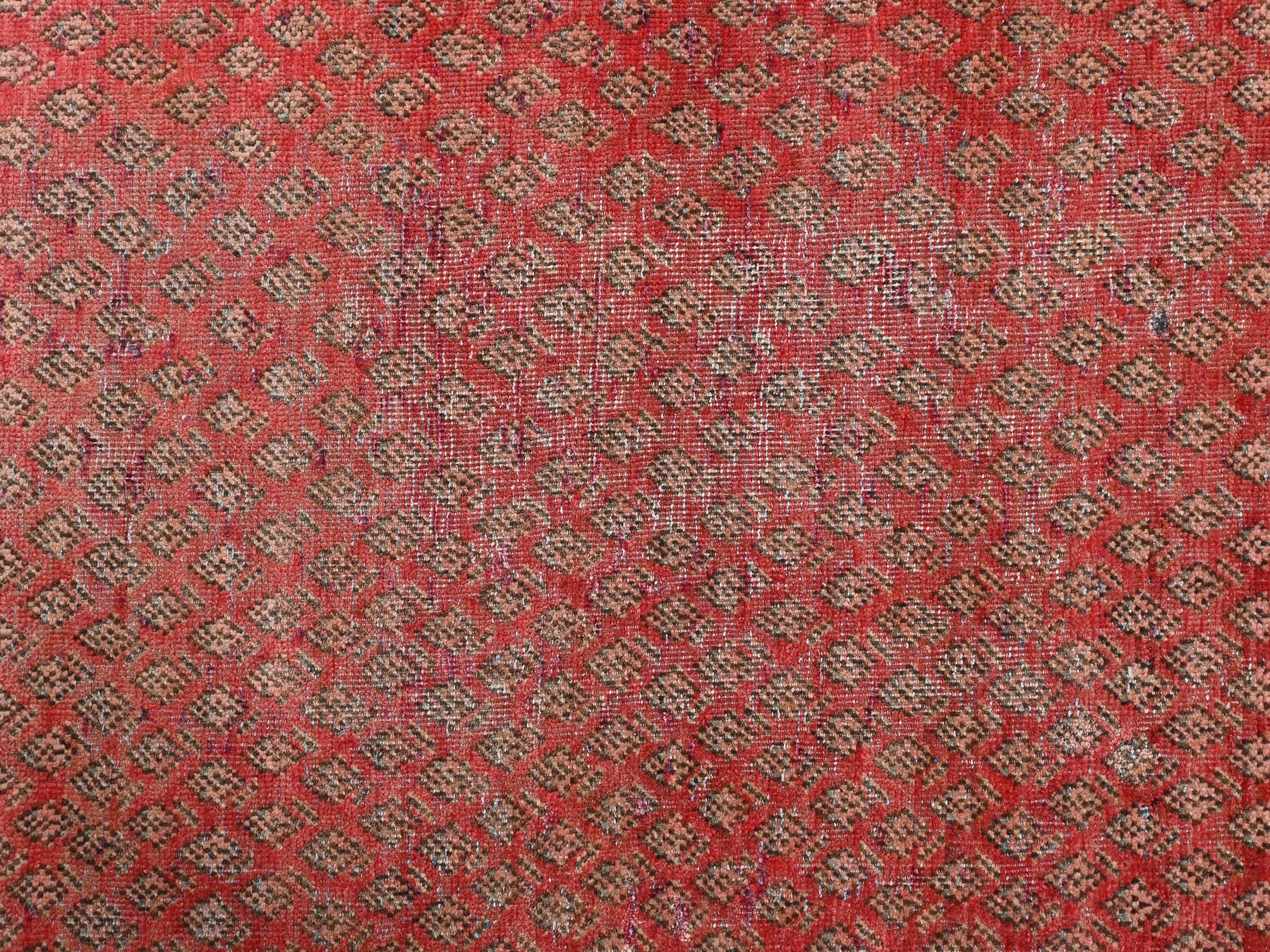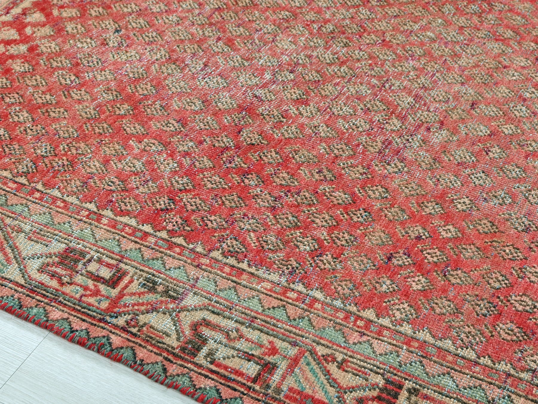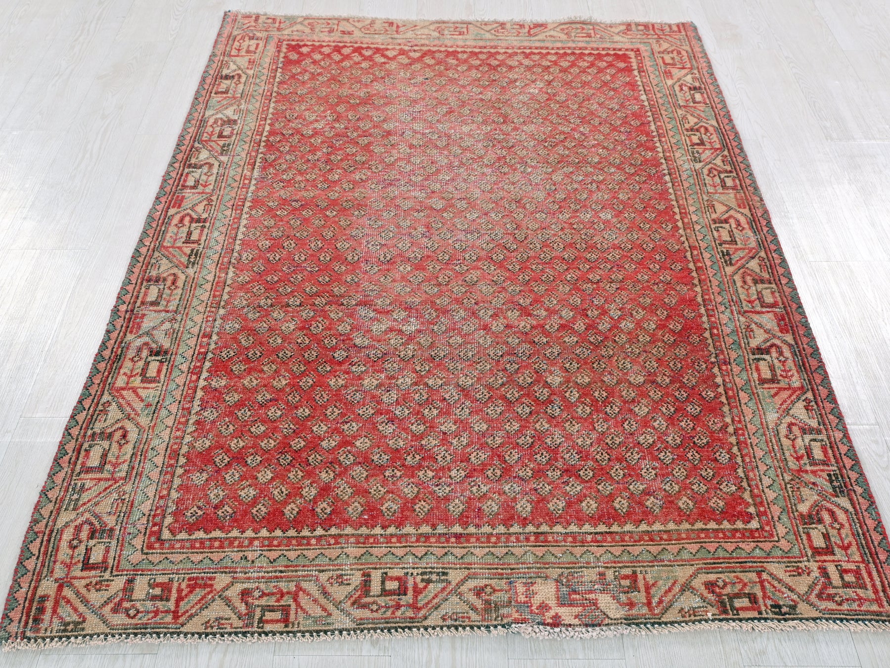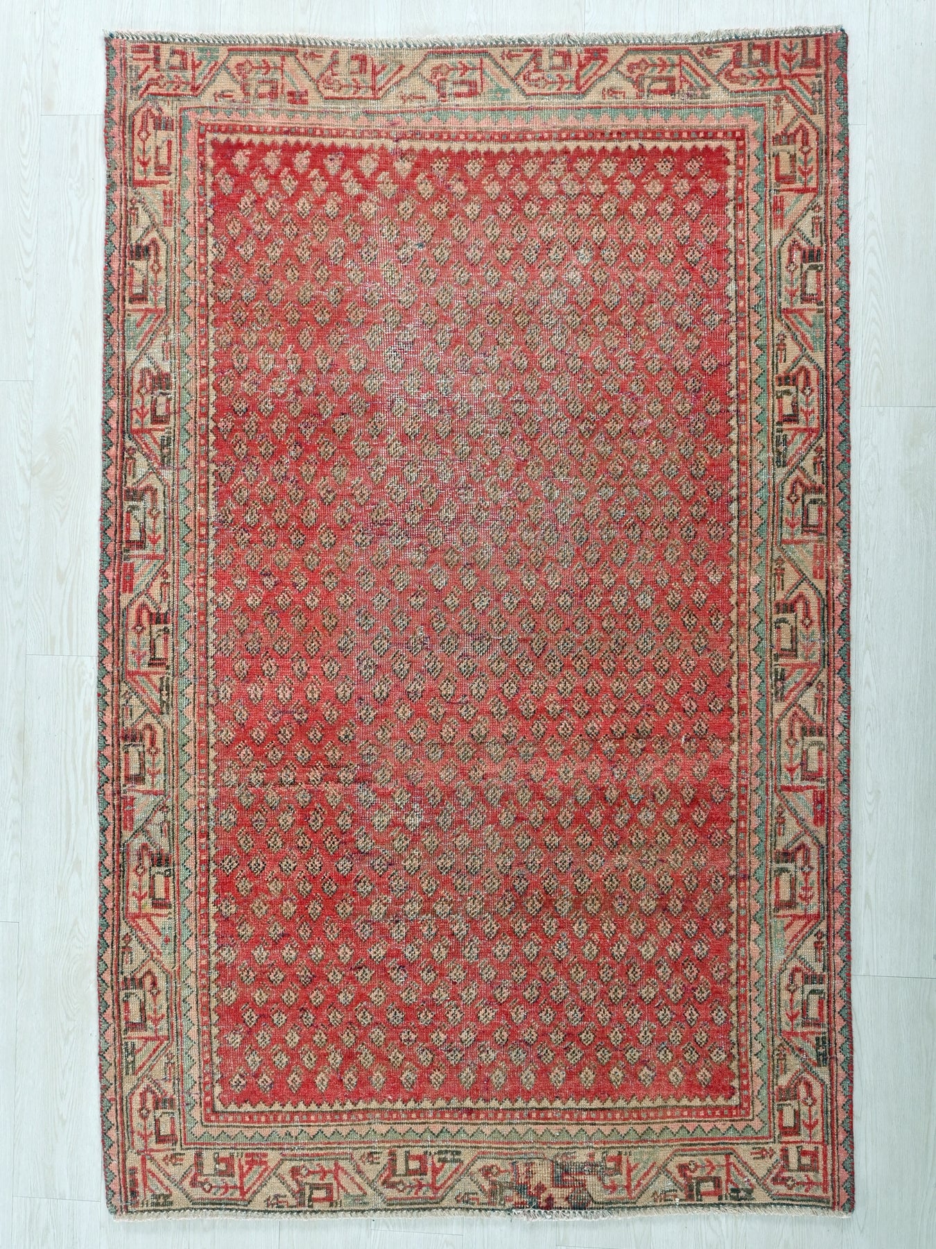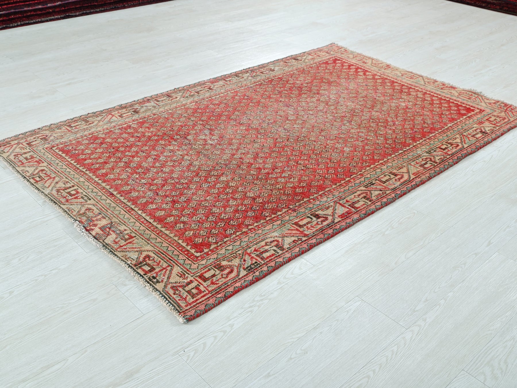 This is a hand-knotted, one-of-a-kind vintage rug. Due to the nature of this piece, there may be slight imperfections in its wear, shape, dimensions, and color. All of our rugs are professionally cleaned and repaired.