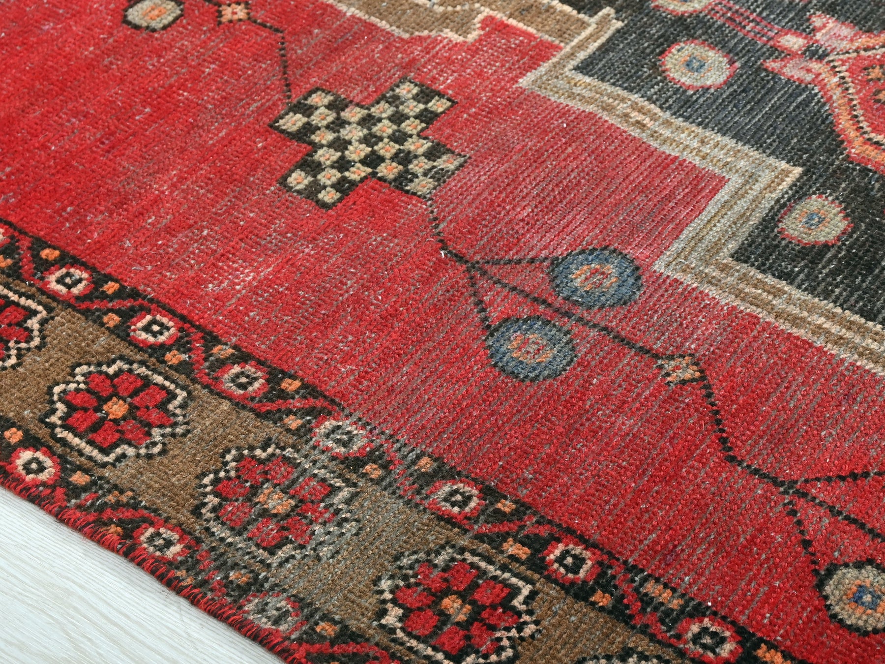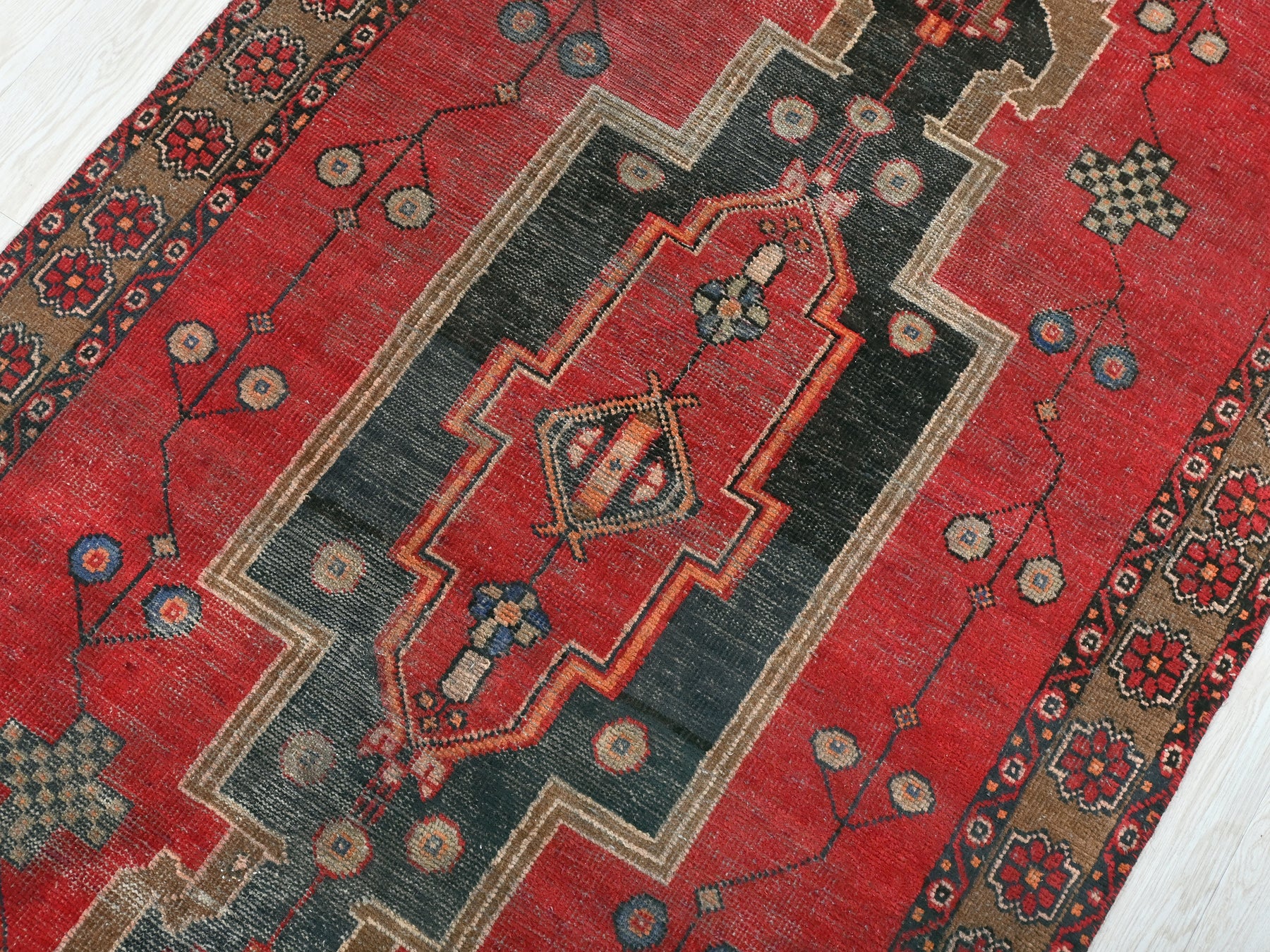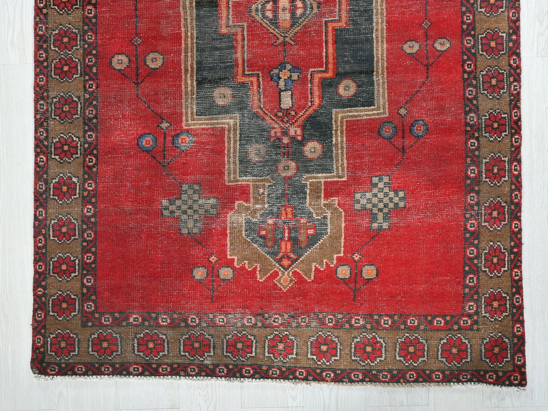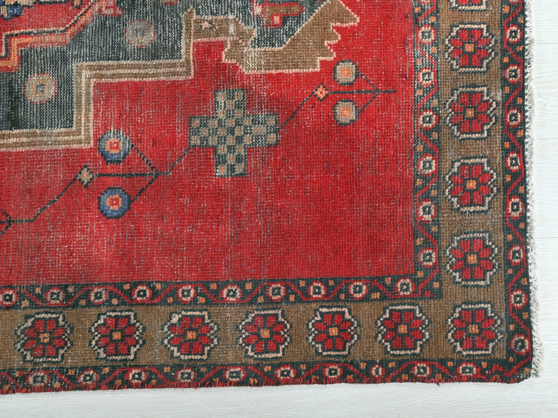 This is a hand-knotted, one-of-a-kind vintage rug. Due to the nature of this piece, there may be slight imperfections in its wear, shape, dimensions, and color. All of our rugs are professionally cleaned and repaired.