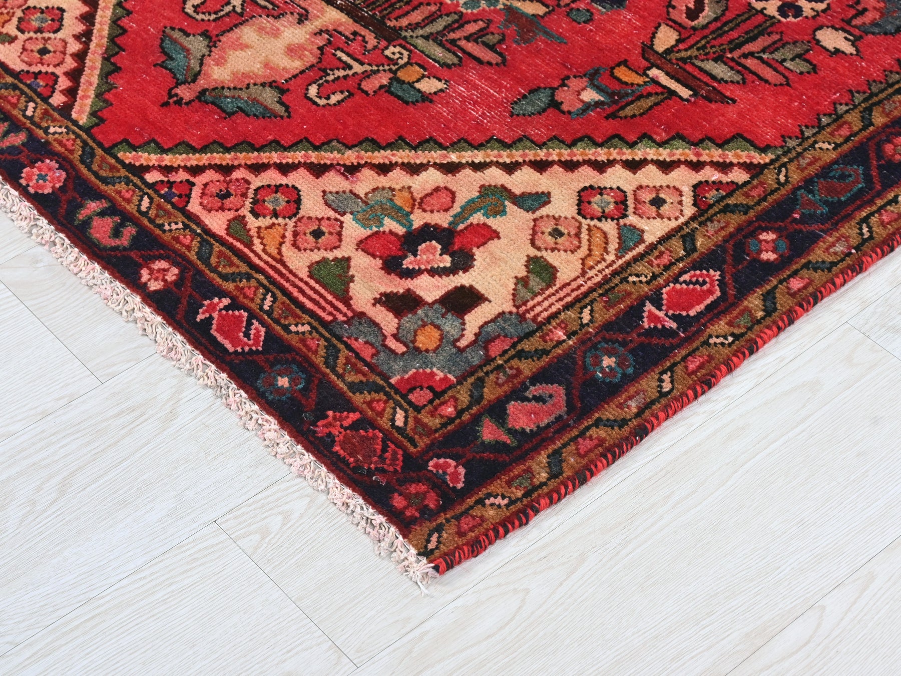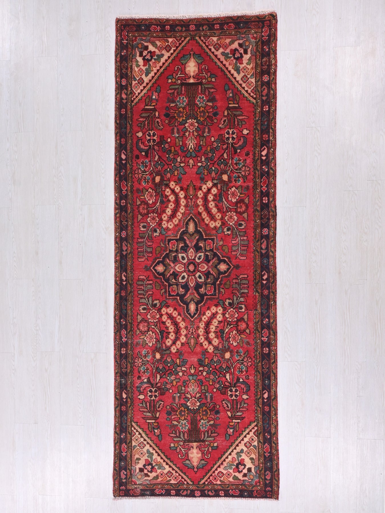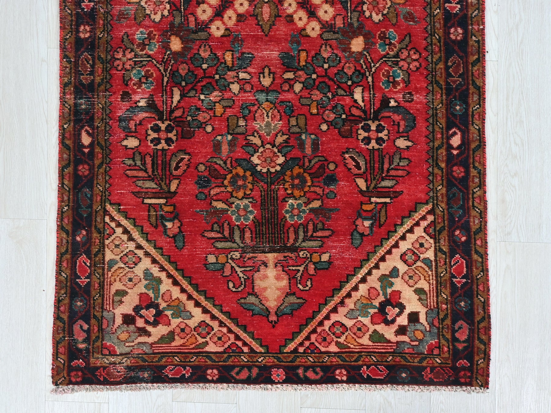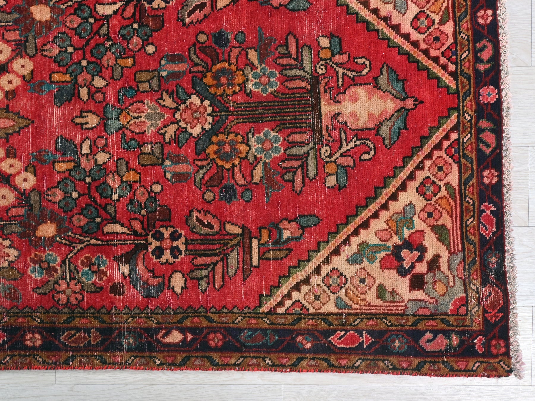 This is a hand-knotted, one-of-a-kind vintage rug. Due to the nature of this piece, there may be slight imperfections in its wear, shape, dimensions, and color. All of our rugs are professionally cleaned and repaired.