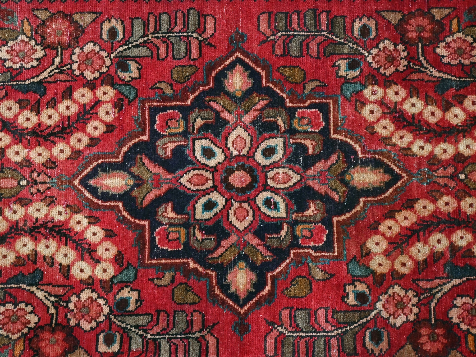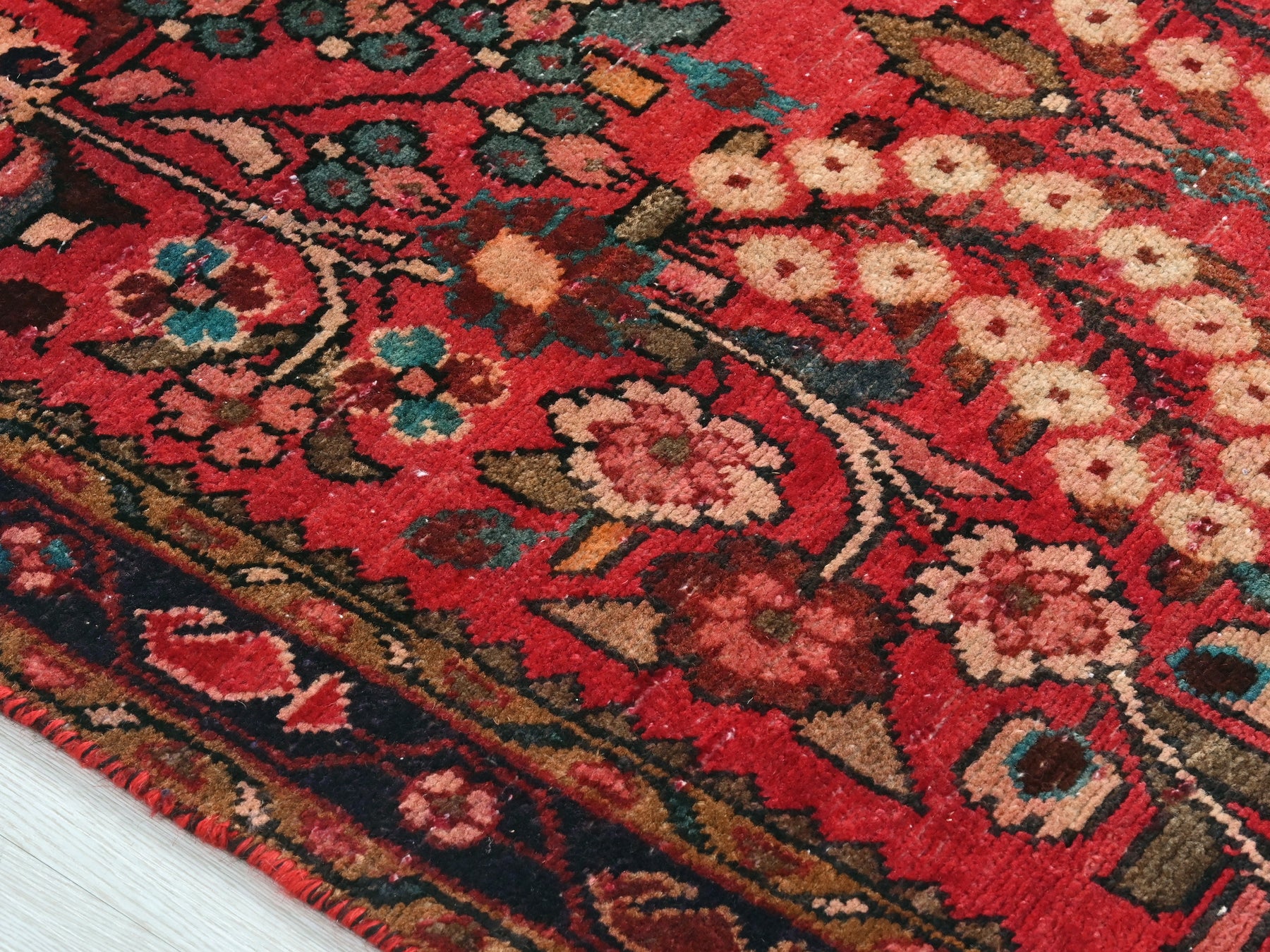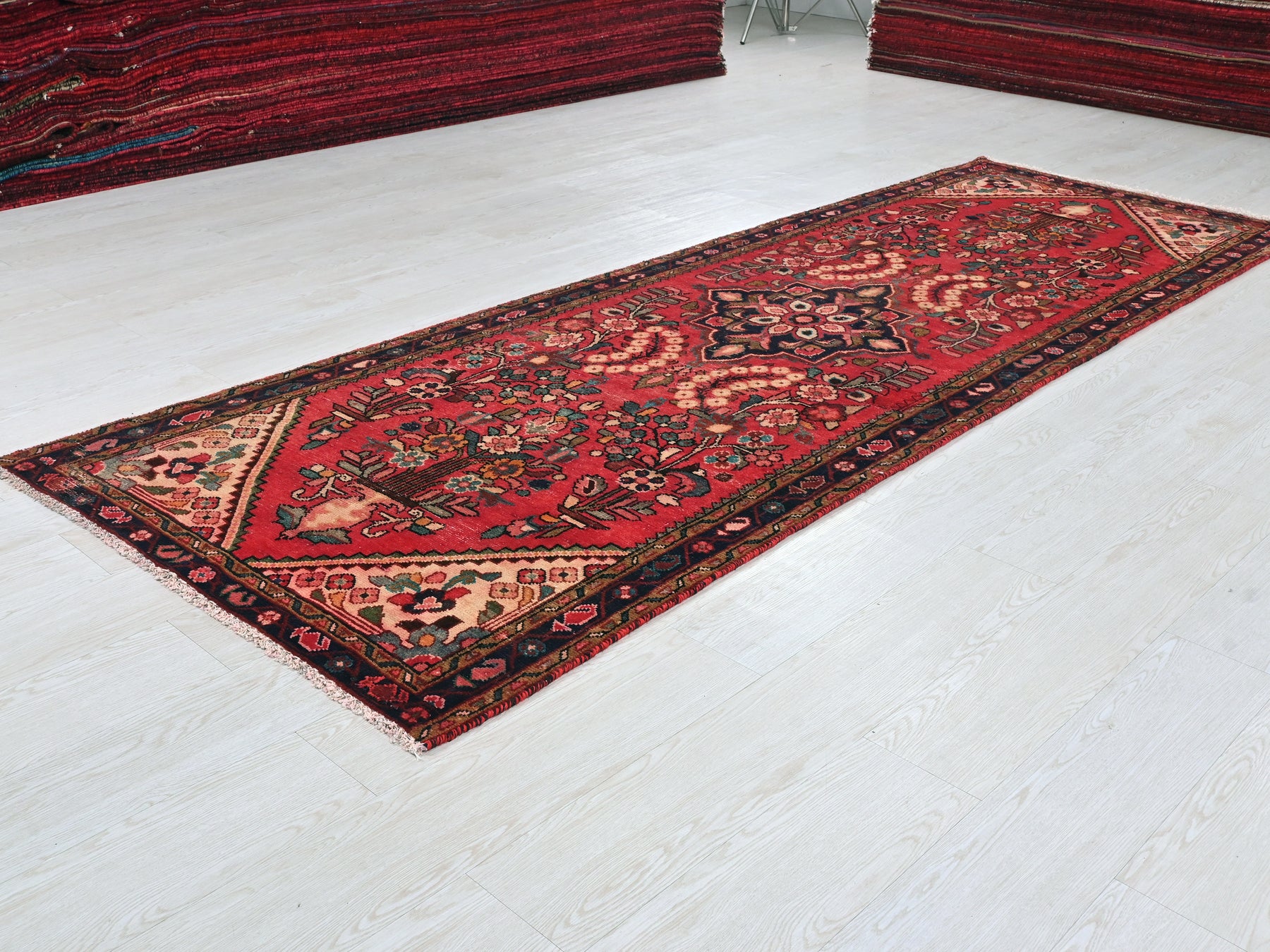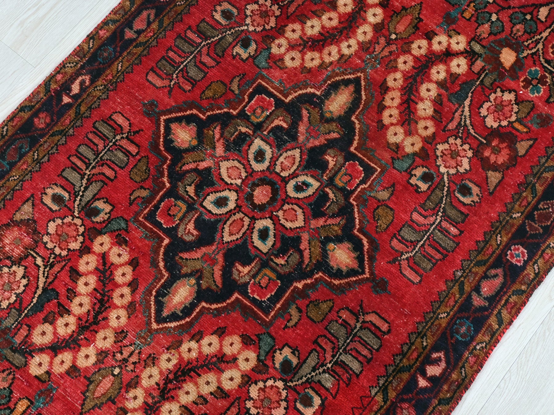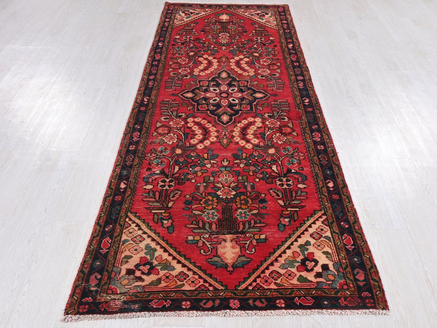 This is a hand-knotted, one-of-a-kind vintage rug. Due to the nature of this piece, there may be slight imperfections in its wear, shape, dimensions, and color. All of our rugs are professionally cleaned and repaired.