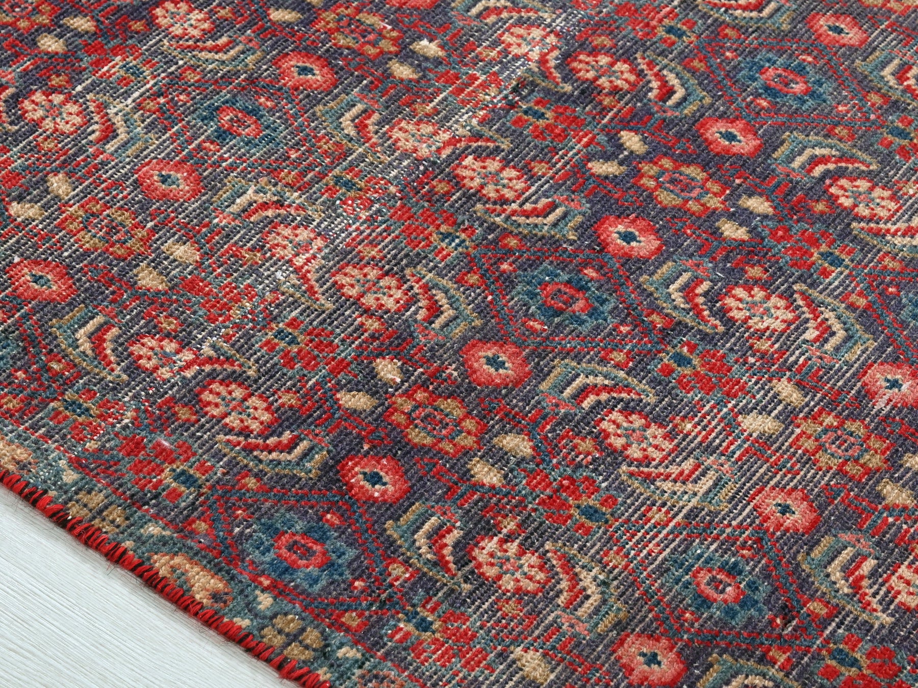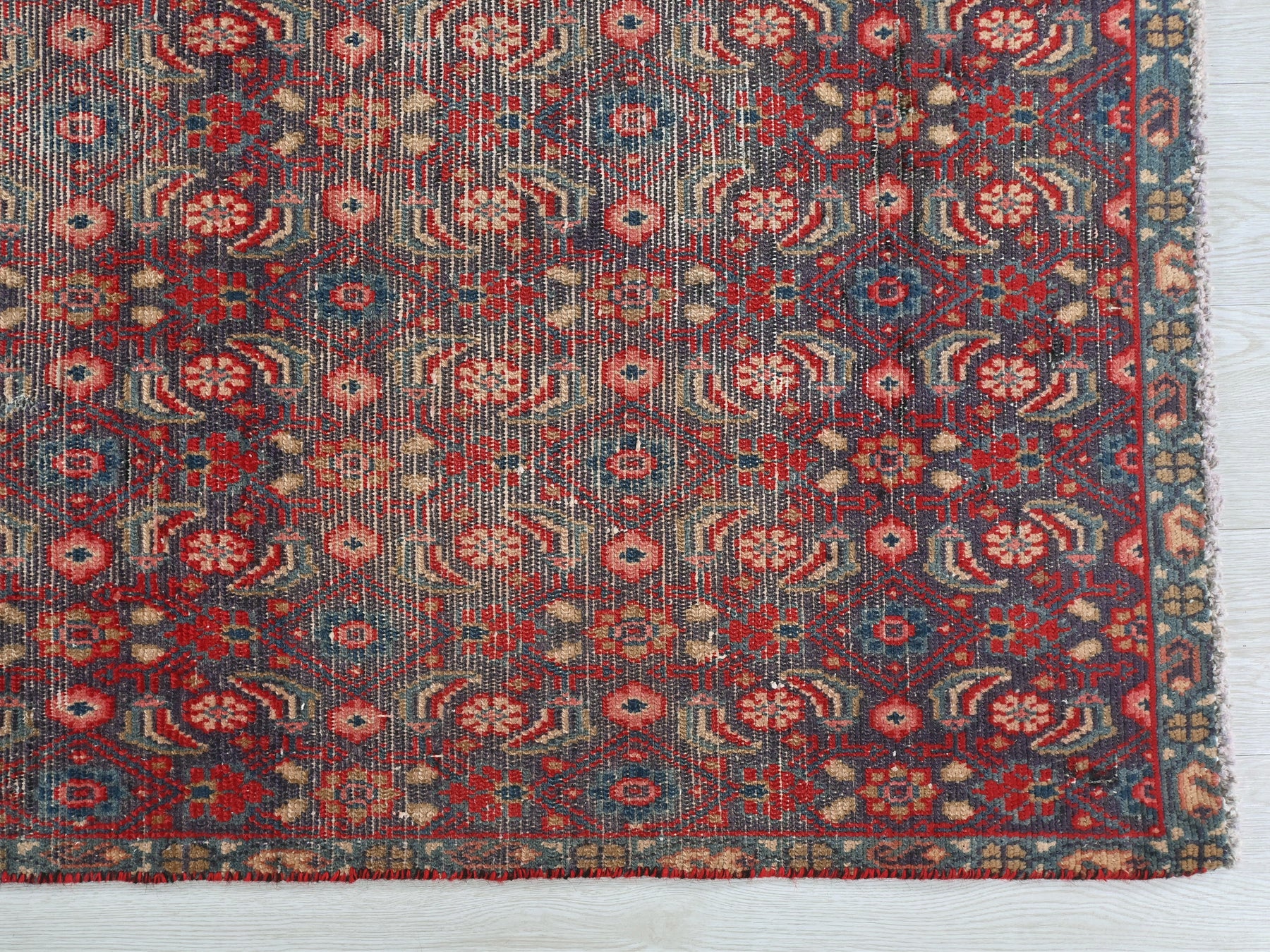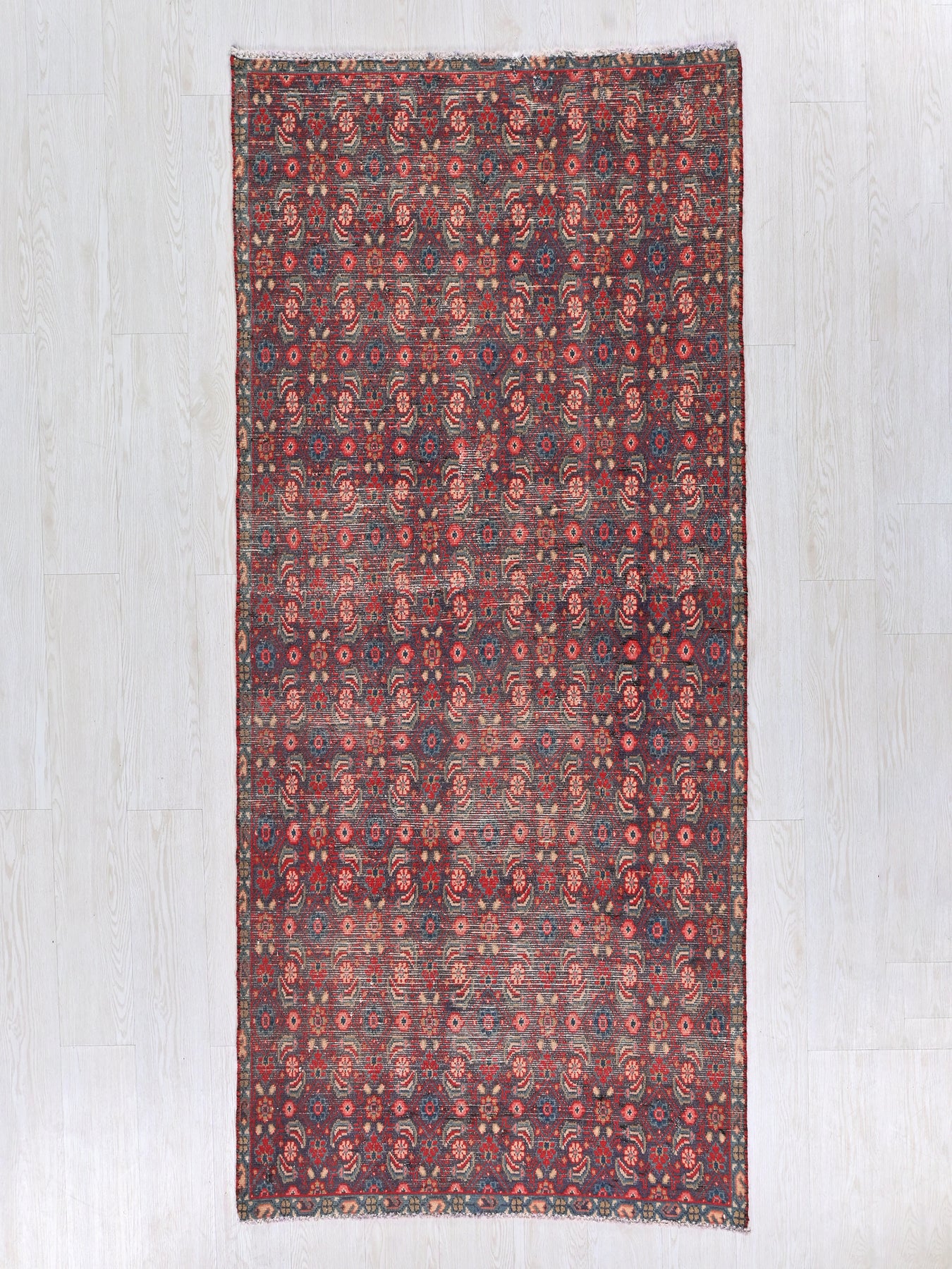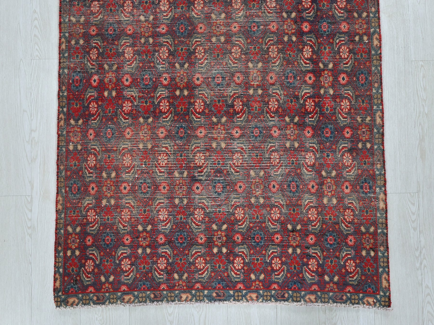 This is a hand-knotted, one-of-a-kind vintage rug. Due to the nature of this piece, there may be slight imperfections in its wear, shape, dimensions, and color. All of our rugs are professionally cleaned and repaired.