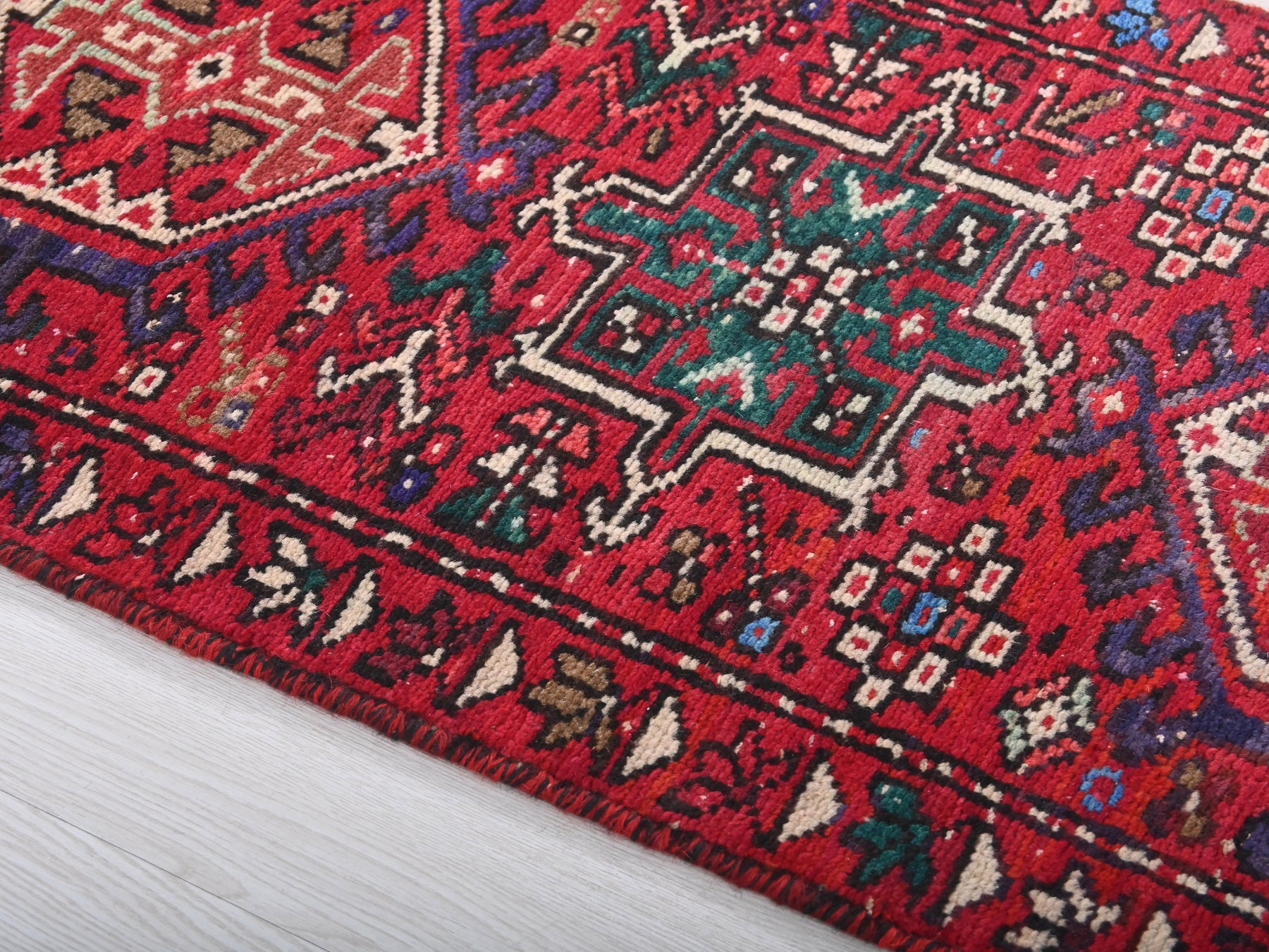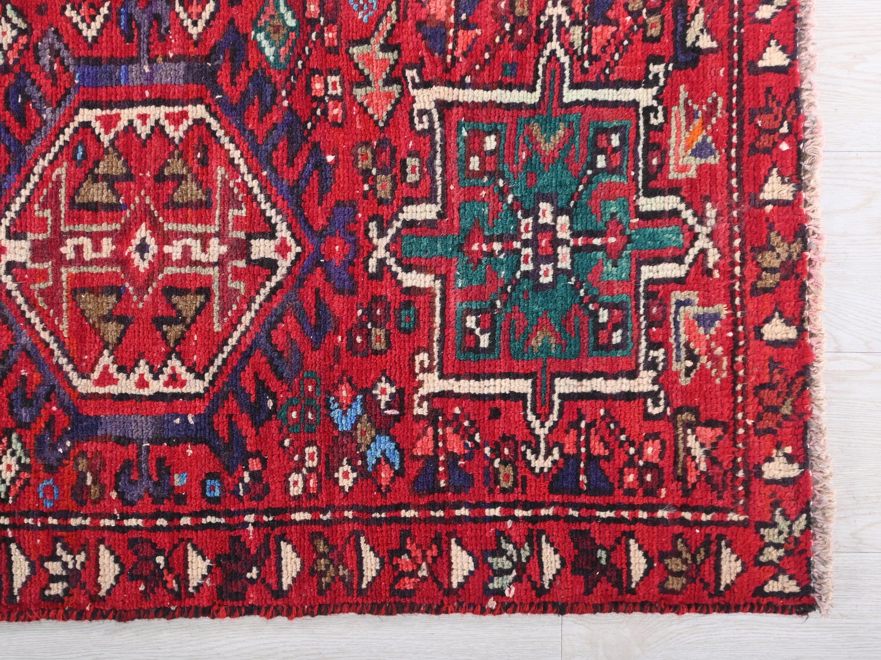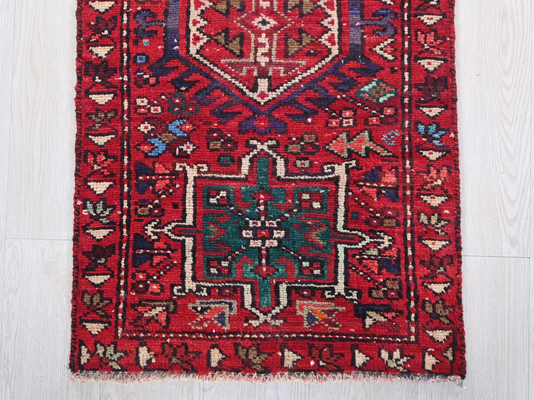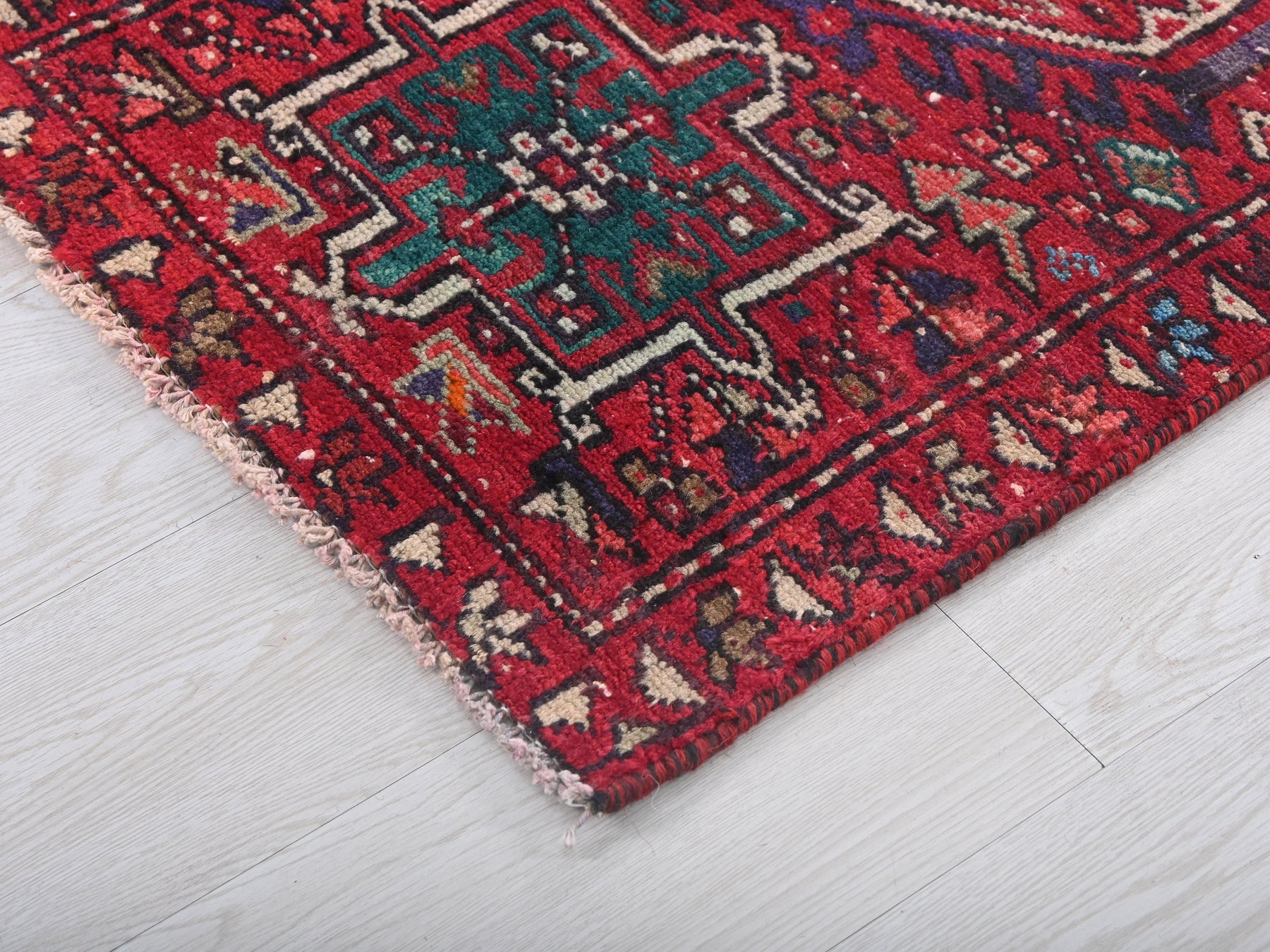 This is a hand-knotted, one-of-a-kind vintage rug. Due to the nature of this piece, there may be slight imperfections in its wear, shape, dimensions, and color. All of our rugs are professionally cleaned and repaired.
