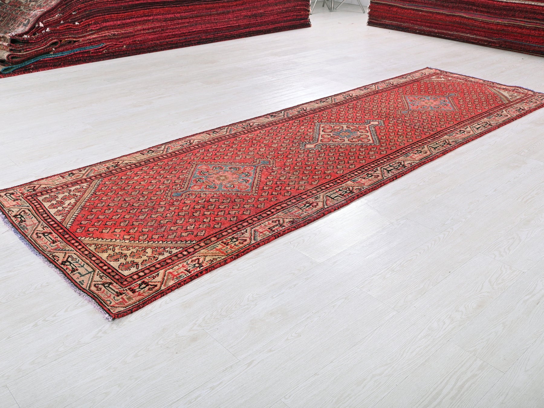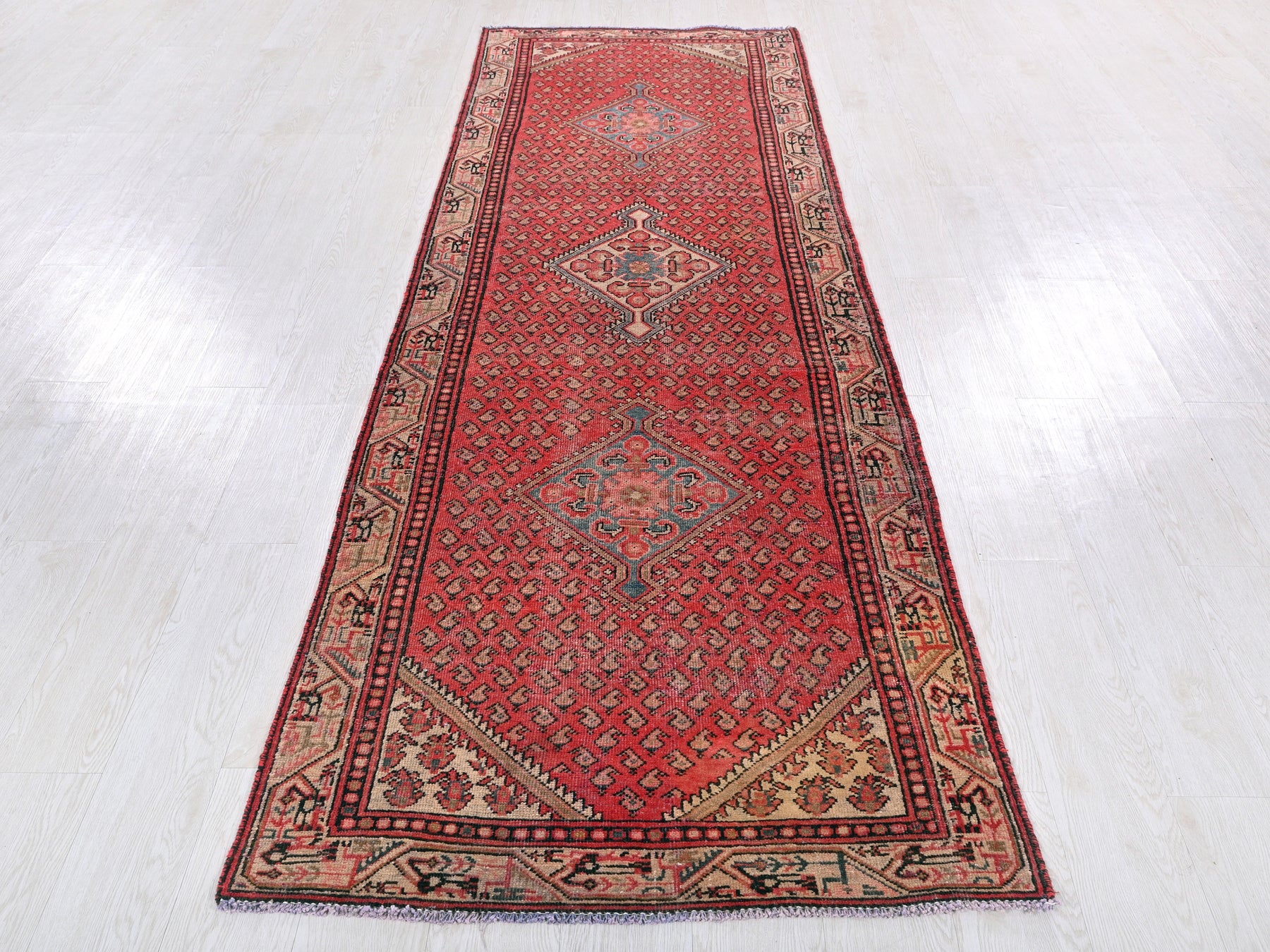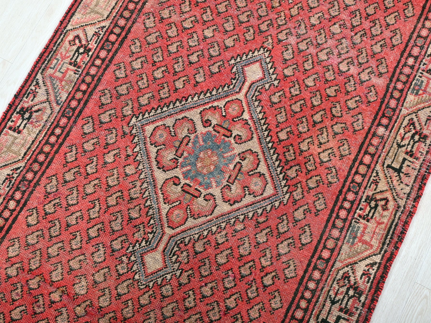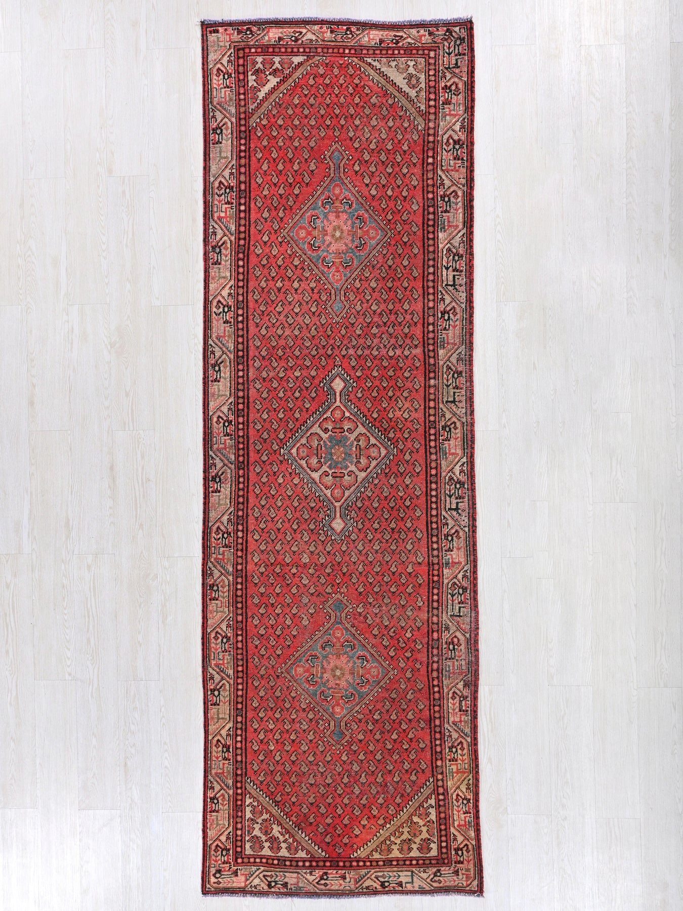 This is a hand-knotted, one-of-a-kind vintage rug. Due to the nature of this piece, there may be slight imperfections in its wear, shape, dimensions, and color. All of our rugs are professionally cleaned and repaired.
