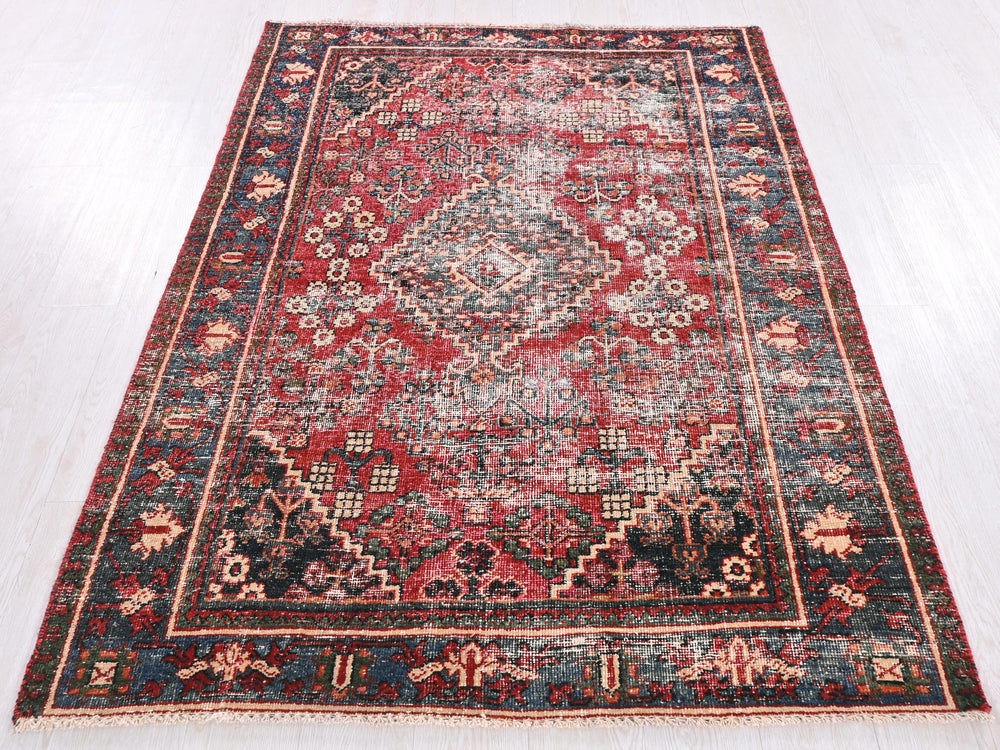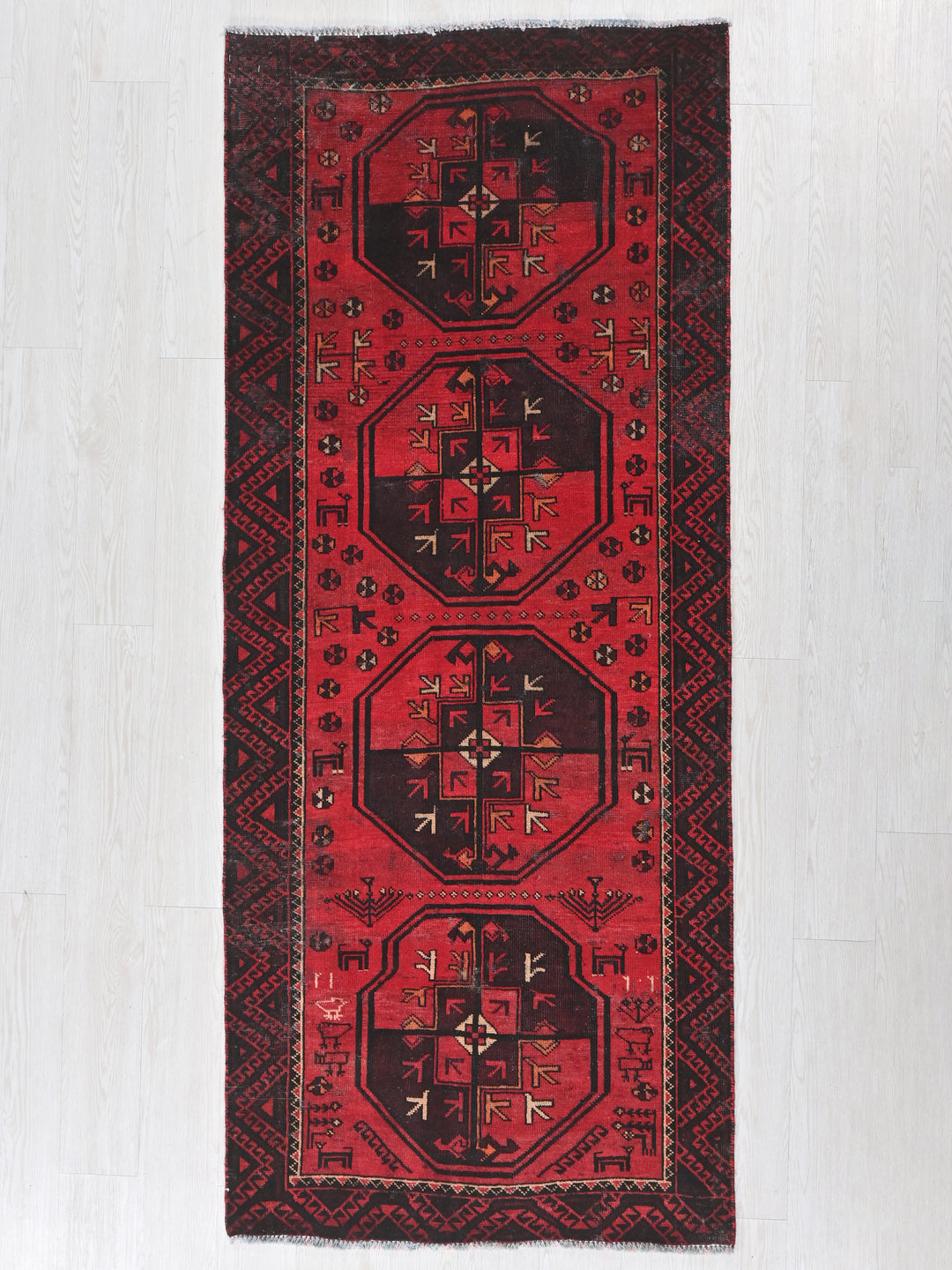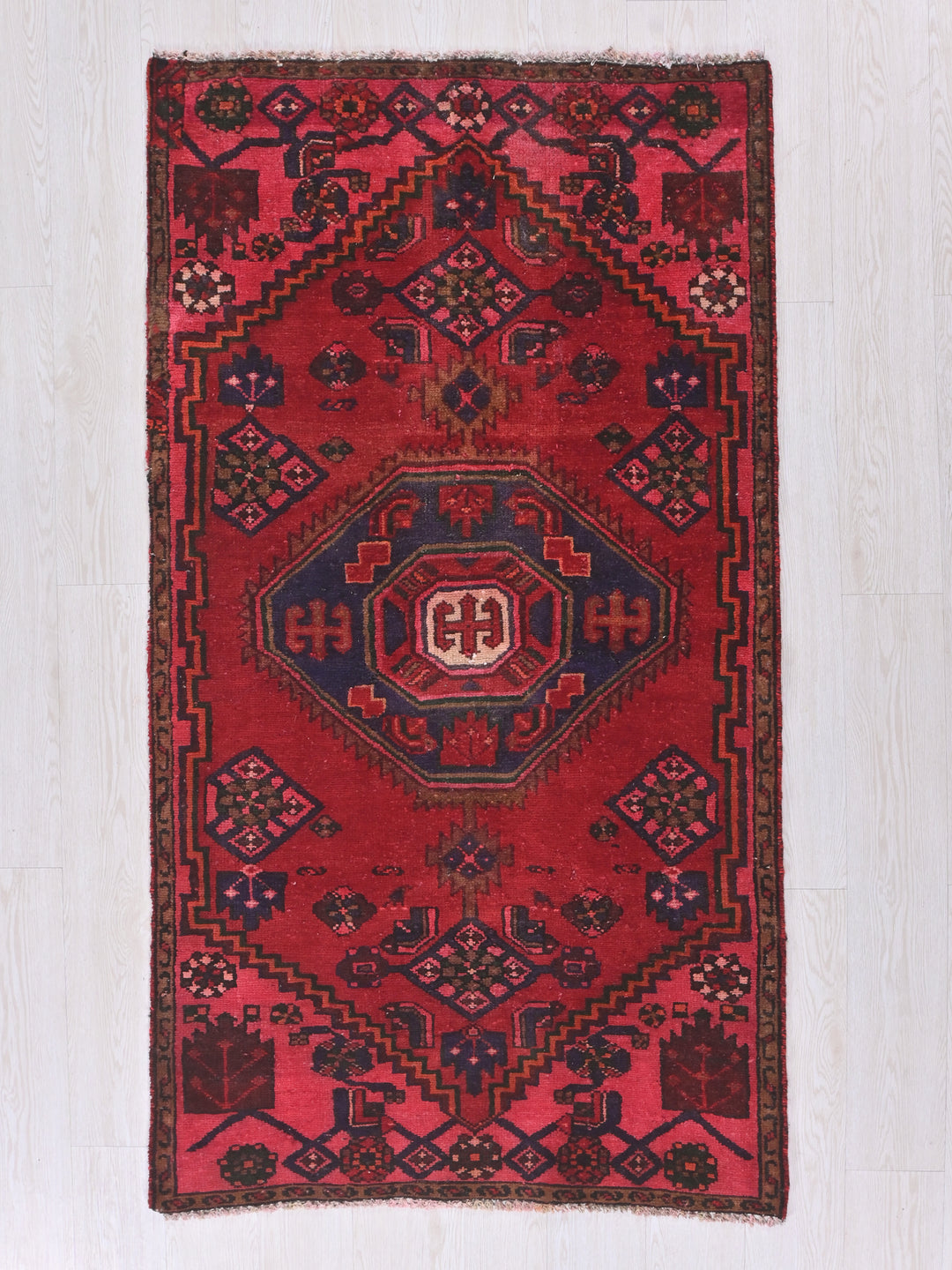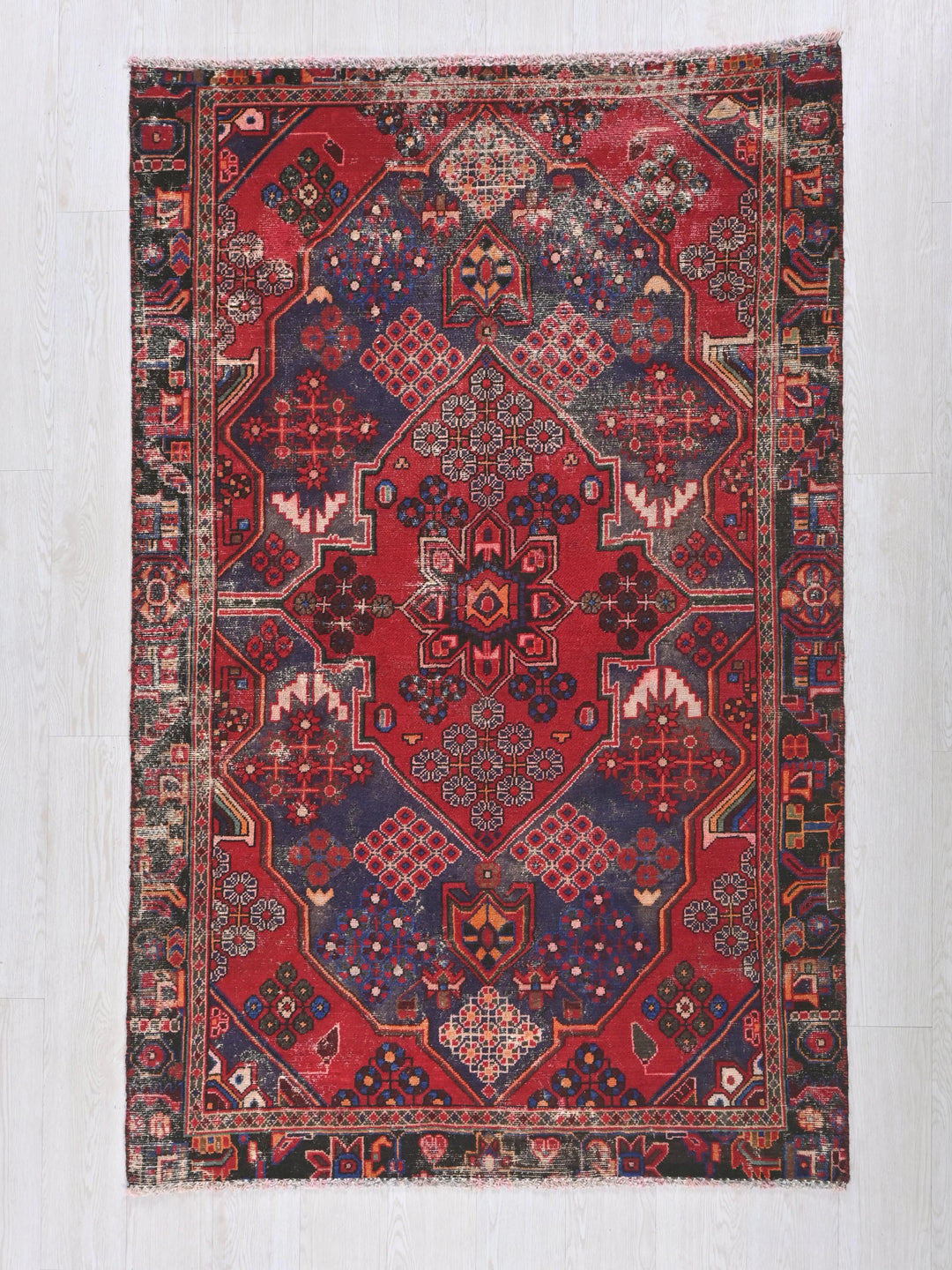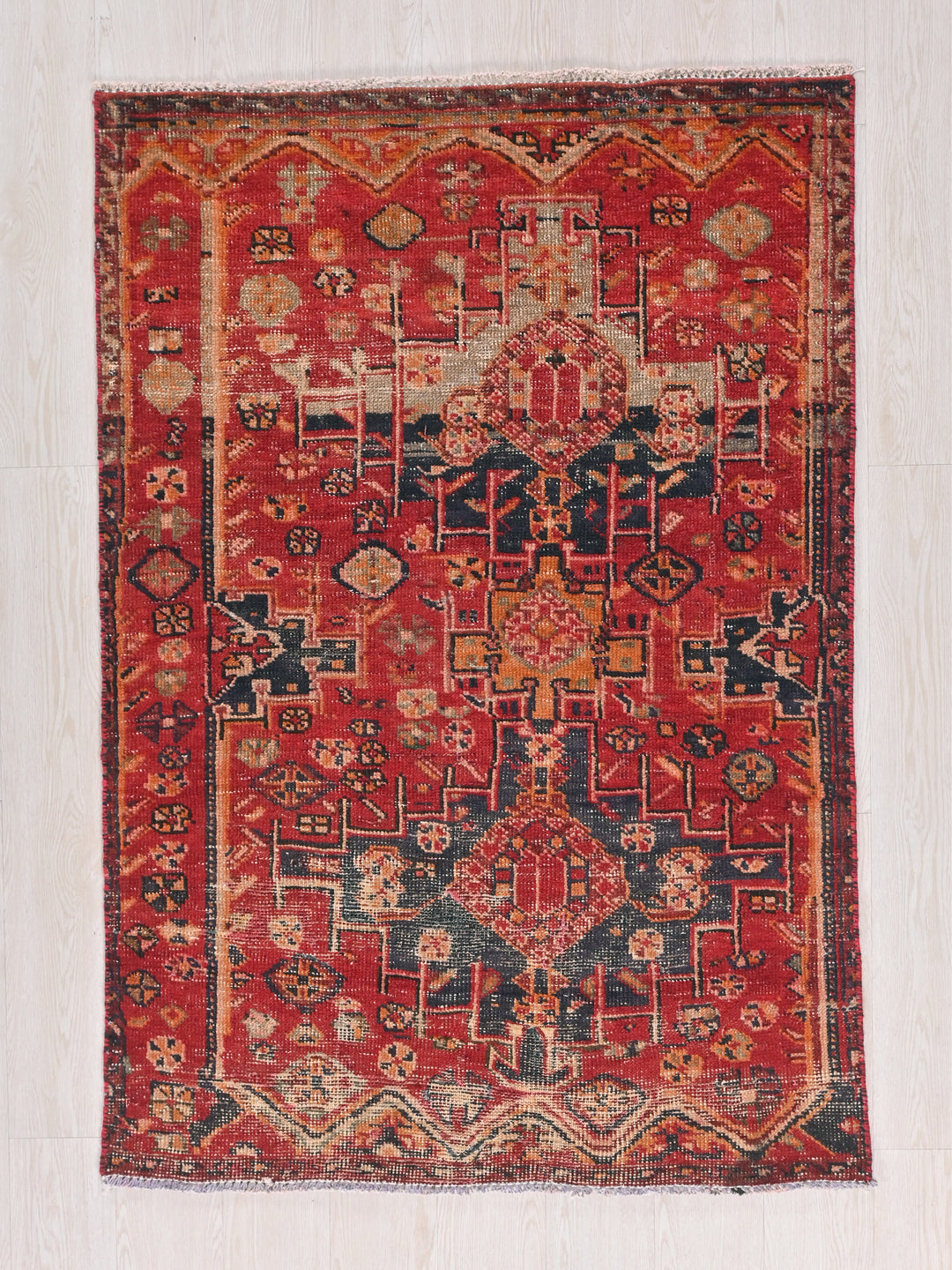 Vintage, hand‑knotted, repaired/restored wear