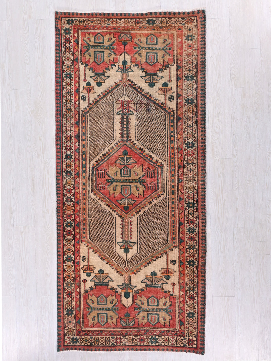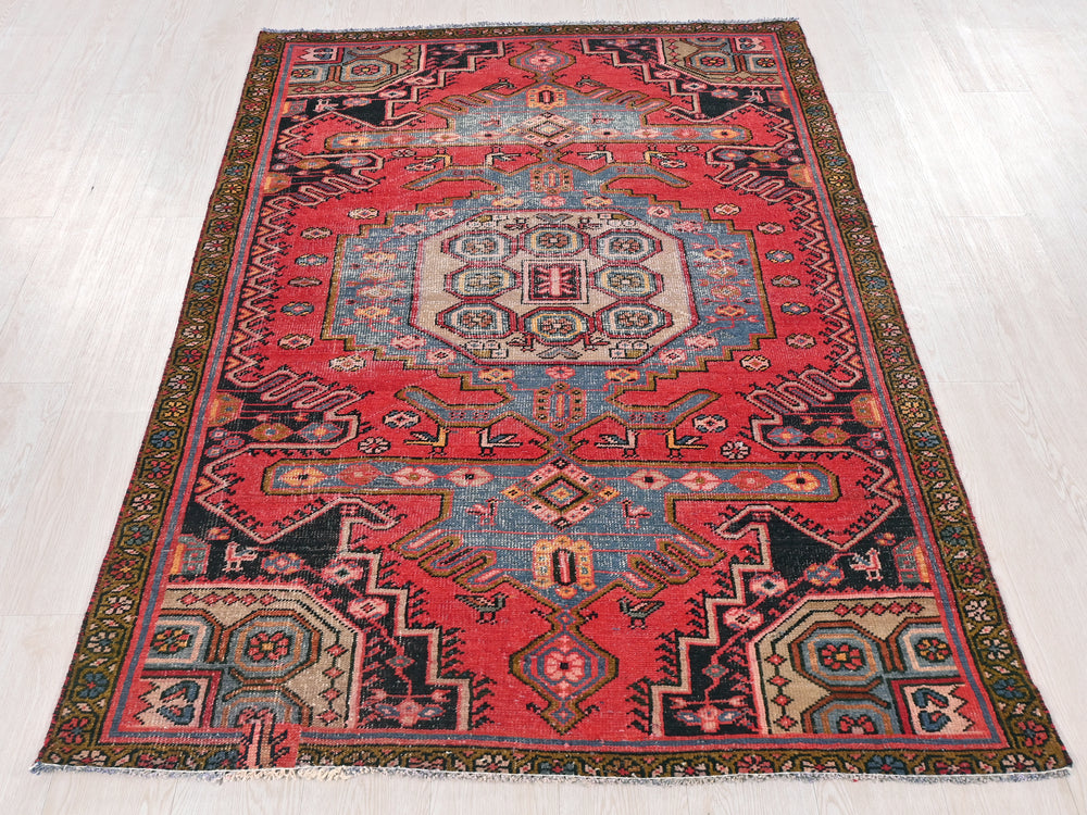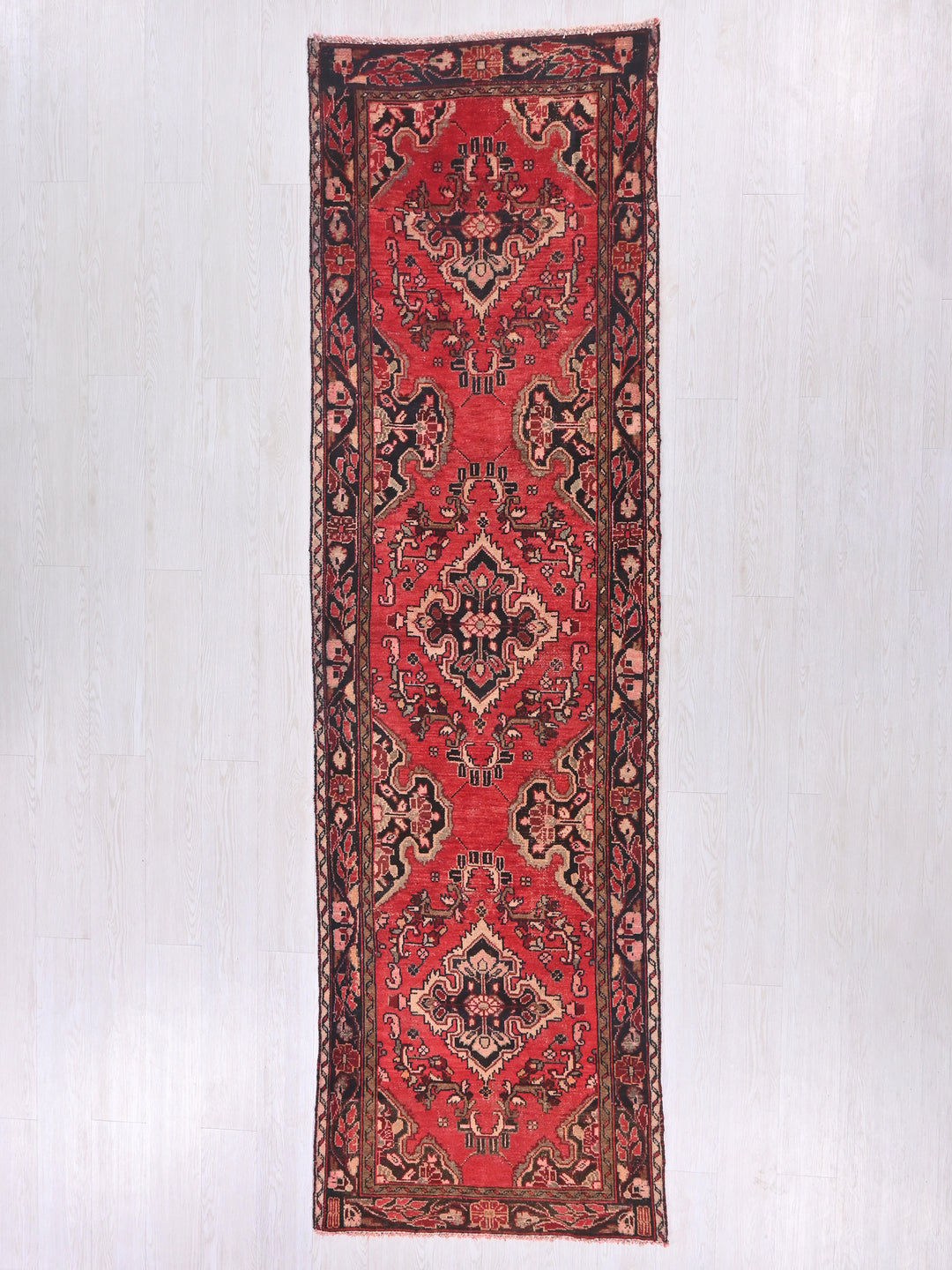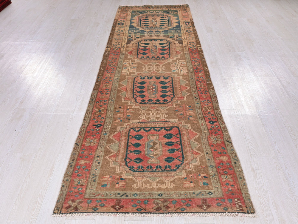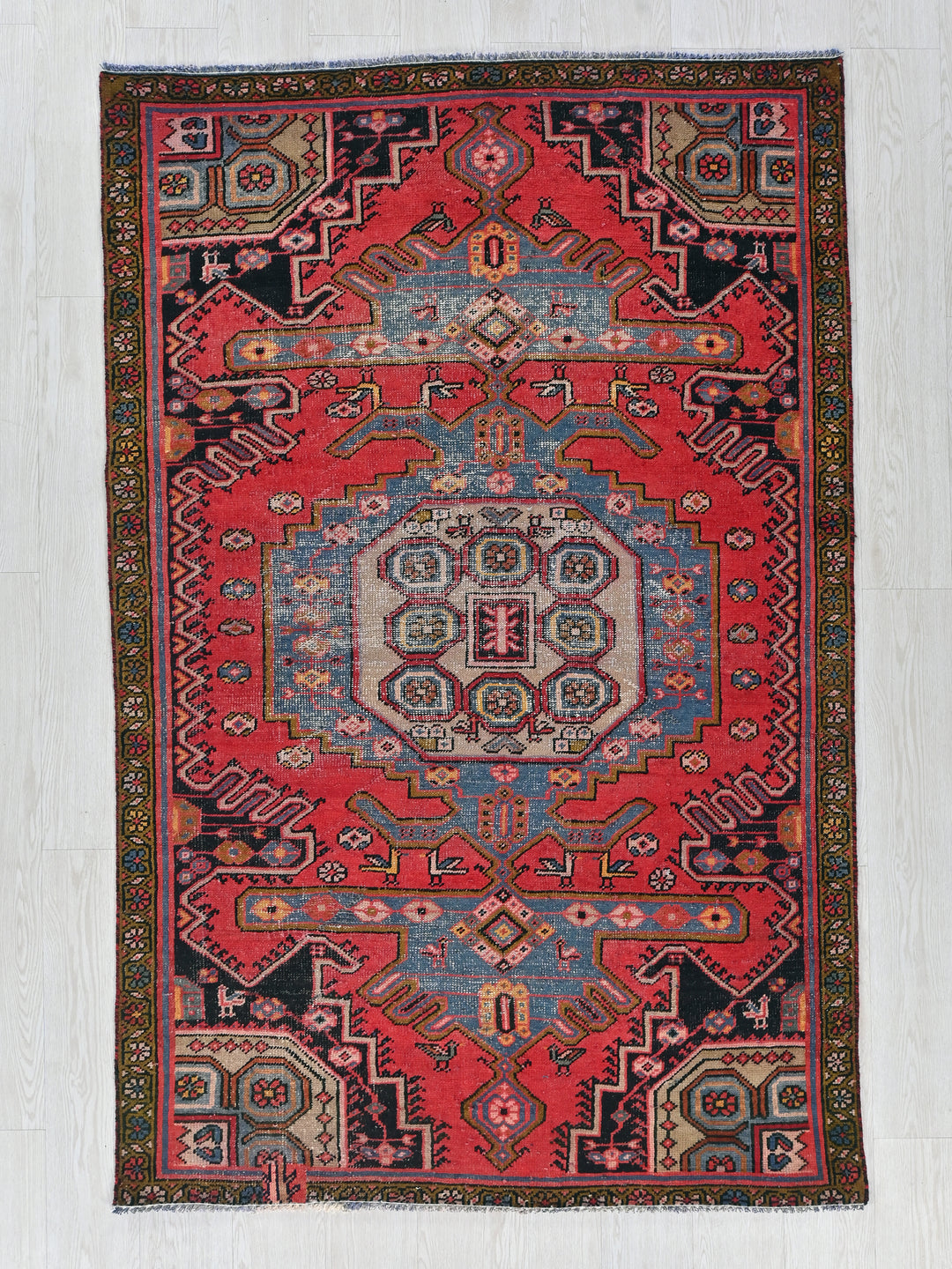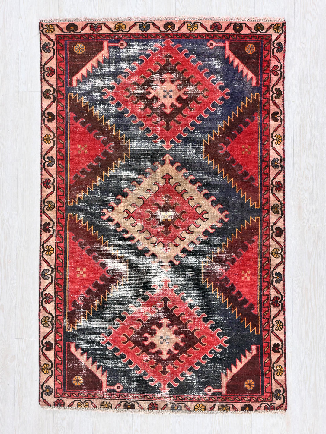 Vintage, hand‑knotted, repaired/restored wear