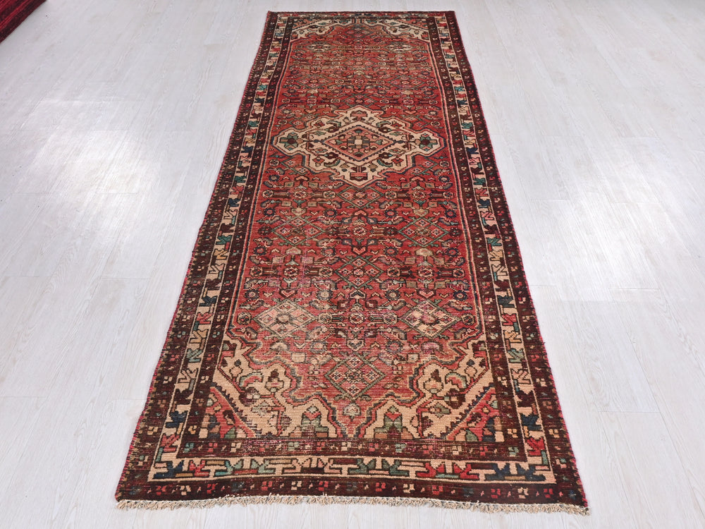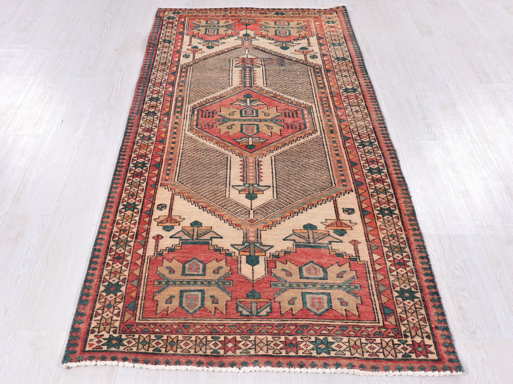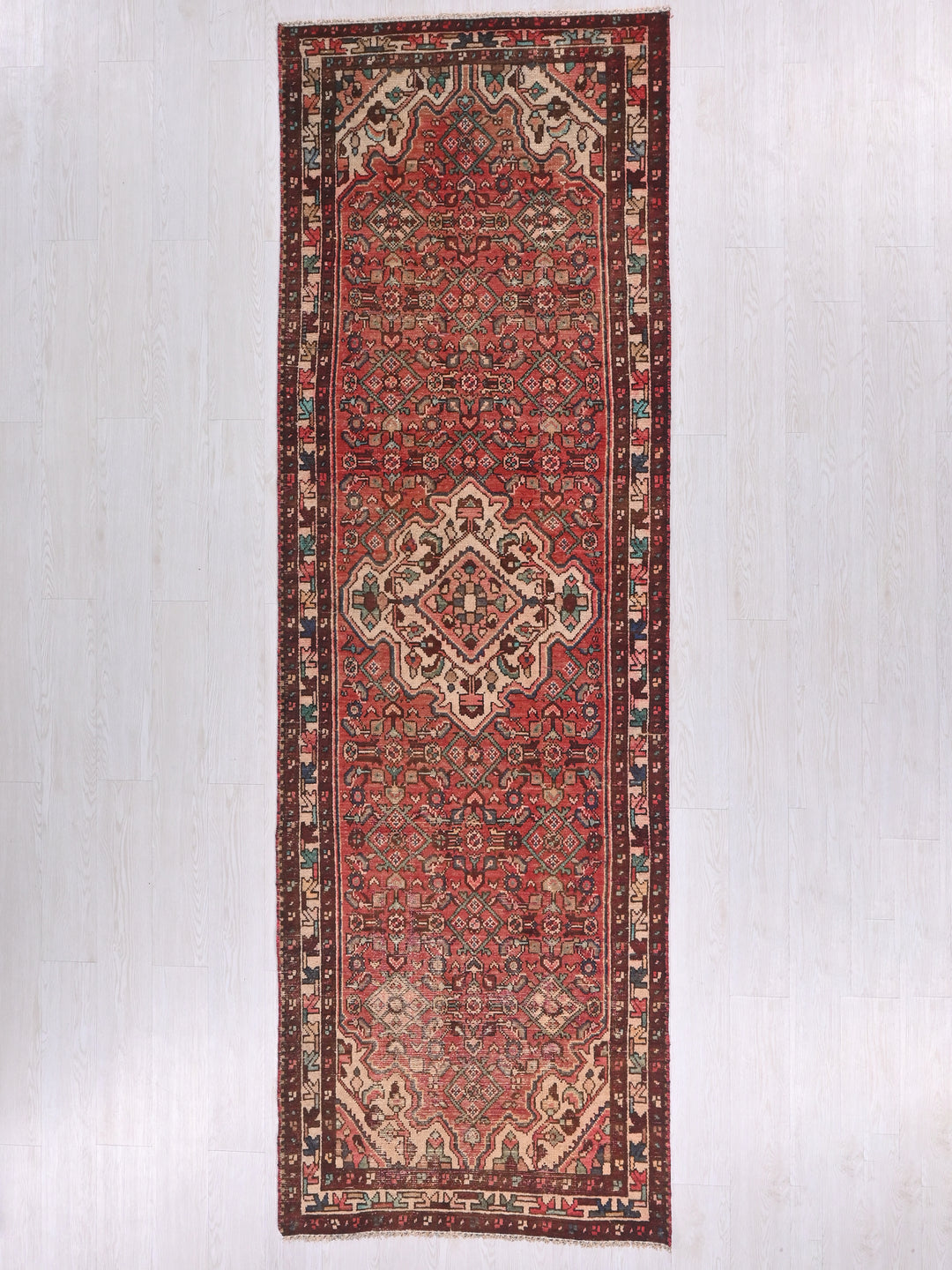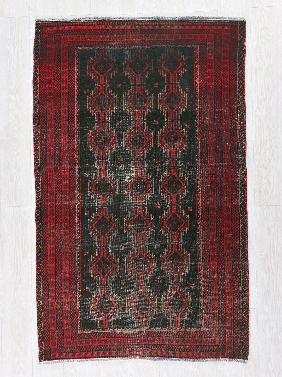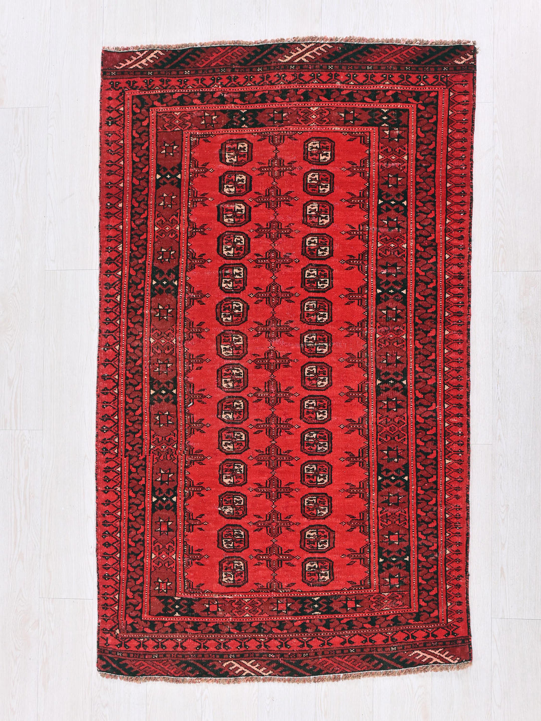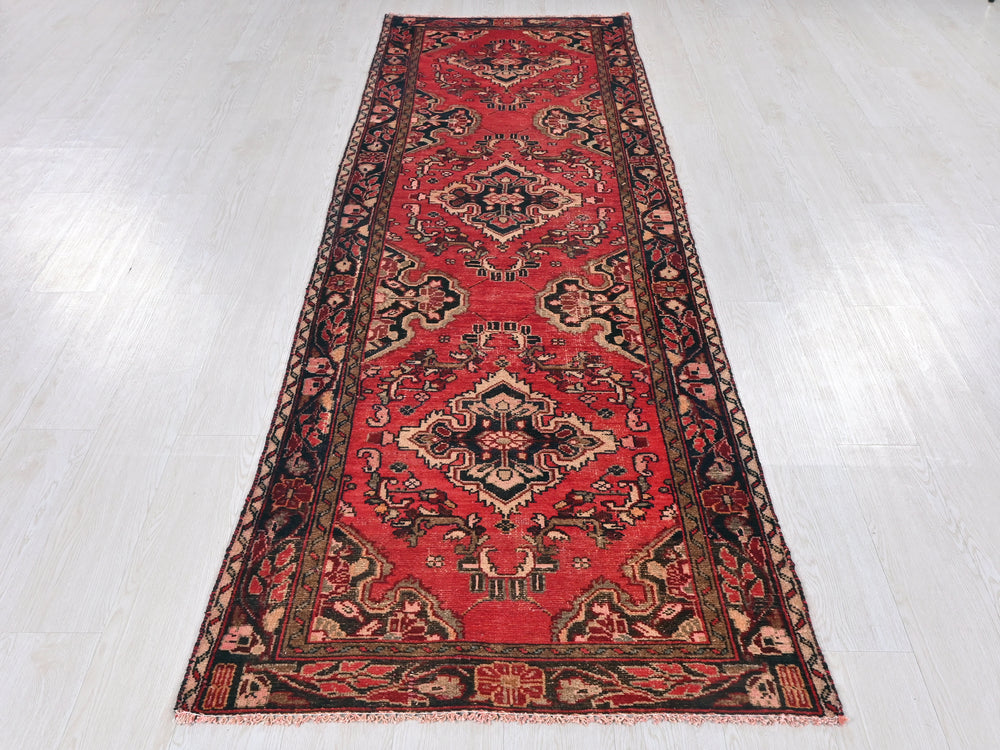Vintage, hand‑knotted, repaired/restored wear