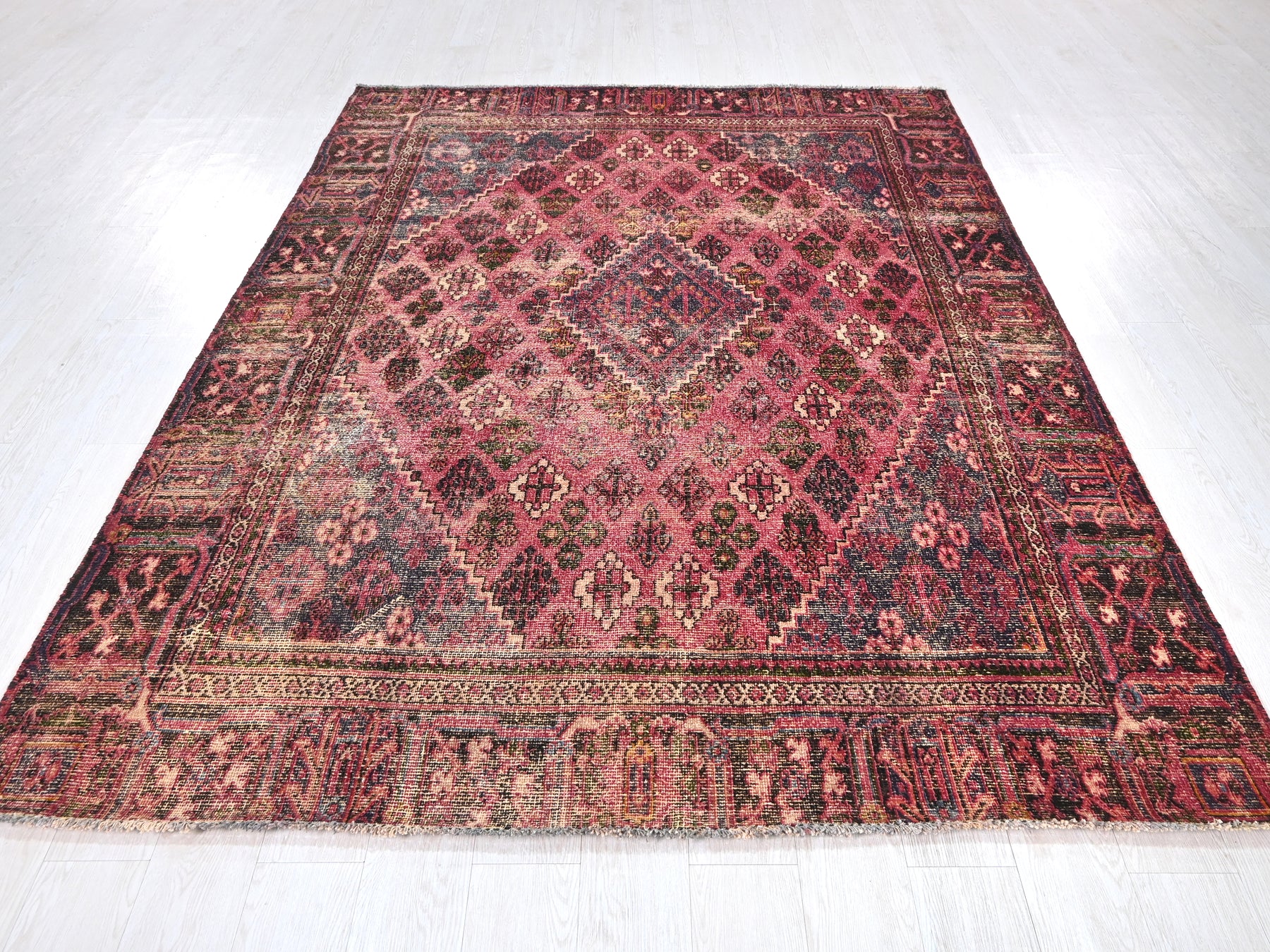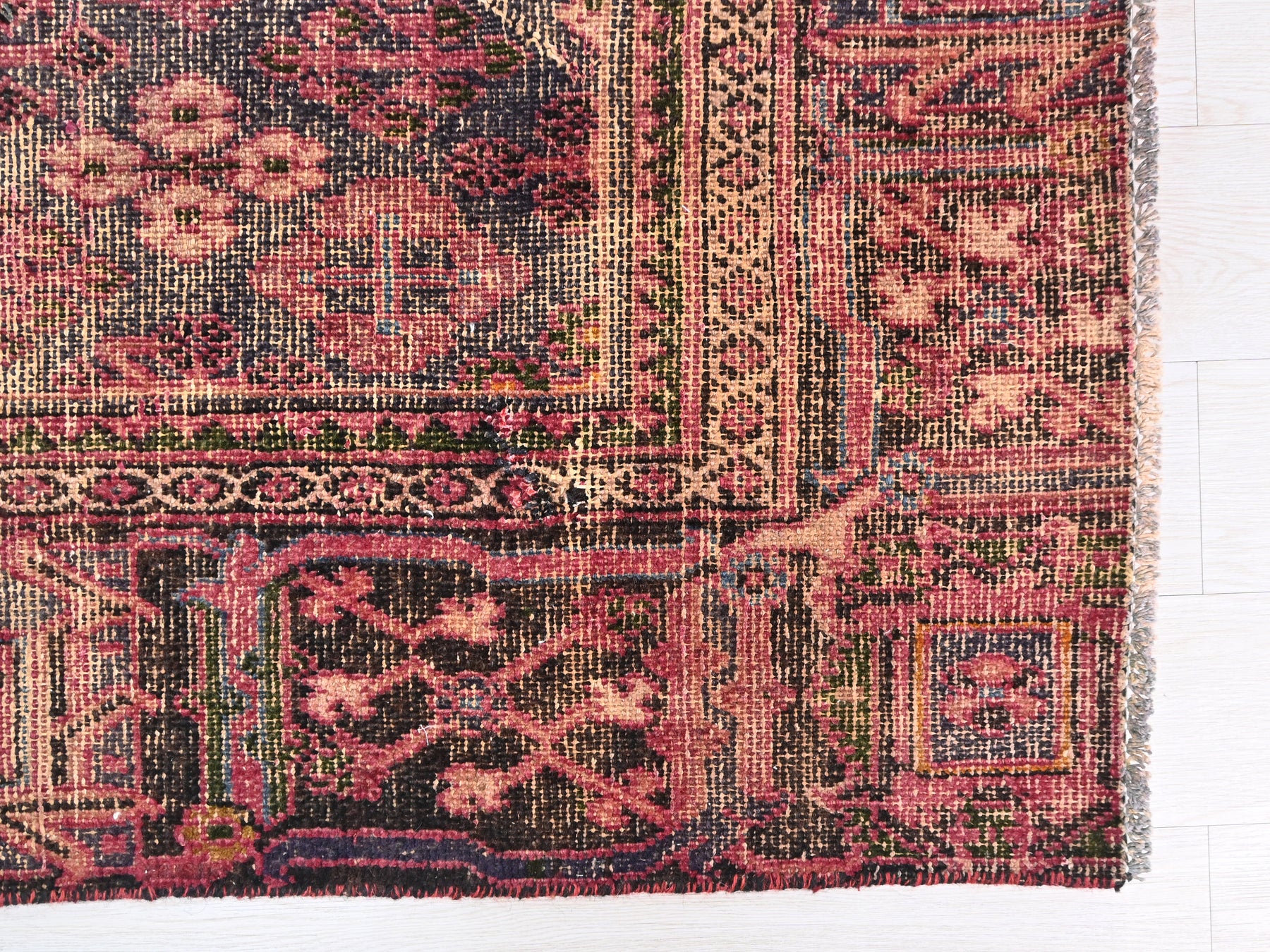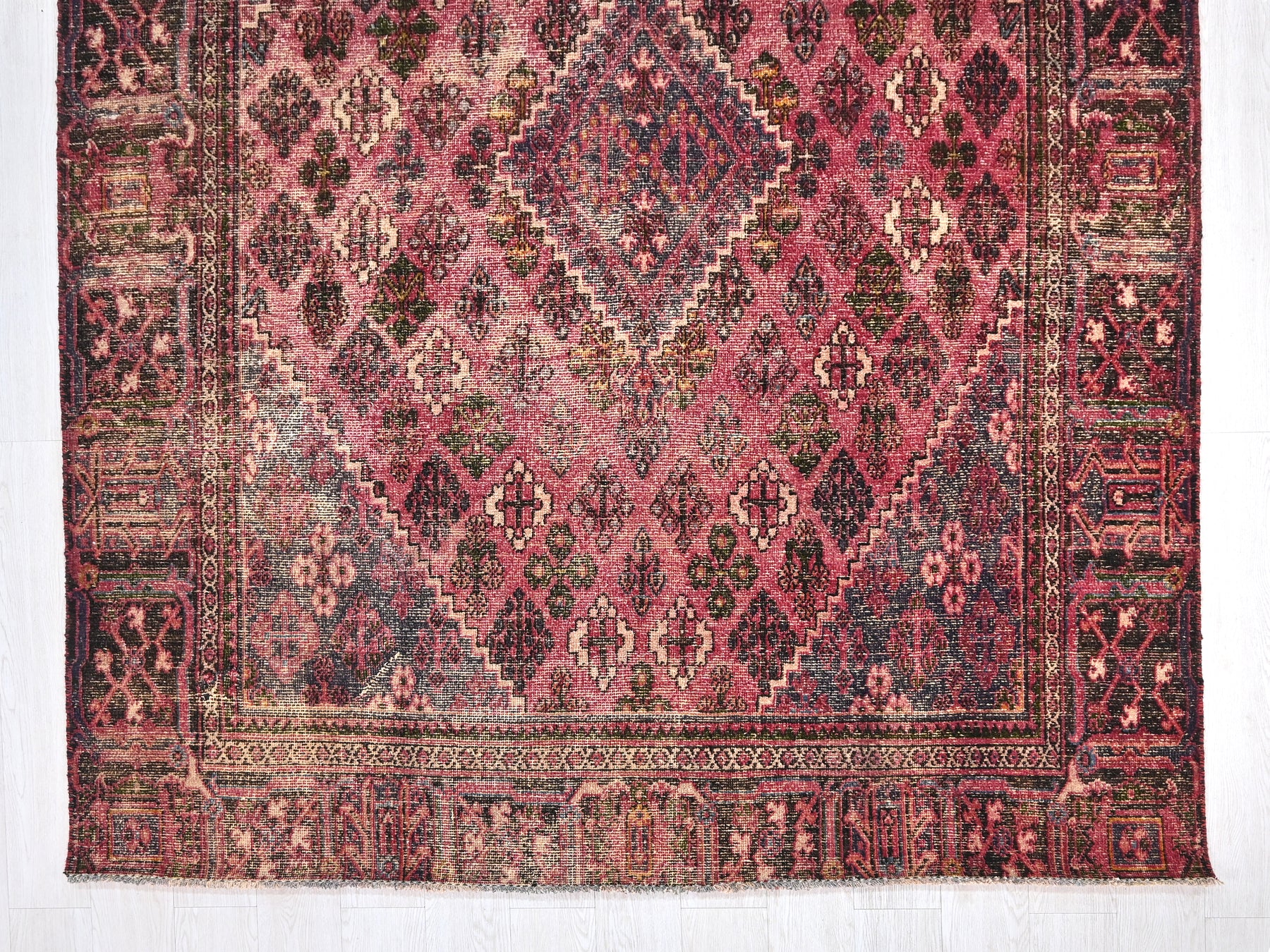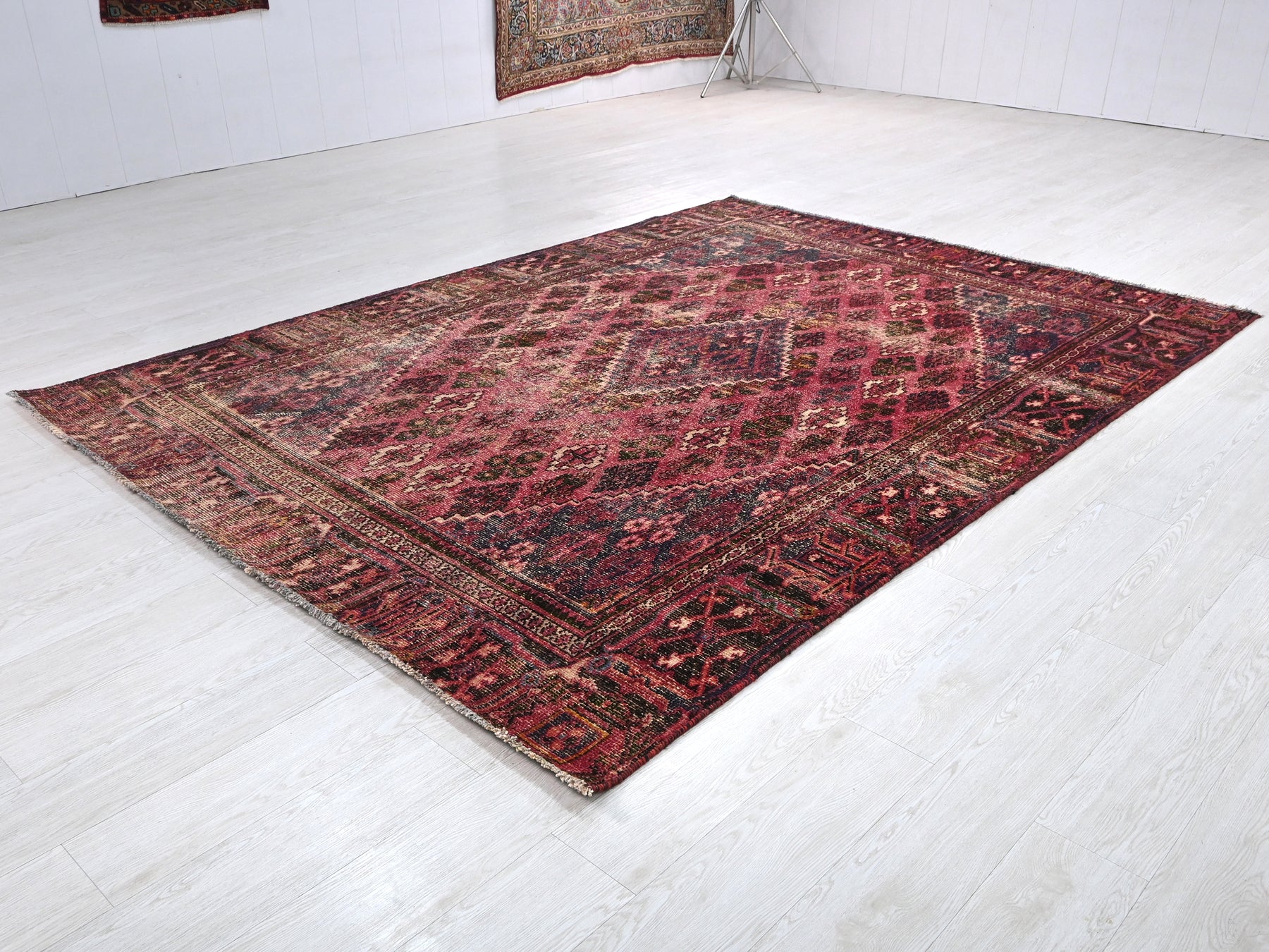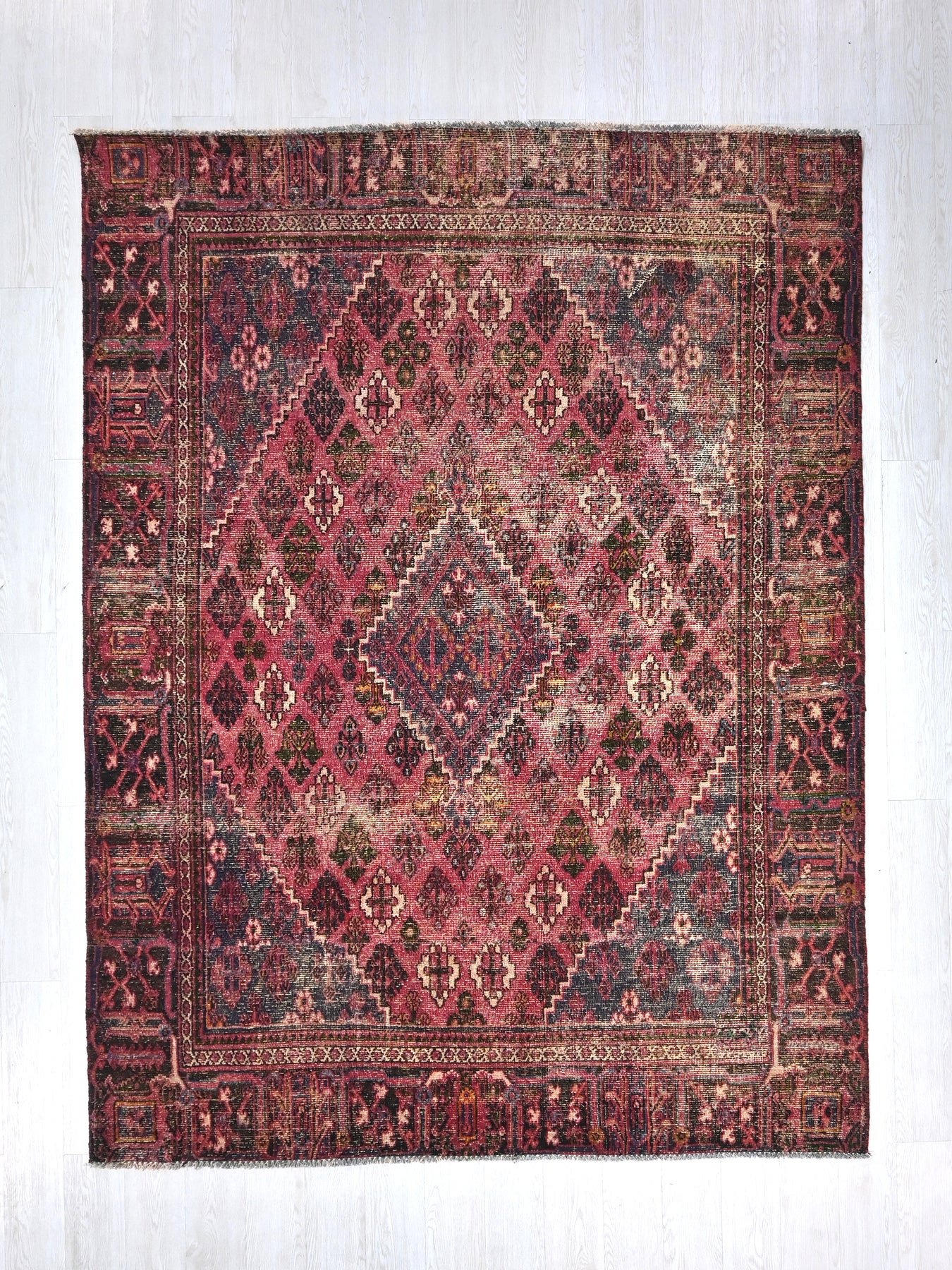 This is a hand-knotted, one-of-a-kind vintage rug. Due to the nature of this piece, there may be slight imperfections in its wear, shape, dimensions, and color. All of our rugs are professionally cleaned and repaired.