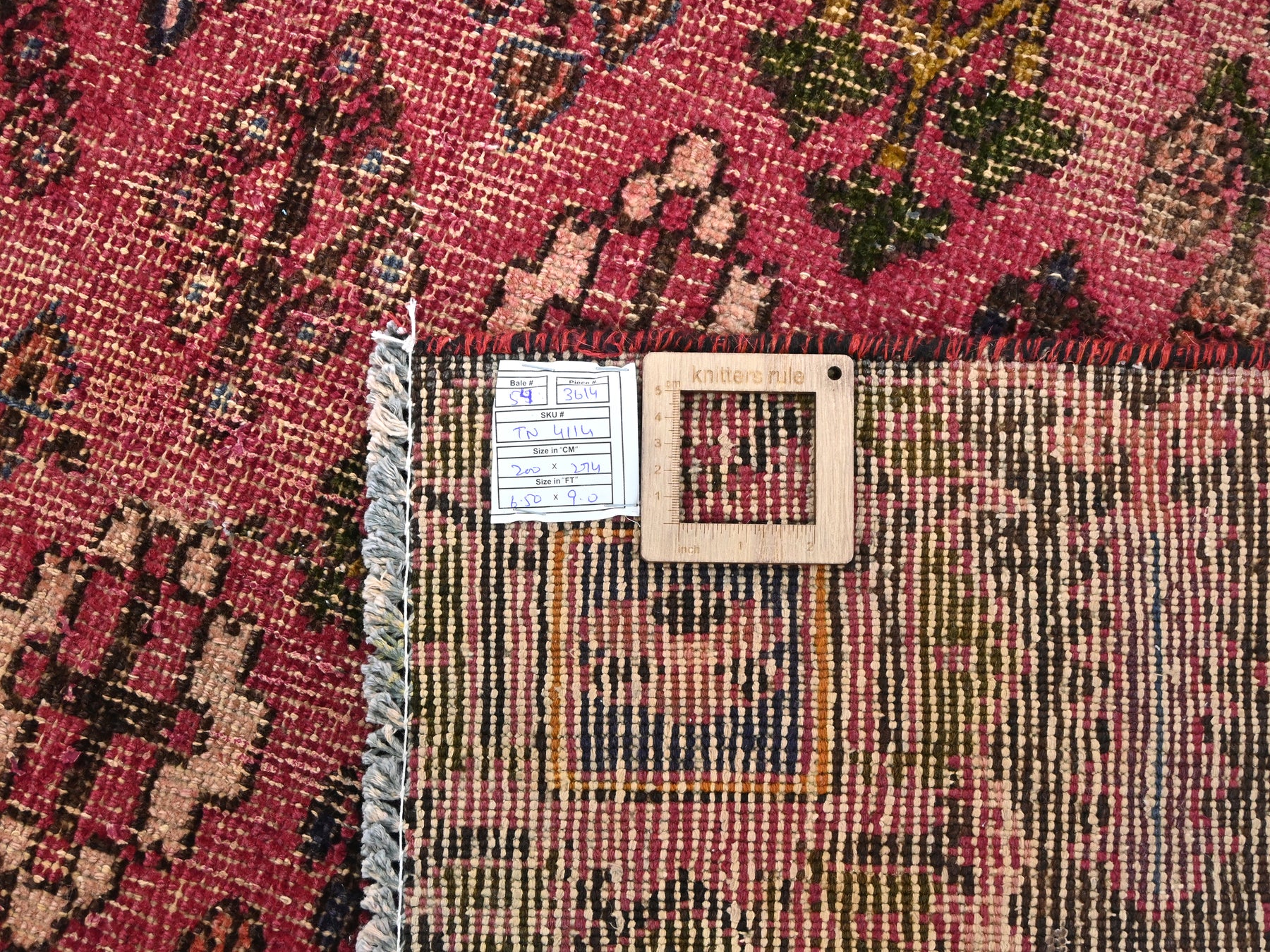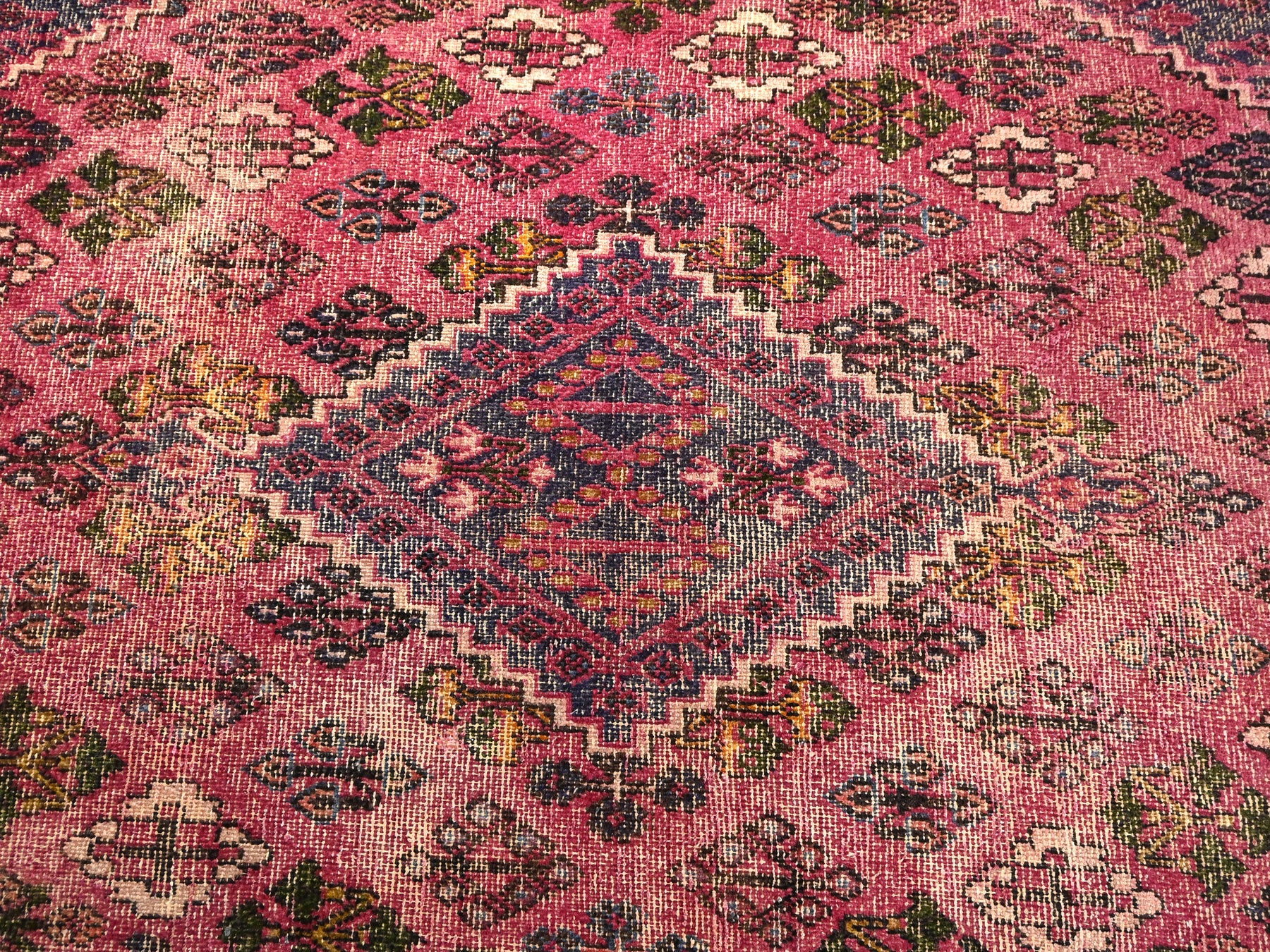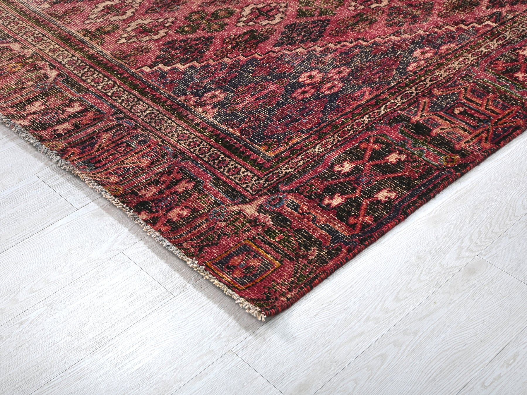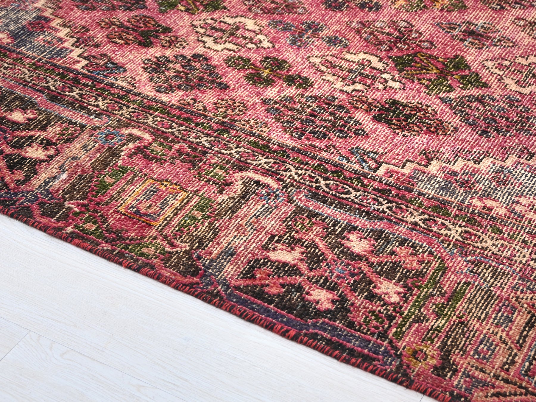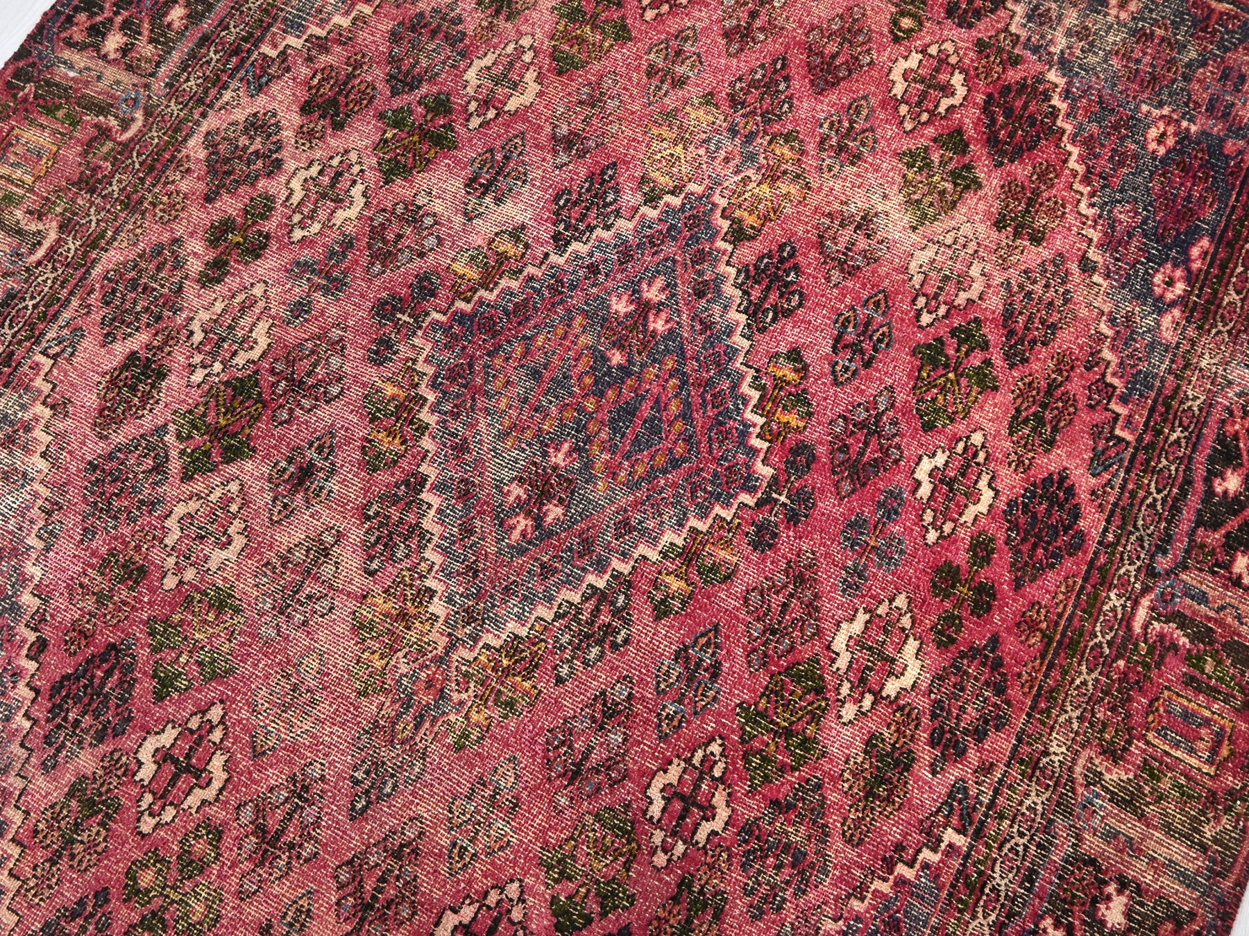 This is a hand-knotted, one-of-a-kind vintage rug. Due to the nature of this piece, there may be slight imperfections in its wear, shape, dimensions, and color. All of our rugs are professionally cleaned and repaired.