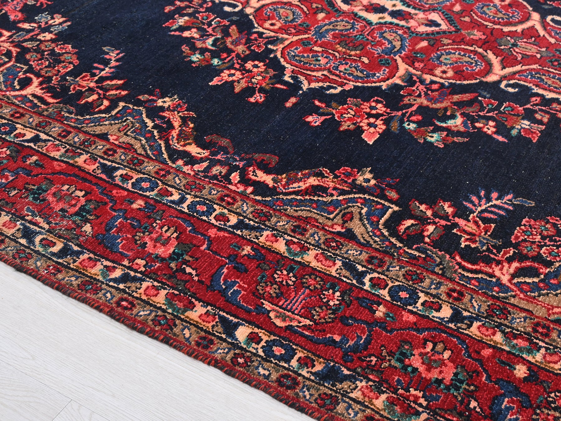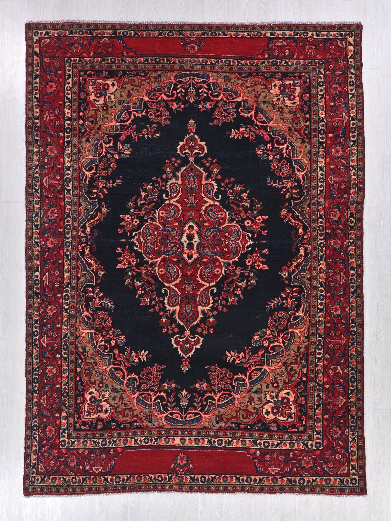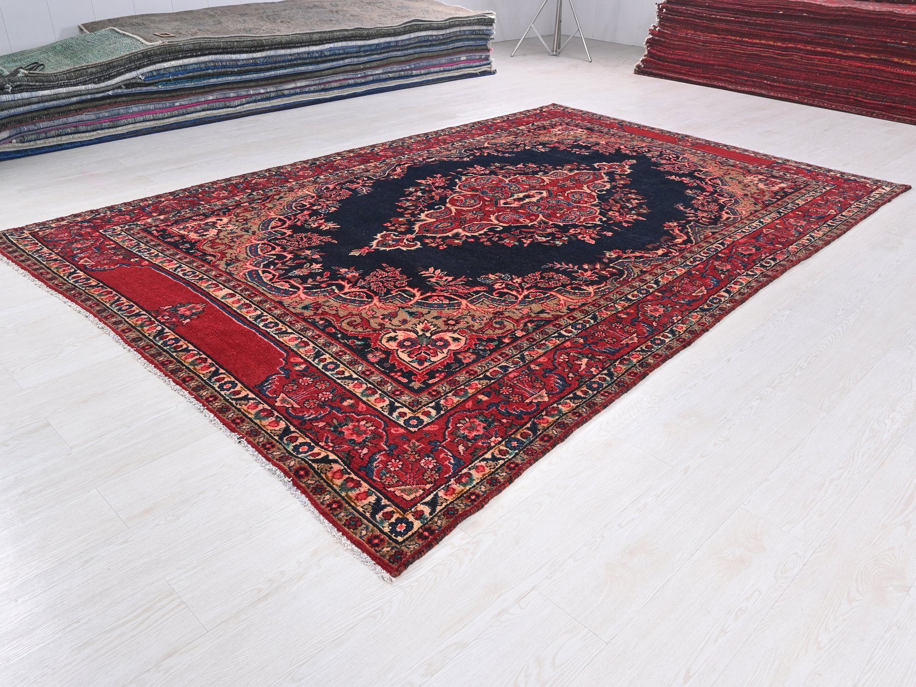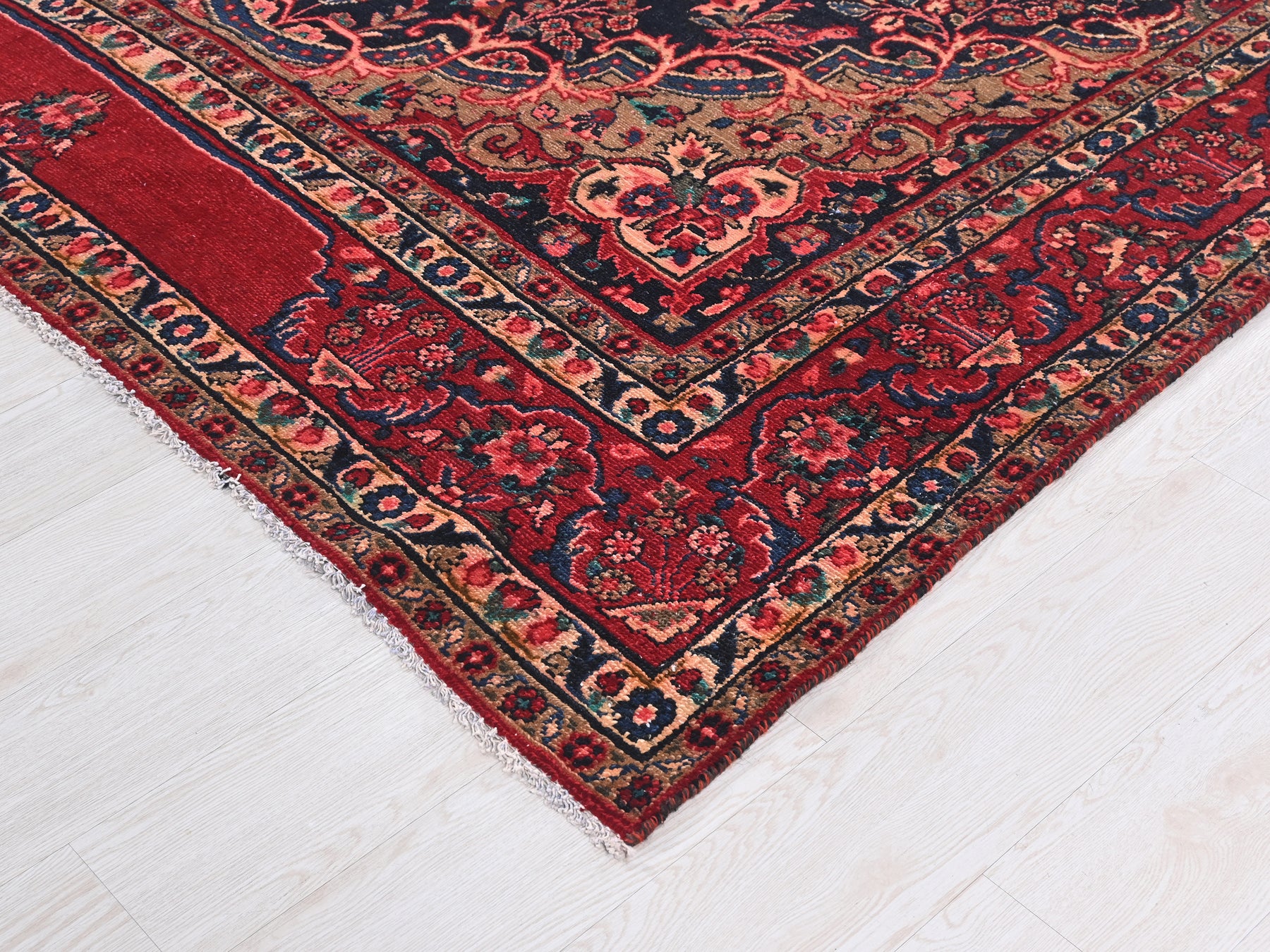 This is a hand-knotted, one-of-a-kind vintage rug. Due to the nature of this piece, there may be slight imperfections in its wear, shape, dimensions, and color. All of our rugs are professionally cleaned and repaired.