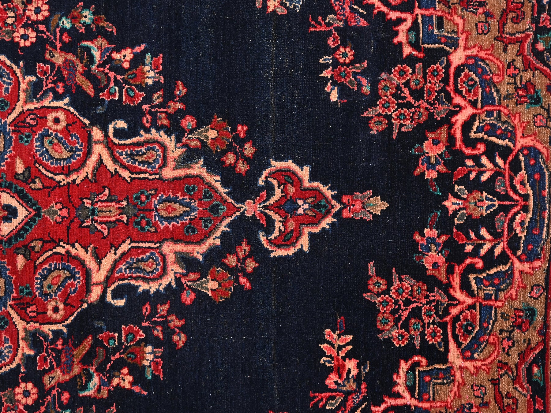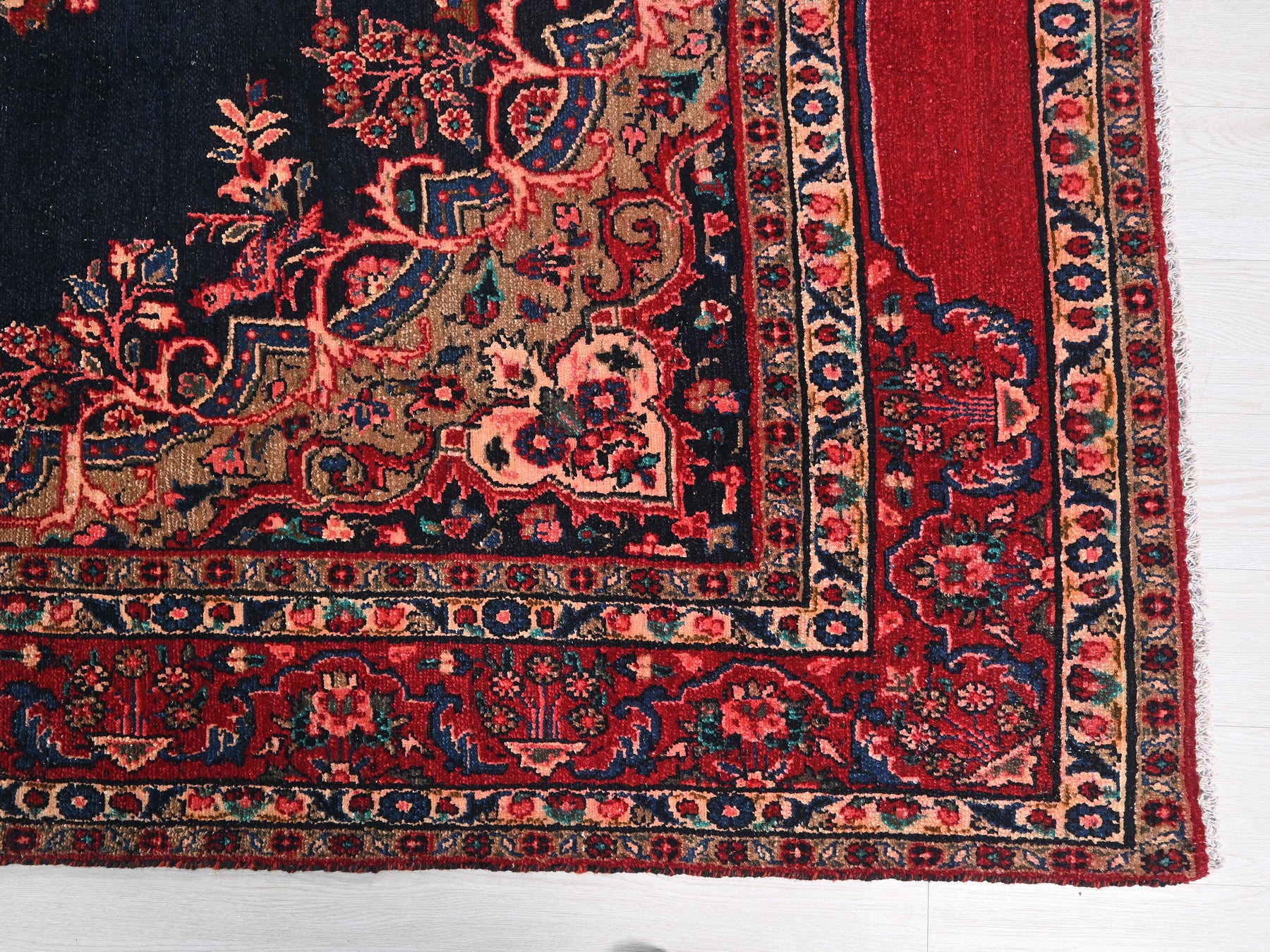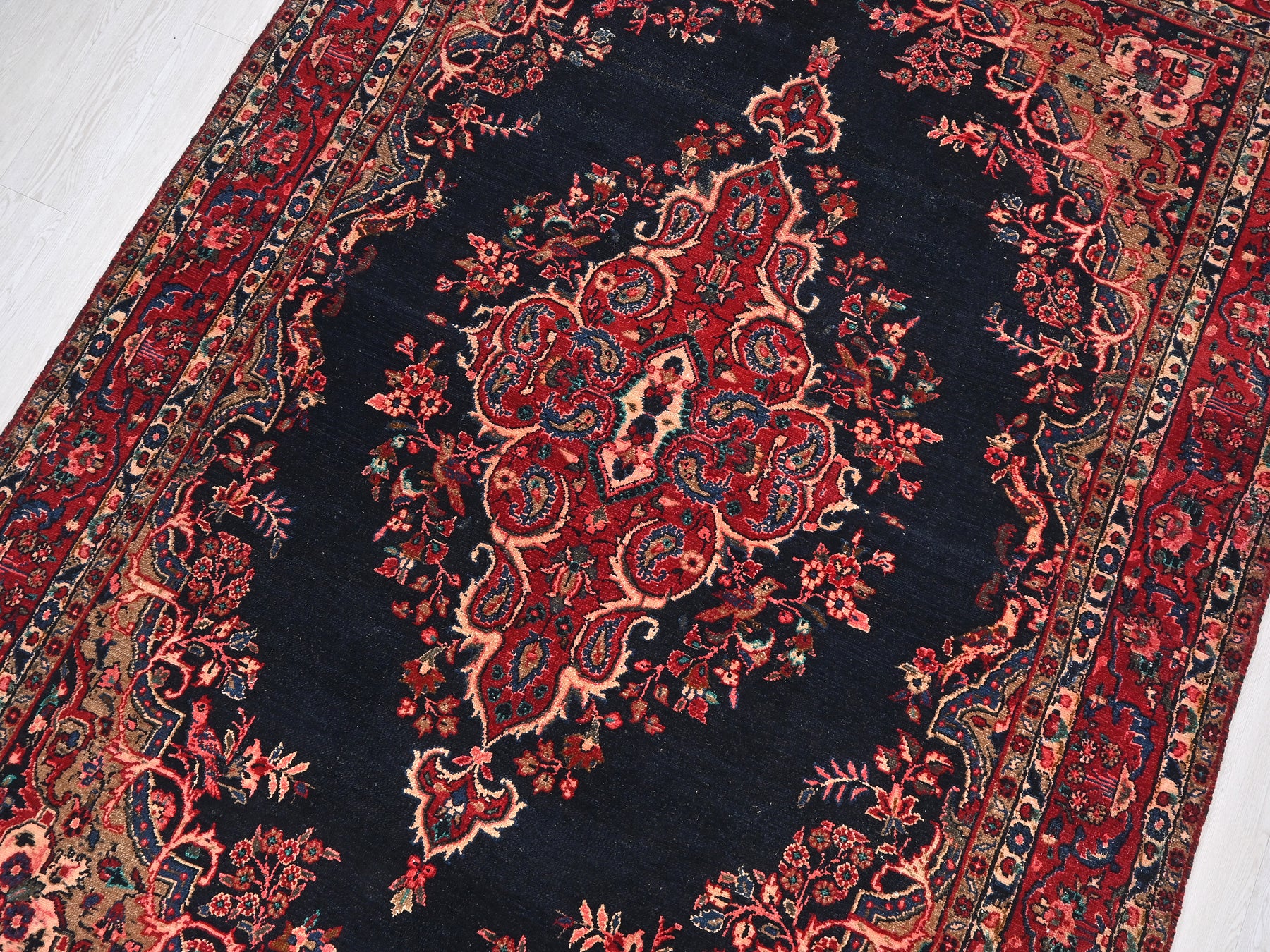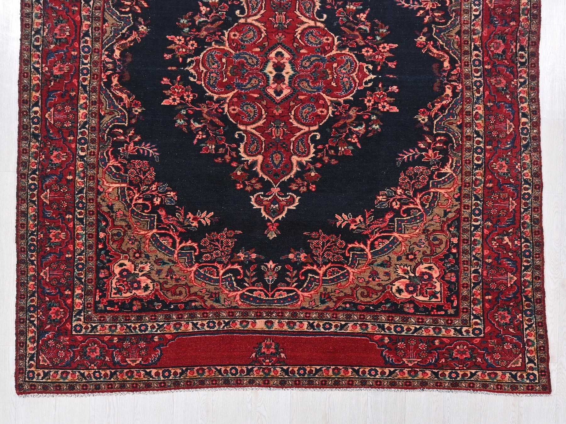 This is a hand-knotted, one-of-a-kind vintage rug. Due to the nature of this piece, there may be slight imperfections in its wear, shape, dimensions, and color. All of our rugs are professionally cleaned and repaired.