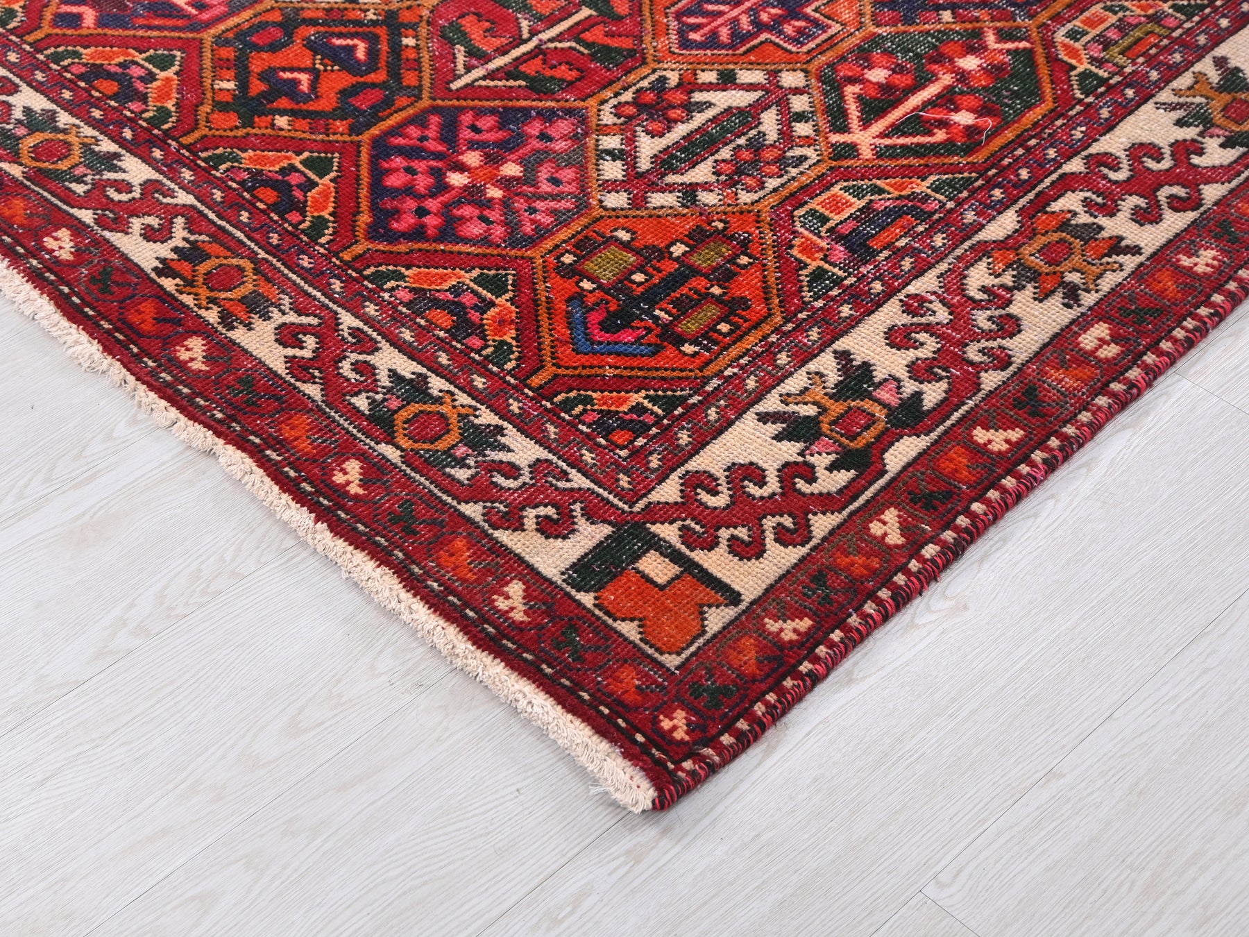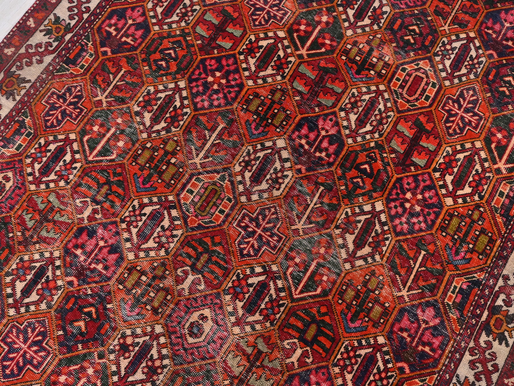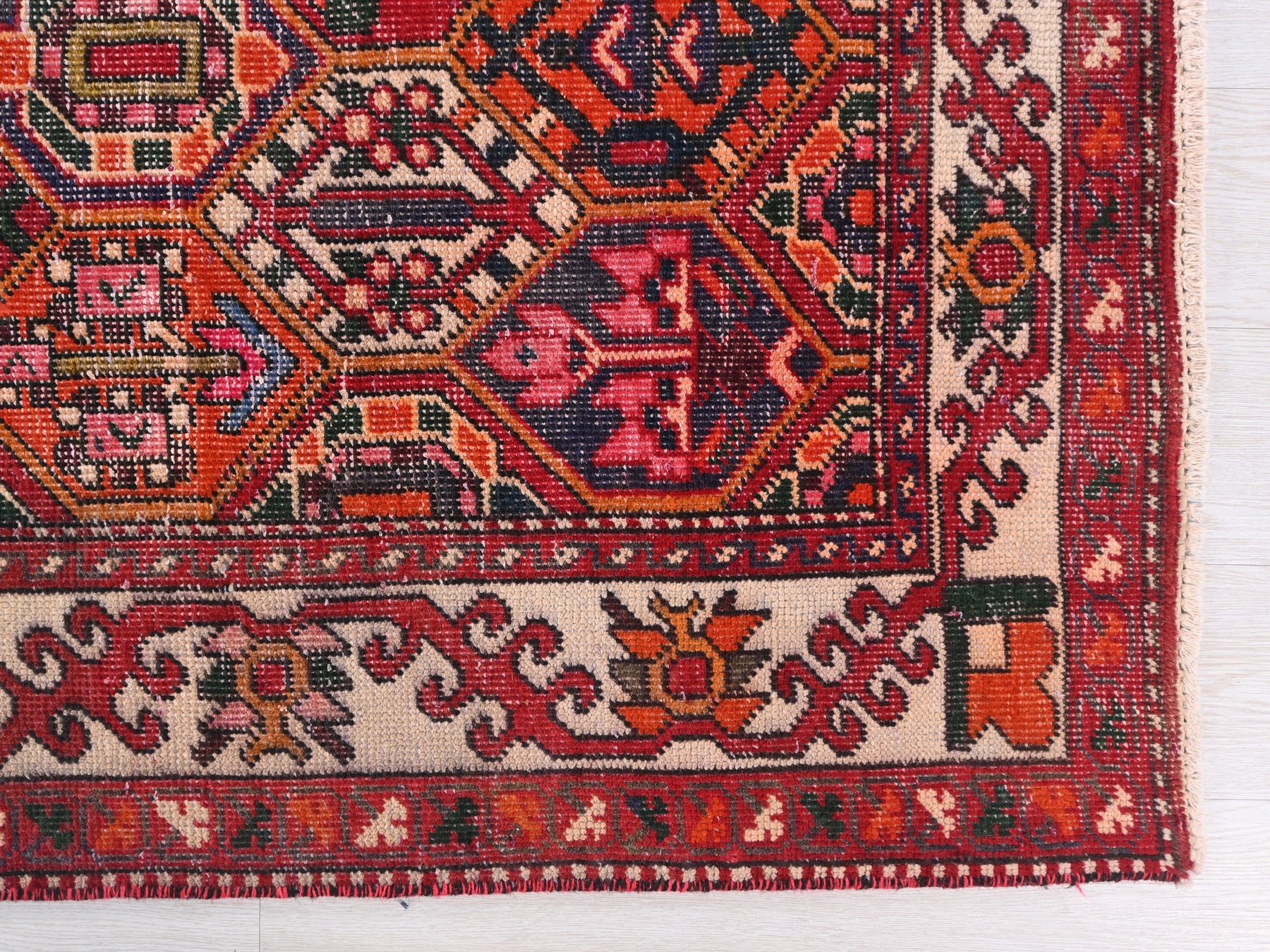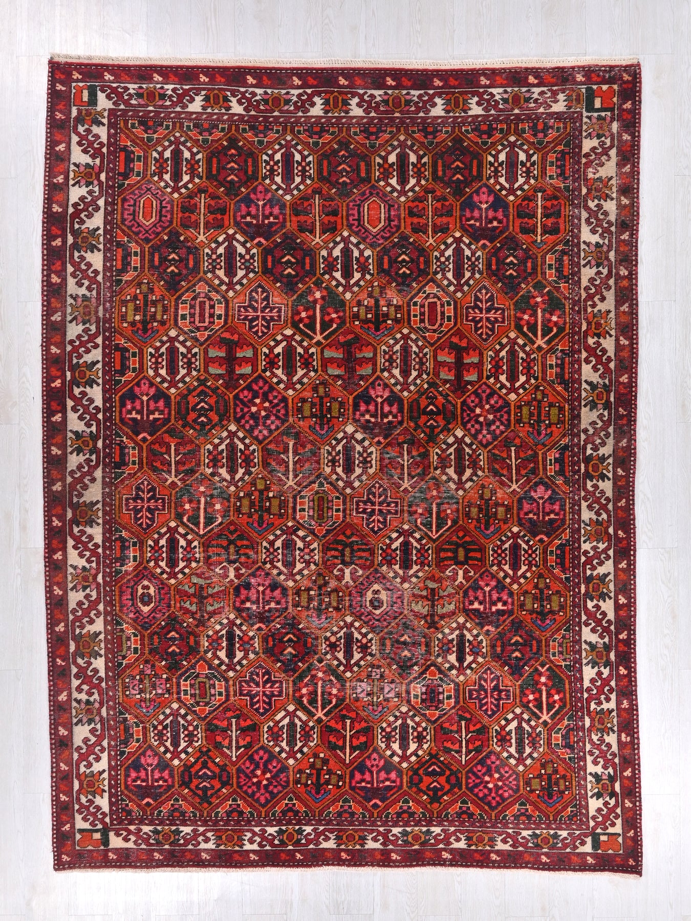 This is a hand-knotted, one-of-a-kind vintage rug. Due to the nature of this piece, there may be slight imperfections in its wear, shape, dimensions, and color. All of our rugs are professionally cleaned and repaired.