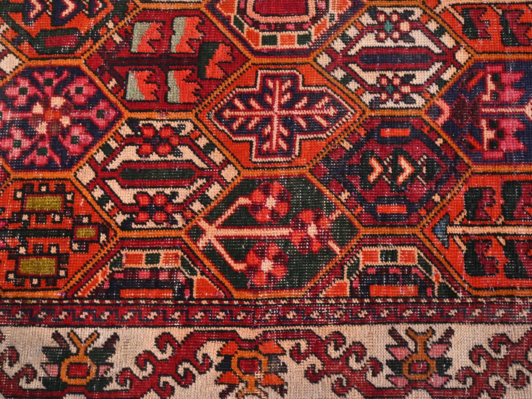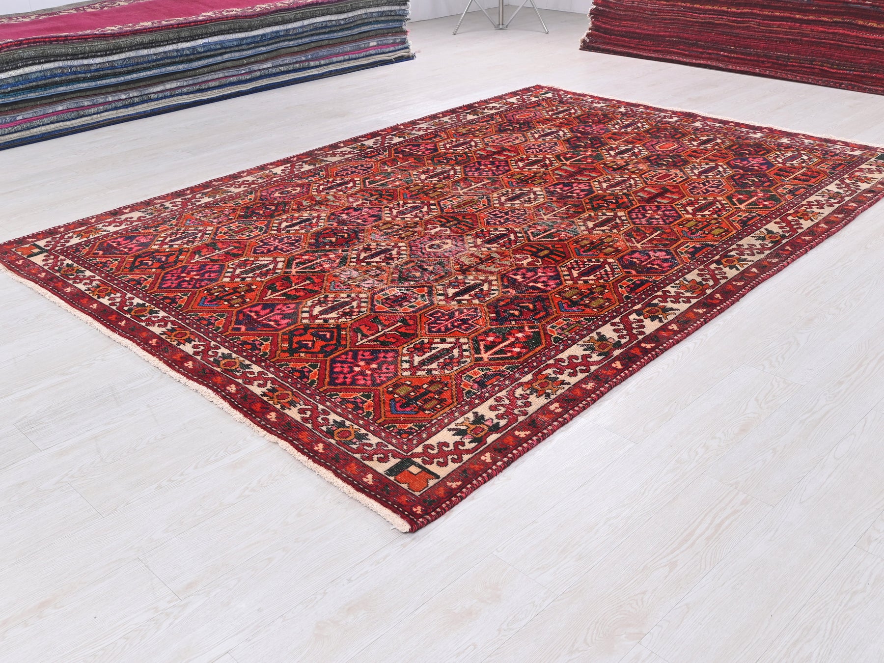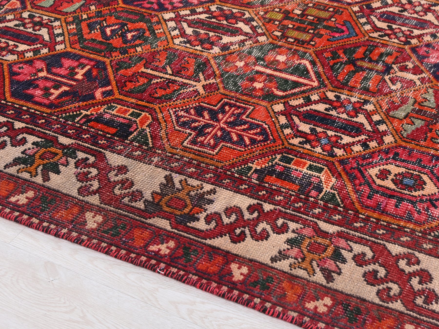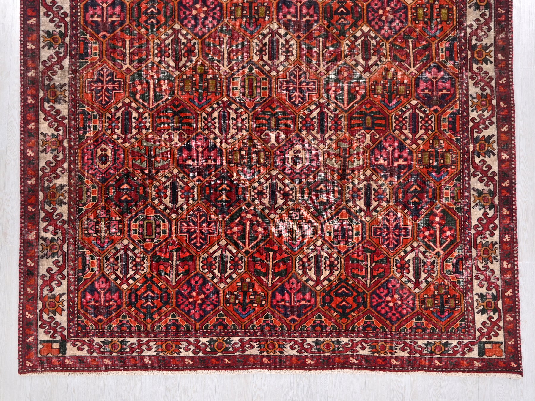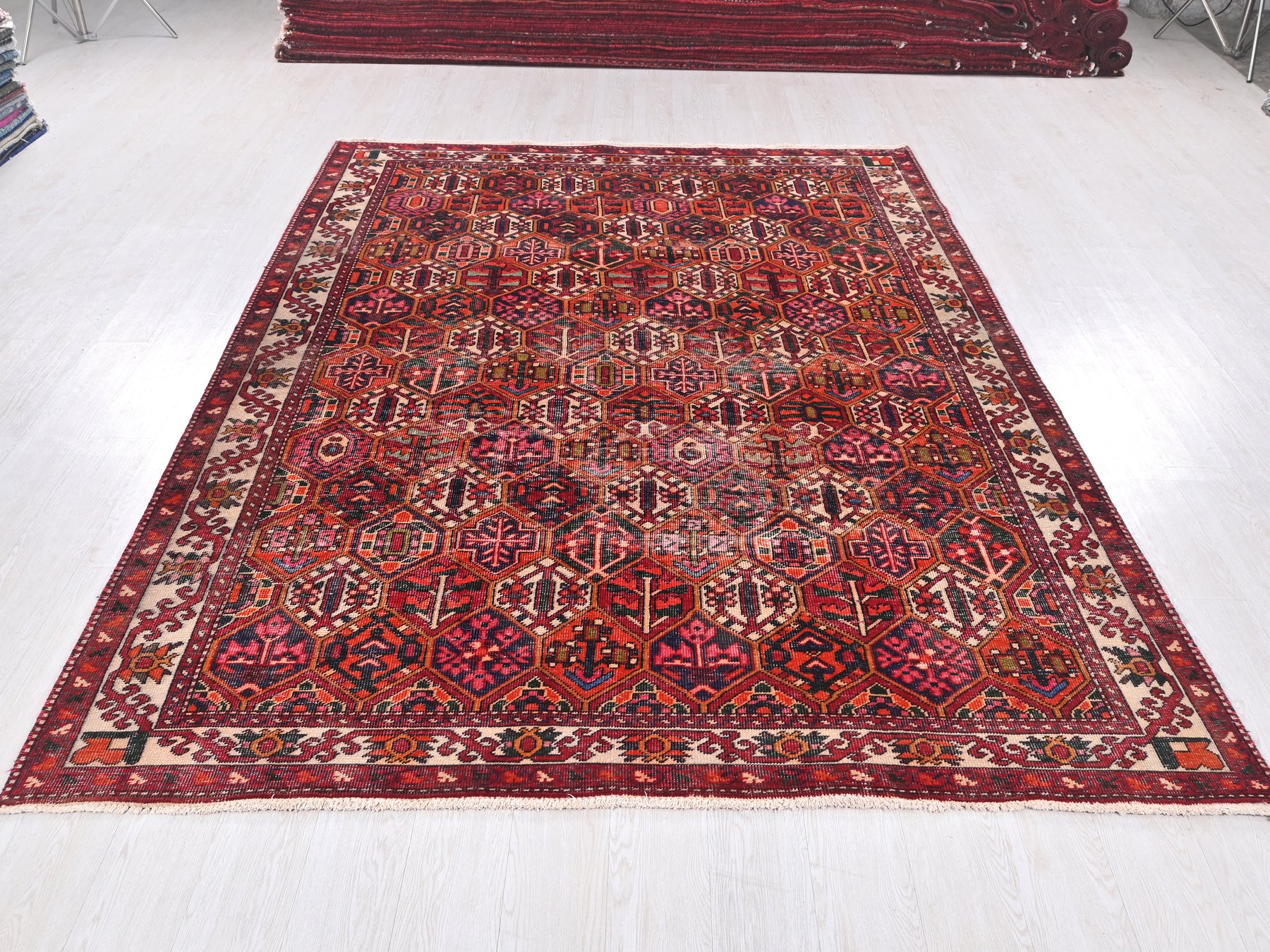 This is a hand-knotted, one-of-a-kind vintage rug. Due to the nature of this piece, there may be slight imperfections in its wear, shape, dimensions, and color. All of our rugs are professionally cleaned and repaired.