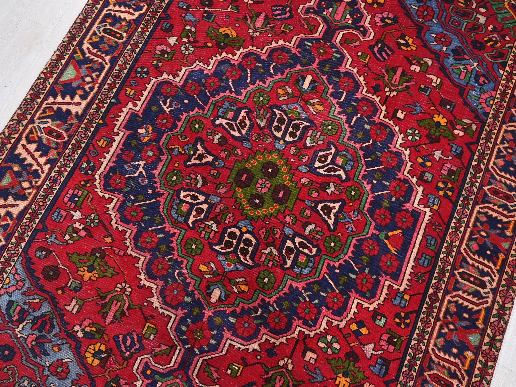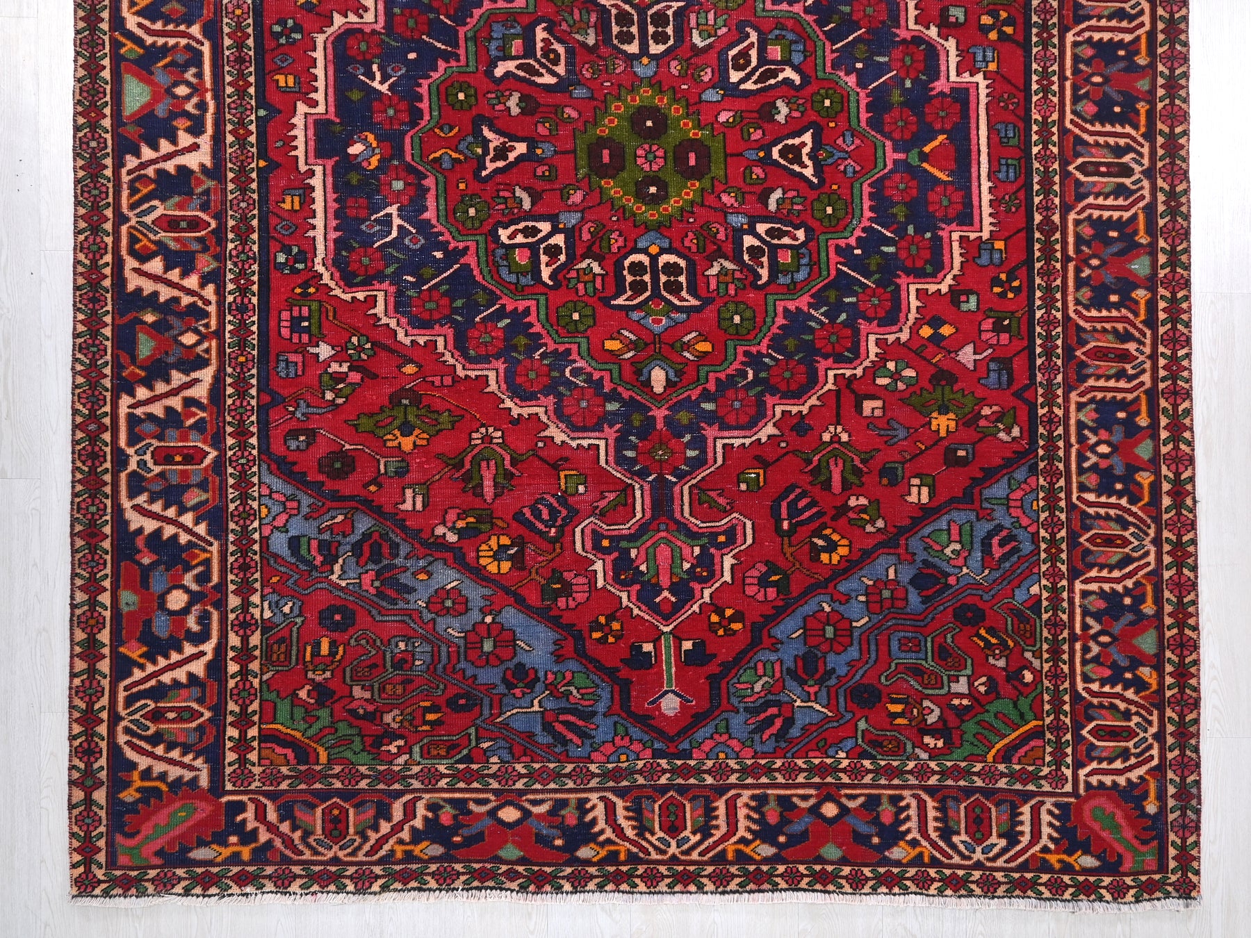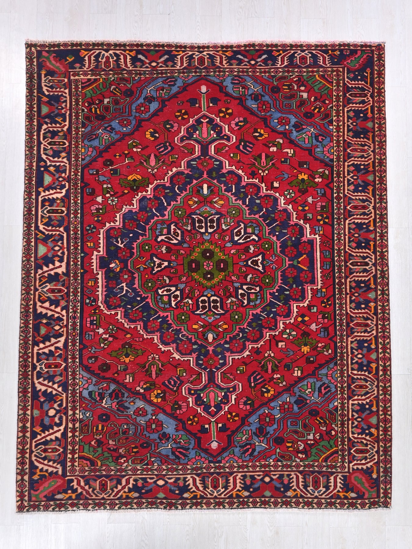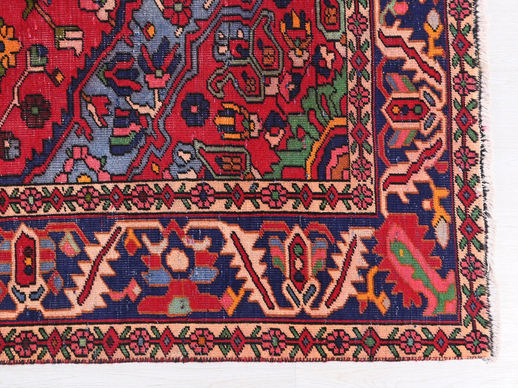 This is a hand-knotted, one-of-a-kind vintage rug. Due to the nature of this piece, there may be slight imperfections in its wear, shape, dimensions, and color. All of our rugs are professionally cleaned and repaired.