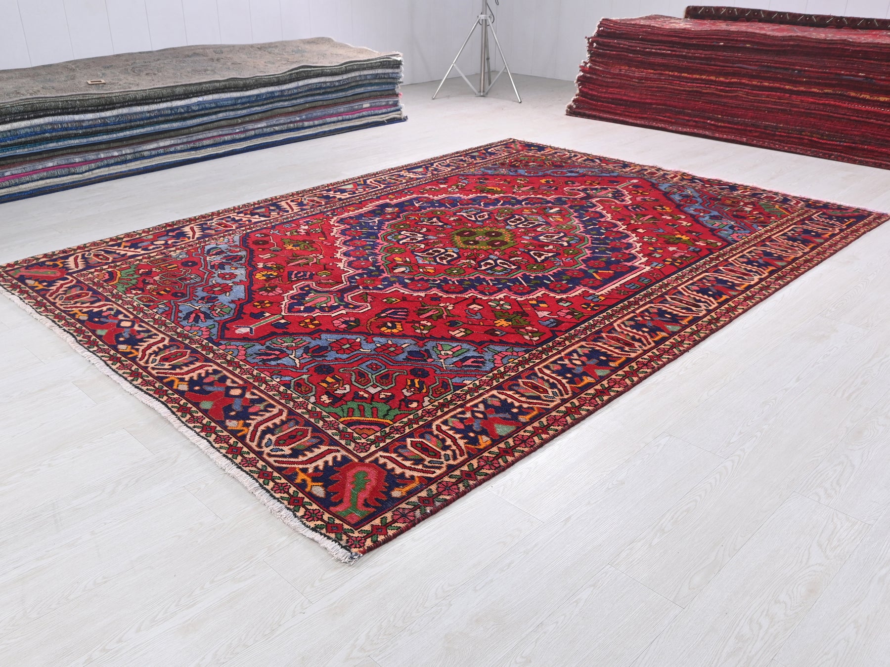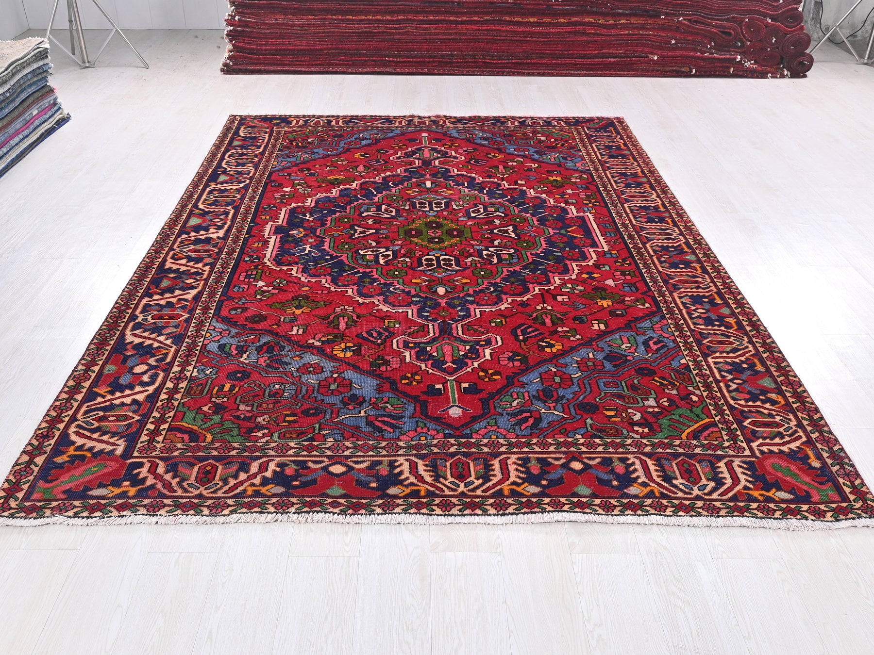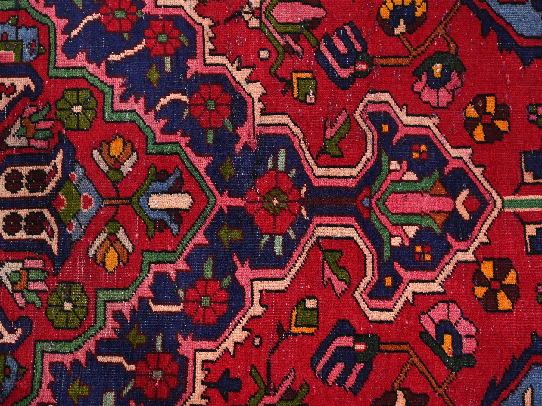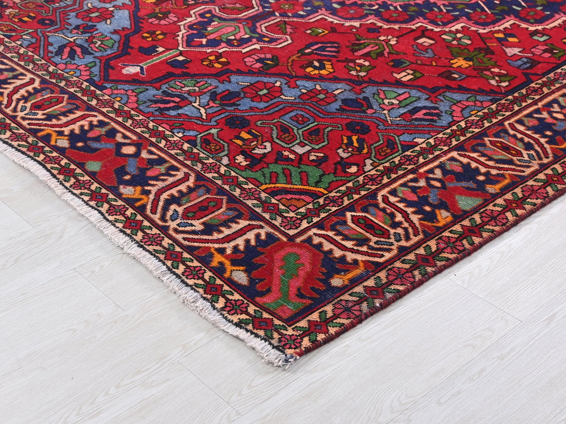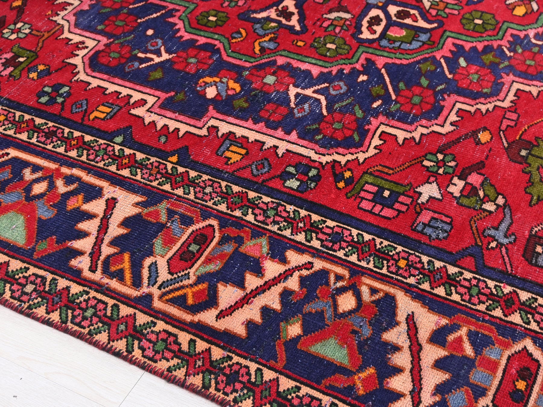 This is a hand-knotted, one-of-a-kind vintage rug. Due to the nature of this piece, there may be slight imperfections in its wear, shape, dimensions, and color. All of our rugs are professionally cleaned and repaired.