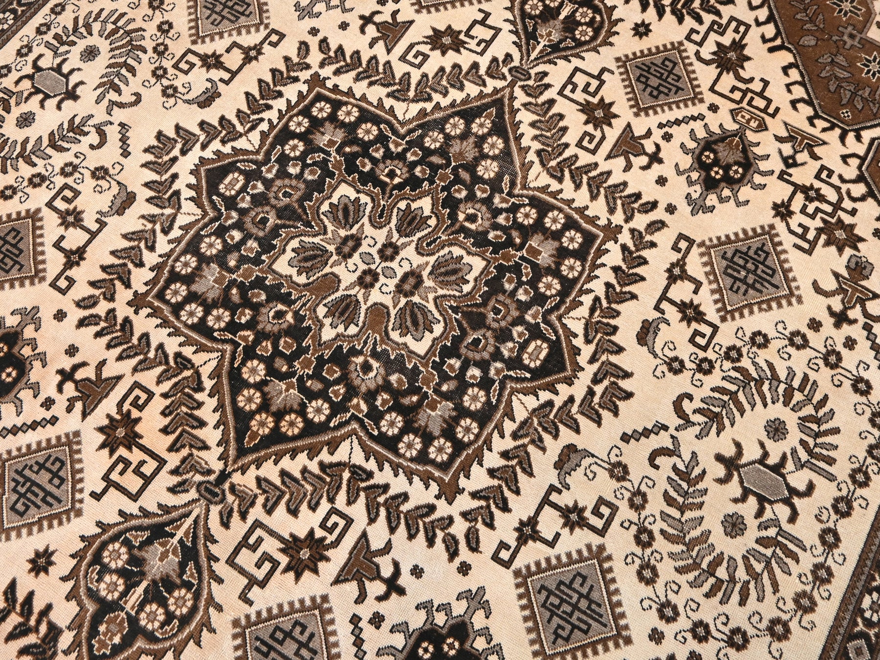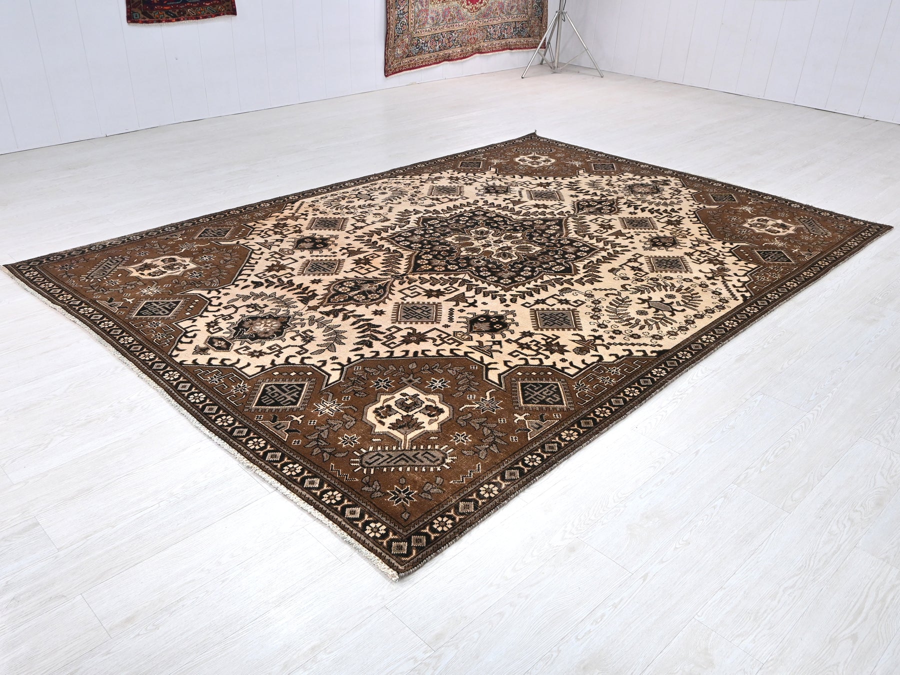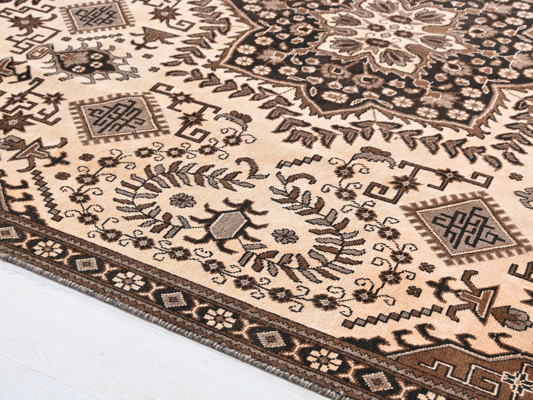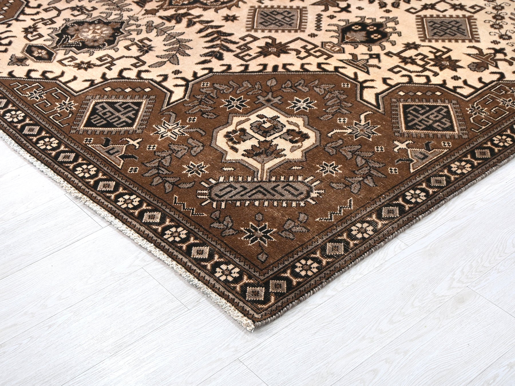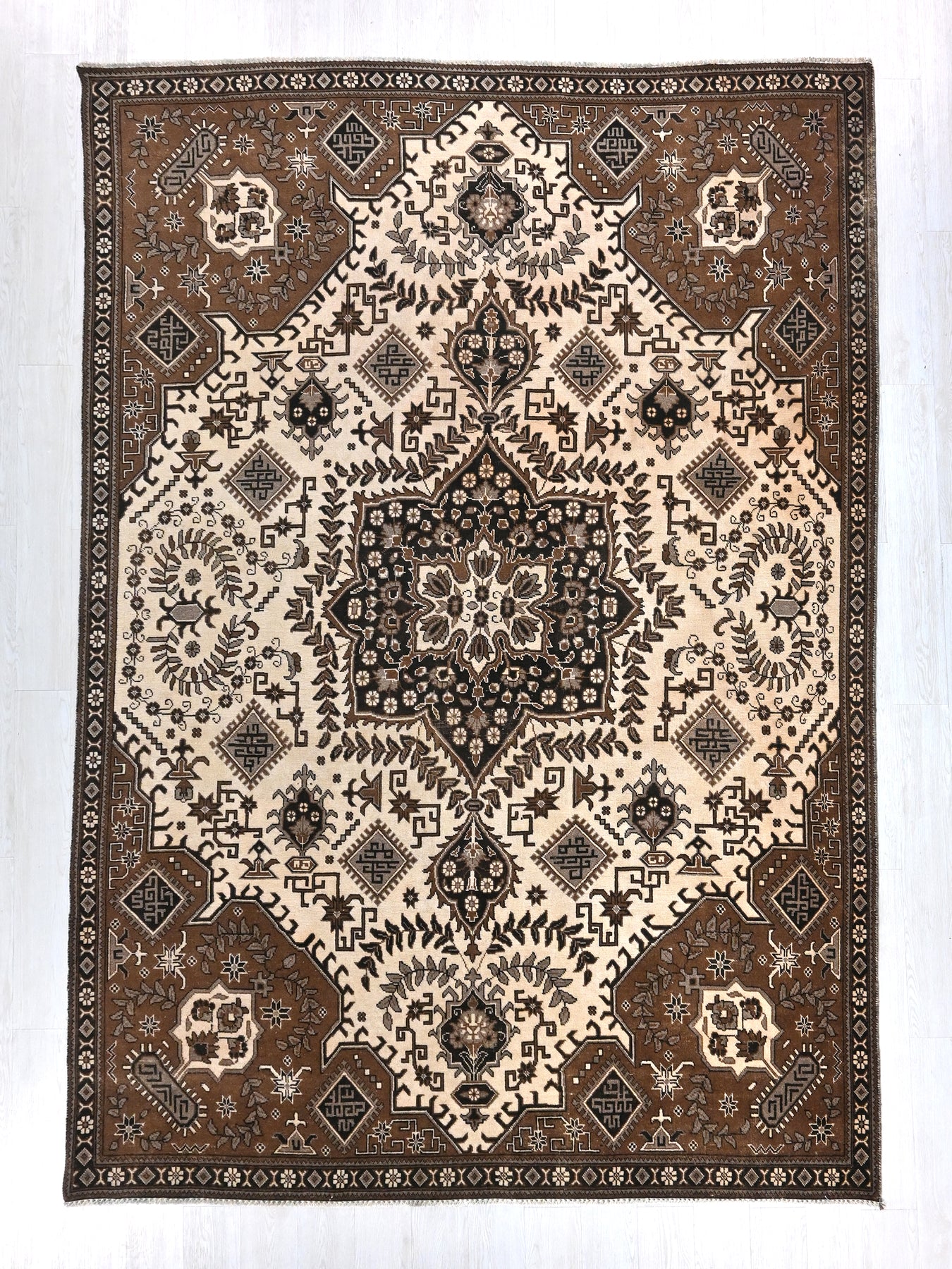 This is a hand-knotted, one-of-a-kind vintage rug. Due to the nature of this piece, there may be slight imperfections in its wear, shape, dimensions, and color. All of our rugs are professionally cleaned and repaired.