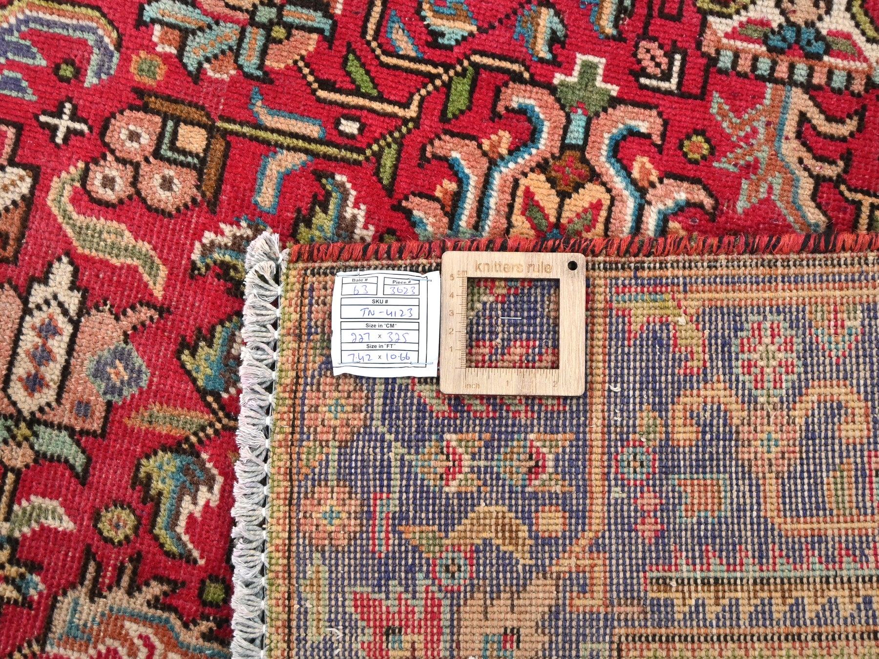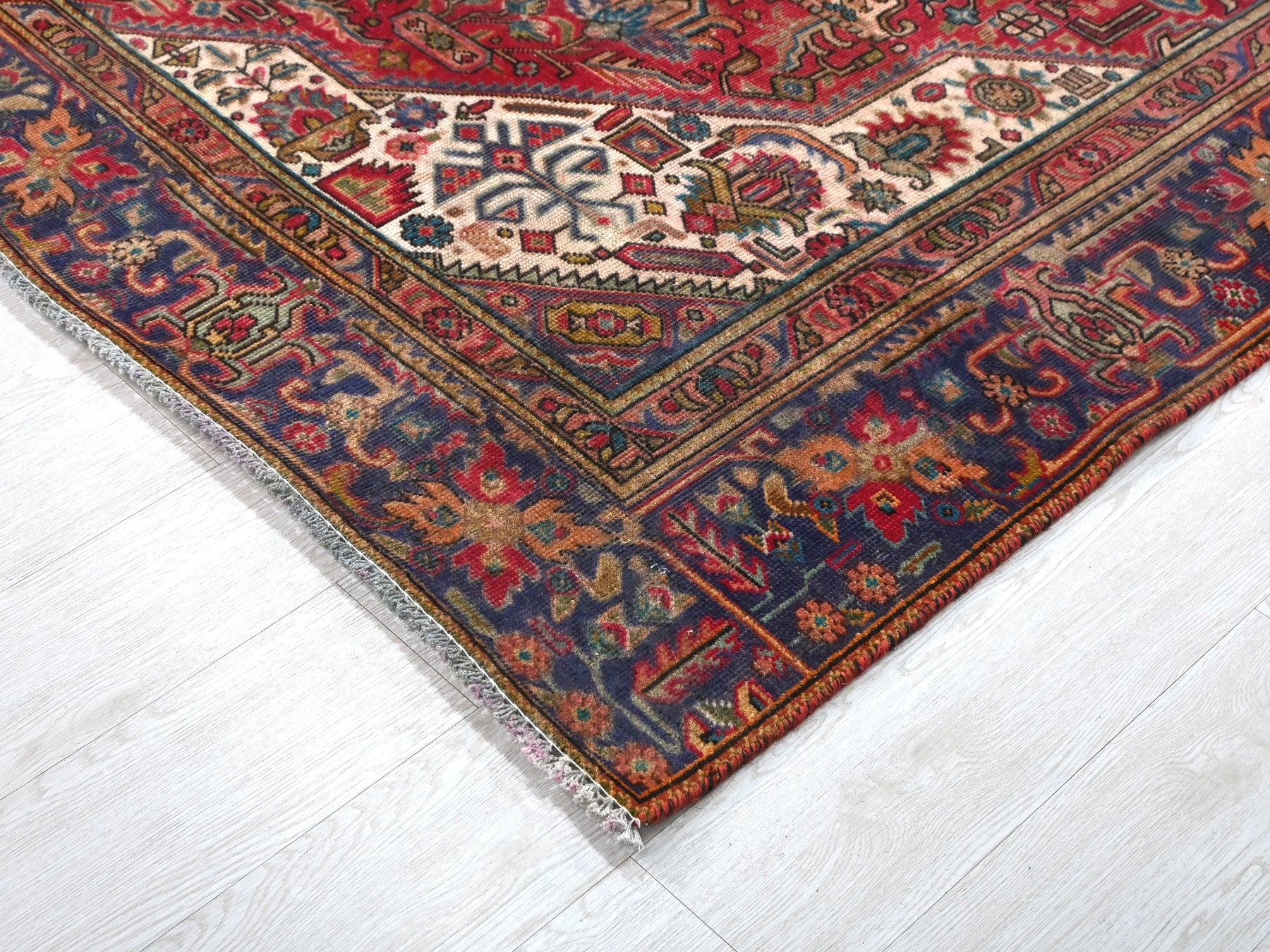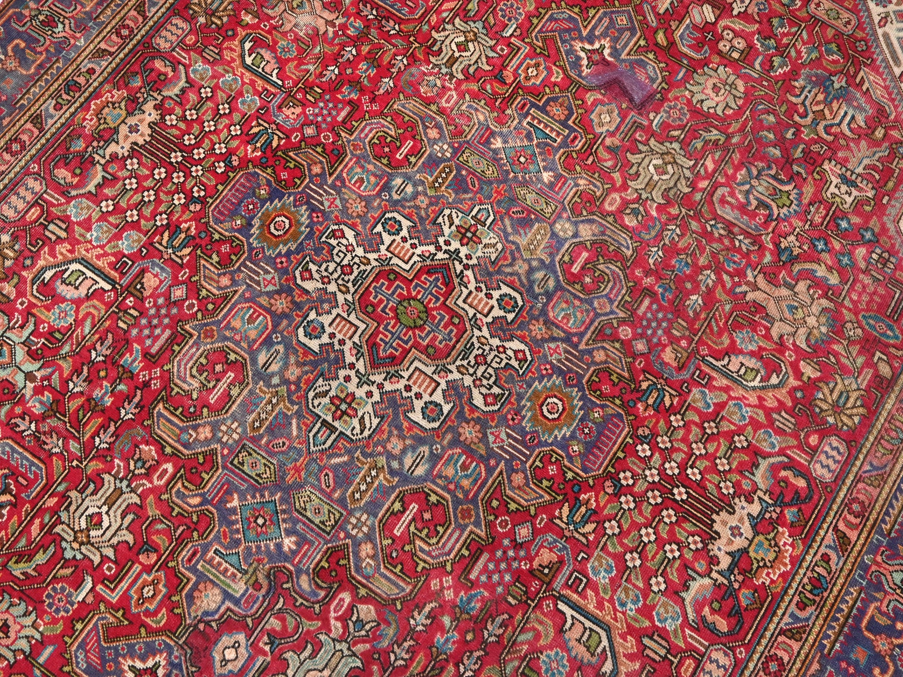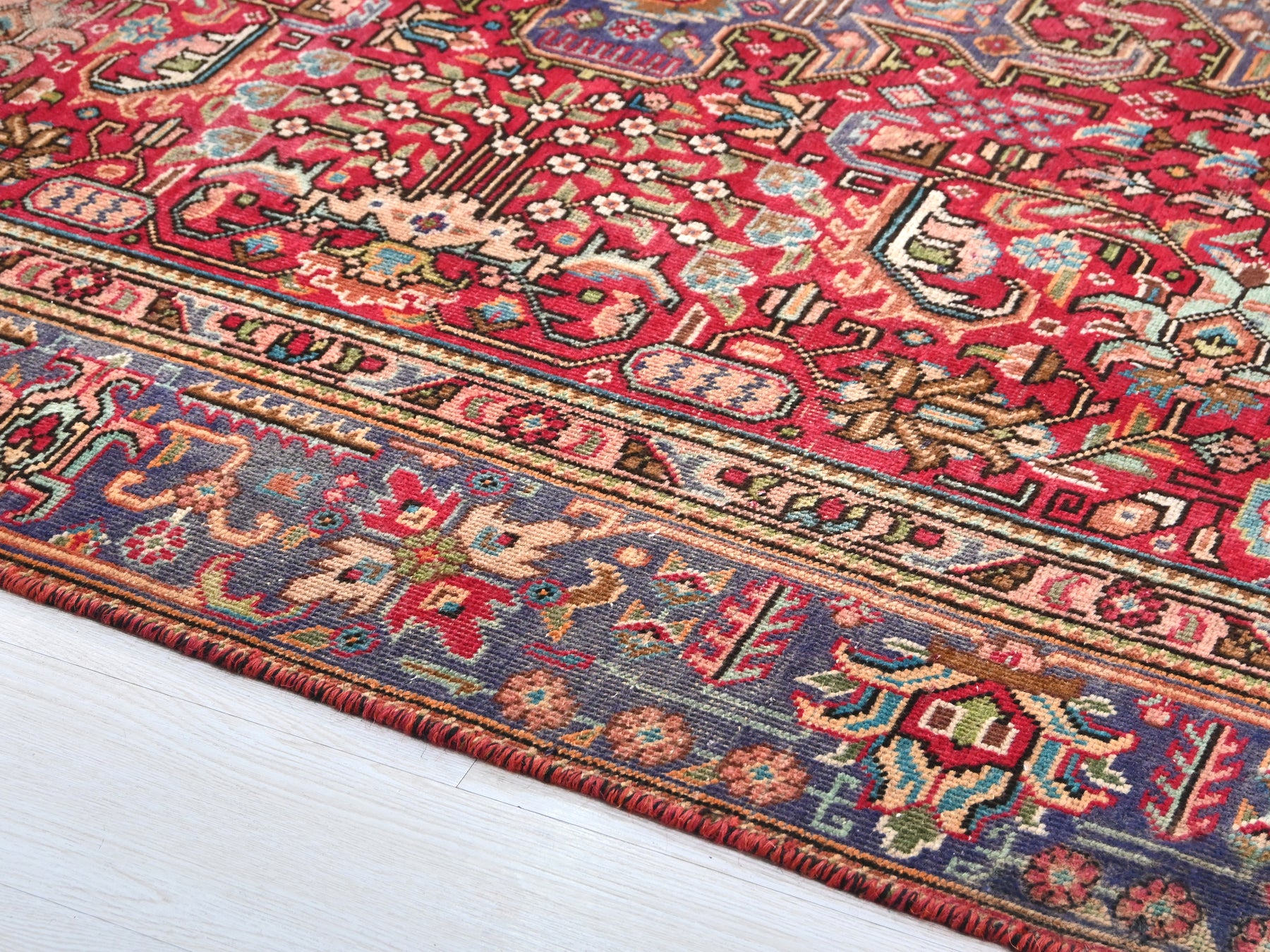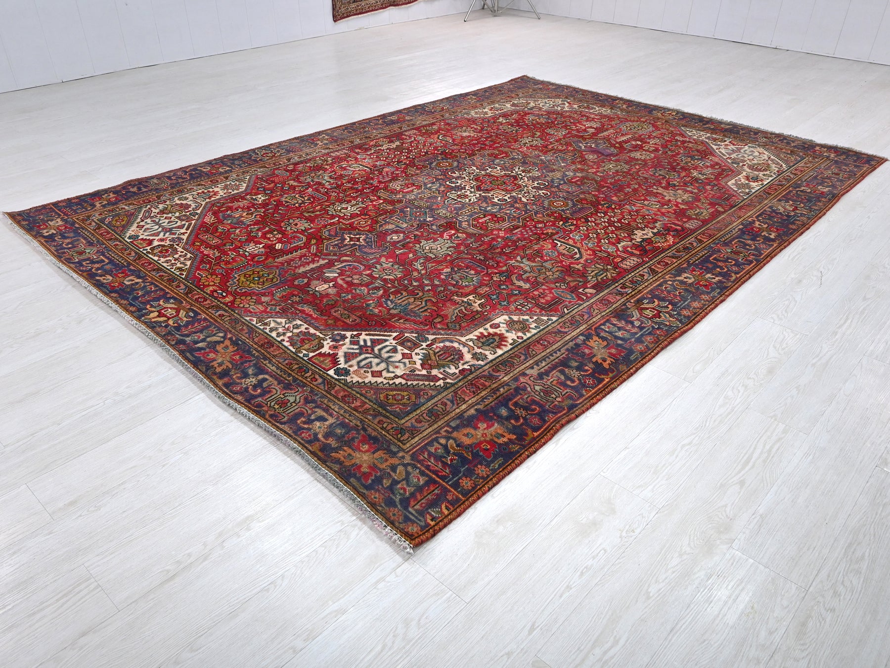 This is a hand-knotted, one-of-a-kind vintage rug. Due to the nature of this piece, there may be slight imperfections in its wear, shape, dimensions, and color. All of our rugs are professionally cleaned and repaired.
