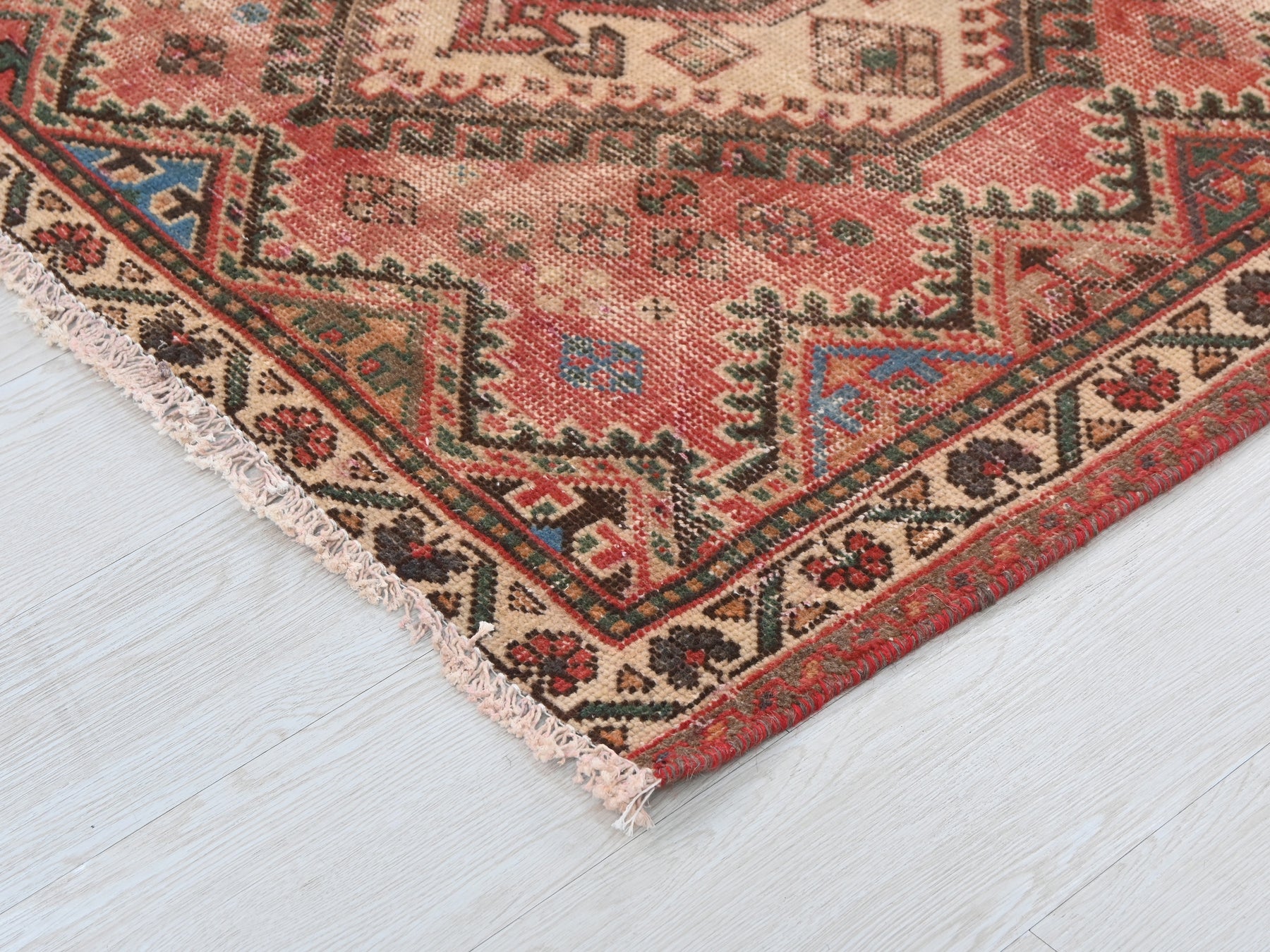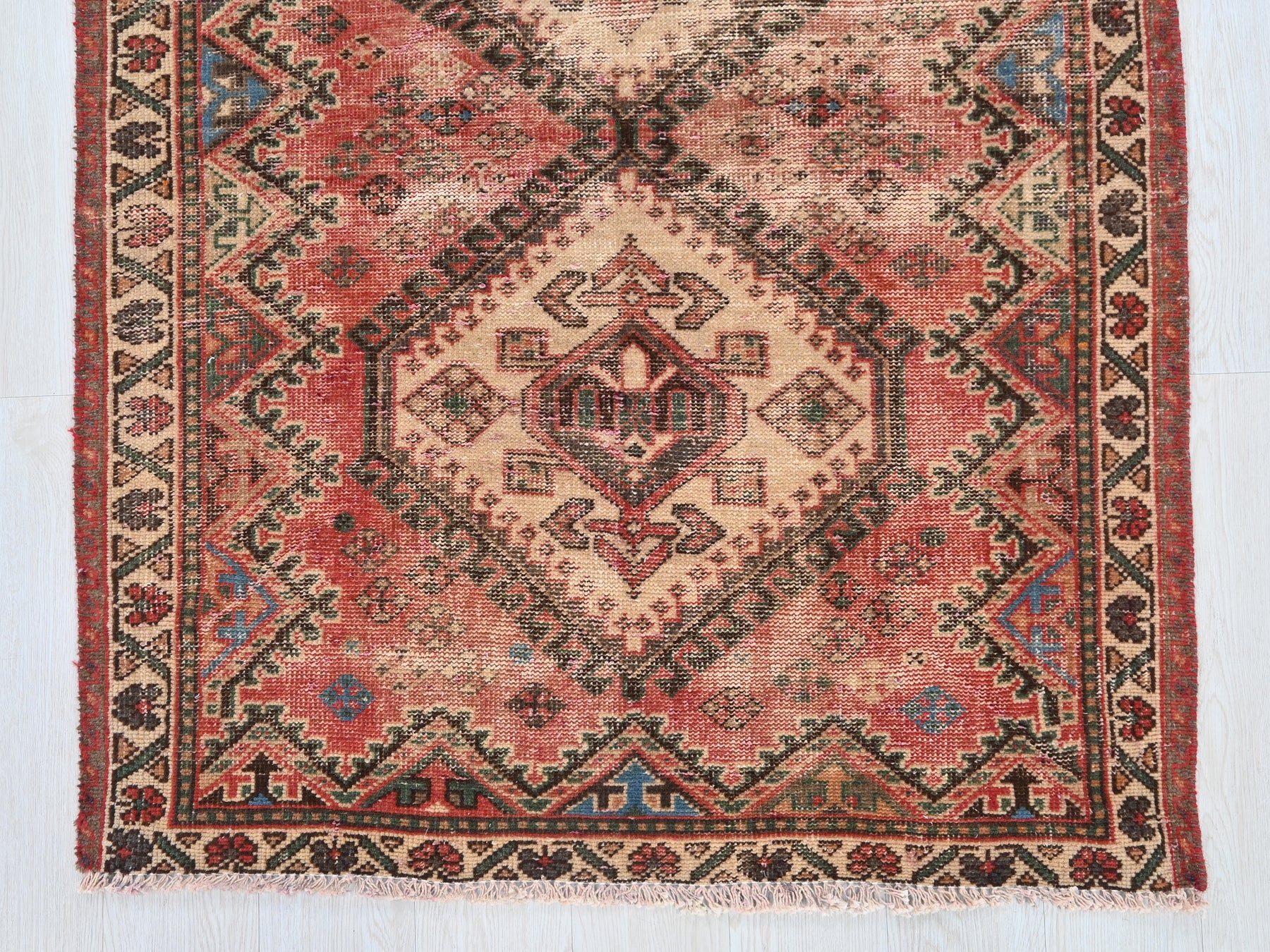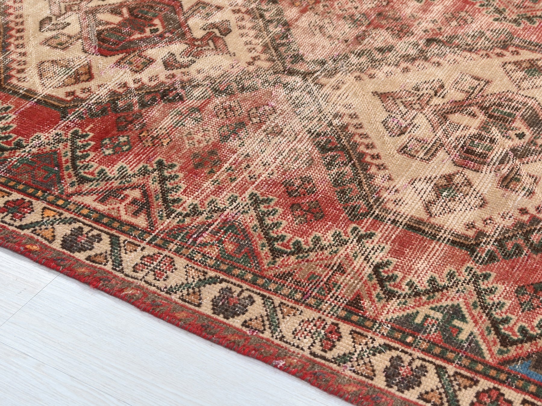This is a hand-knotted, one-of-a-kind vintage rug. Due to the nature of this piece, there may be slight imperfections in its wear, shape, dimensions, and color. All of our rugs are professionally cleaned and repaired.