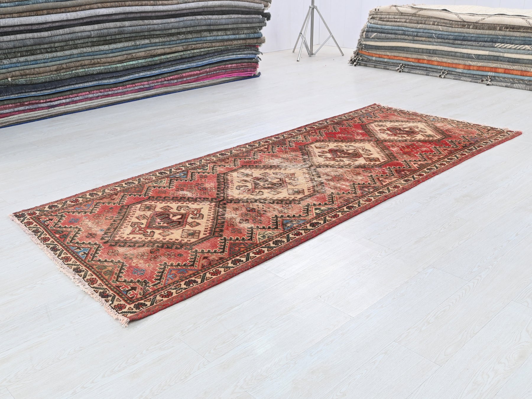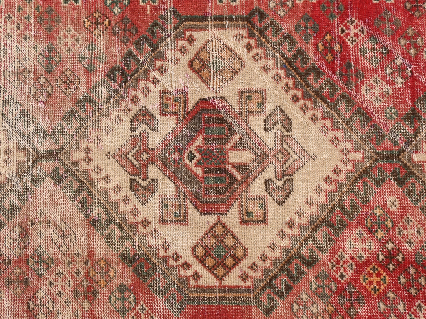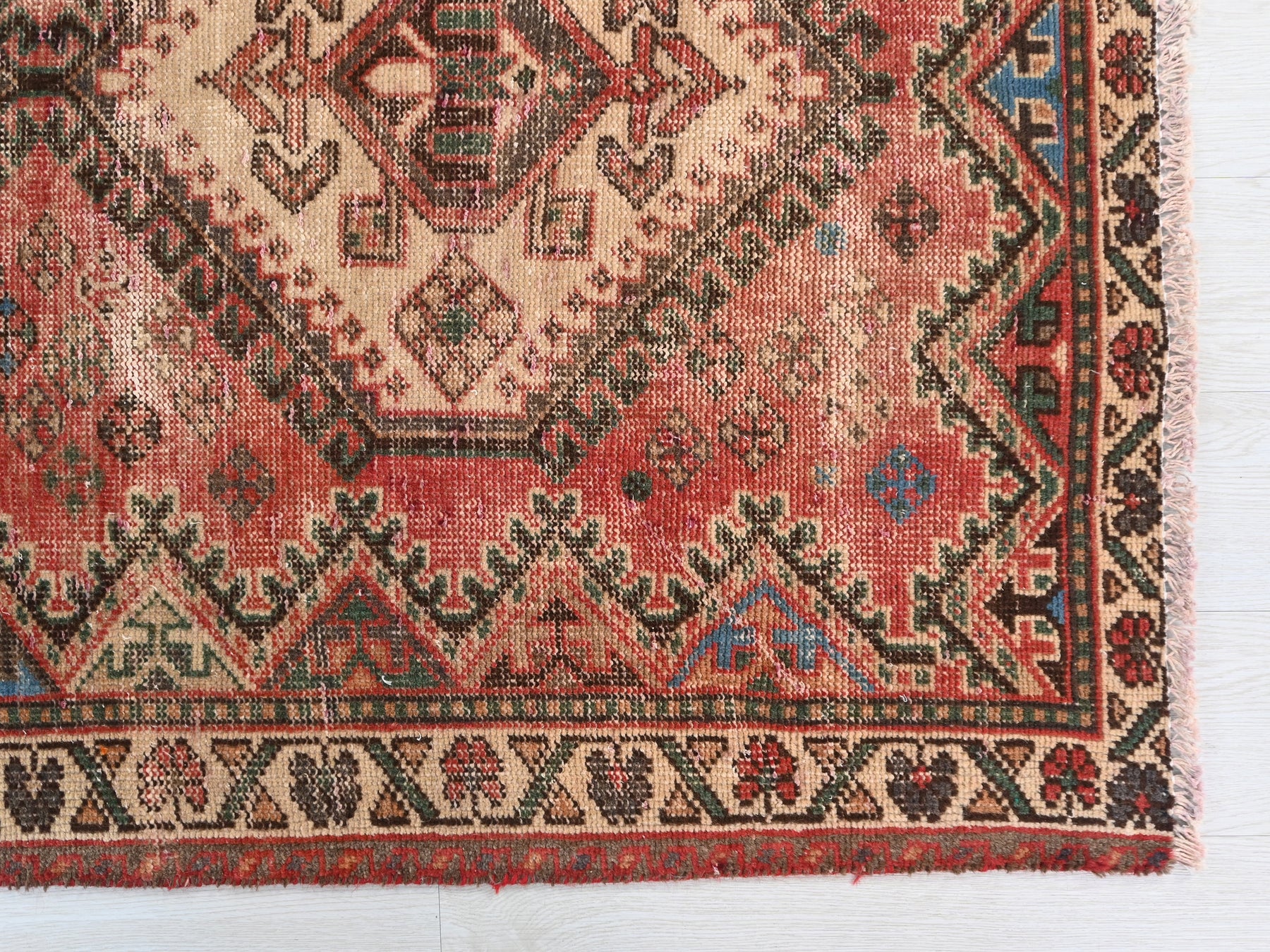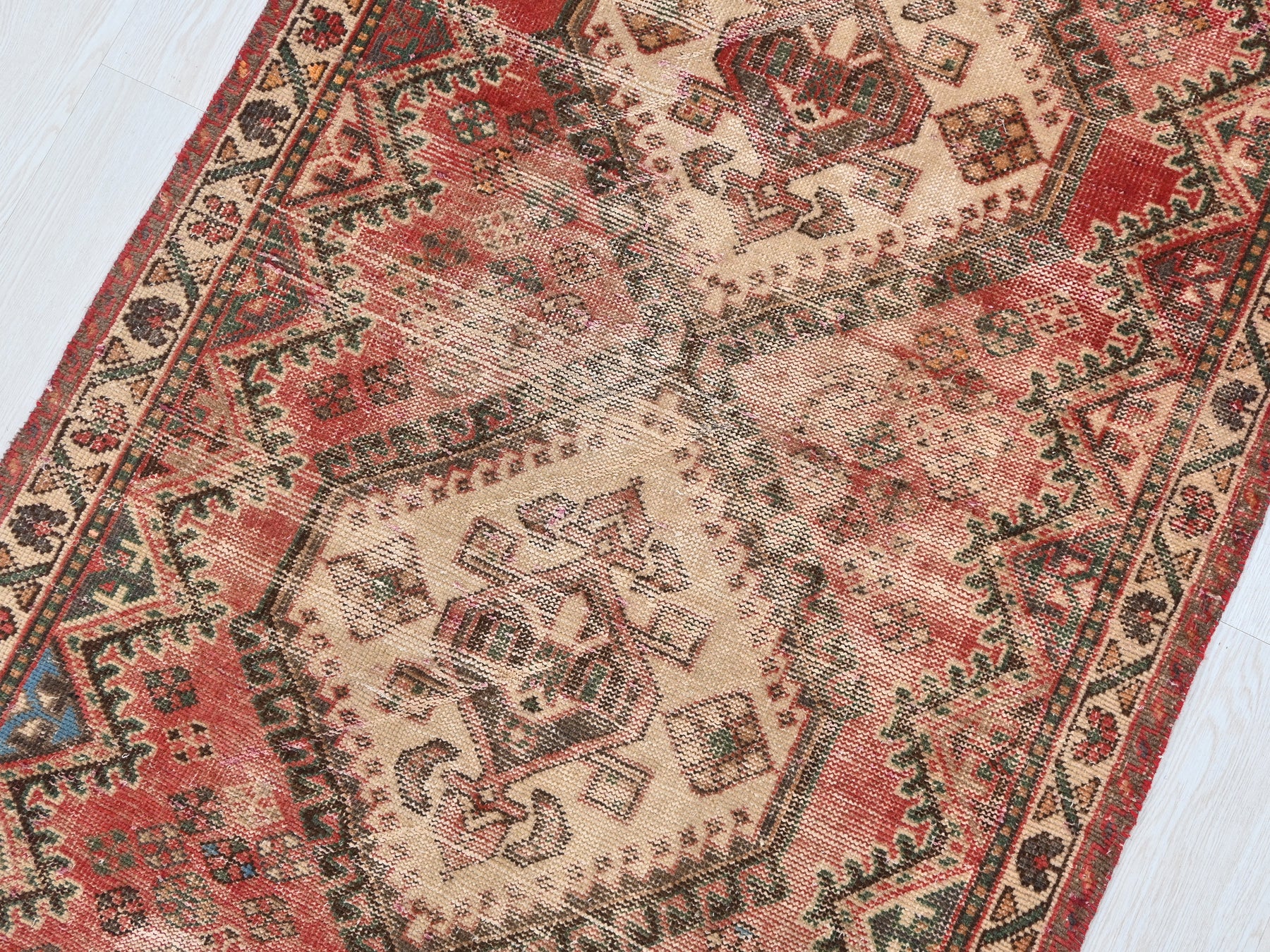 This is a hand-knotted, one-of-a-kind vintage rug. Due to the nature of this piece, there may be slight imperfections in its wear, shape, dimensions, and color. All of our rugs are professionally cleaned and repaired.