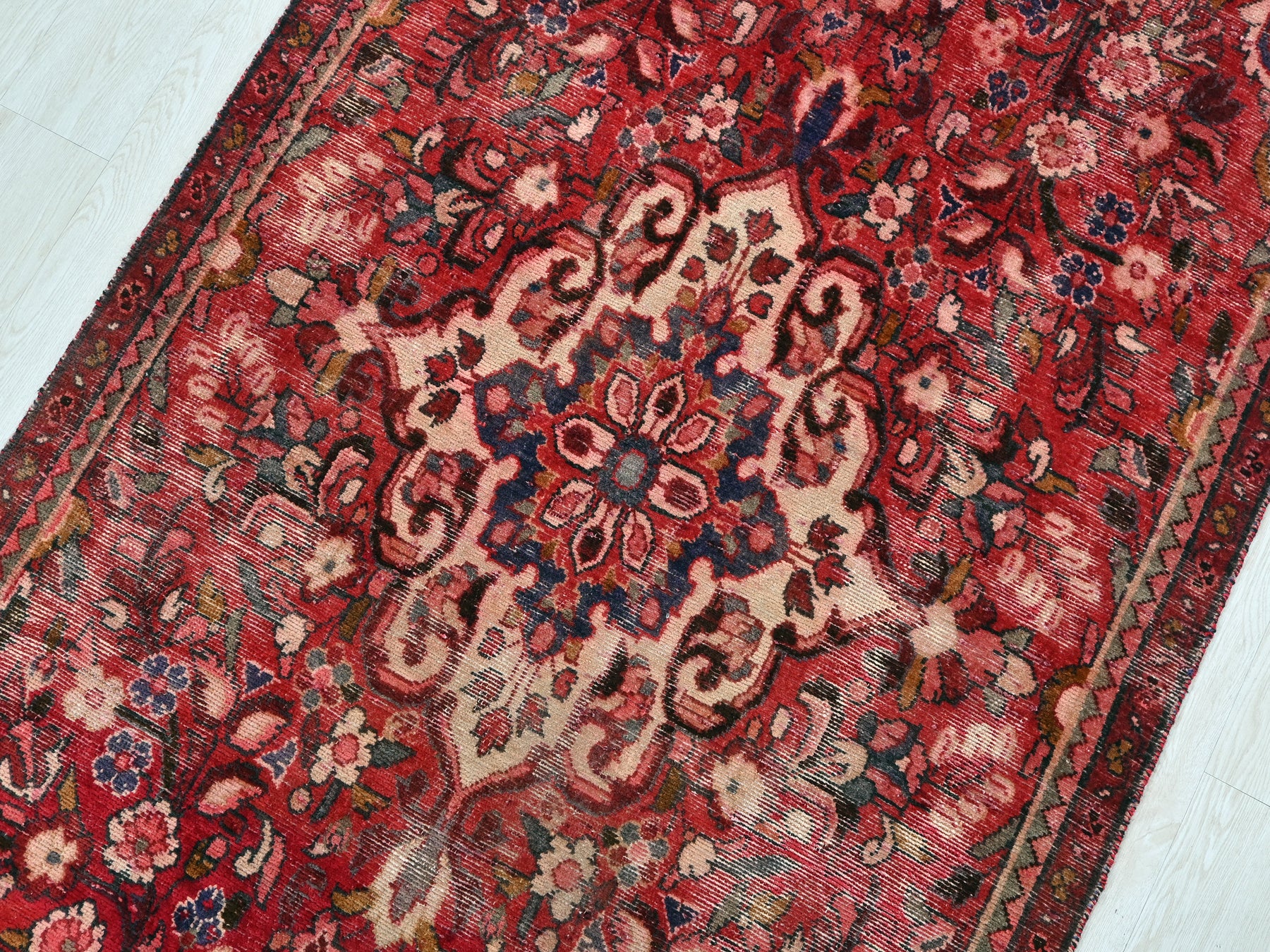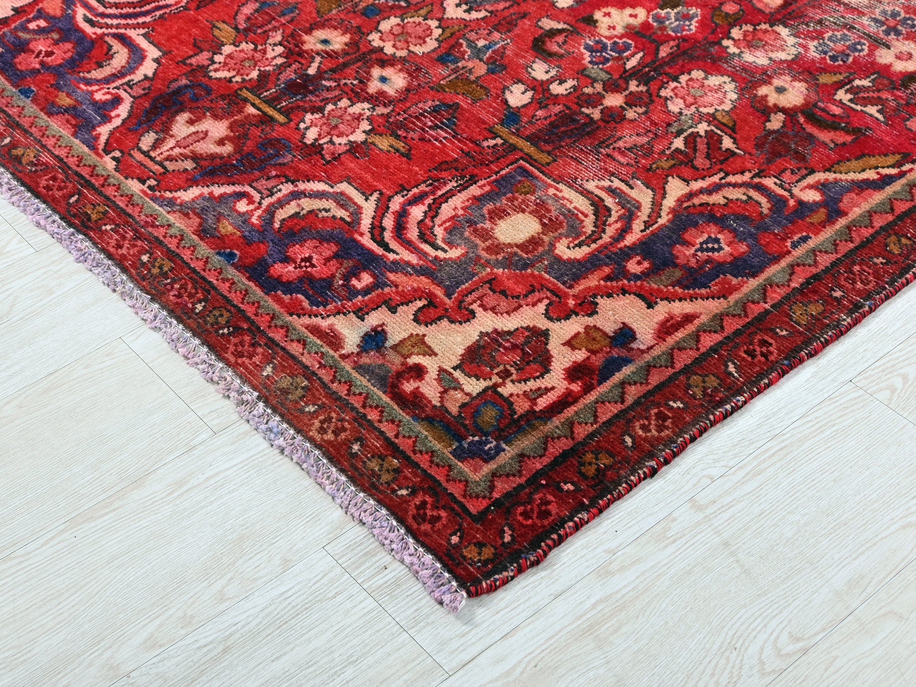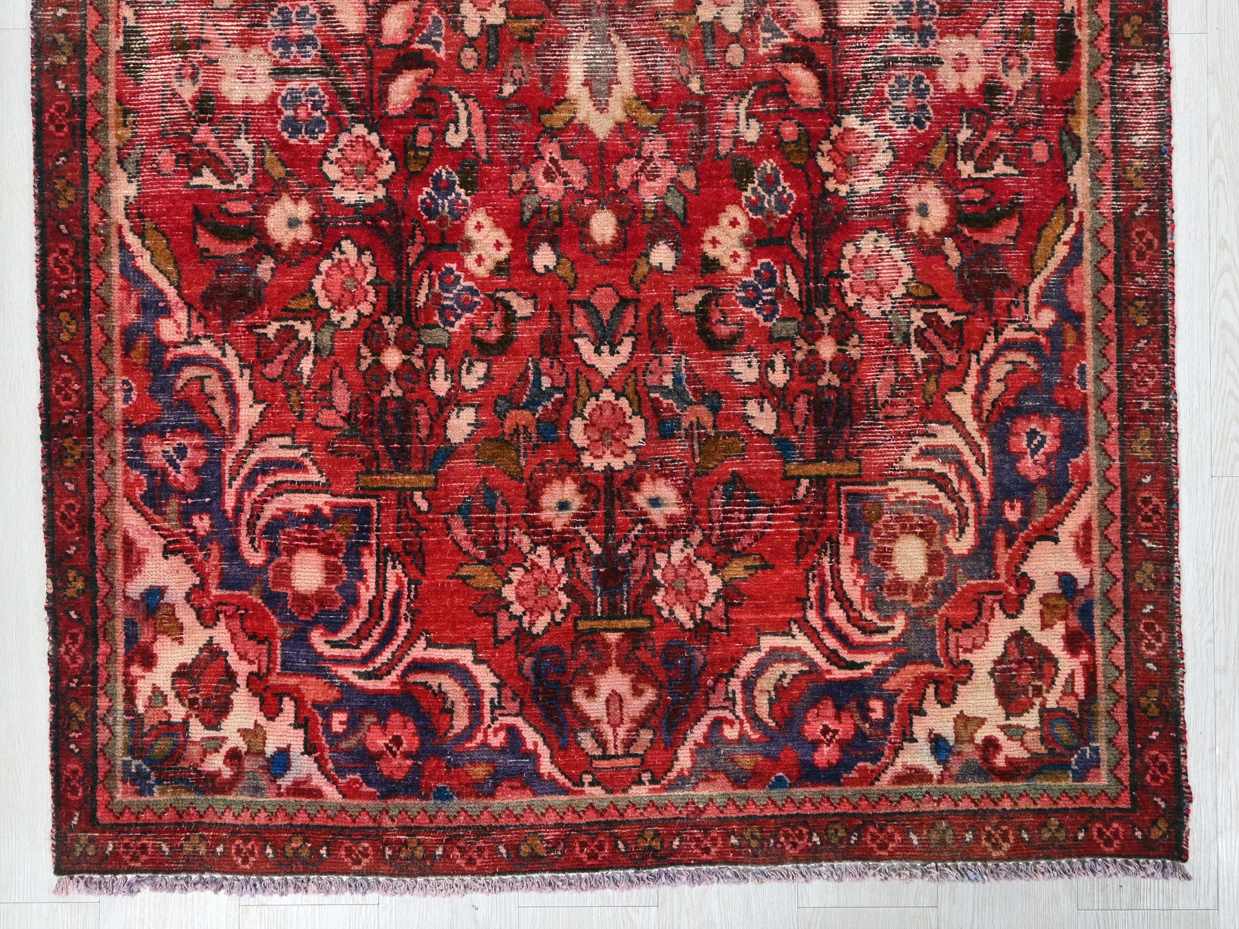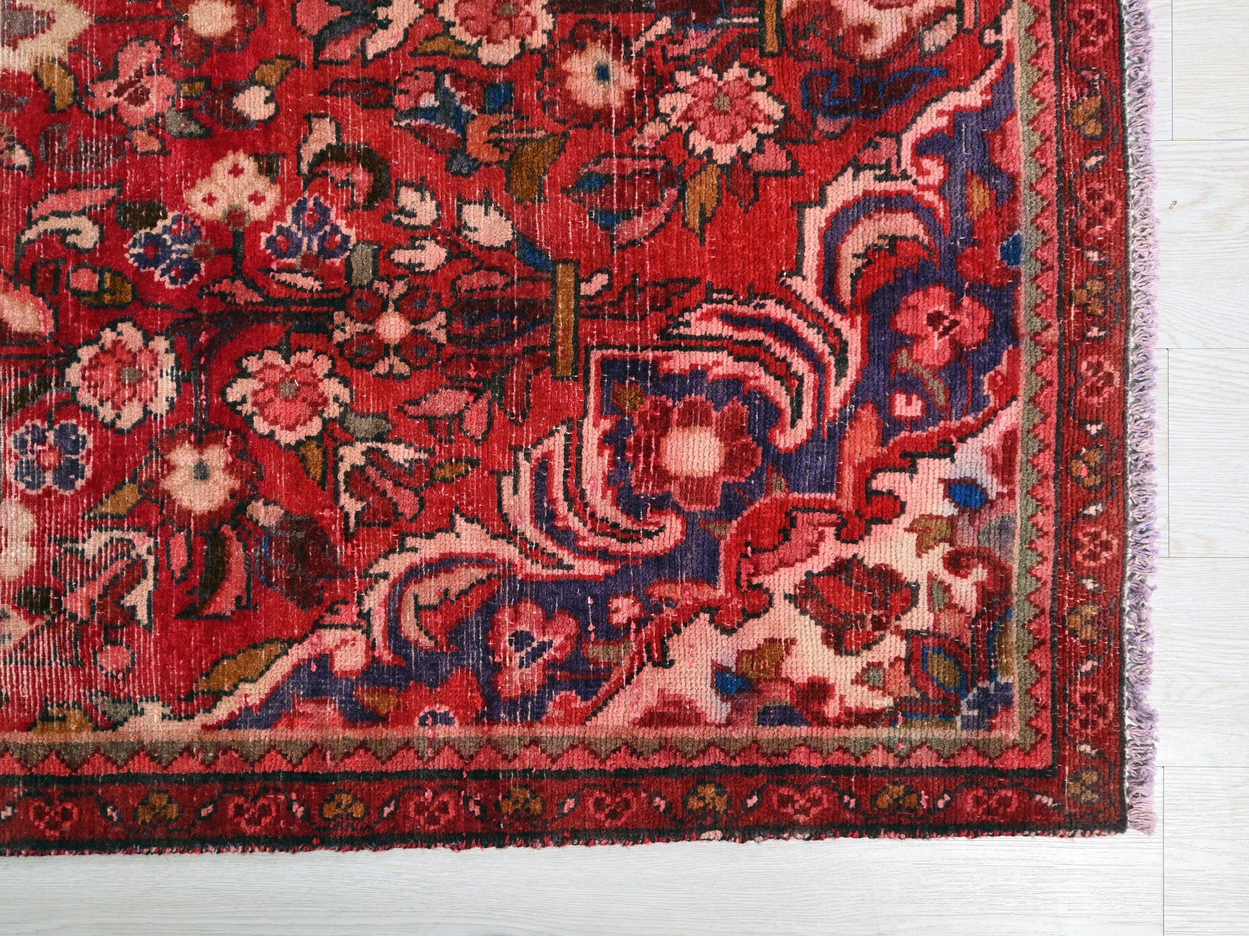 This is a hand-knotted, one-of-a-kind vintage rug. Due to the nature of this piece, there may be slight imperfections in its wear, shape, dimensions, and color. All of our rugs are professionally cleaned and repaired.