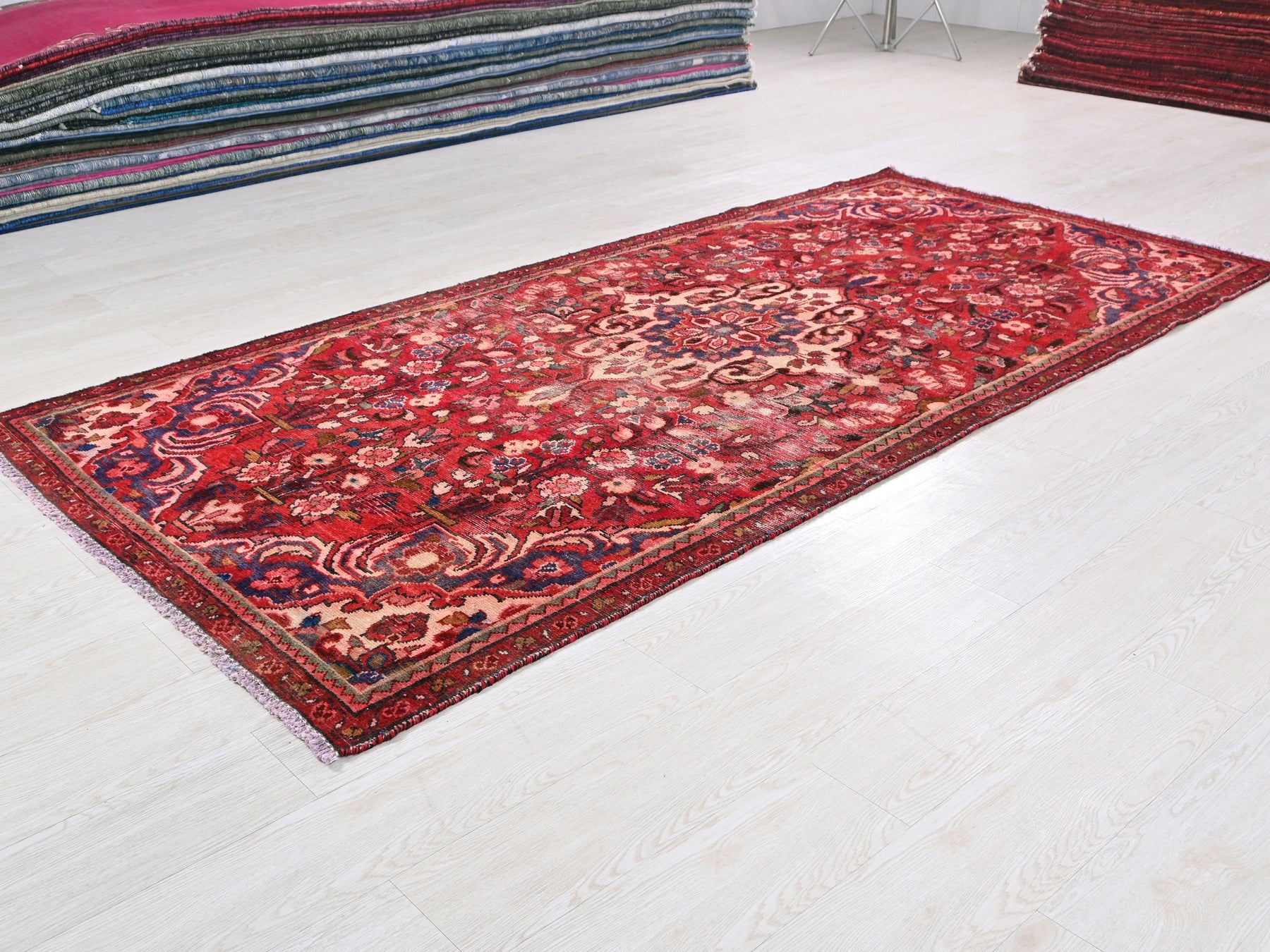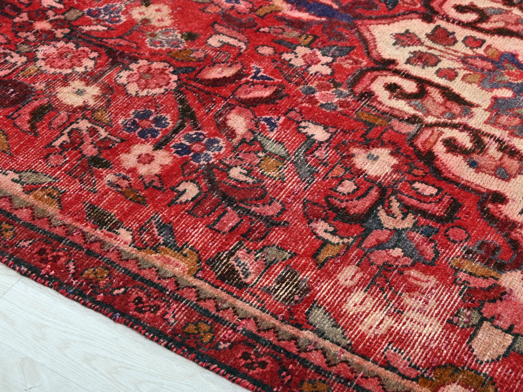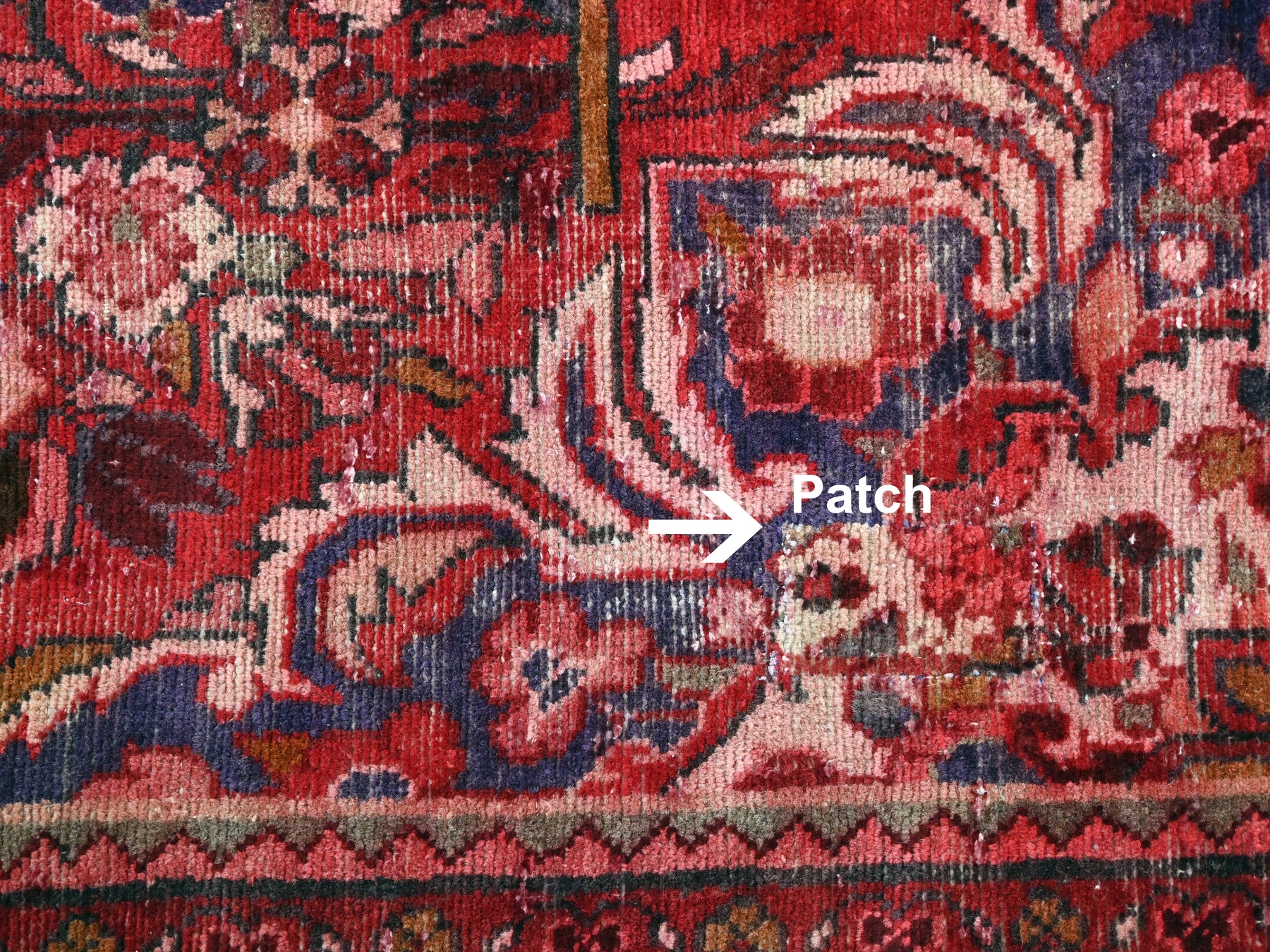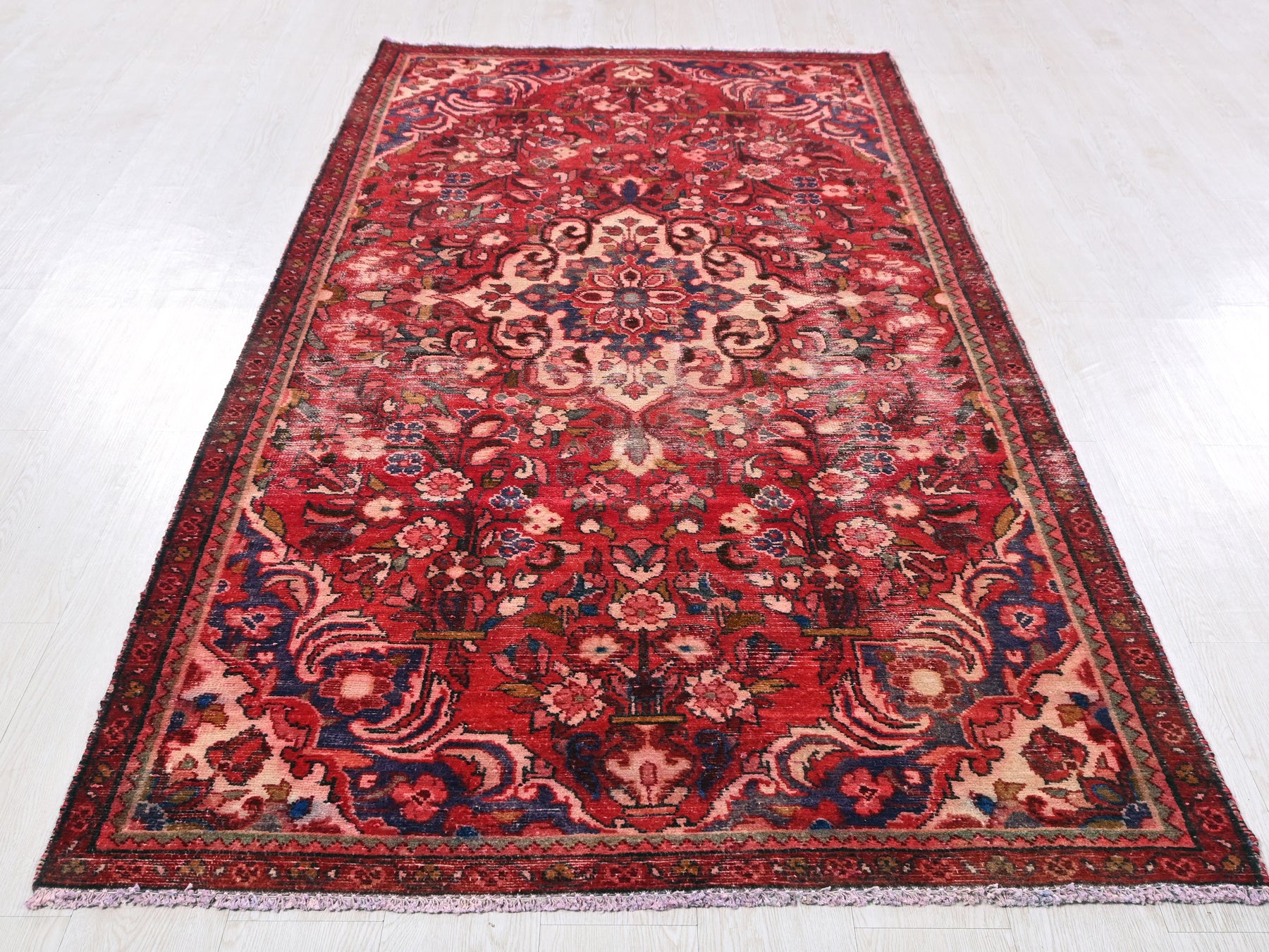 This is a hand-knotted, one-of-a-kind vintage rug. Due to the nature of this piece, there may be slight imperfections in its wear, shape, dimensions, and color. All of our rugs are professionally cleaned and repaired.