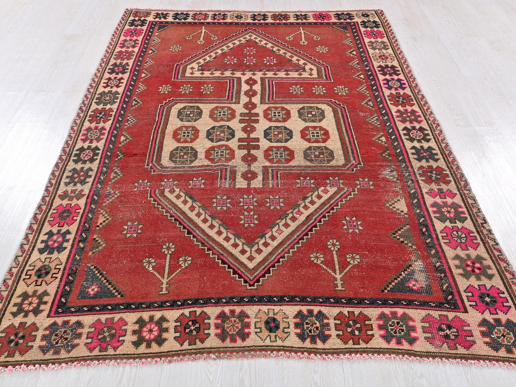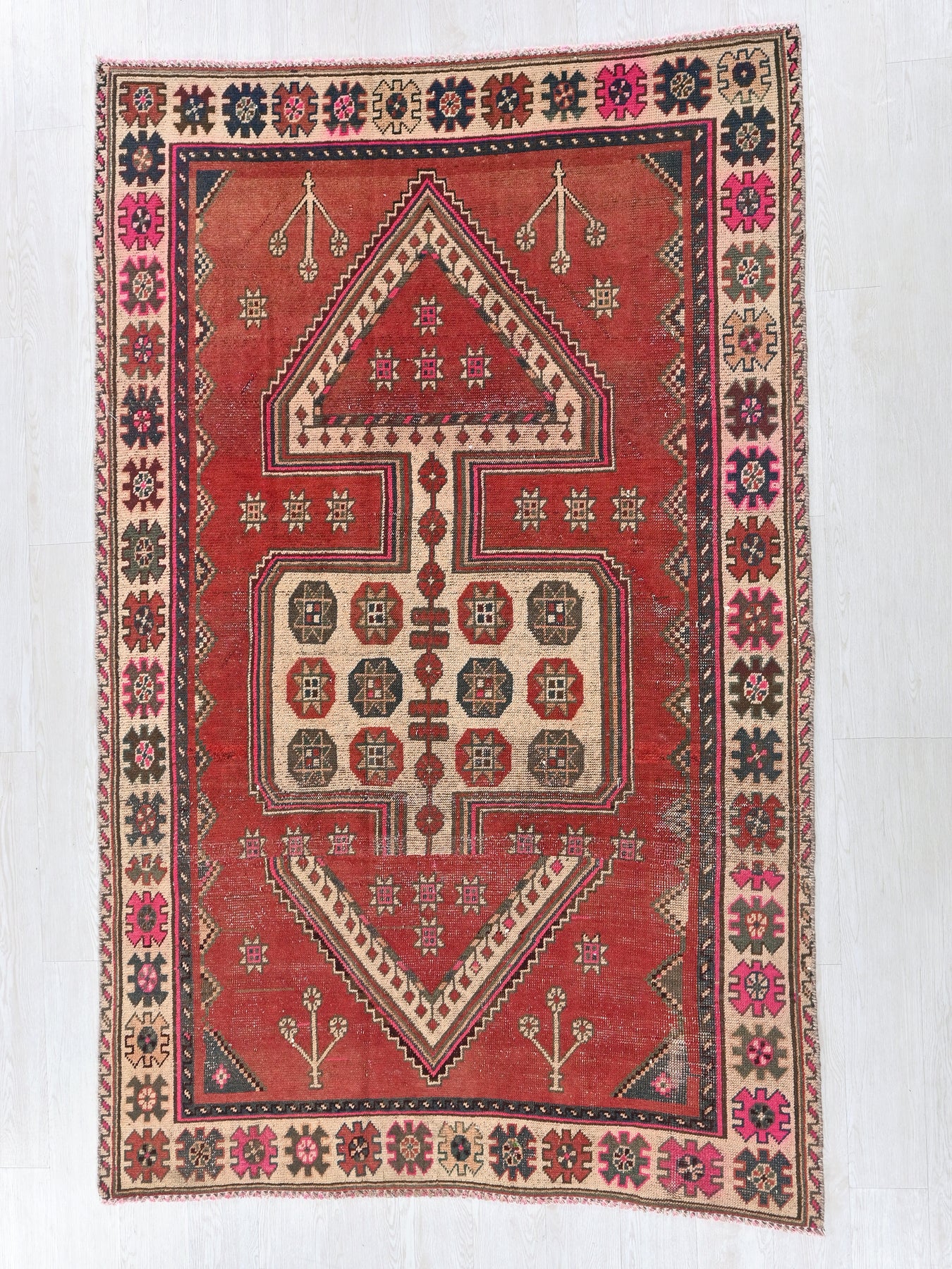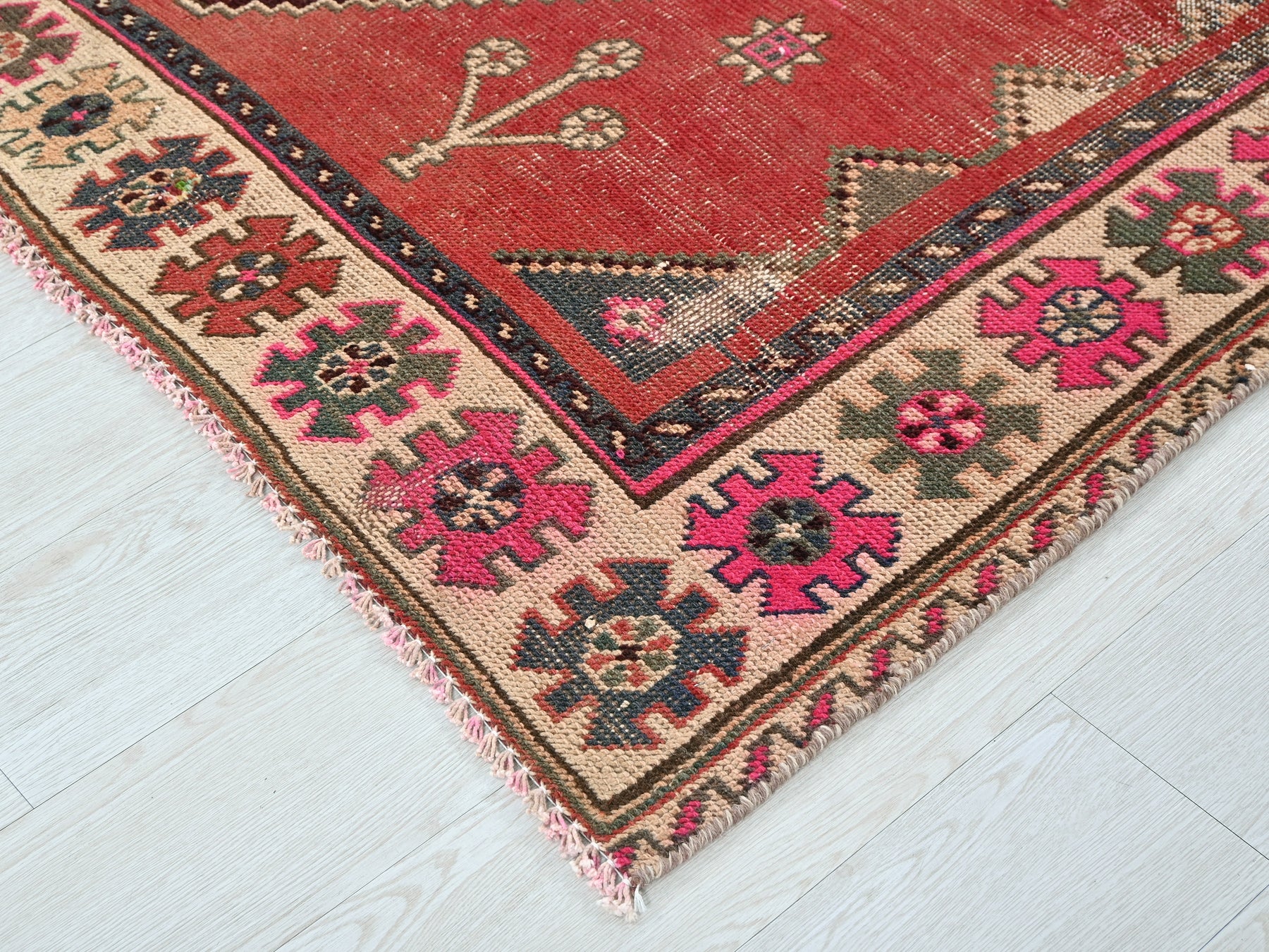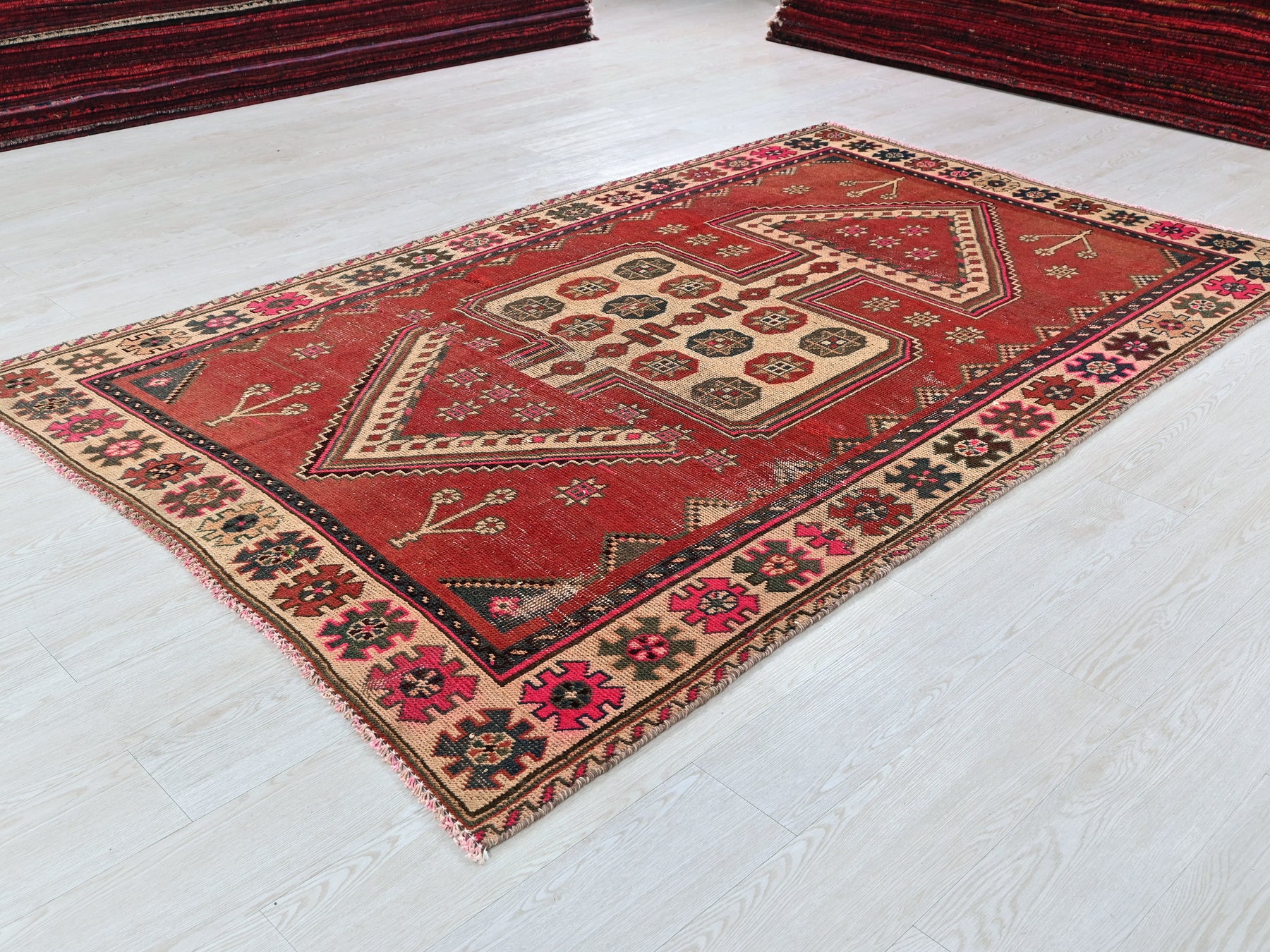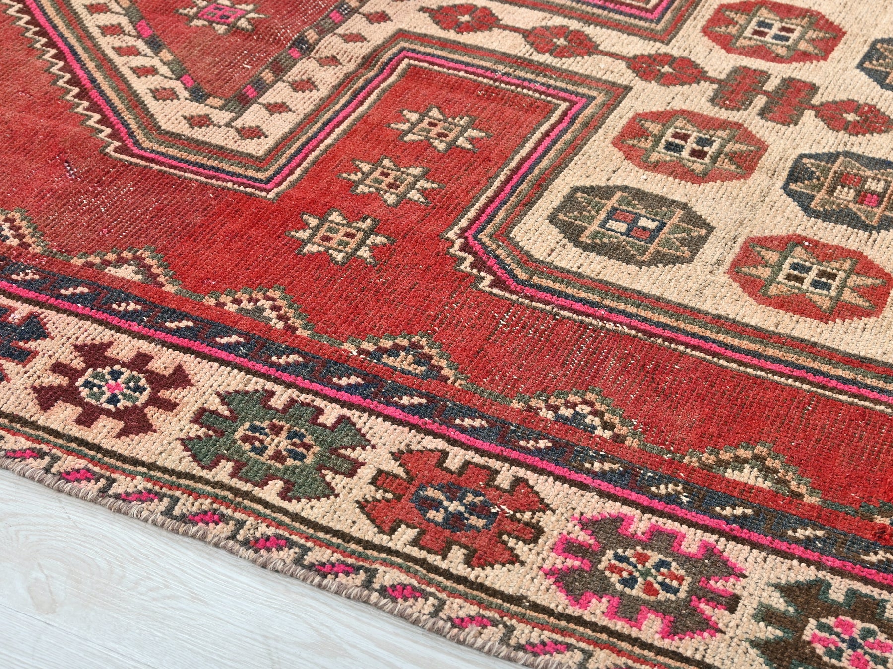 This is a hand-knotted, one-of-a-kind vintage rug. Due to the nature of this piece, there may be slight imperfections in its wear, shape, dimensions, and color. All of our rugs are professionally cleaned and repaired.