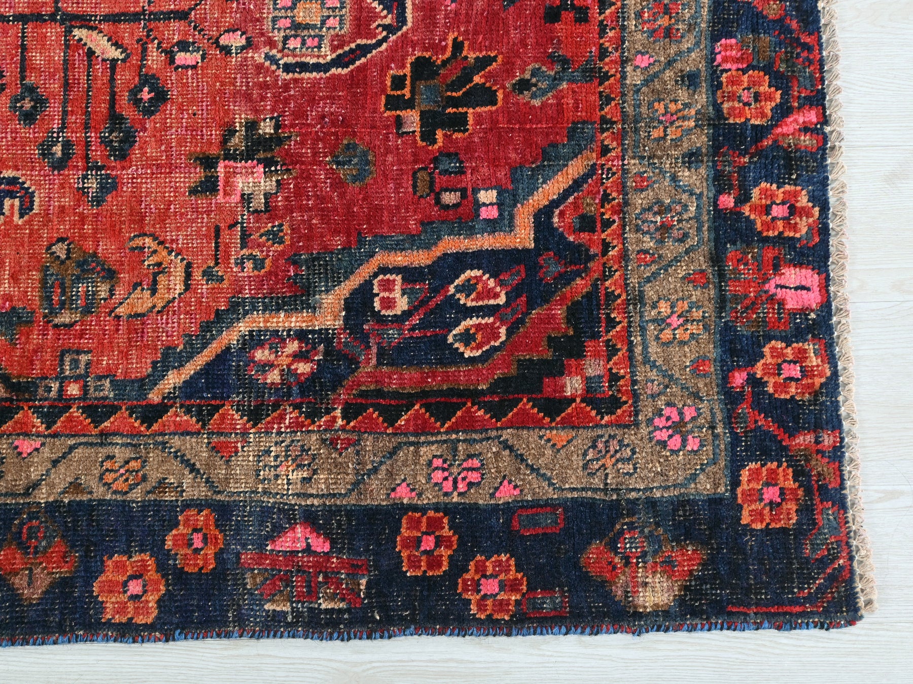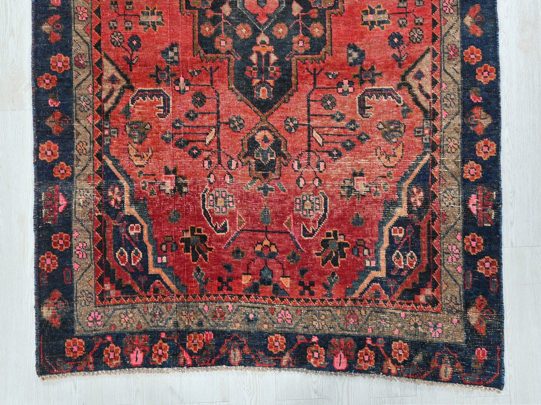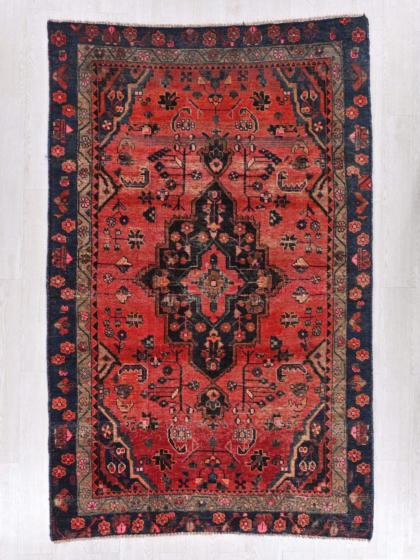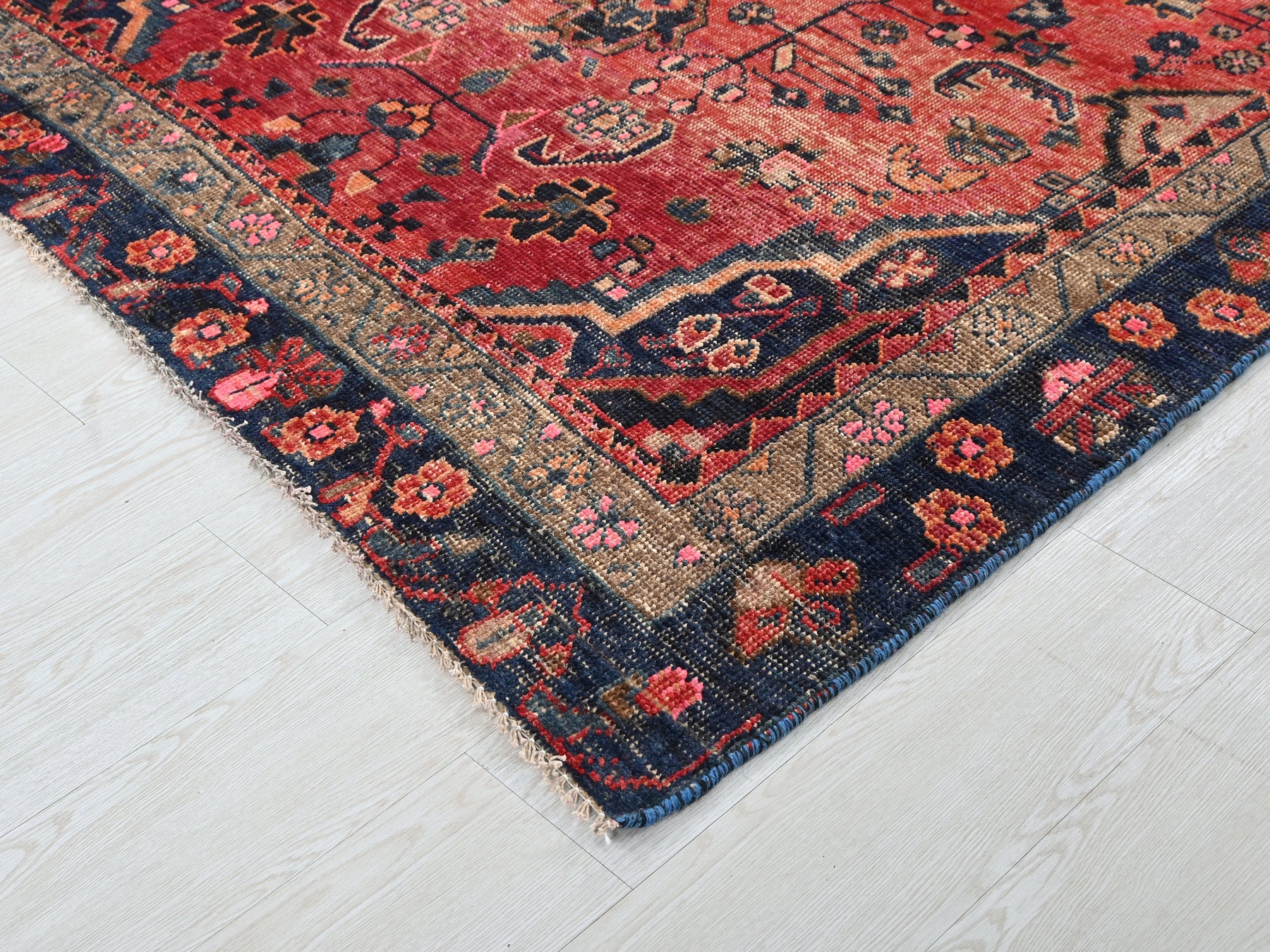 This is a hand-knotted, one-of-a-kind vintage rug. Due to the nature of this piece, there may be slight imperfections in its wear, shape, dimensions, and color. All of our rugs are professionally cleaned and repaired.