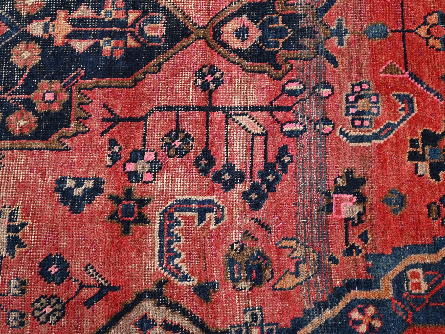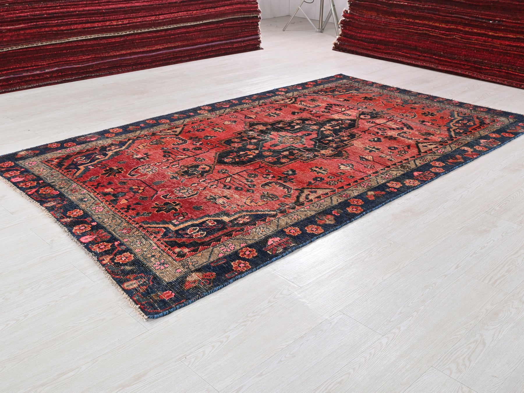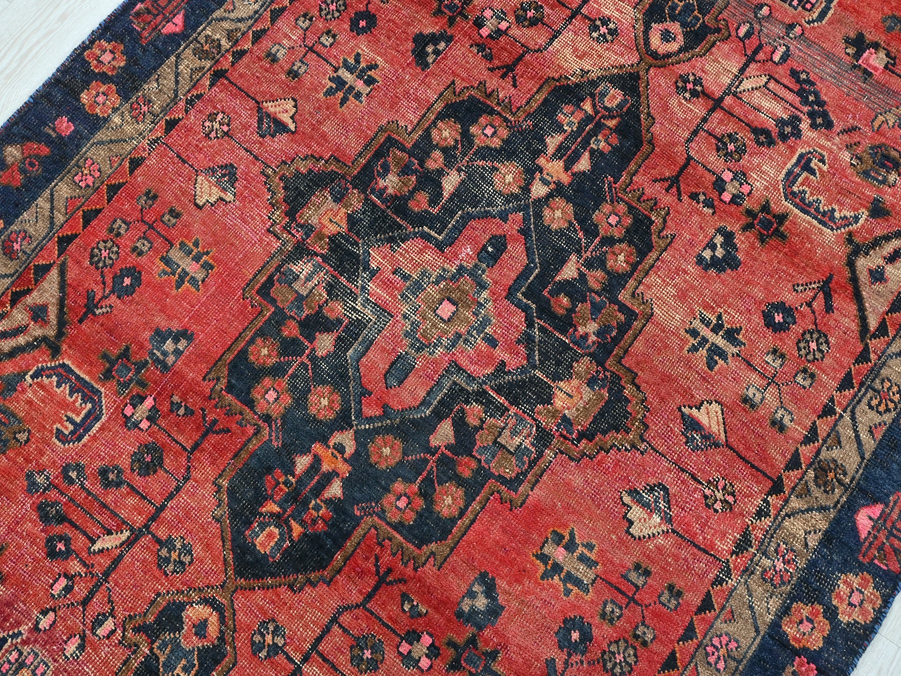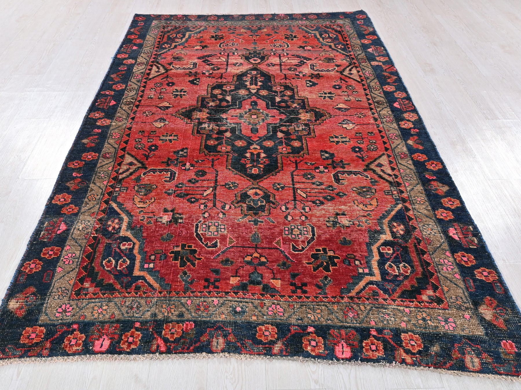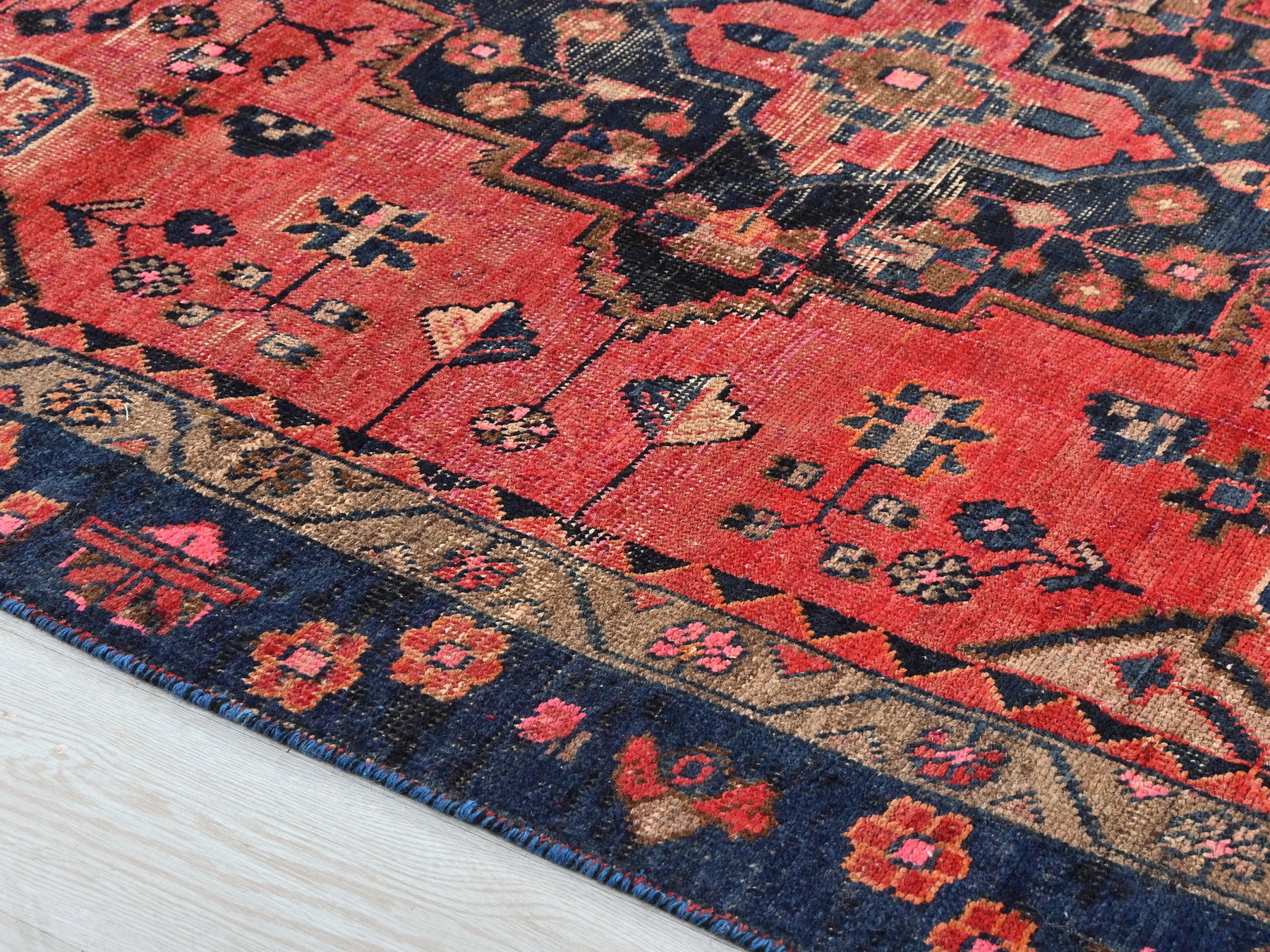 This is a hand-knotted, one-of-a-kind vintage rug. Due to the nature of this piece, there may be slight imperfections in its wear, shape, dimensions, and color. All of our rugs are professionally cleaned and repaired.