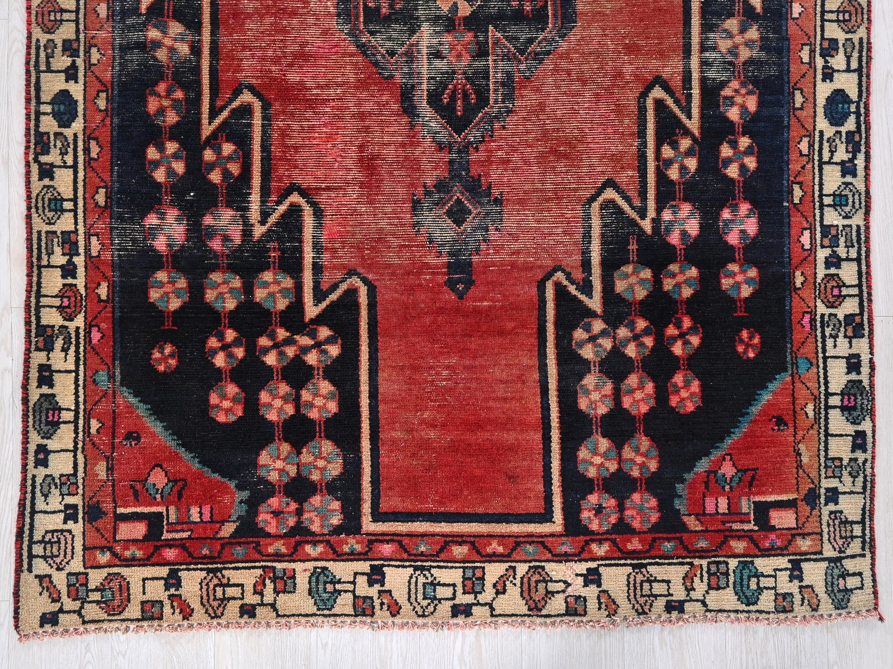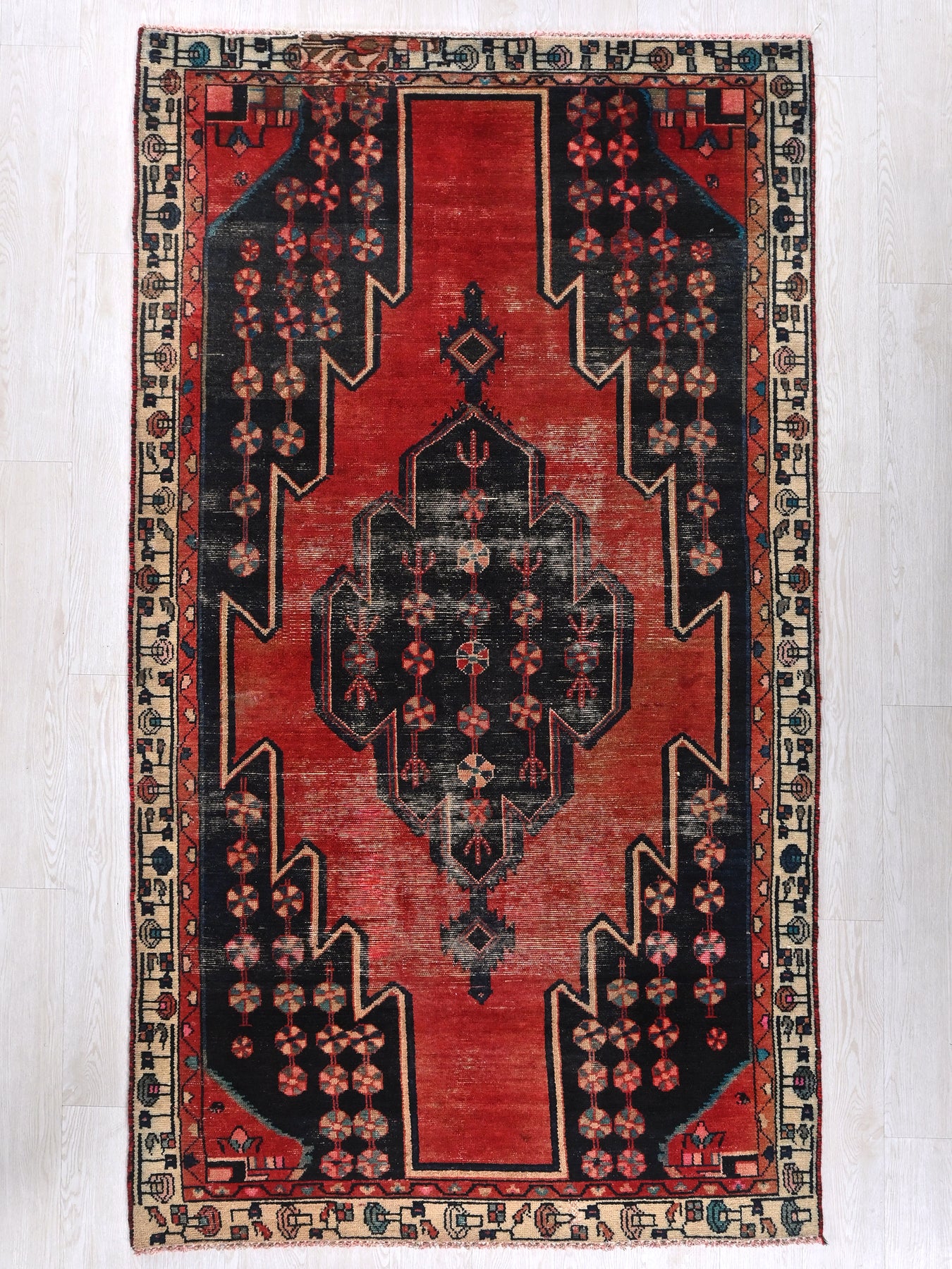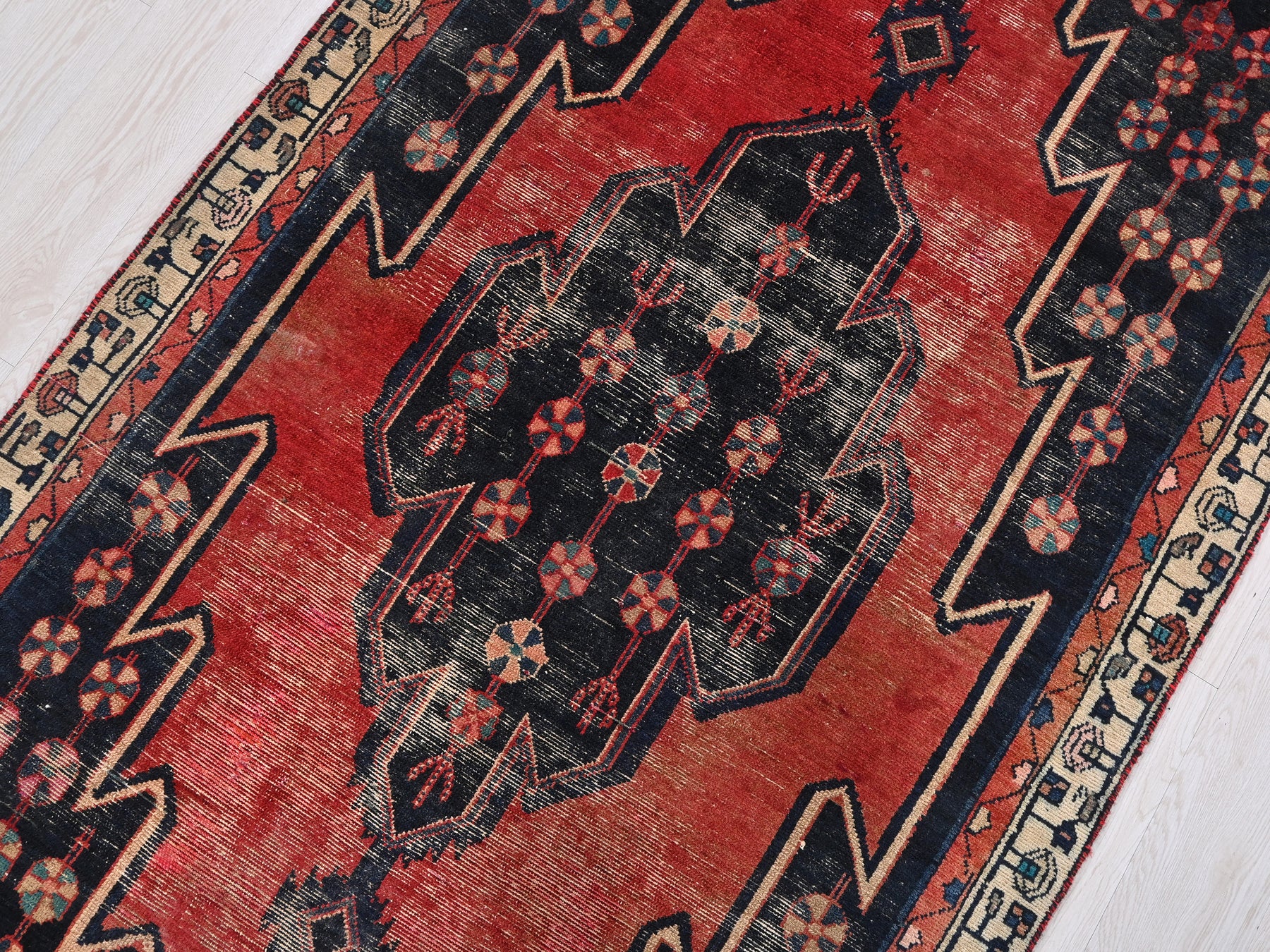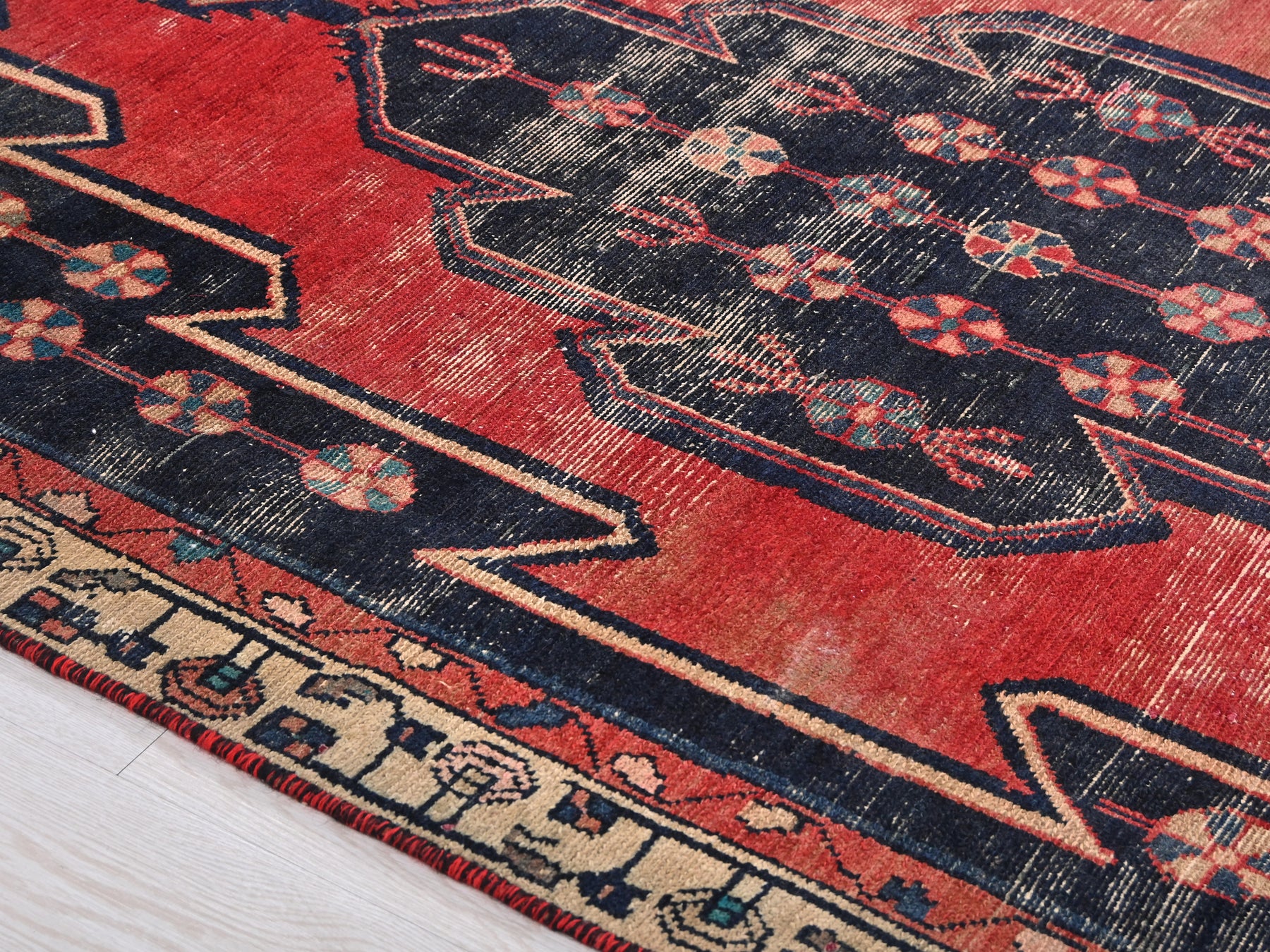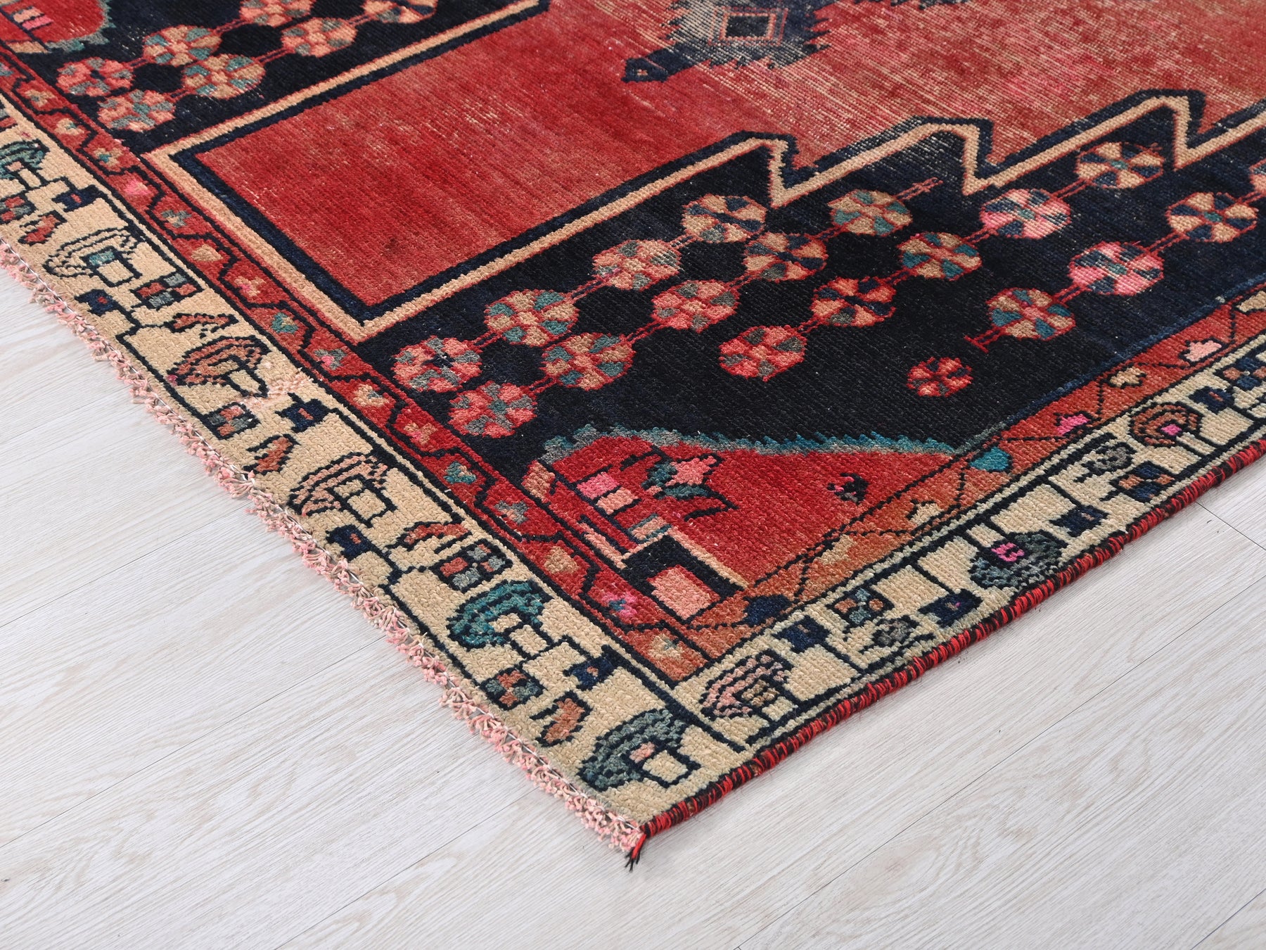 This is a hand-knotted, one-of-a-kind vintage rug. Due to the nature of this piece, there may be slight imperfections in its wear, shape, dimensions, and color. All of our rugs are professionally cleaned and repaired.