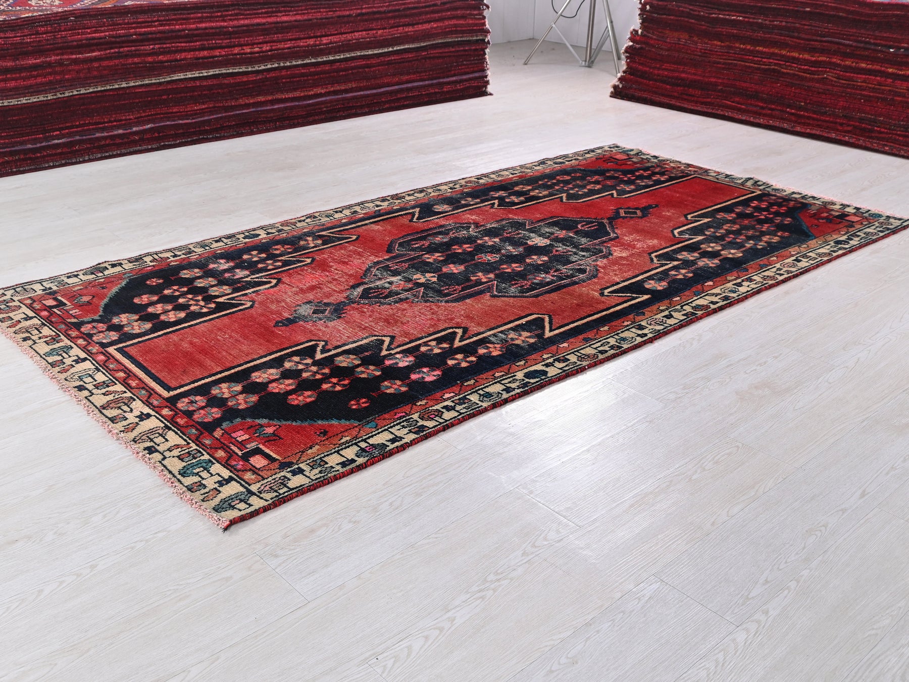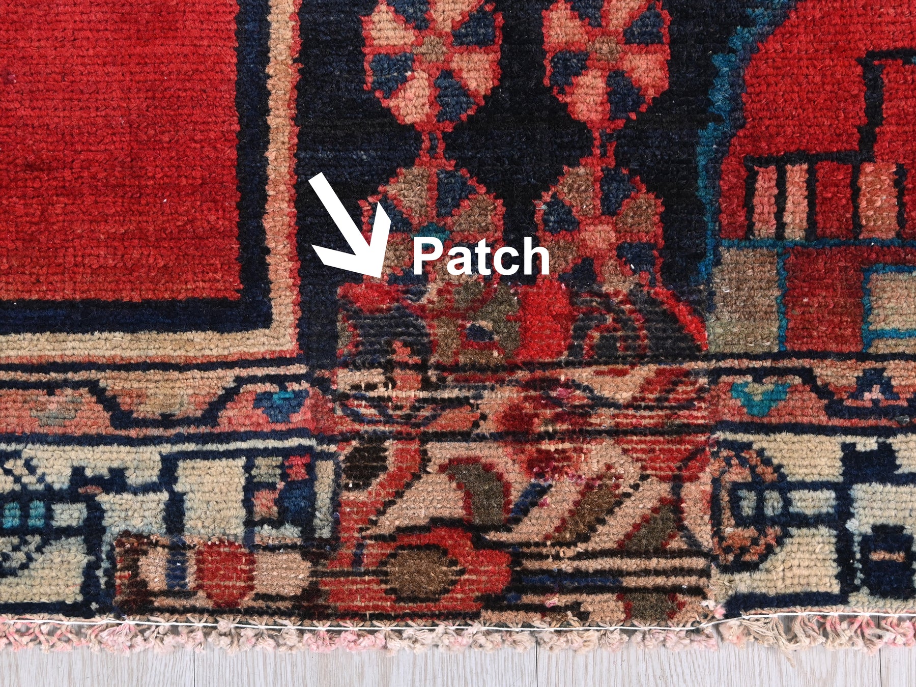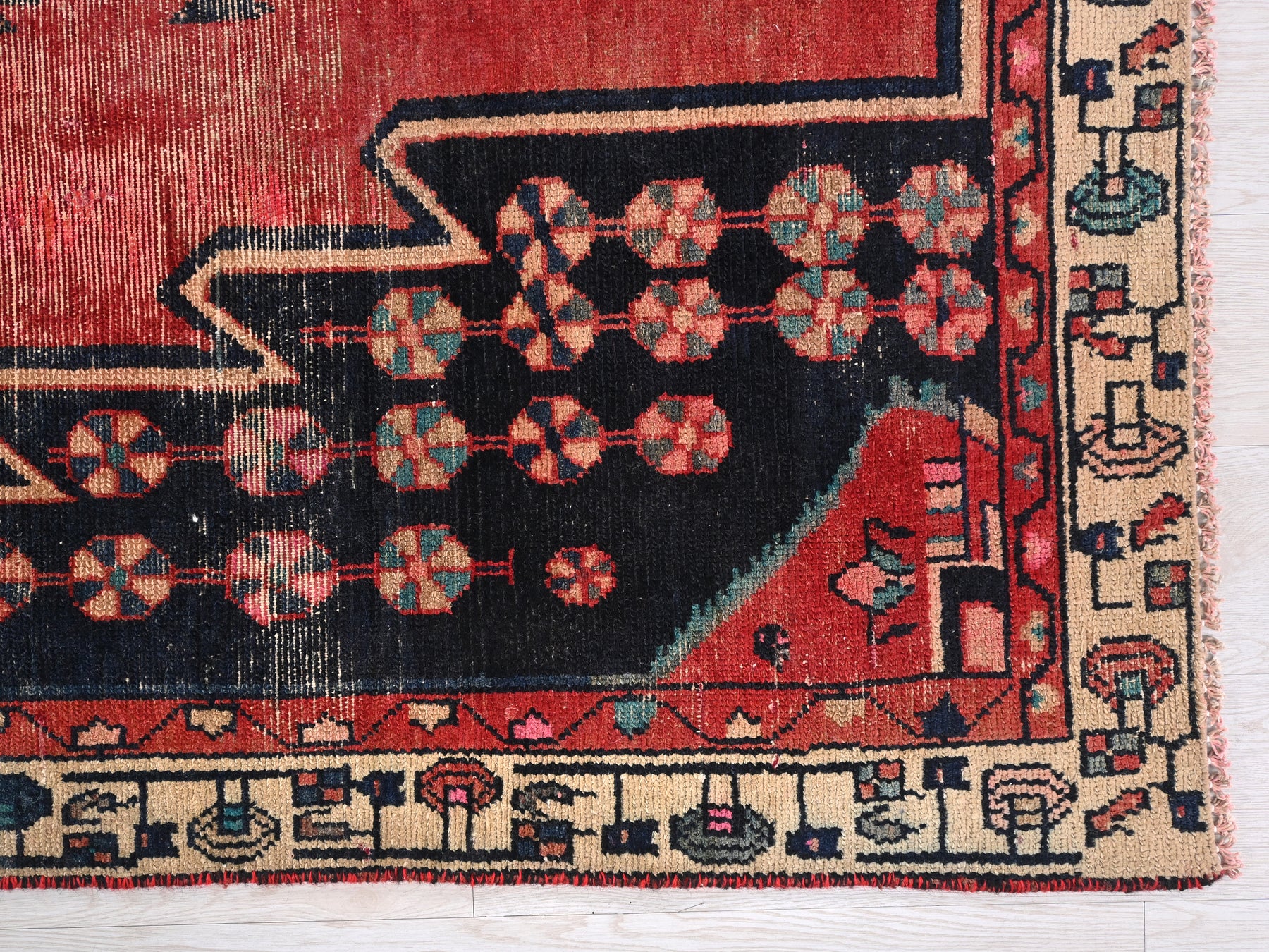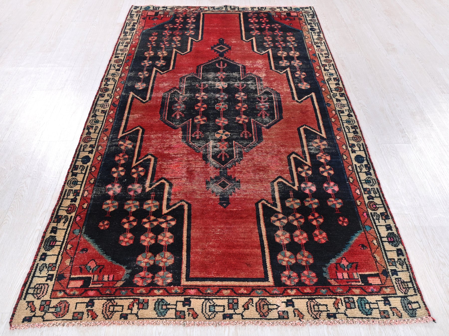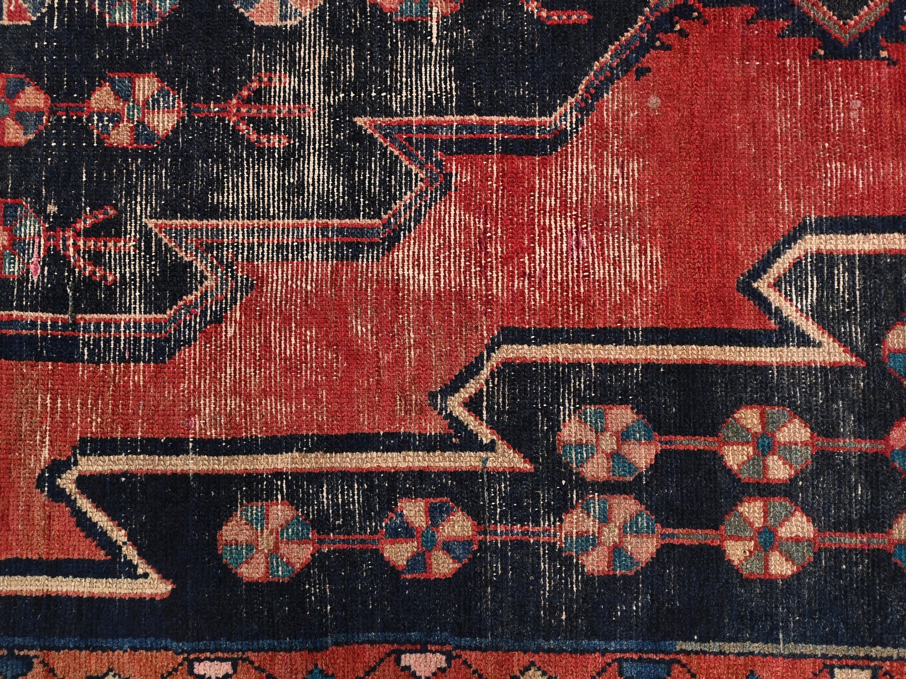 This is a hand-knotted, one-of-a-kind vintage rug. Due to the nature of this piece, there may be slight imperfections in its wear, shape, dimensions, and color. All of our rugs are professionally cleaned and repaired.