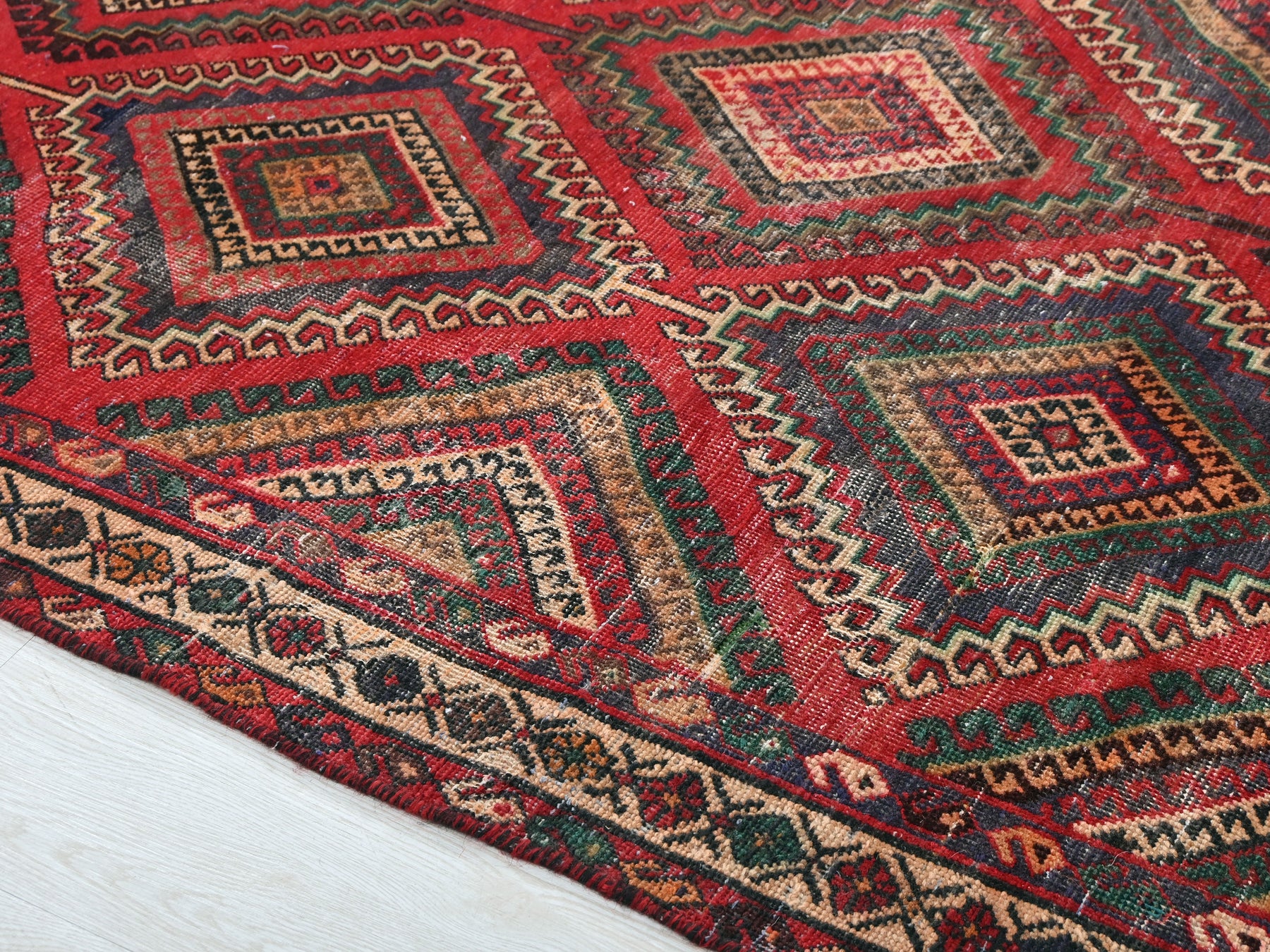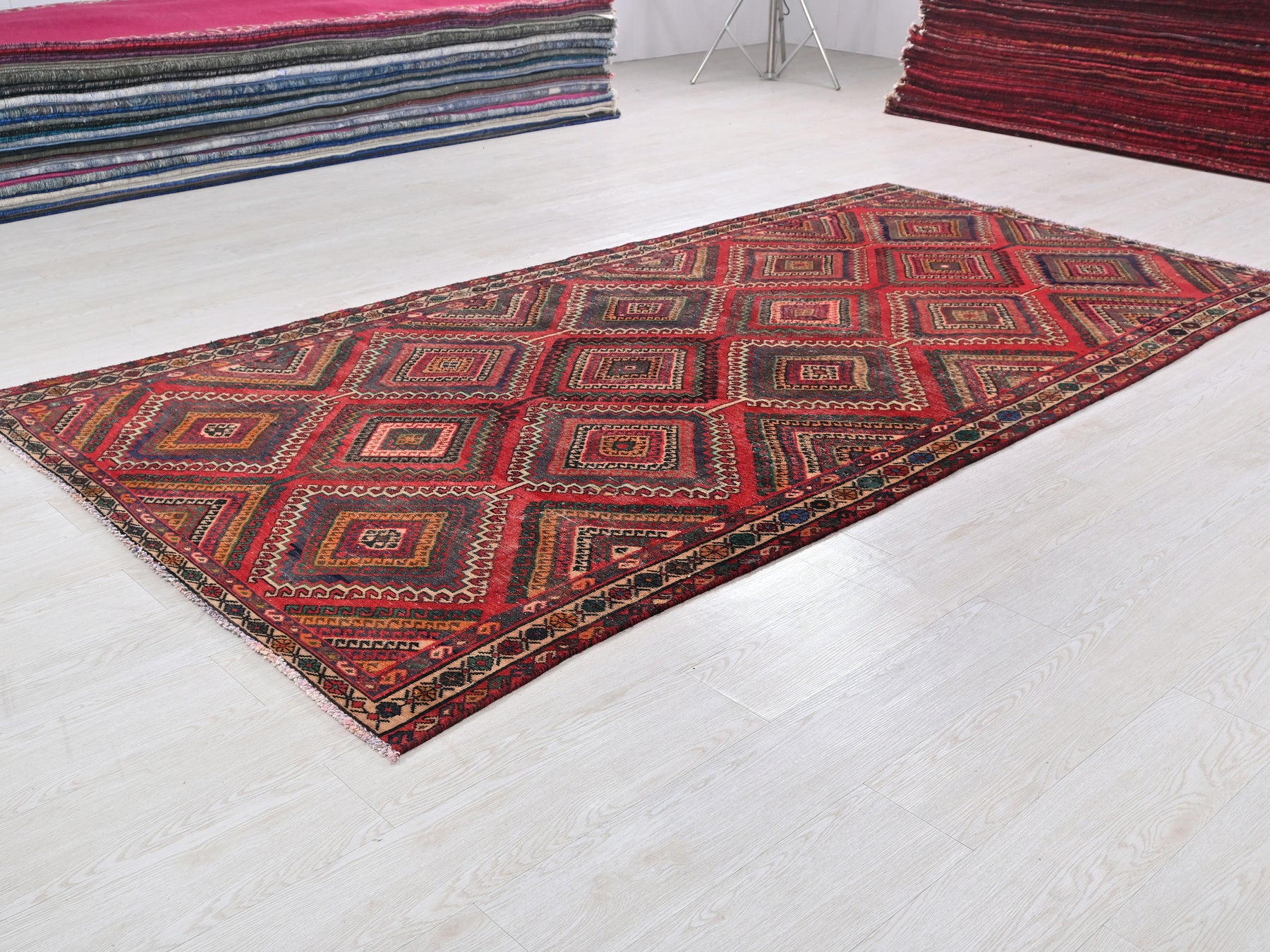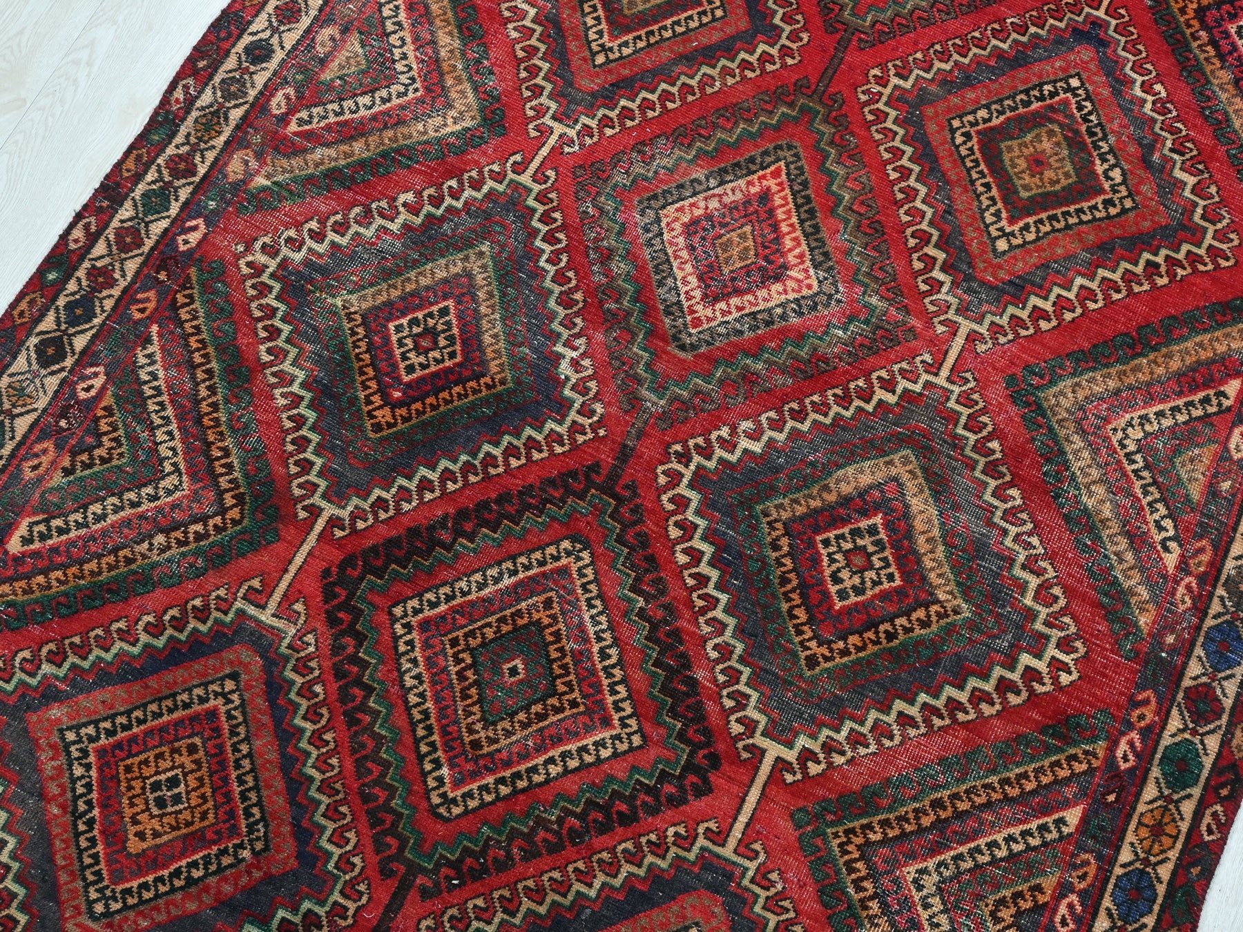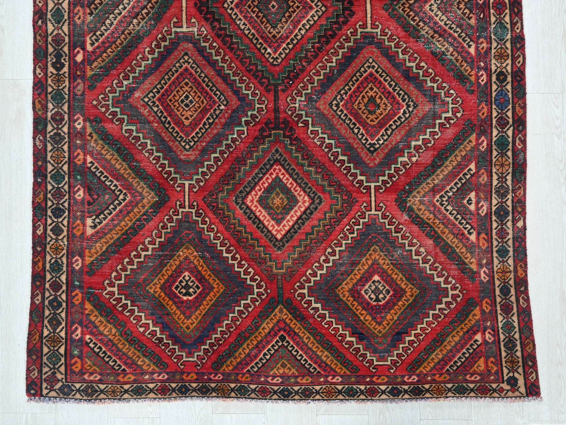 This is a hand-knotted, one-of-a-kind vintage rug. Due to the nature of this piece, there may be slight imperfections in its wear, shape, dimensions, and color. All of our rugs are professionally cleaned and repaired.