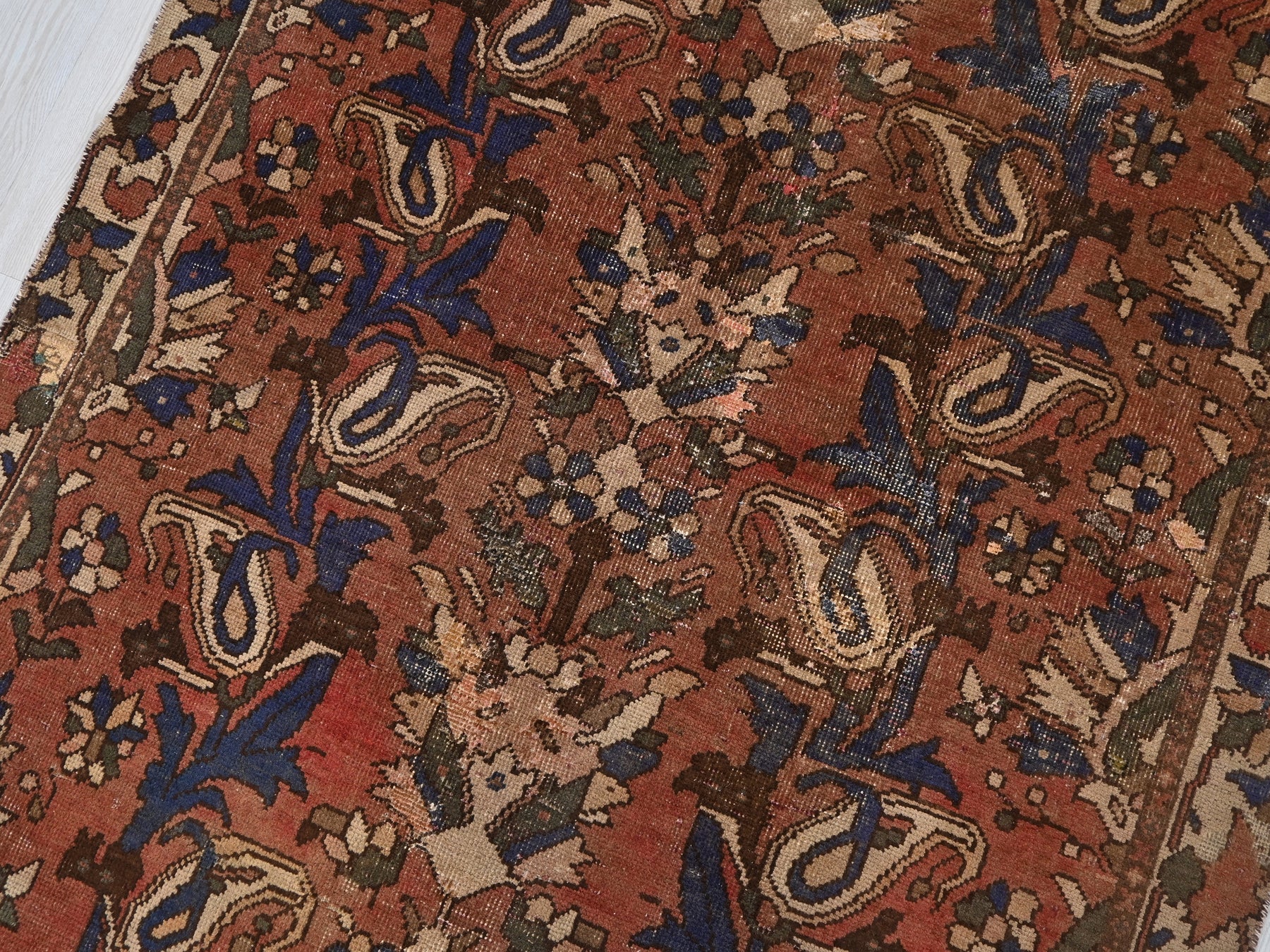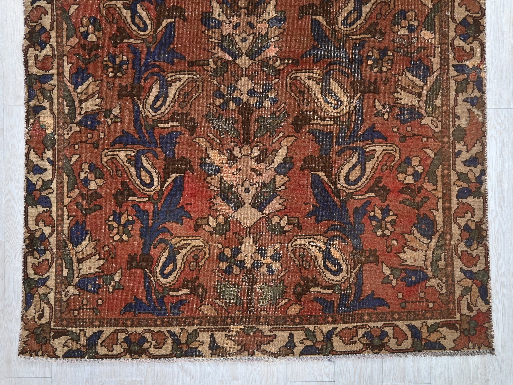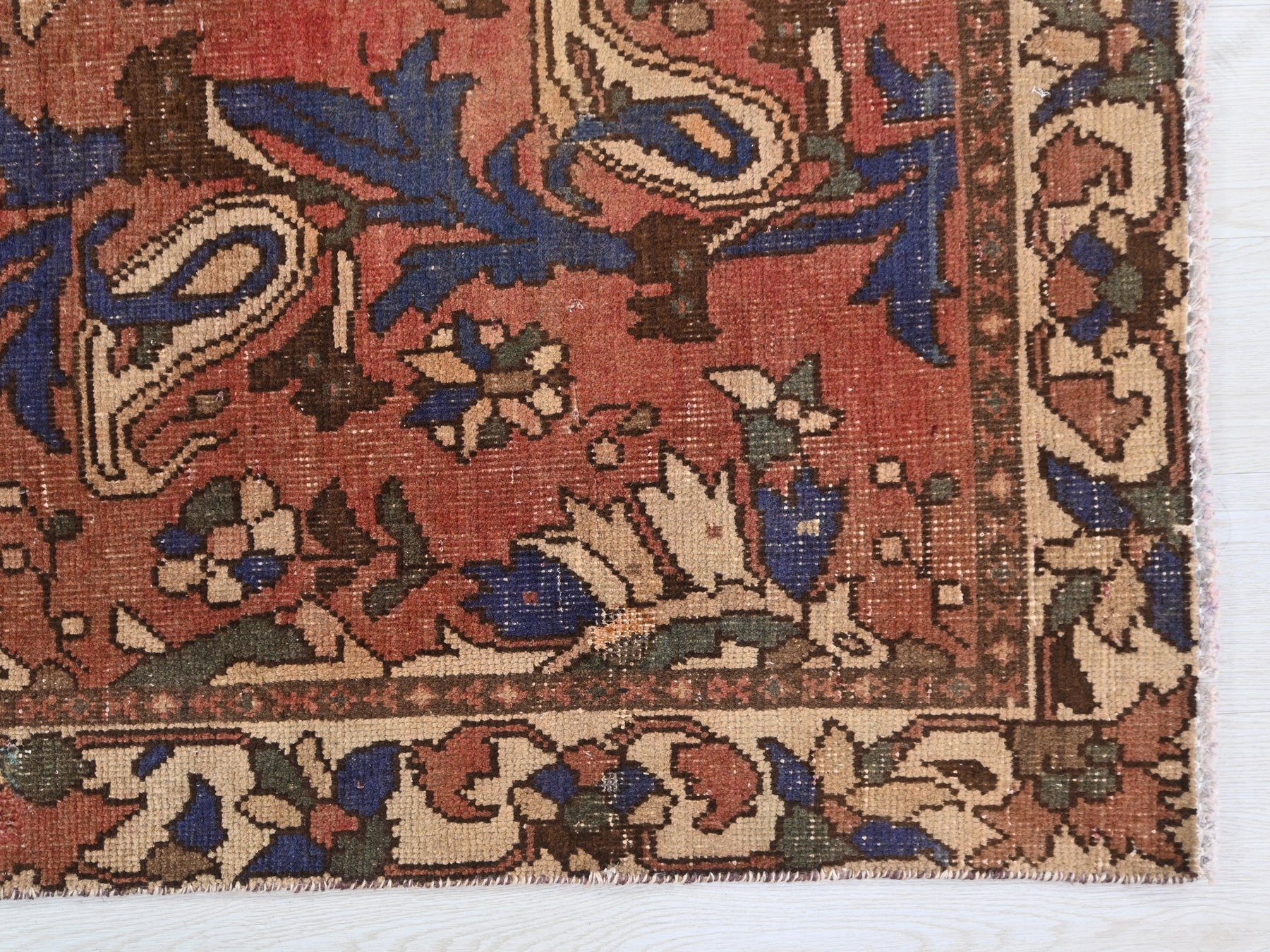 This is a hand-knotted, one-of-a-kind vintage rug. Due to the nature of this piece, there may be slight imperfections in its wear, shape, dimensions, and color. All of our rugs are professionally cleaned and repaired.