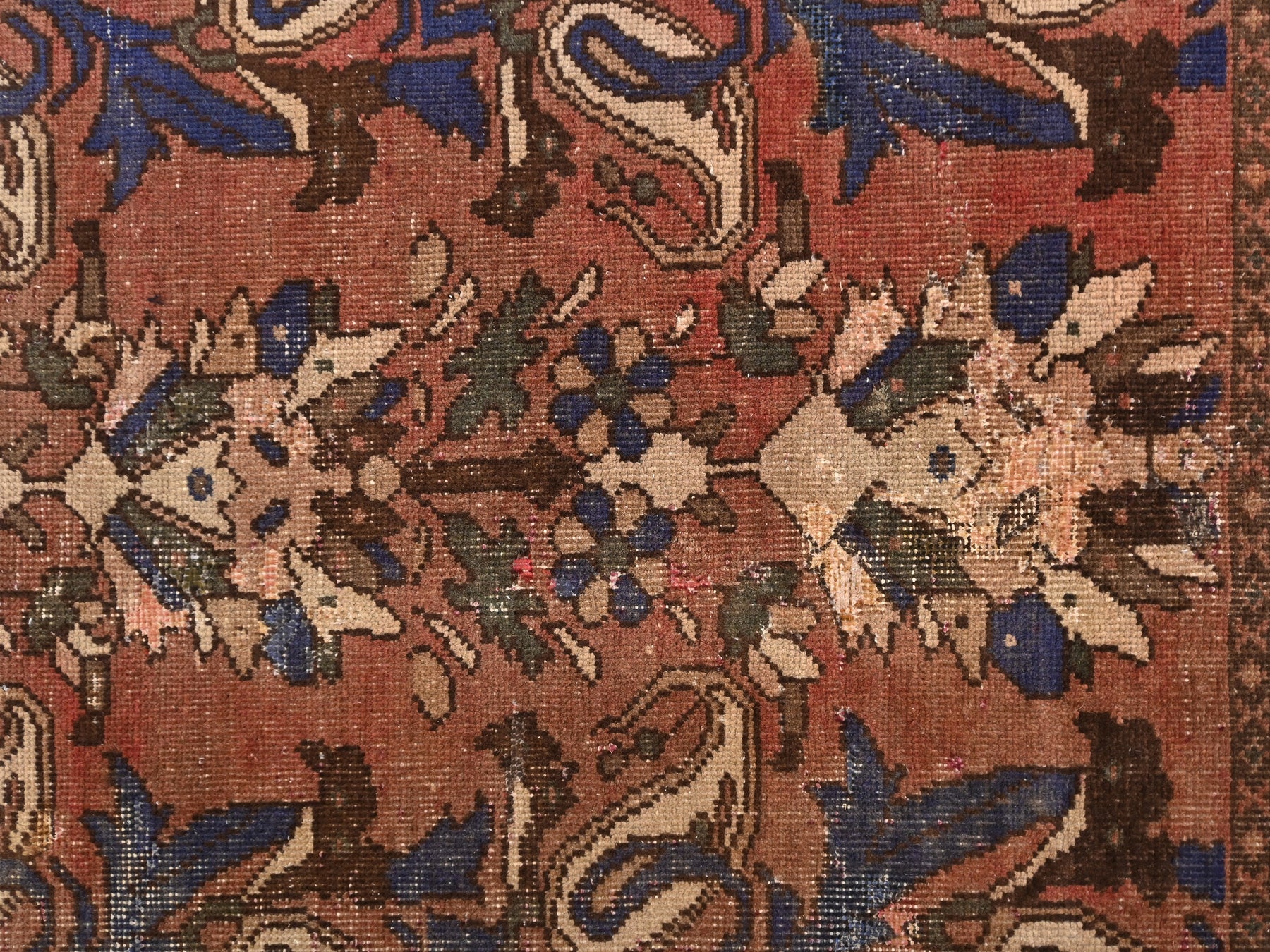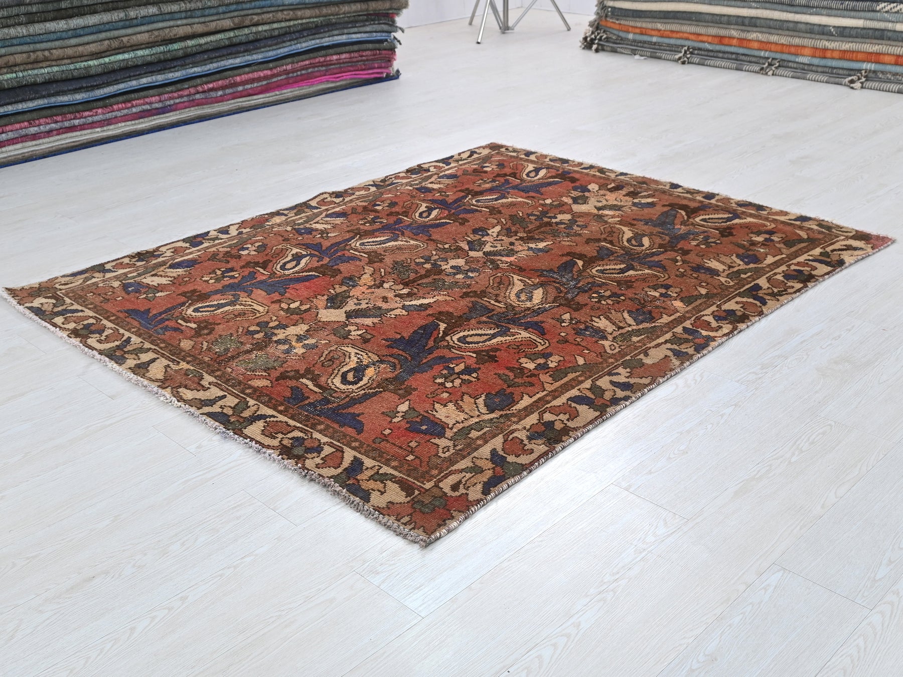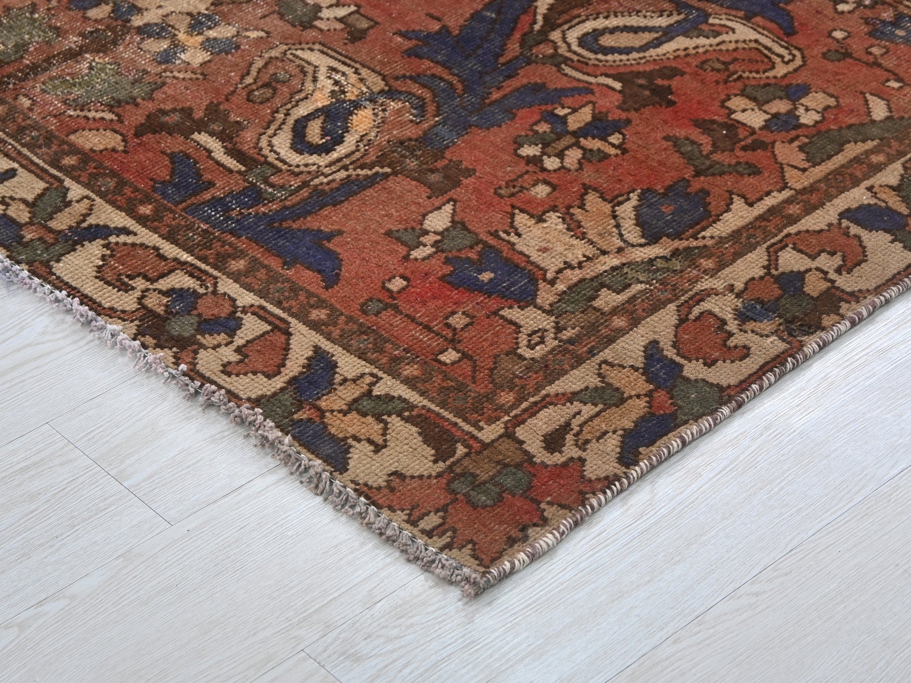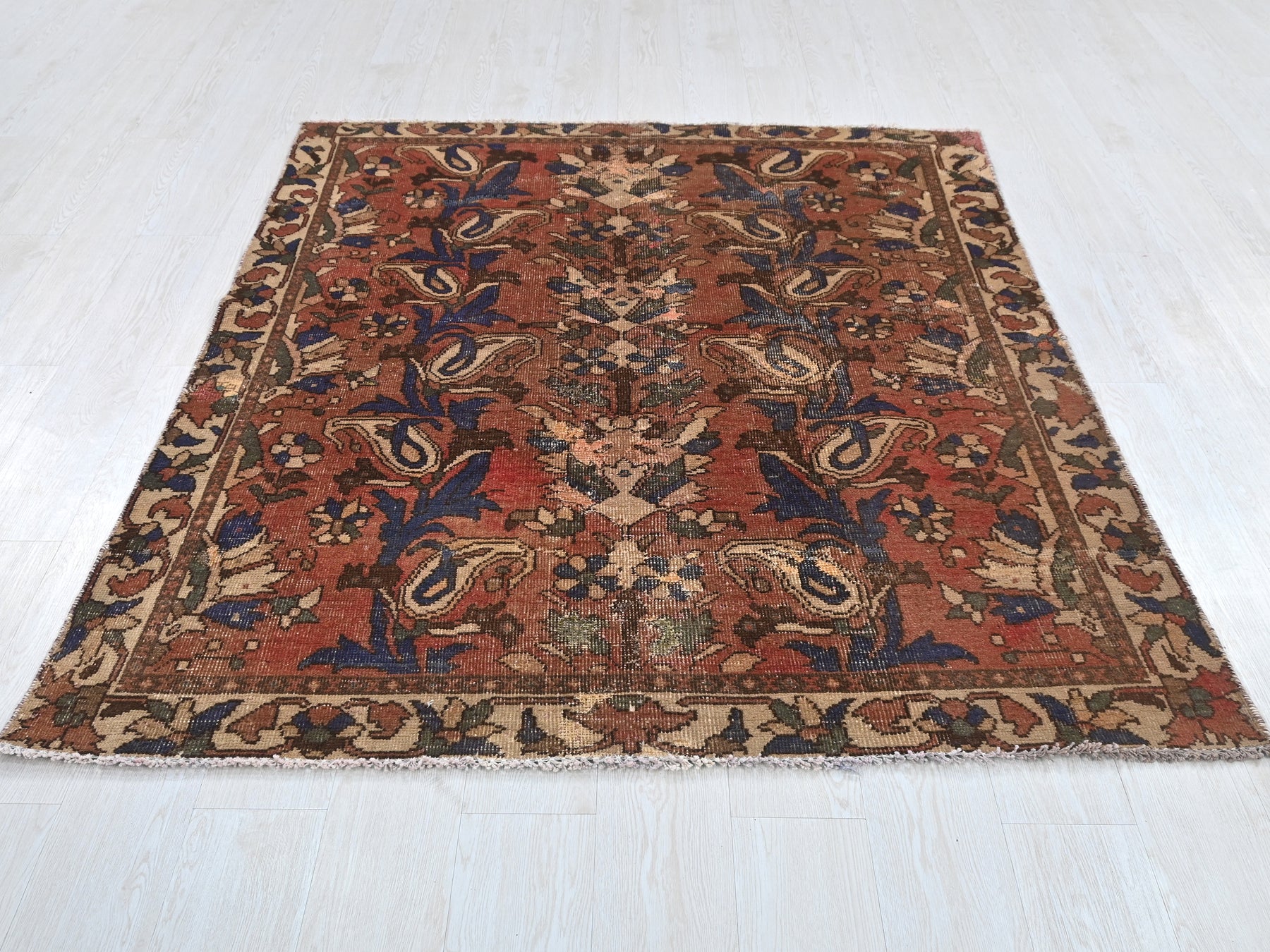 This is a hand-knotted, one-of-a-kind vintage rug. Due to the nature of this piece, there may be slight imperfections in its wear, shape, dimensions, and color. All of our rugs are professionally cleaned and repaired.
