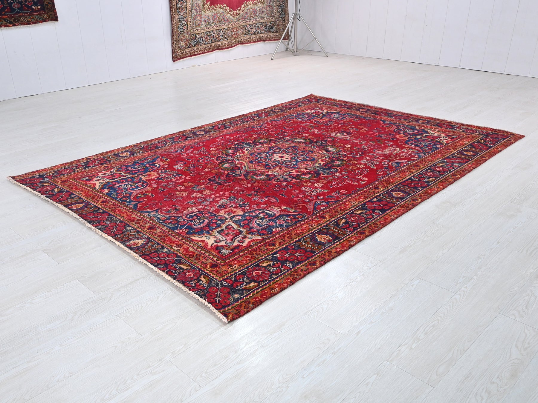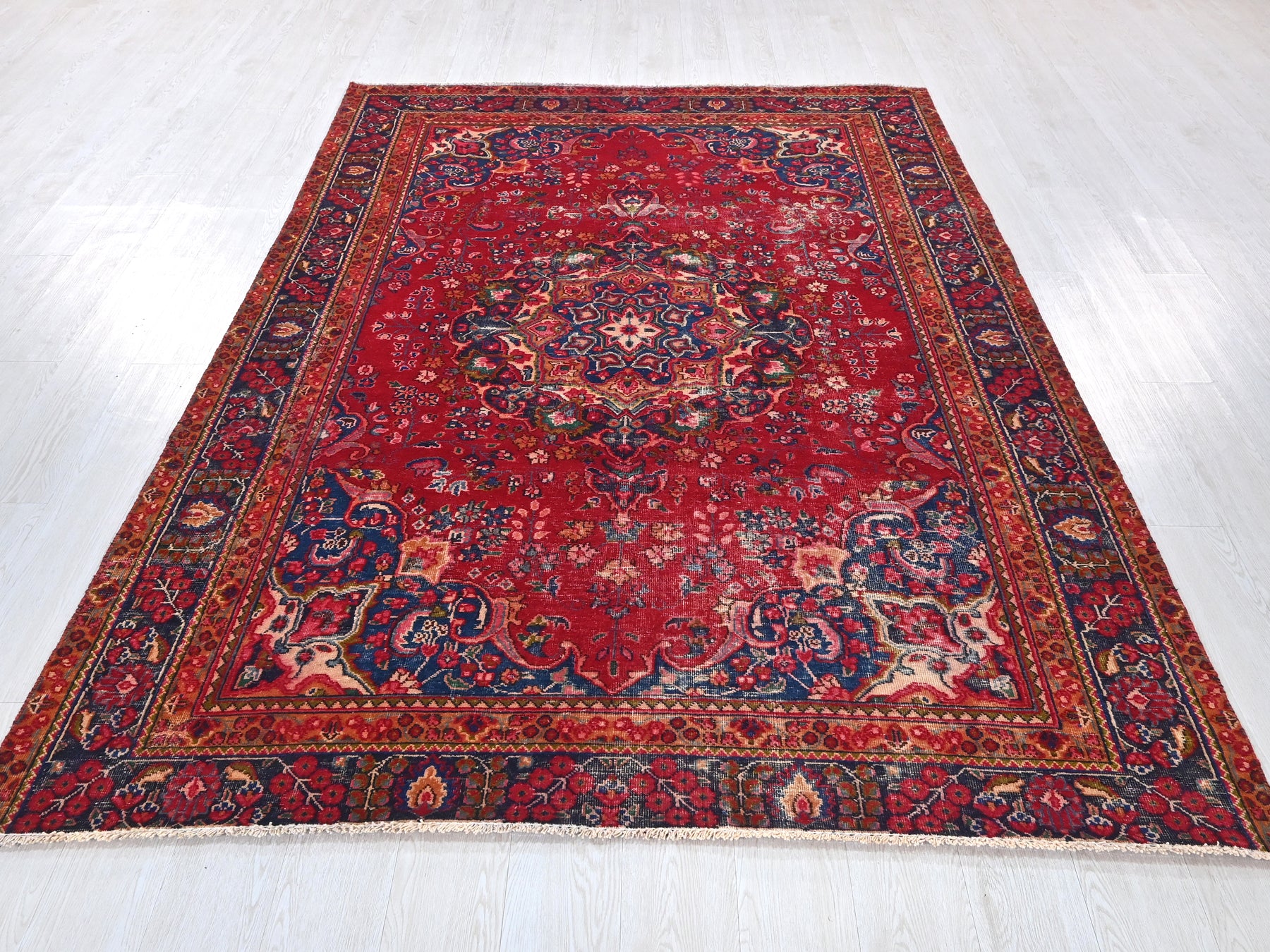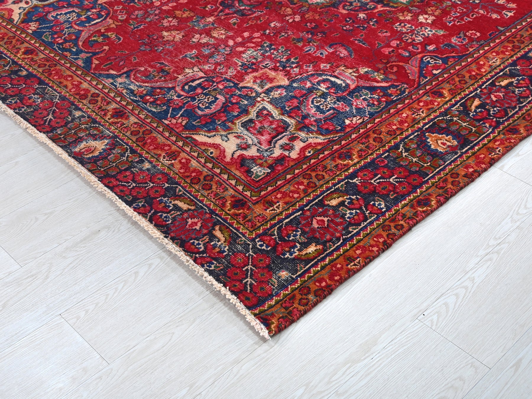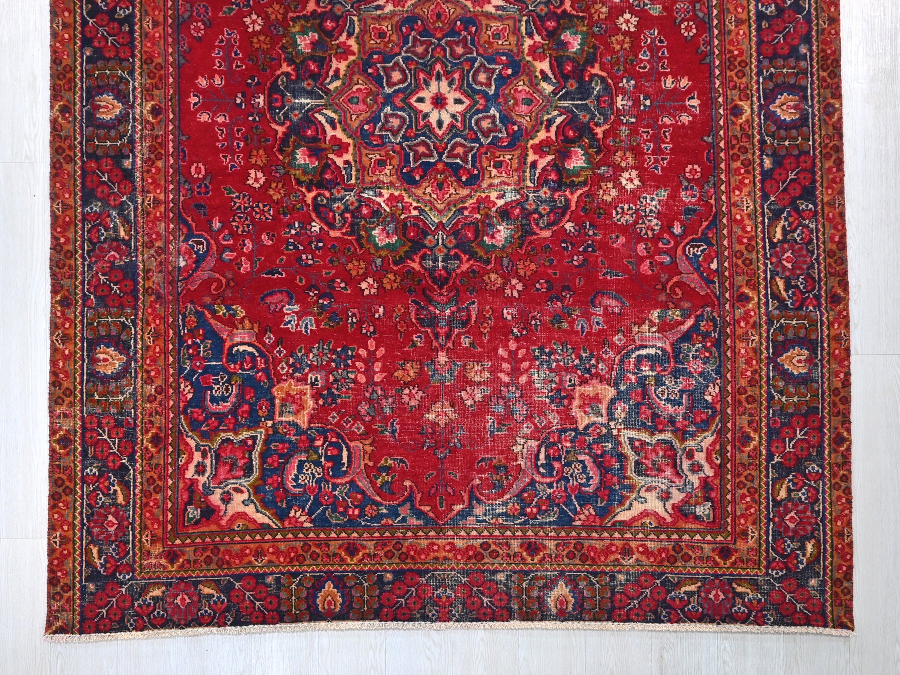 This is a hand-knotted, one-of-a-kind vintage rug. Due to the nature of this piece, there may be slight imperfections in its wear, shape, dimensions, and color. All of our rugs are professionally cleaned and repaired.