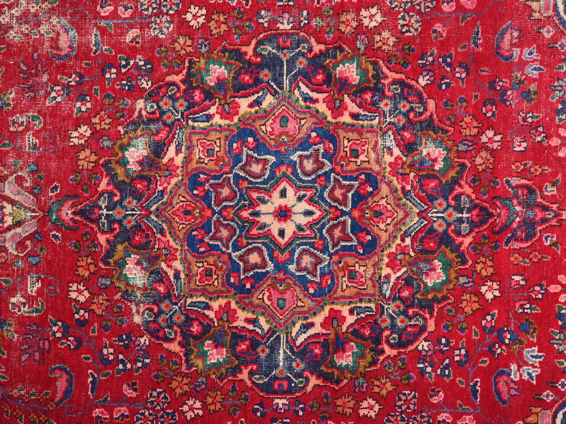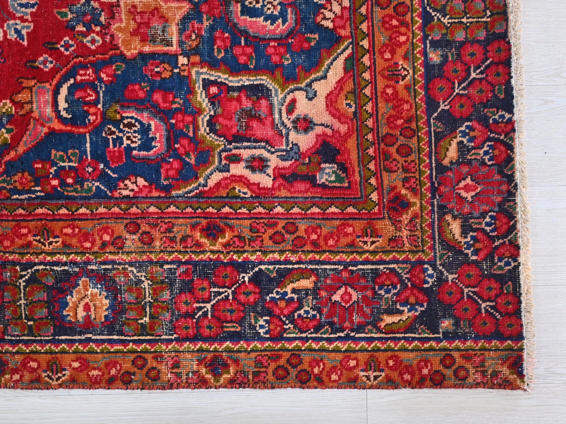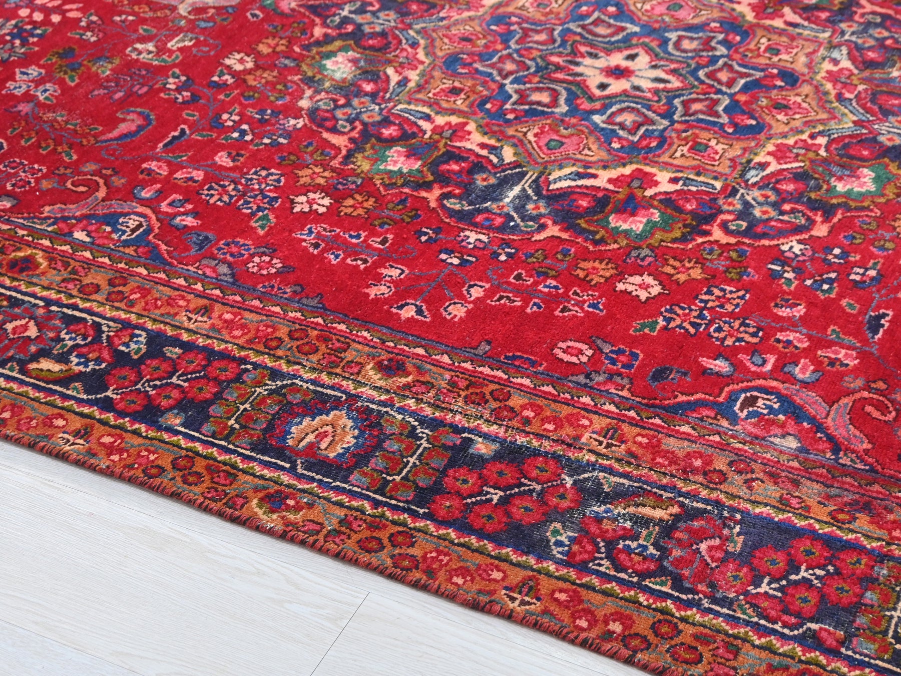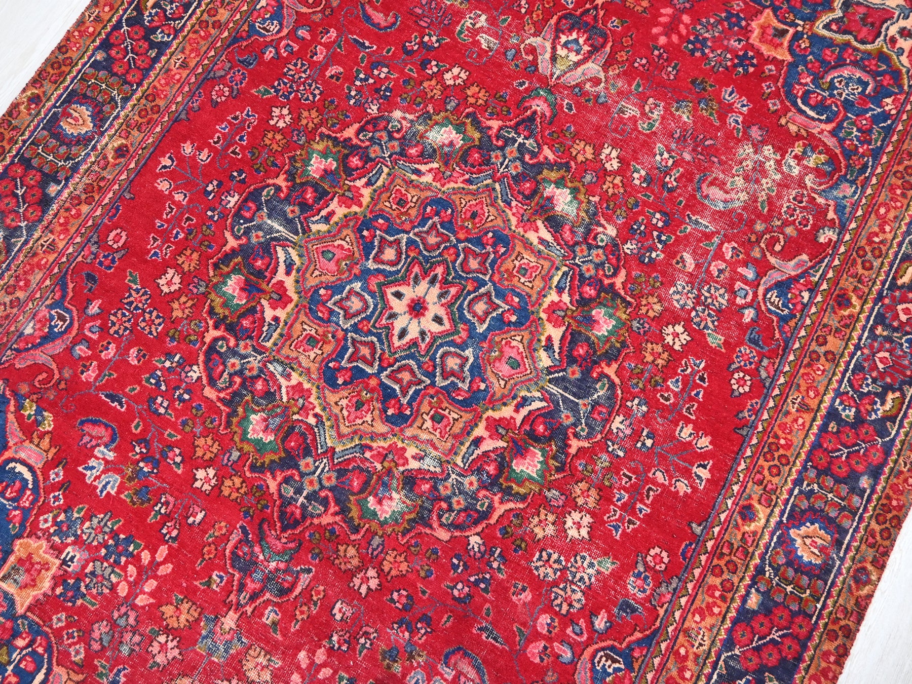This is a hand-knotted, one-of-a-kind vintage rug. Due to the nature of this piece, there may be slight imperfections in its wear, shape, dimensions, and color. All of our rugs are professionally cleaned and repaired.
